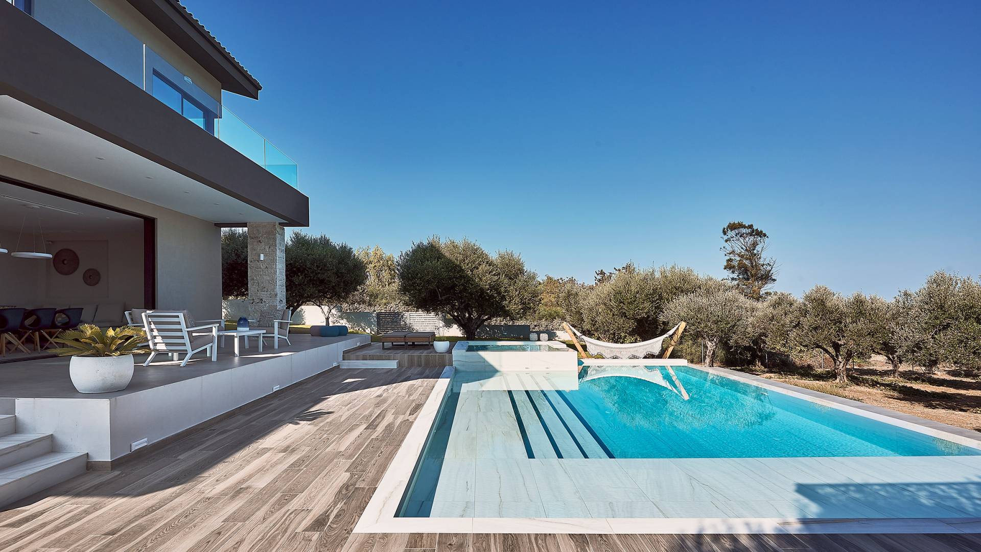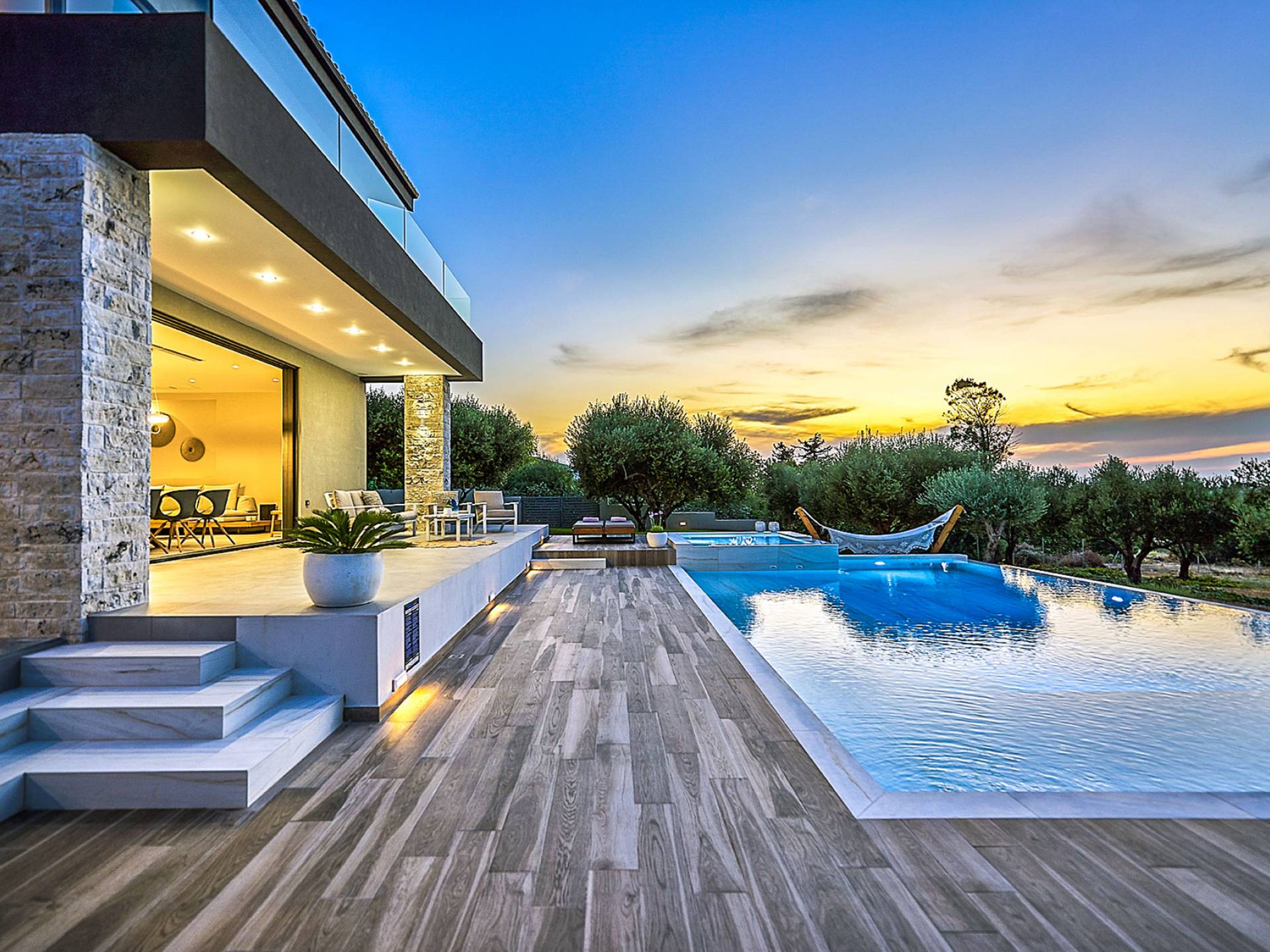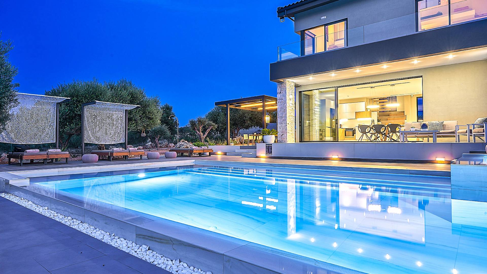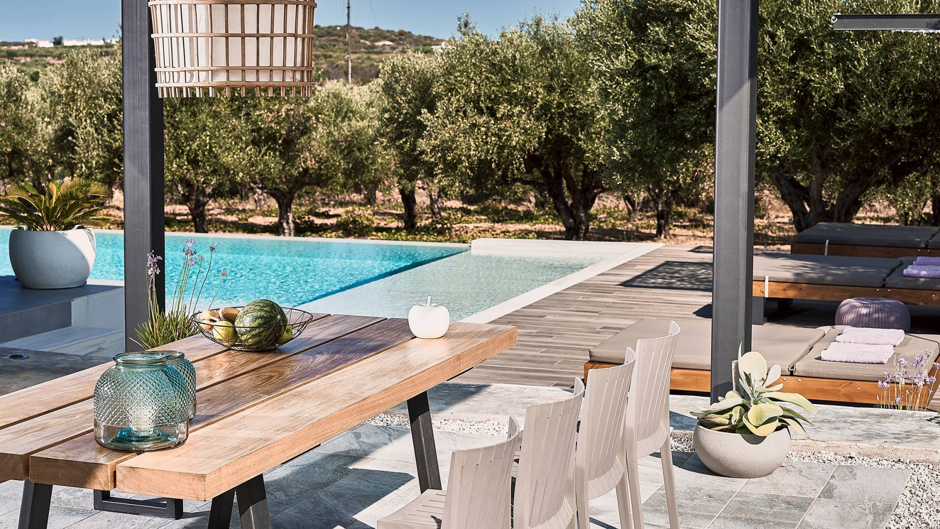 Al ingresar a la Villa, se encontrarán en un área espaciosa y diáfana que consta de la sala de estar y la cocina. La sala de estar cuenta con un cómodo sofá esquinero, un televisor de alta definición de 65 pulgadas con Netflix, cine en casa y un altavoz Bluetooth, así como un área de comedor interior, que disfruta de hermosas vistas de la naturaleza de los olivos, mientras que la cocina totalmente equipada ofrece todo lo esencial para una vida independiente. -vacaciones atendidas. Las grandes ventanas y puertas del piso al techo brindan una amplia iluminación y un fácil acceso a la terraza, así como a las áreas de la piscina y la barbacoa.