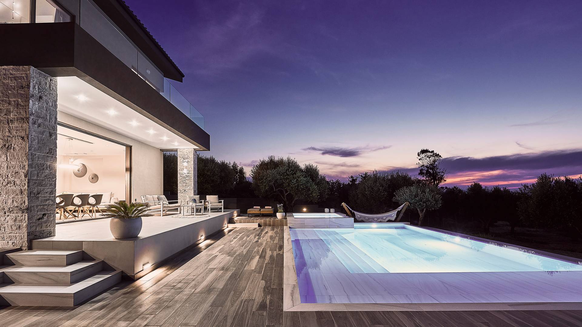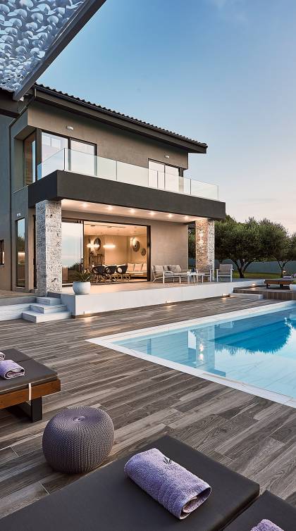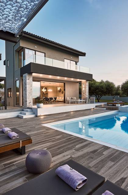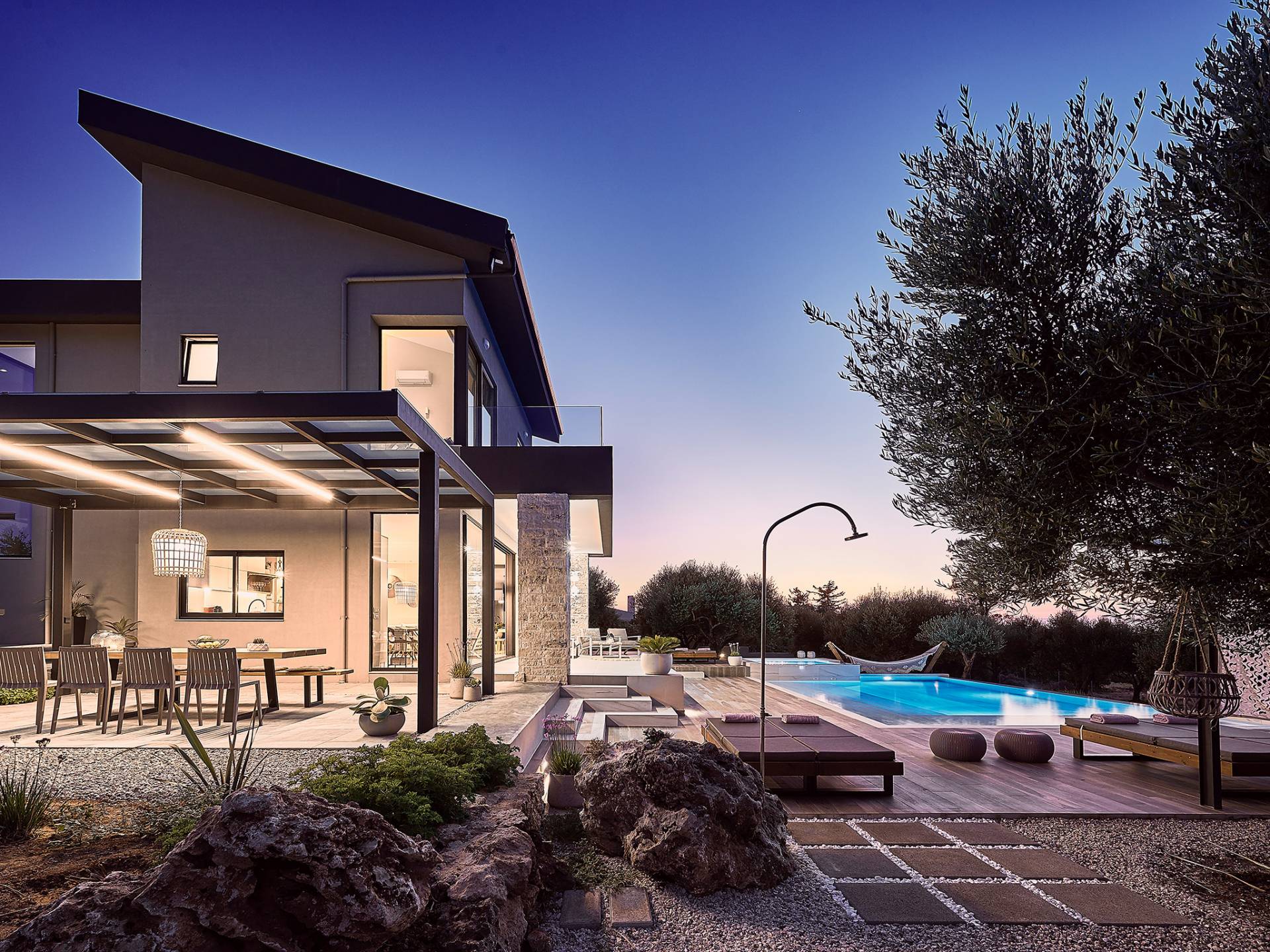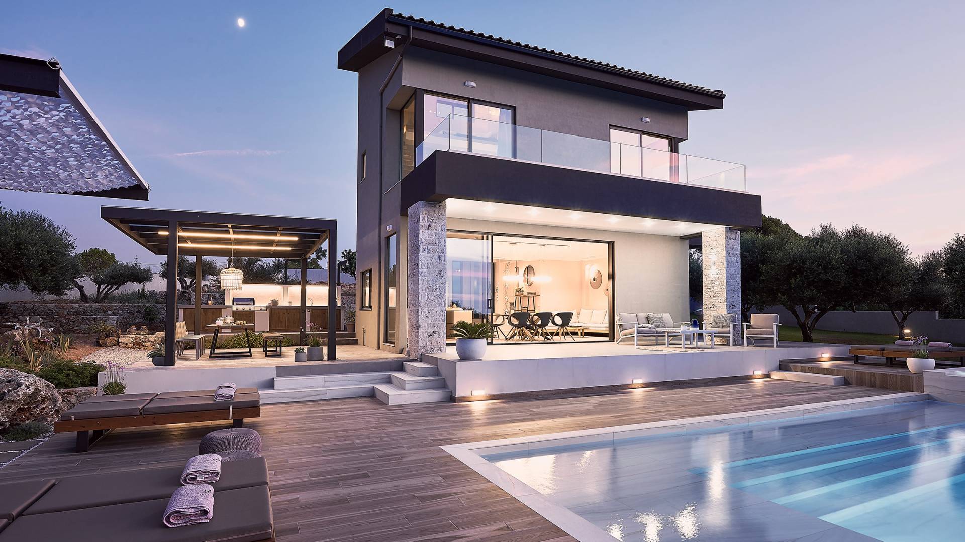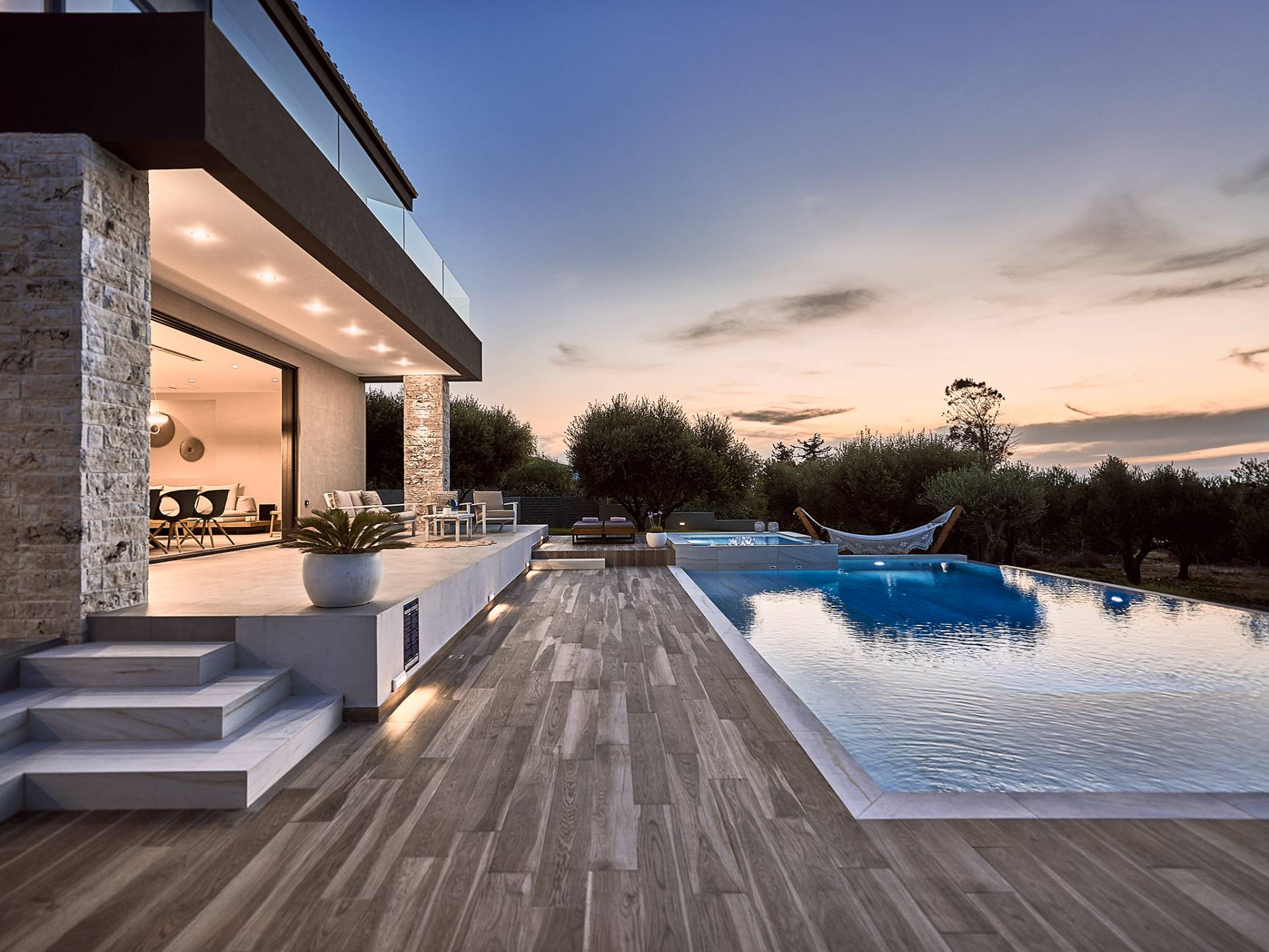 Al ingresar a la Villa, se encontrarán en un área espaciosa y diáfana que consta de la sala de estar y la cocina. La sala de estar cuenta con un cómodo sofá esquinero, un televisor de alta definición de 65 pulgadas con Netflix, cine en casa y un altavoz Bluetooth, así como un área de comedor interior, que disfruta de hermosas vistas de la naturaleza de los olivos, mientras que la cocina totalmente equipada ofrece todo lo esencial para una vida independiente. -vacaciones atendidas. Las grandes ventanas y puertas del piso al techo brindan una amplia iluminación y un fácil acceso a la terraza, así como a las áreas de la piscina y la barbacoa.