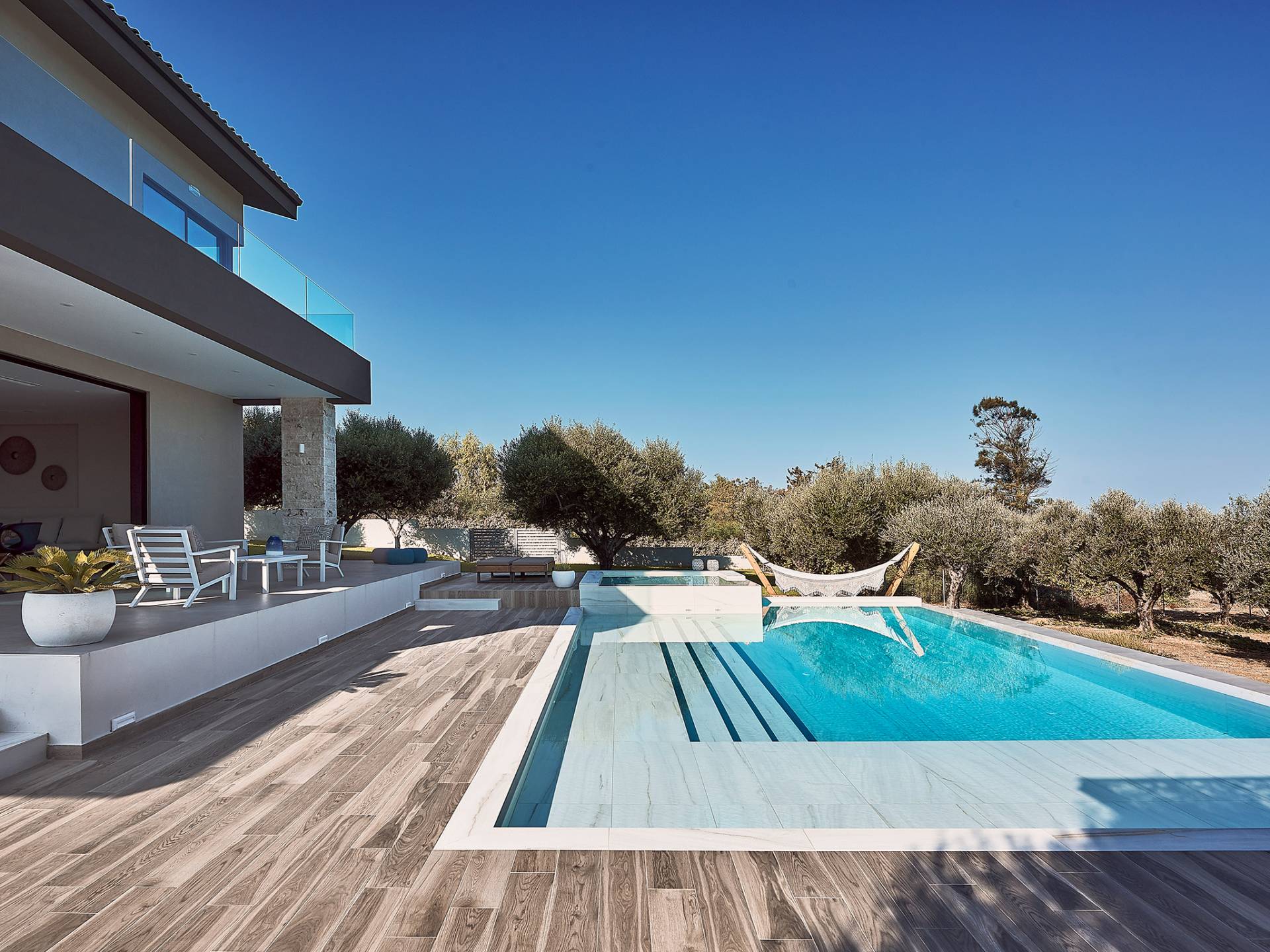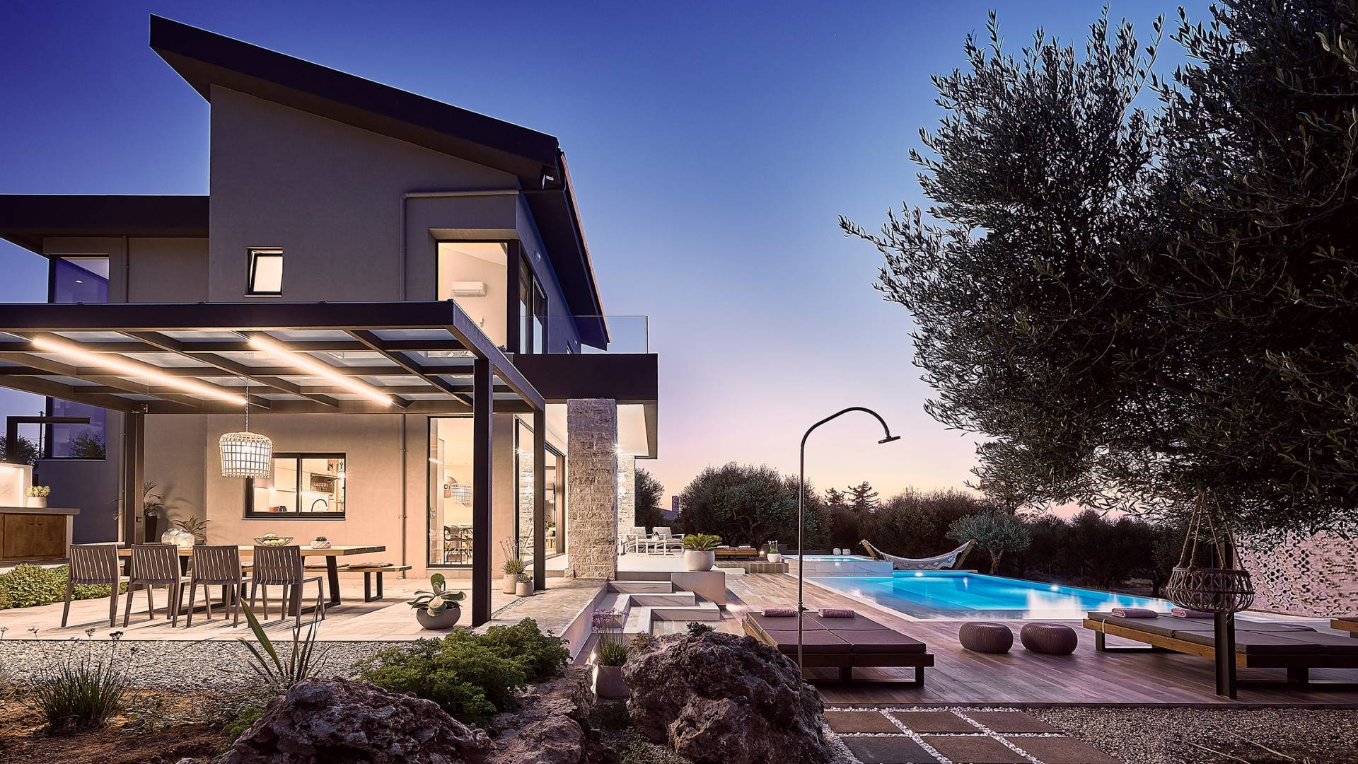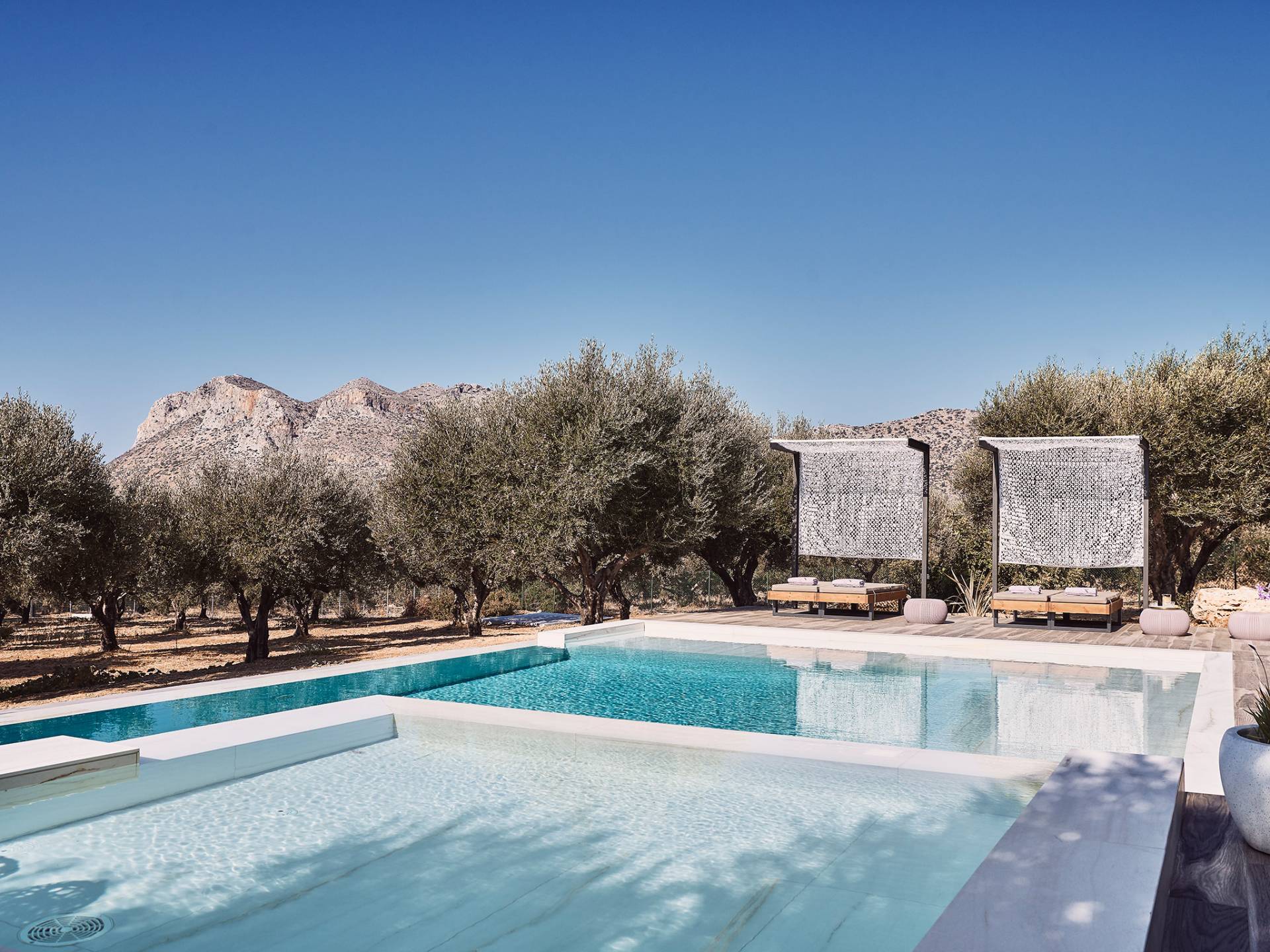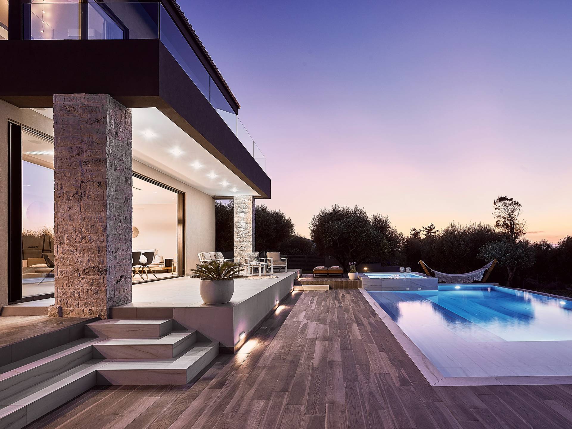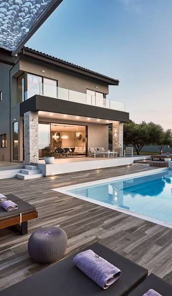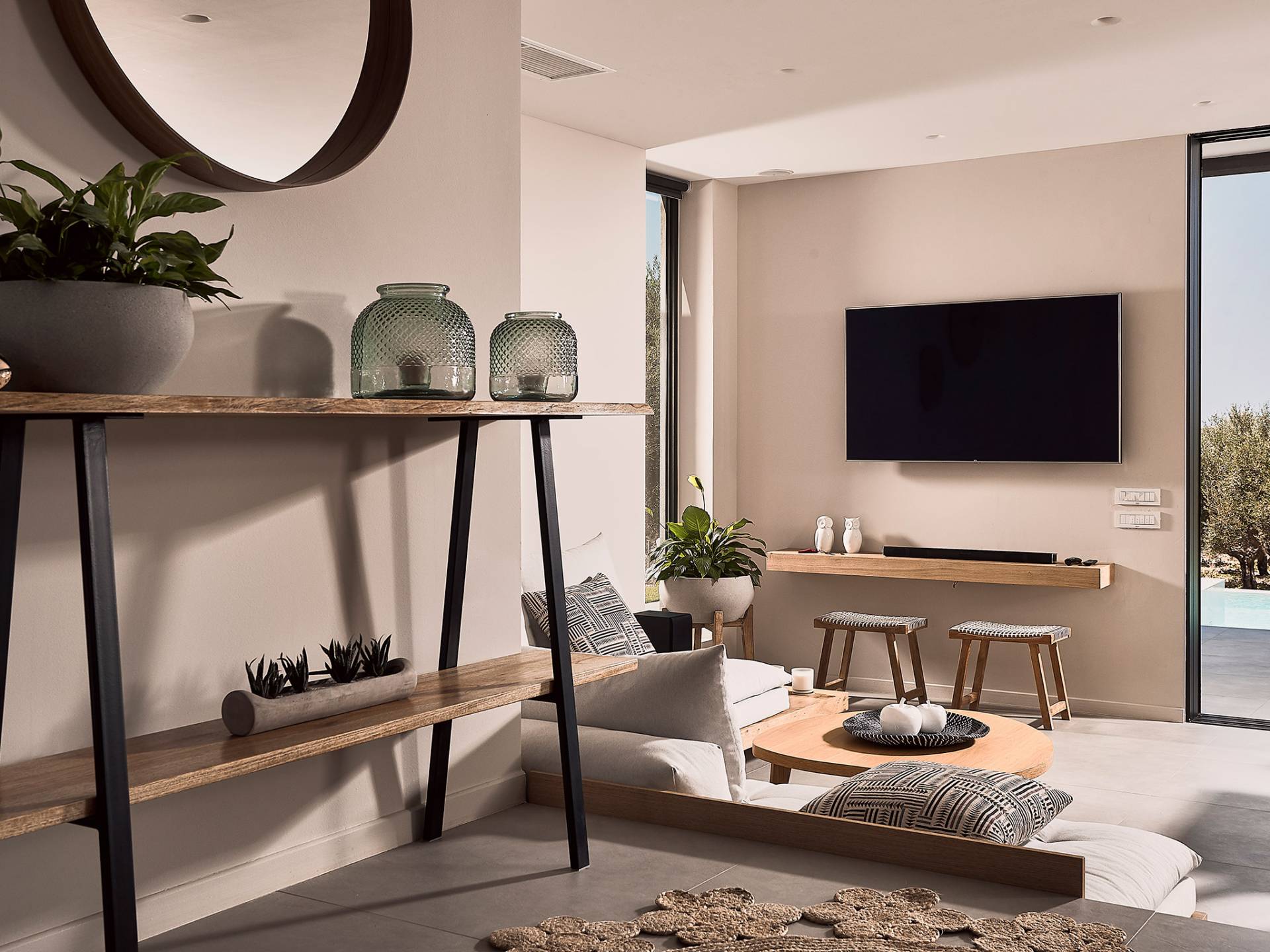 Al ingresar a la Villa, se encontrarán en un área espaciosa y diáfana que consta de la sala de estar y la cocina. La sala de estar cuenta con un cómodo sofá esquinero, un televisor de alta definición de 65 pulgadas con Netflix, cine en casa y un altavoz Bluetooth, así como un área de comedor interior, que disfruta de hermosas vistas de la naturaleza de los olivos, mientras que la cocina totalmente equipada ofrece todo lo esencial para una vida independiente. -vacaciones atendidas. Las grandes ventanas y puertas del piso al techo brindan una amplia iluminación y un fácil acceso a la terraza, así como a las áreas de la piscina y la barbacoa.