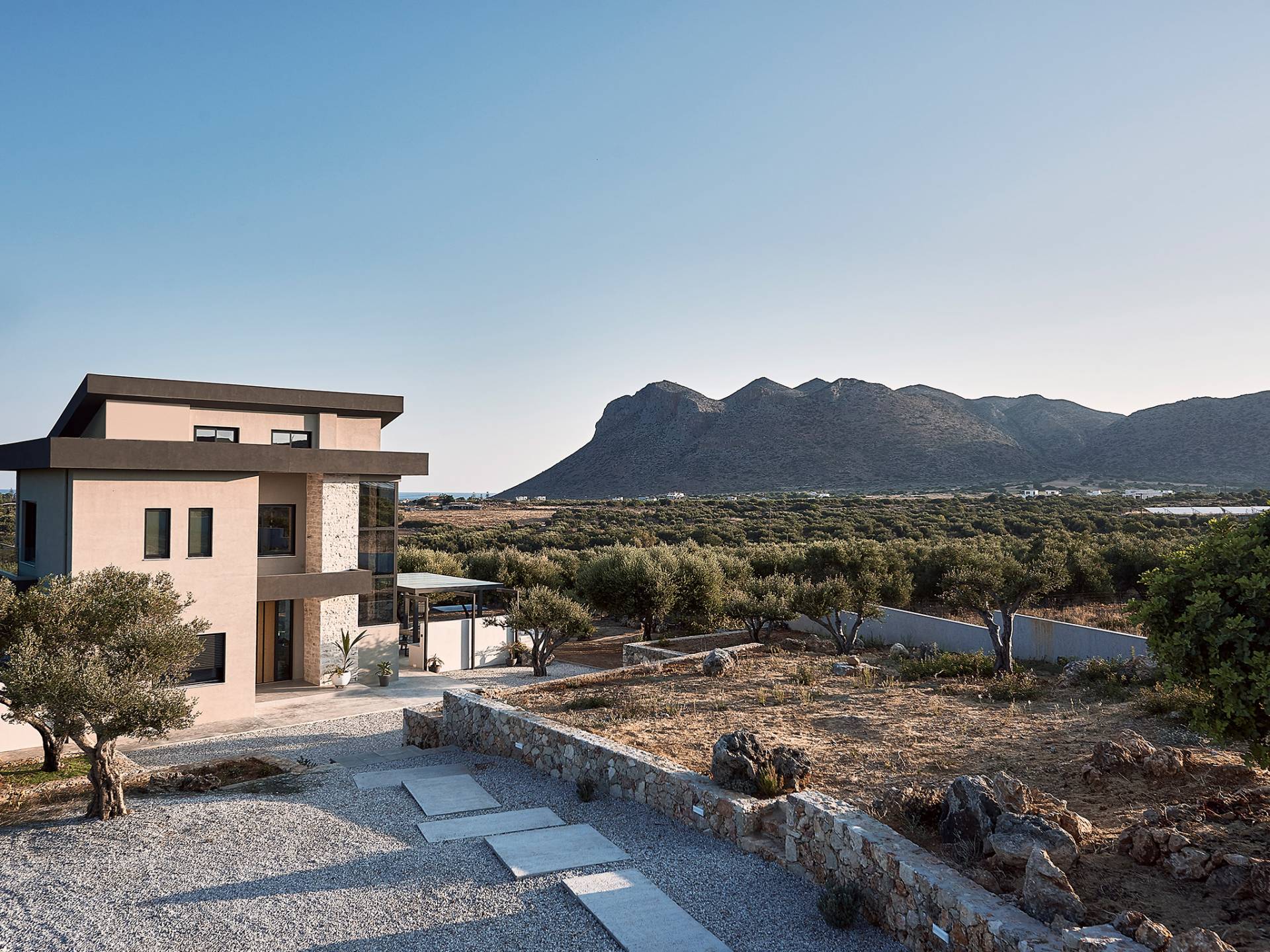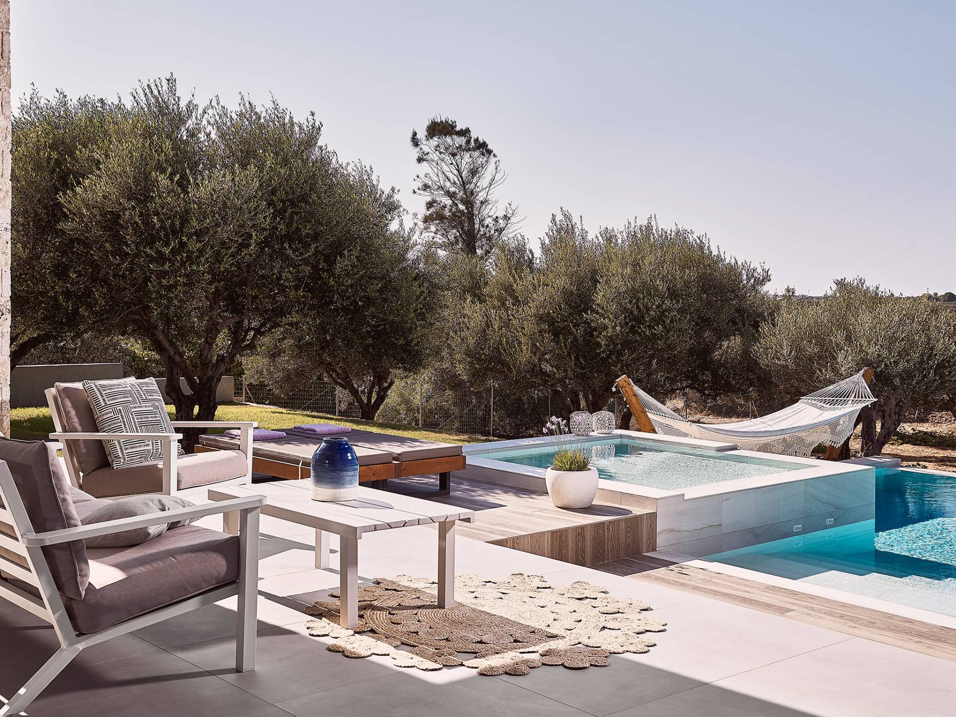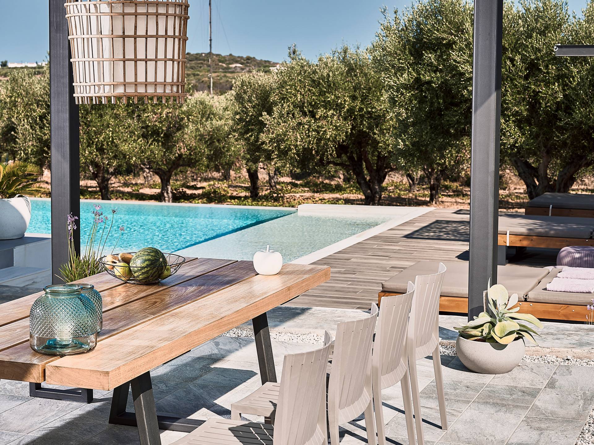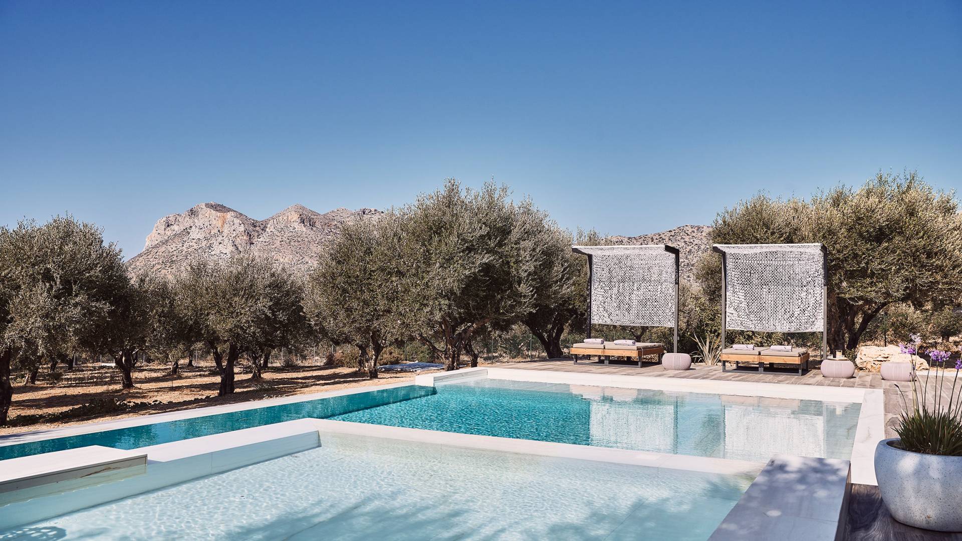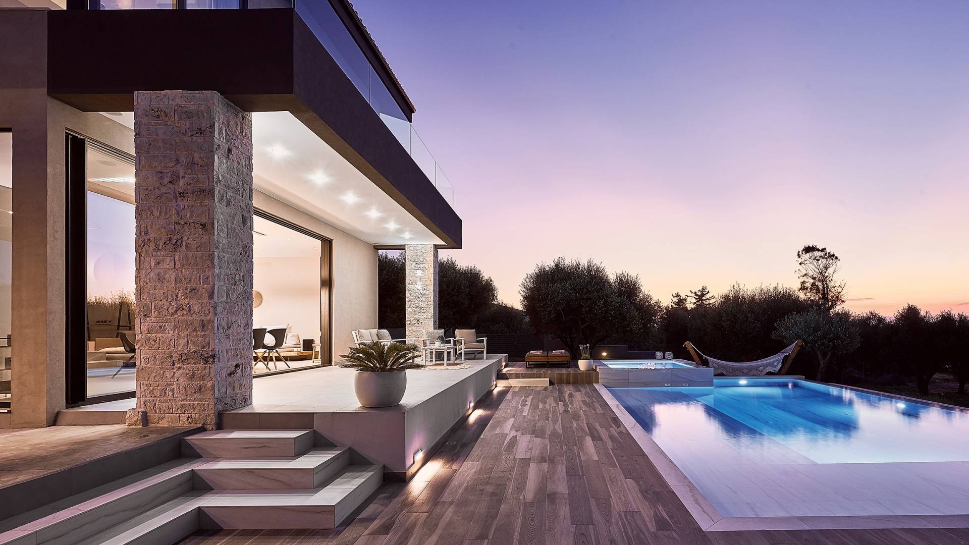 Al ingresar a la Villa, se encontrarán en un área espaciosa y diáfana que consta de la sala de estar y la cocina. La sala de estar cuenta con un cómodo sofá esquinero, un televisor de alta definición de 65 pulgadas con Netflix, cine en casa y un altavoz Bluetooth, así como un área de comedor interior, que disfruta de hermosas vistas de la naturaleza de los olivos, mientras que la cocina totalmente equipada ofrece todo lo esencial para una vida independiente. -vacaciones atendidas. Las grandes ventanas y puertas del piso al techo brindan una amplia iluminación y un fácil acceso a la terraza, así como a las áreas de la piscina y la barbacoa.