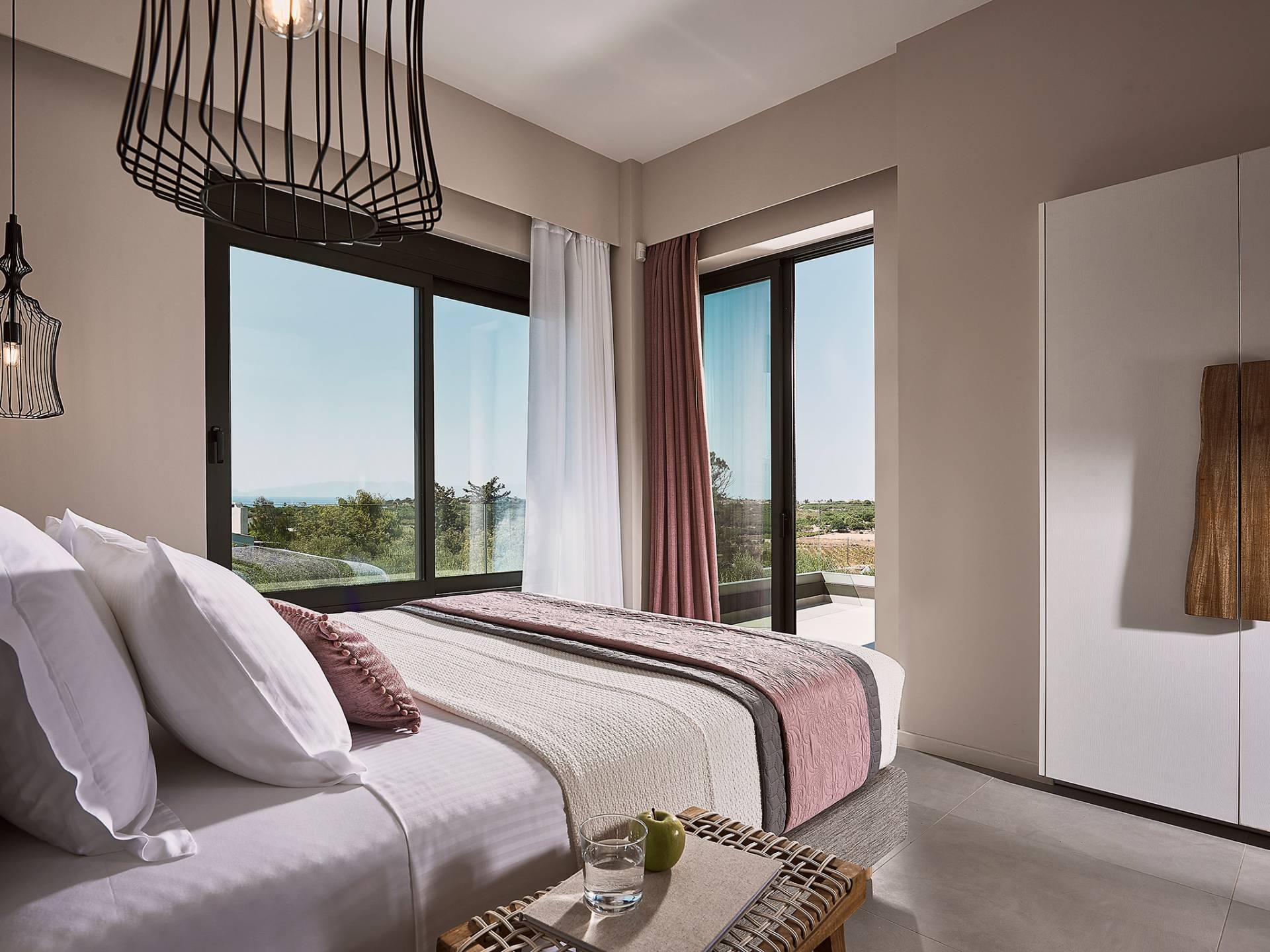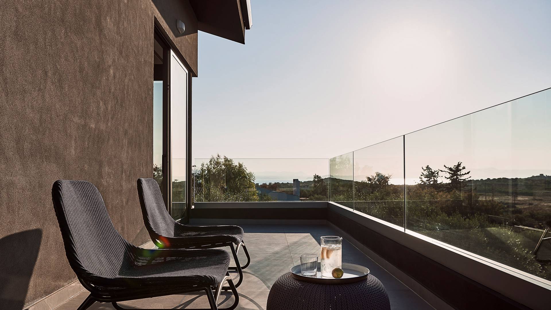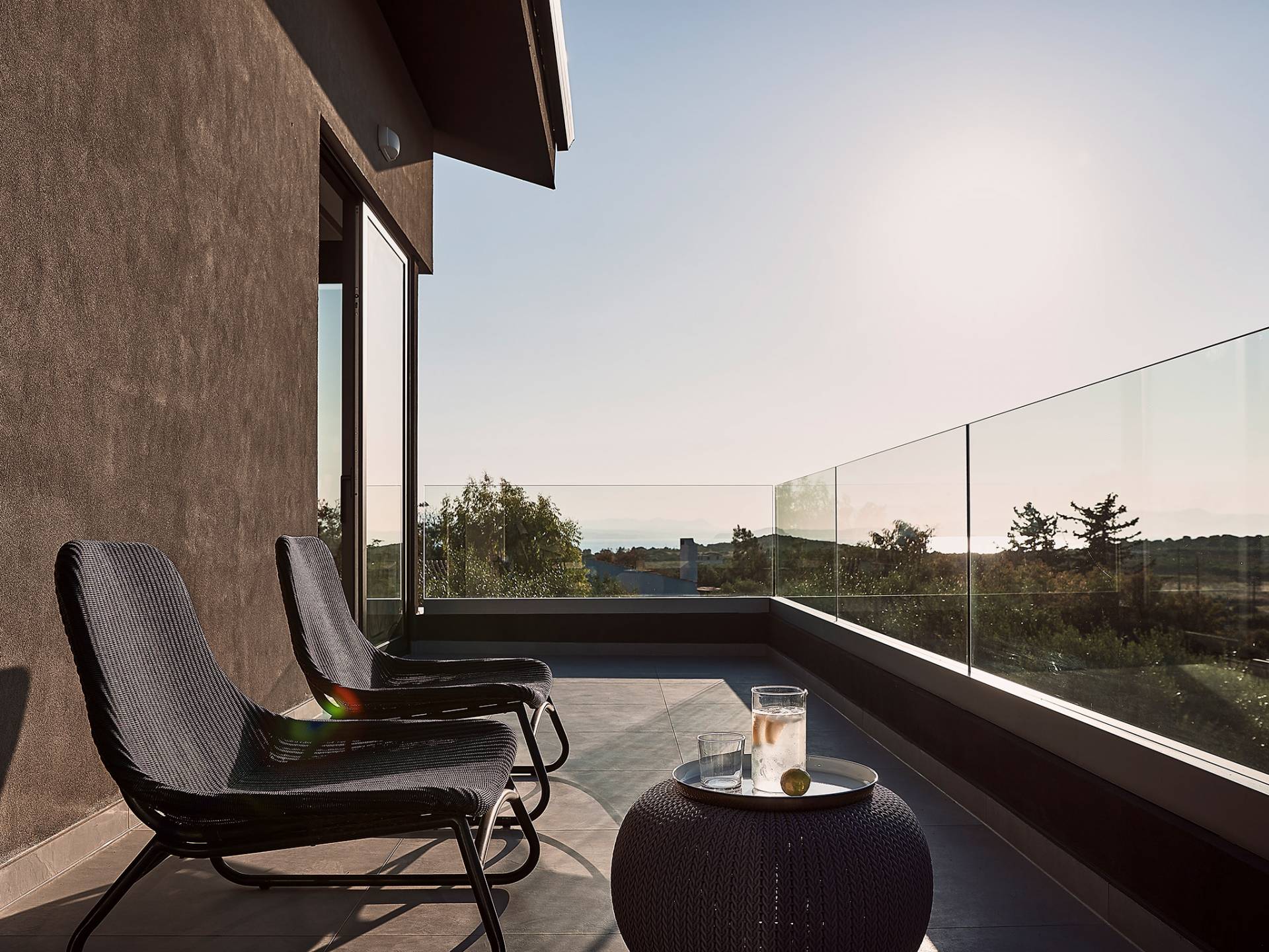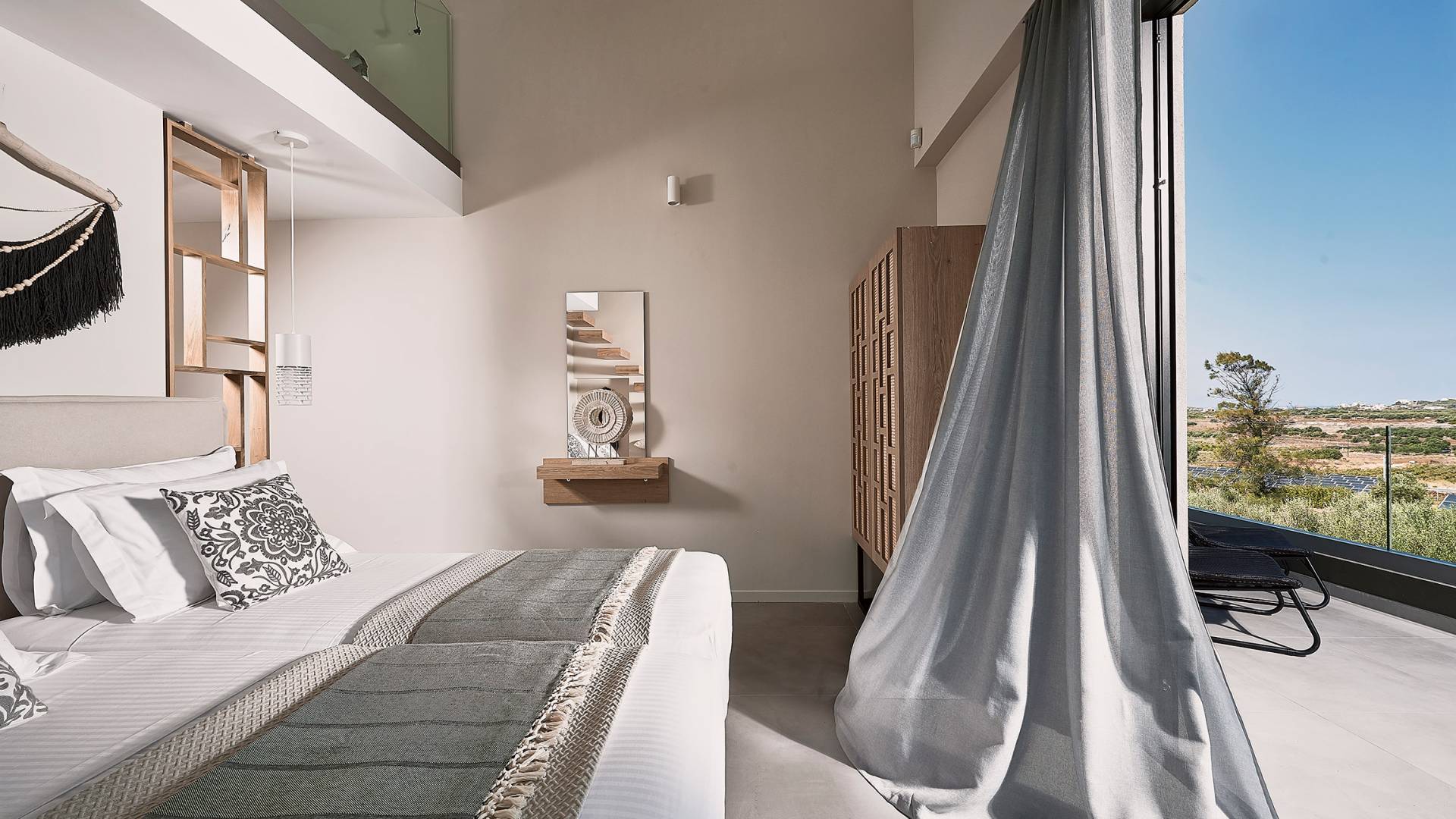 Siguiendo las escaleras hasta el nivel superior, lo recibe un pasillo elegantemente decorado, con una gran ventana y una sala de estar. Los tres dormitorios restantes de Carpos Villa se pueden encontrar en este nivel. El dormitorio principal con cama de matrimonio tamaño king (1,80 X 2,00) y su baño en suite con doble lavabo, bañera y cabina de ducha, son la máxima expresión del lujo y el confort. También proporciona acceso a una terraza equipada con muebles de jardín y vistas impresionantes al campo y al mar.