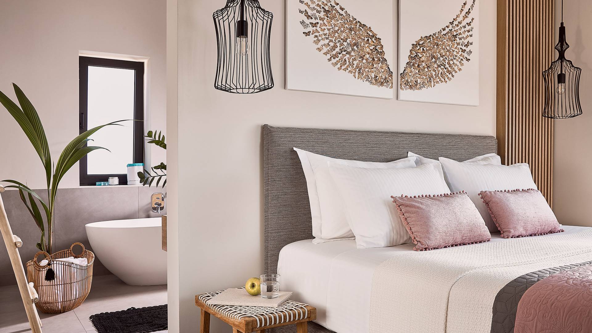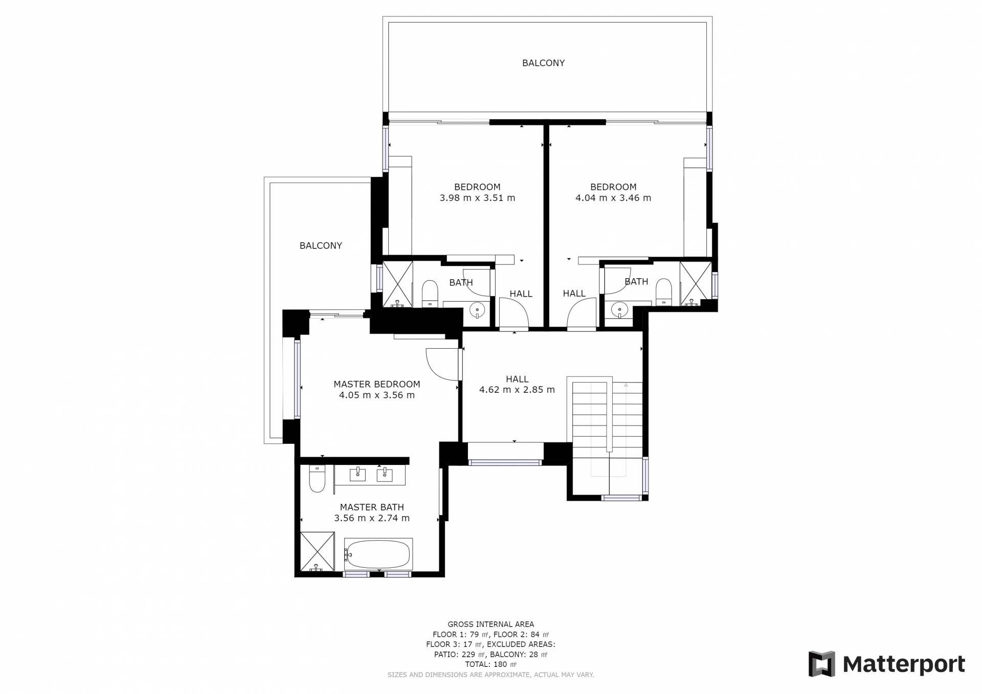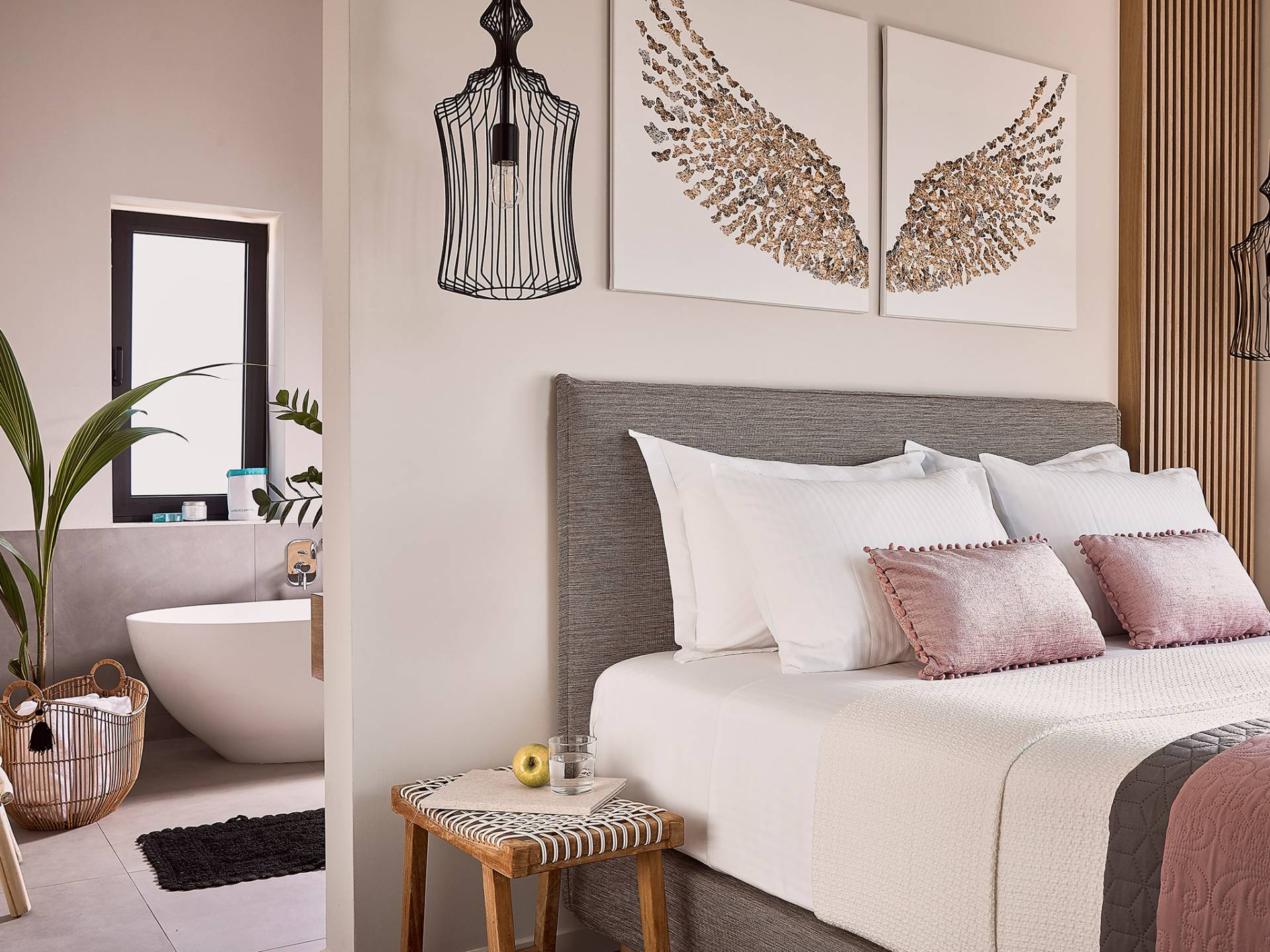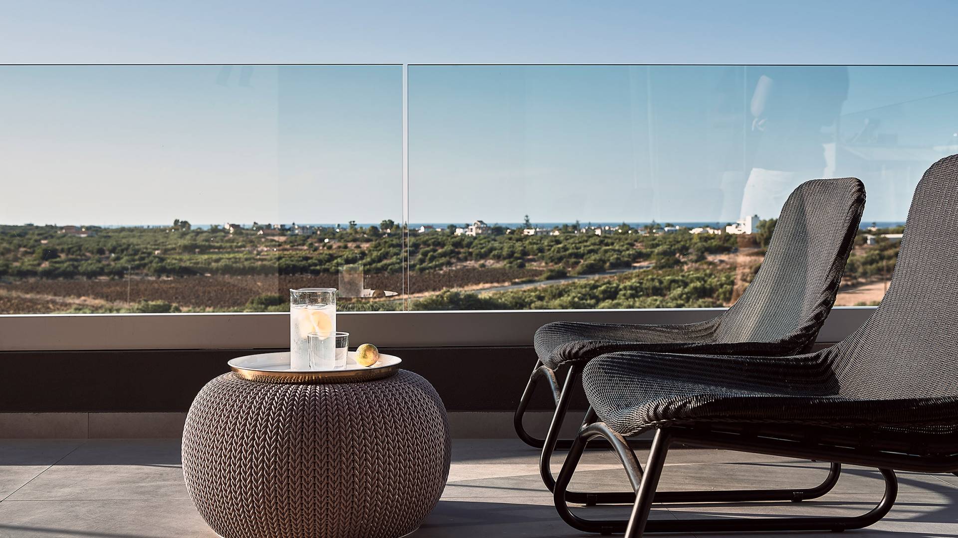 Siguiendo las escaleras hasta el nivel superior, lo recibe un pasillo elegantemente decorado, con una gran ventana y una sala de estar. Los tres dormitorios restantes de Carpos Villa se pueden encontrar en este nivel. El dormitorio principal con cama de matrimonio tamaño king (1,80 X 2,00) y su baño en suite con doble lavabo, bañera y cabina de ducha, son la máxima expresión del lujo y el confort. También proporciona acceso a una terraza equipada con muebles de jardín y vistas impresionantes al campo y al mar.