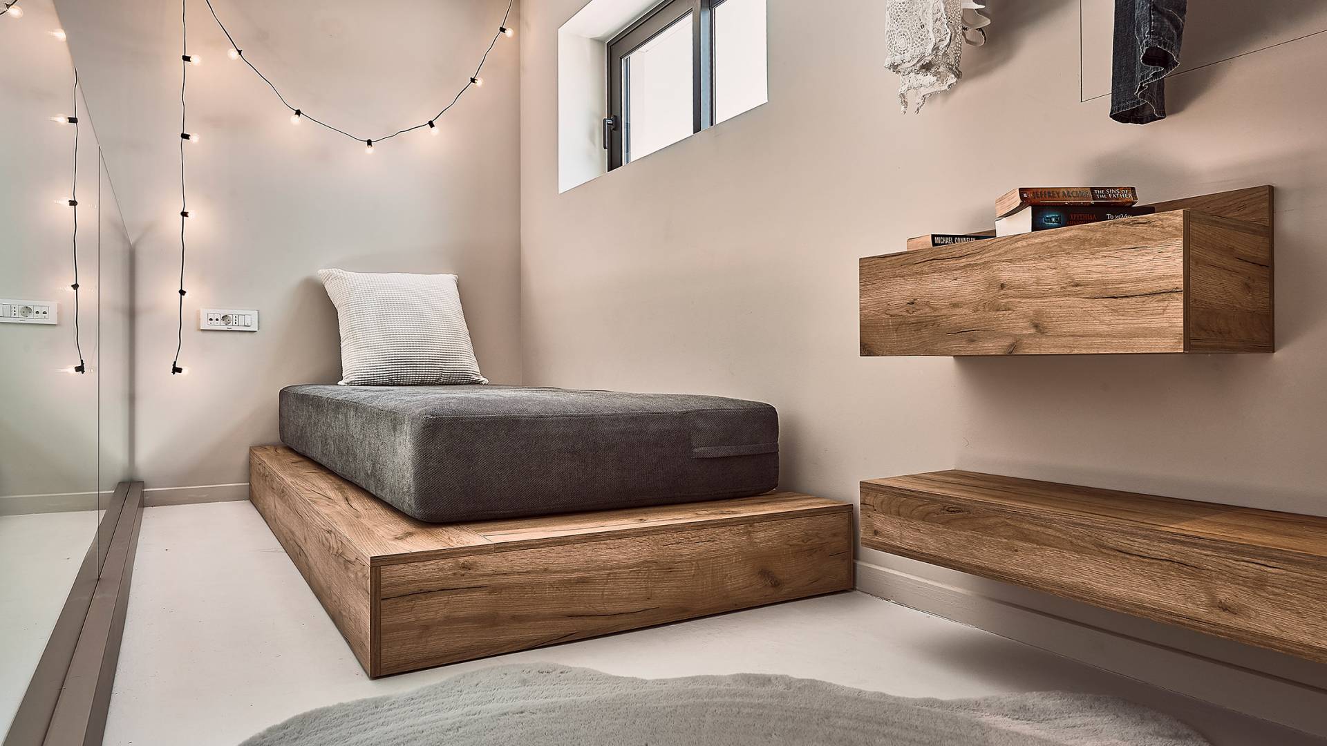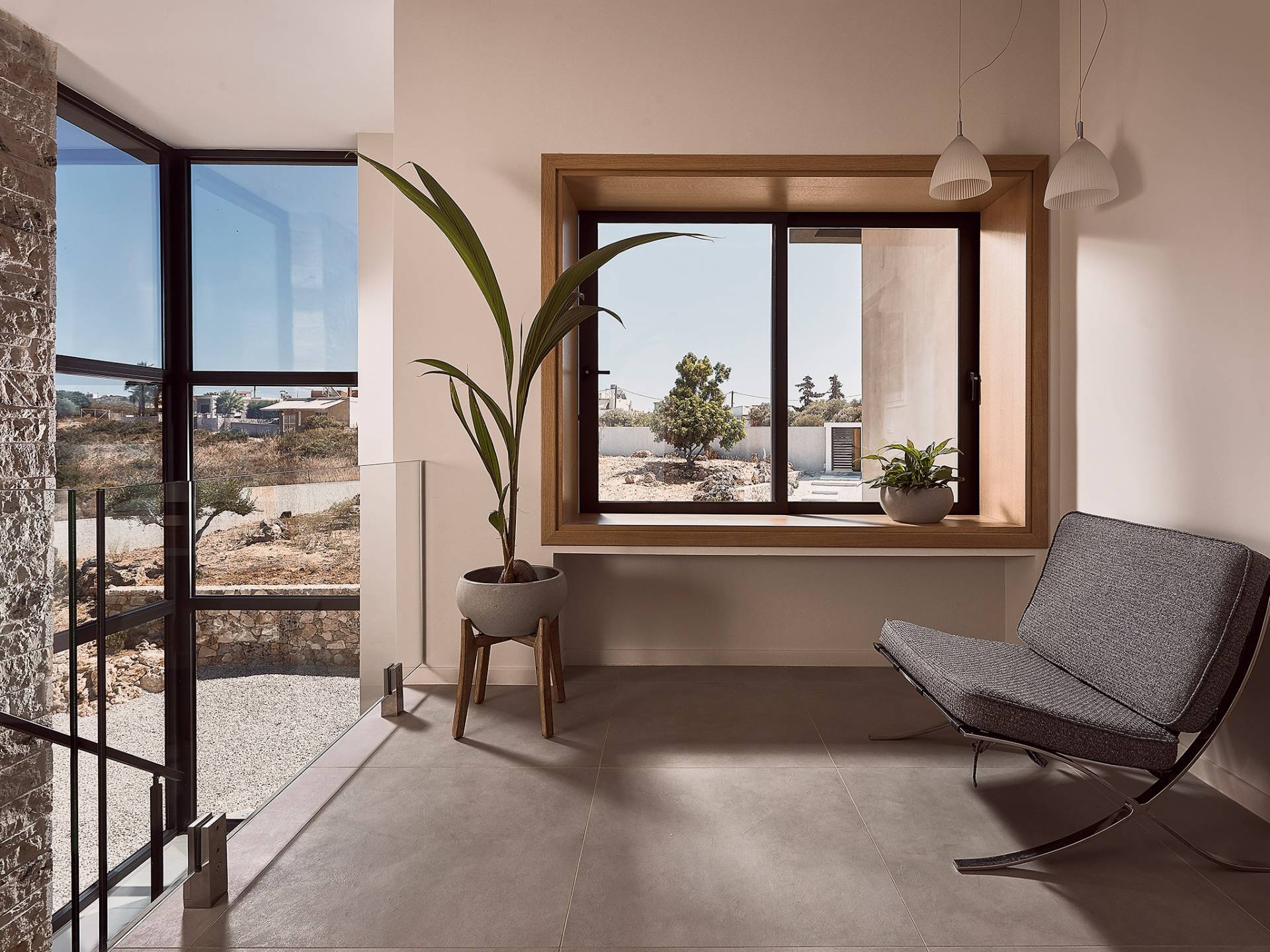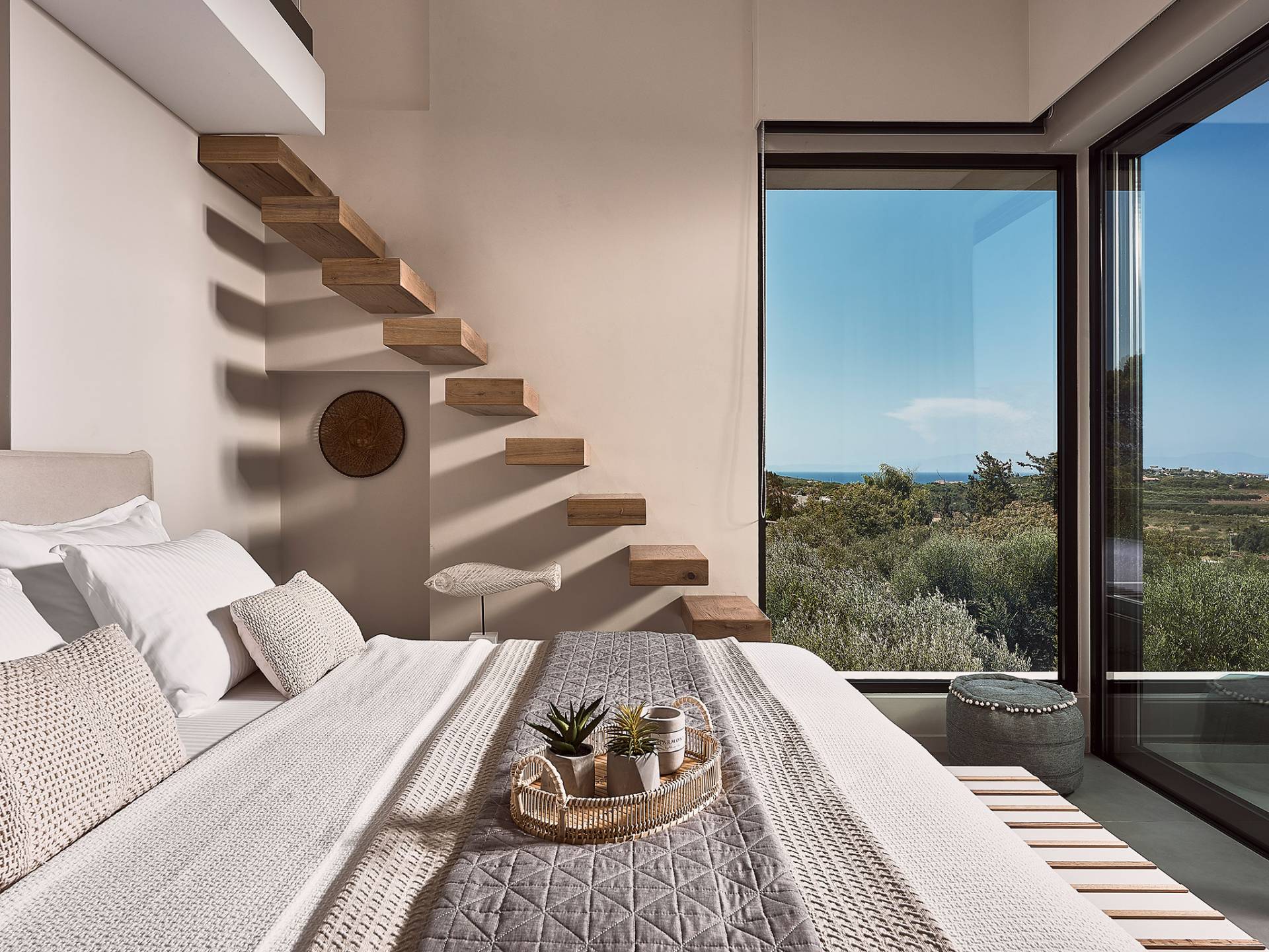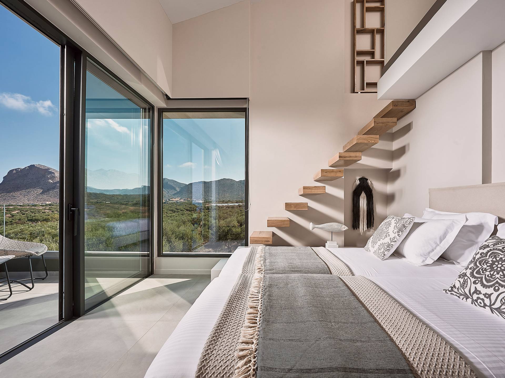 Los otros dos dormitorios cuentan con dos camas individuales cada uno (0,90 X 2,00), que también se pueden configurar como una cama doble tamaño king (1,80 X 2,00) a pedido. Ambas cuentan con baño privado con cabina de ducha y escaleras que conducen a un altillo, con una cama supletoria (1,00 X 2,00), por lo que son ideales para parejas con niños. Además, estos dos dormitorios ofrecen acceso al balcón, con maravillosas vistas de los olivares de los alrededores, el mar y la ciudad de Chania.