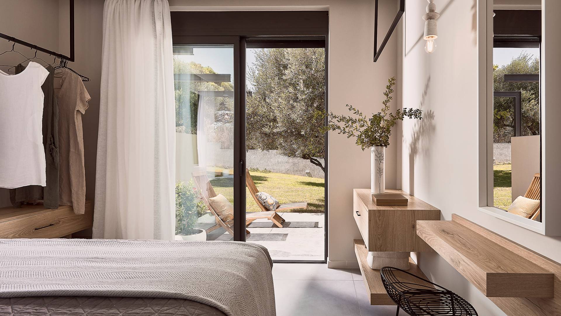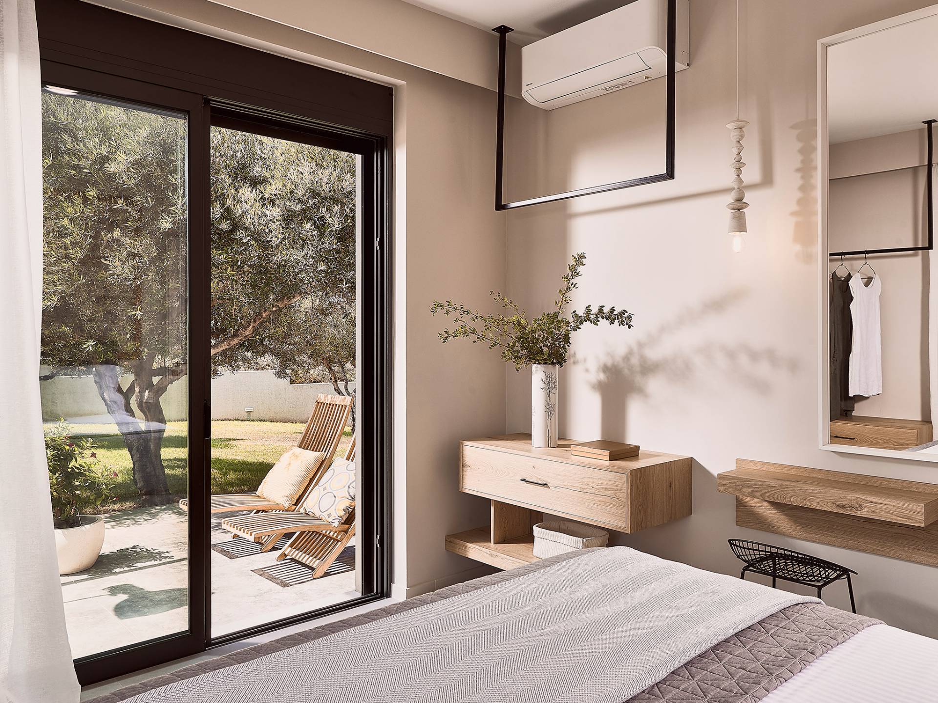 Además, en esta planta también está disponible un dormitorio con cama de matrimonio (1,60 X 2,00) y baño en suite con cabina de ducha. El dormitorio tiene acceso directo al jardín cubierto de césped y una terraza equipada con tumbonas. Todas las habitaciones y la sala de estar tienen aire acondicionado, mientras que los lujosos artículos de tocador también están disponibles para nuestros huéspedes.
