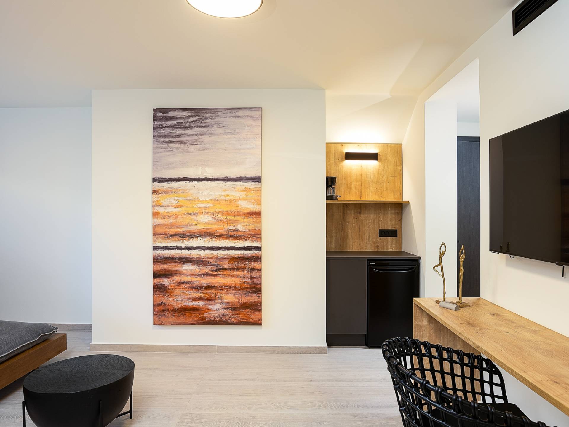 Elegante espacio con un segundo salón, dormitorio privado con vestidor, baño en suite, minibar, cafetera, Smart TV y una acogedora sala de juegos – ideal para familias numerosas o adolescentes.