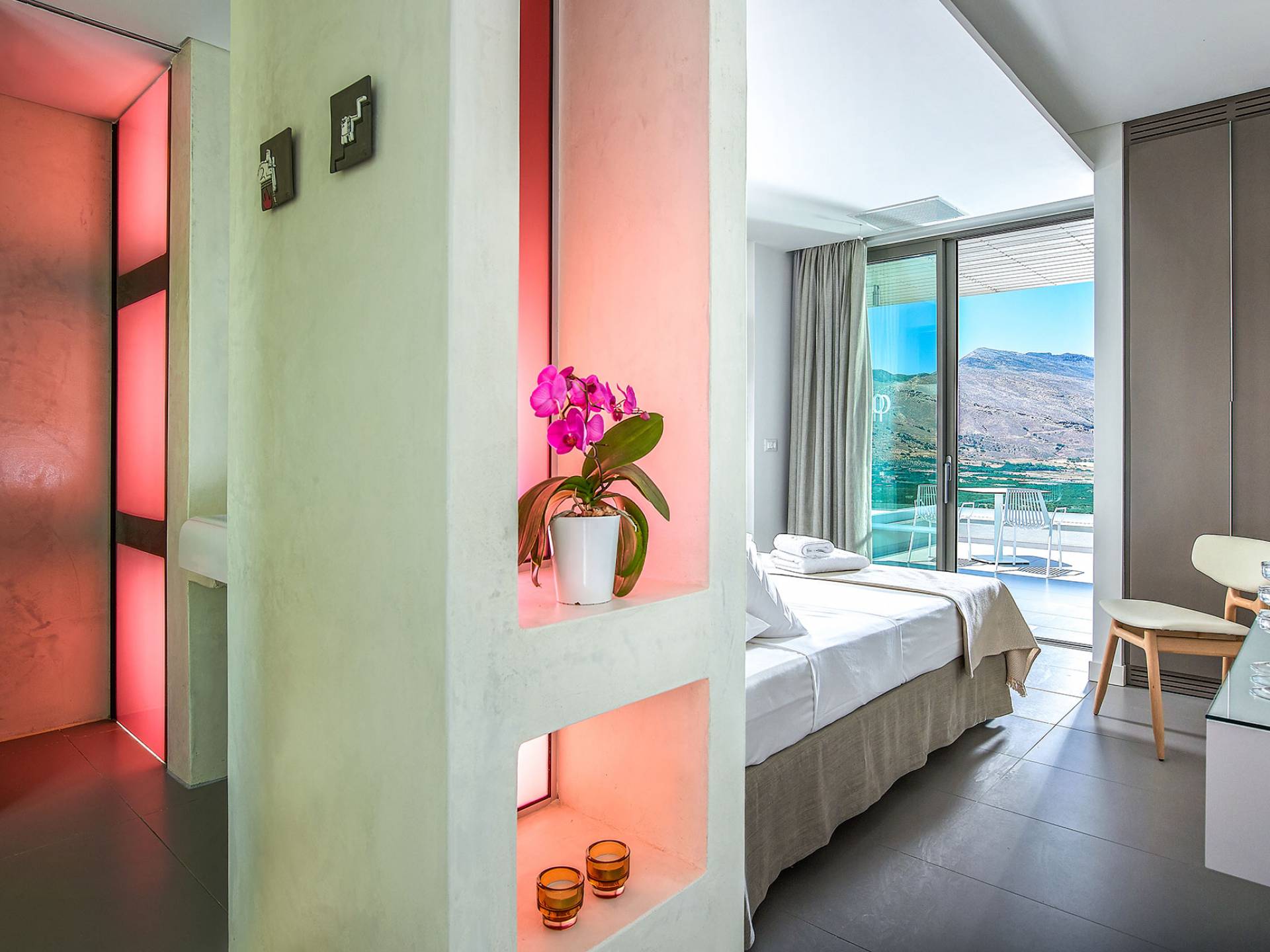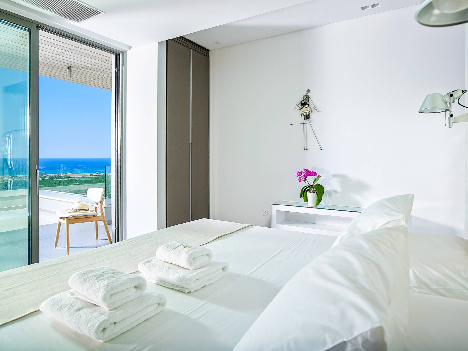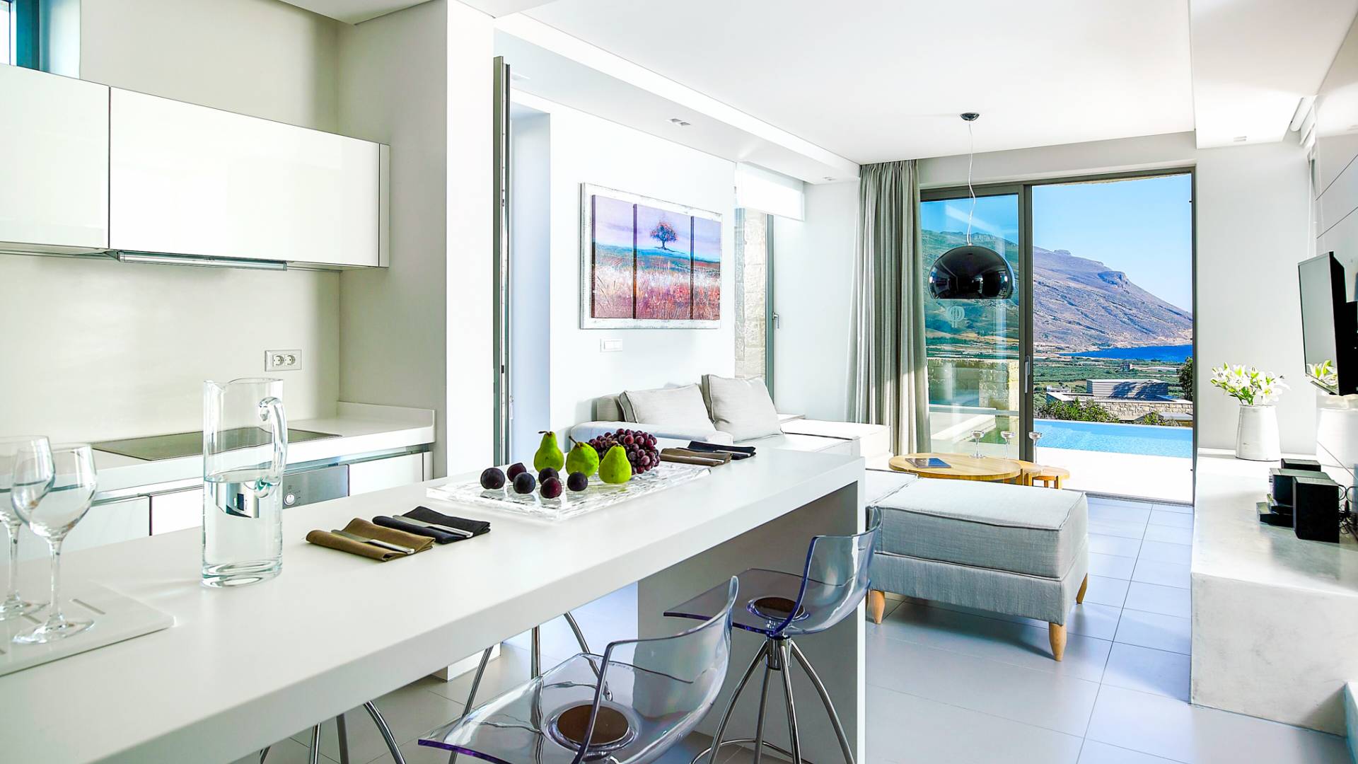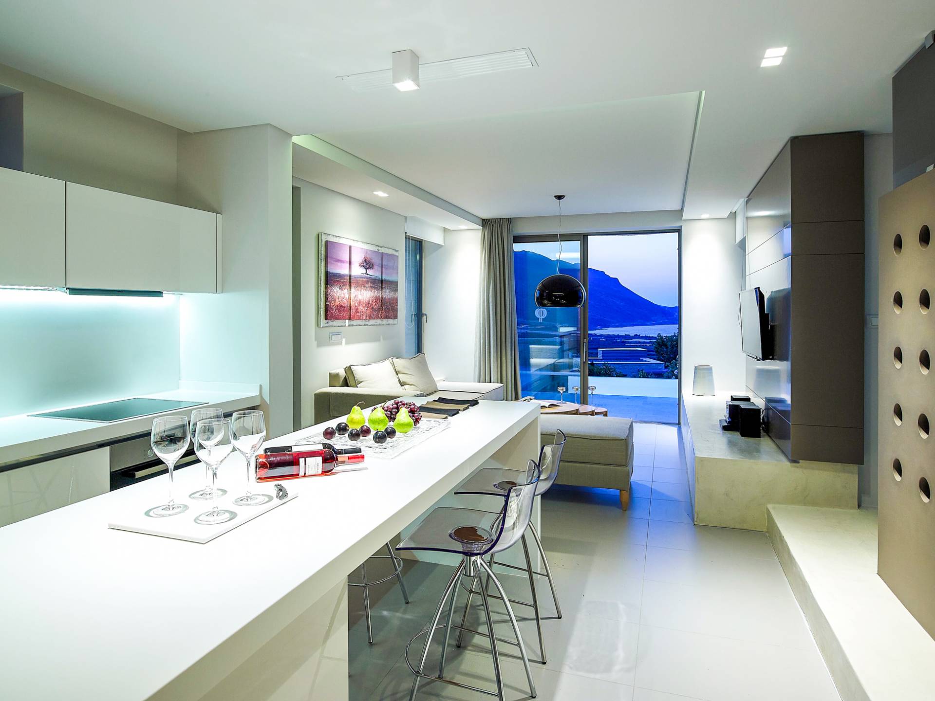 Villa Theseus Kissamos is split over two floors, with many windows that let in the sunlight offering panoramic views from any room. The ground floor opens up to a spacious, modern living room with an open plan kitchen equipped with state of the art appliances and including stylish Corian work surfaces and an informal dining area. The ground floor double/twin bedroom offers the luxury of an en-suite bathroom with a walk-in Spa shower. A staircase leads to a first-floor master bedroom with a large front-facing private balcony which offers an unblocked view of the Aegean Sea and an en-suite open-plan bathroom with a charming garden view.