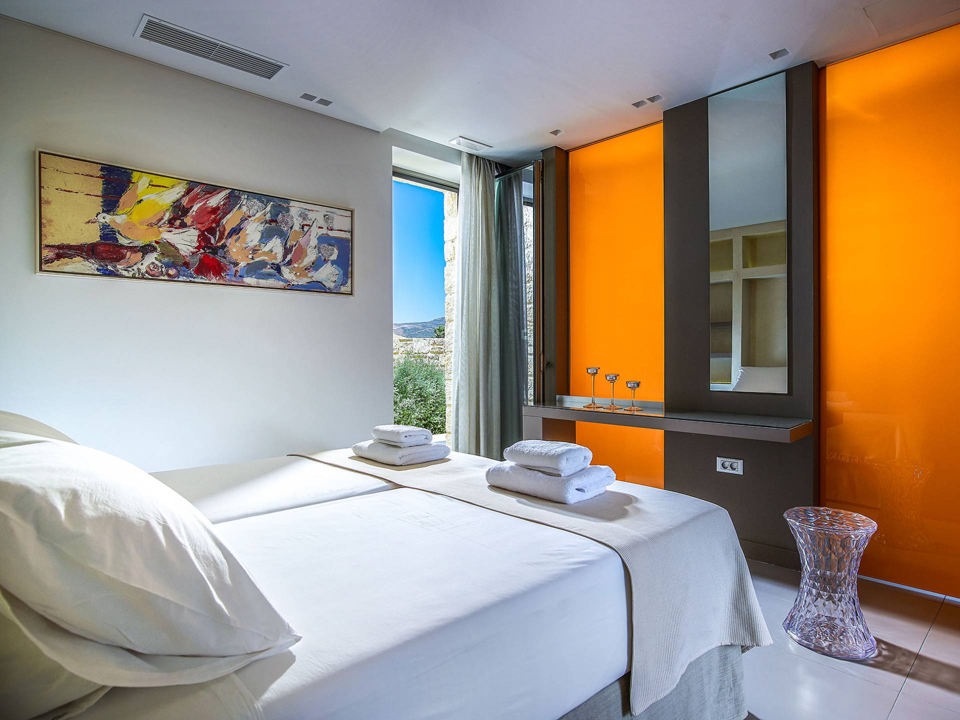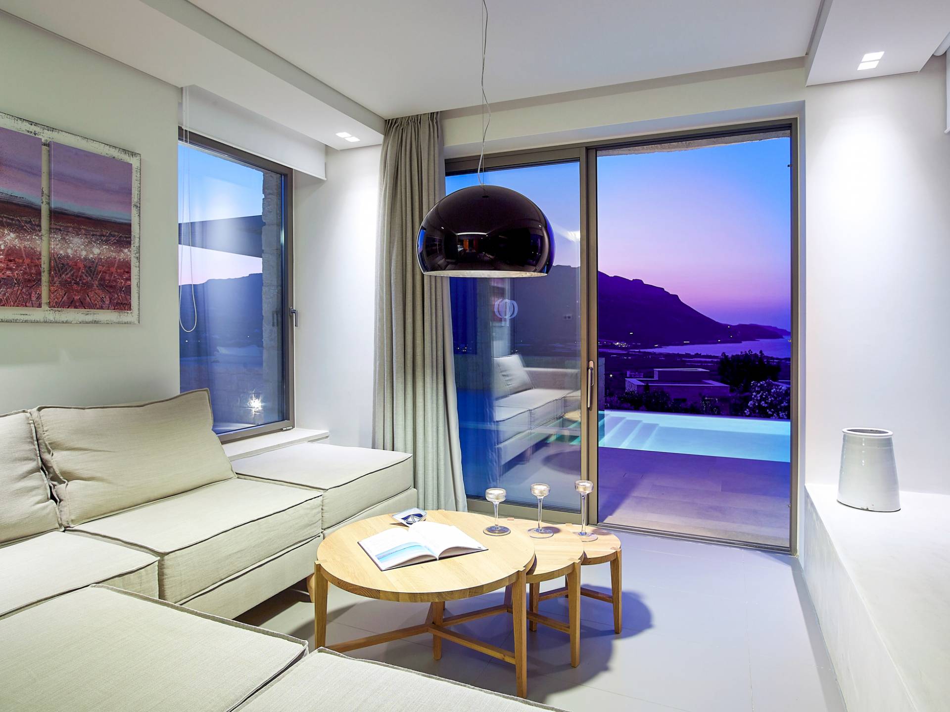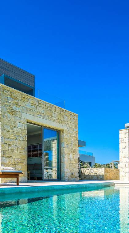 Set within a painting-like frame, overlooking the Gramvousa peninsula and Kissamos bay, Villa Theseus Kissamos is in total harmony with its ambiance employing natural elements of stone and wood in its beautiful terrace with a private infinity pool and a charming outdoor dining area with a pergola where you can enjoy the sun and sea breeze with your beloved ones. The landscaped surrounding gardens conform to the natural environment and create a typical Mediterranean landscape.