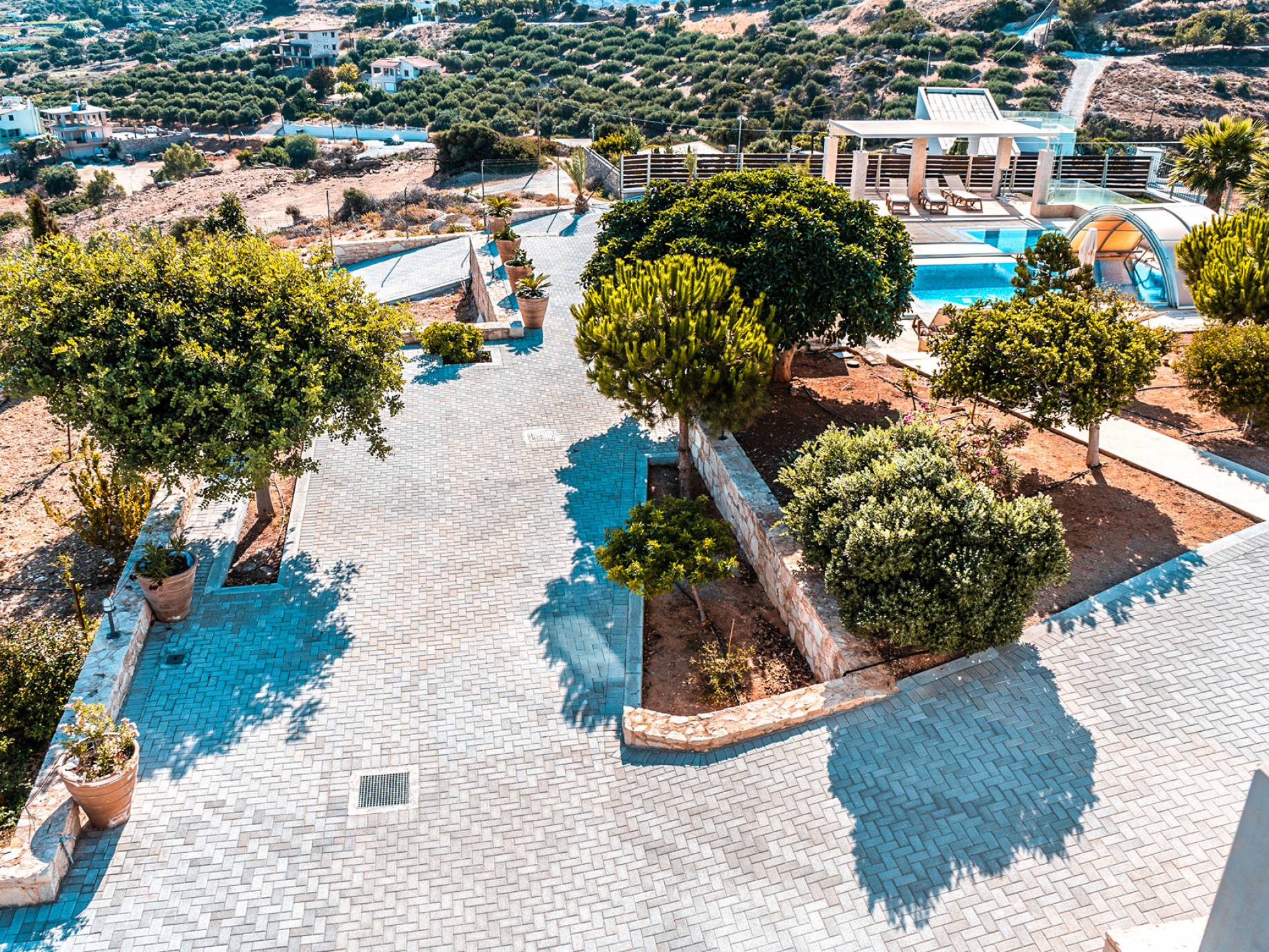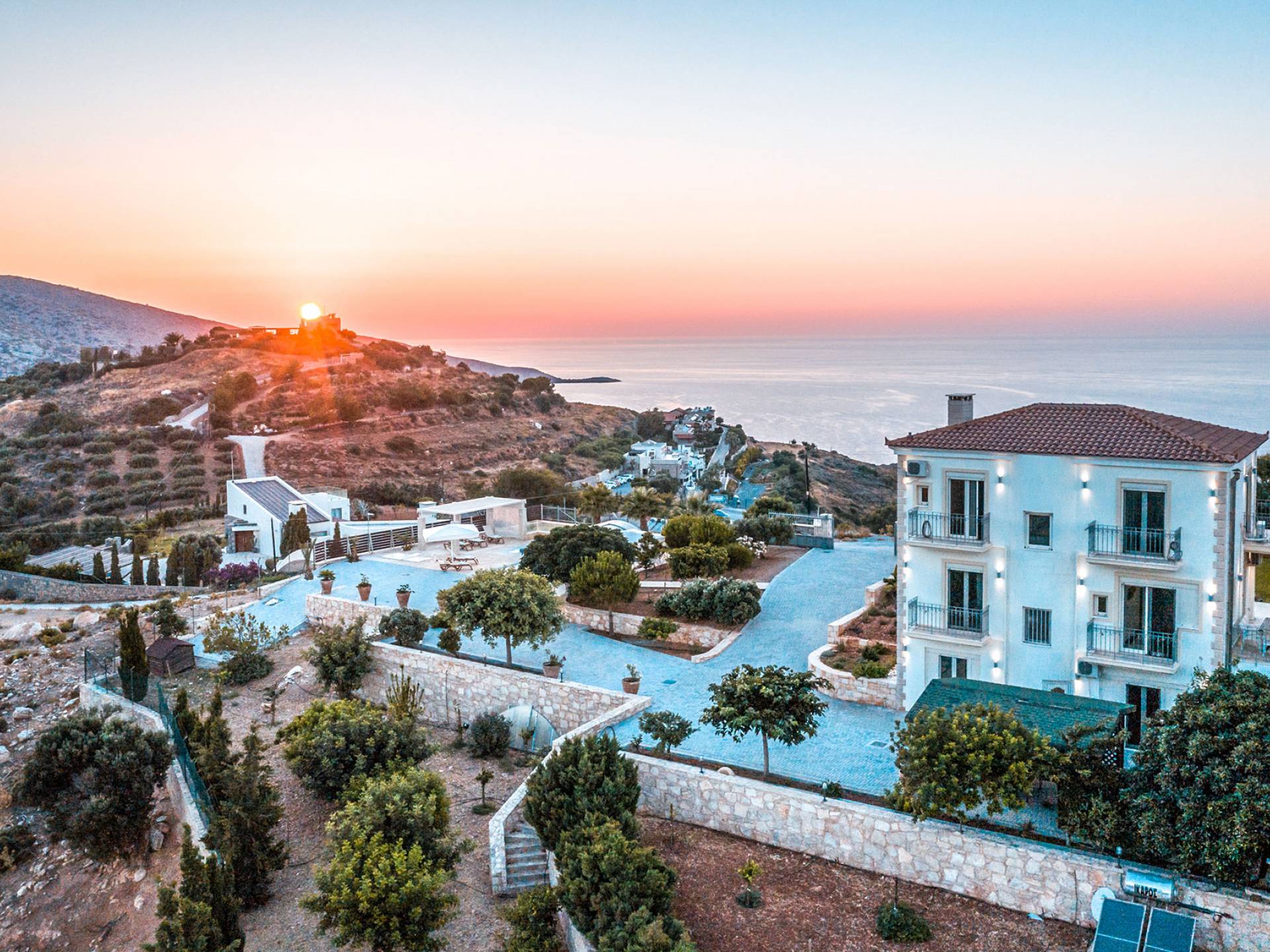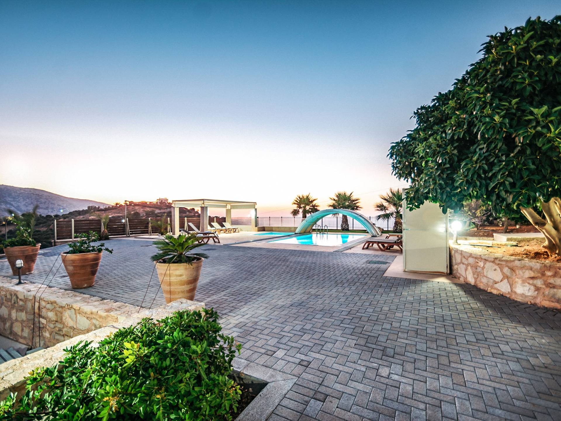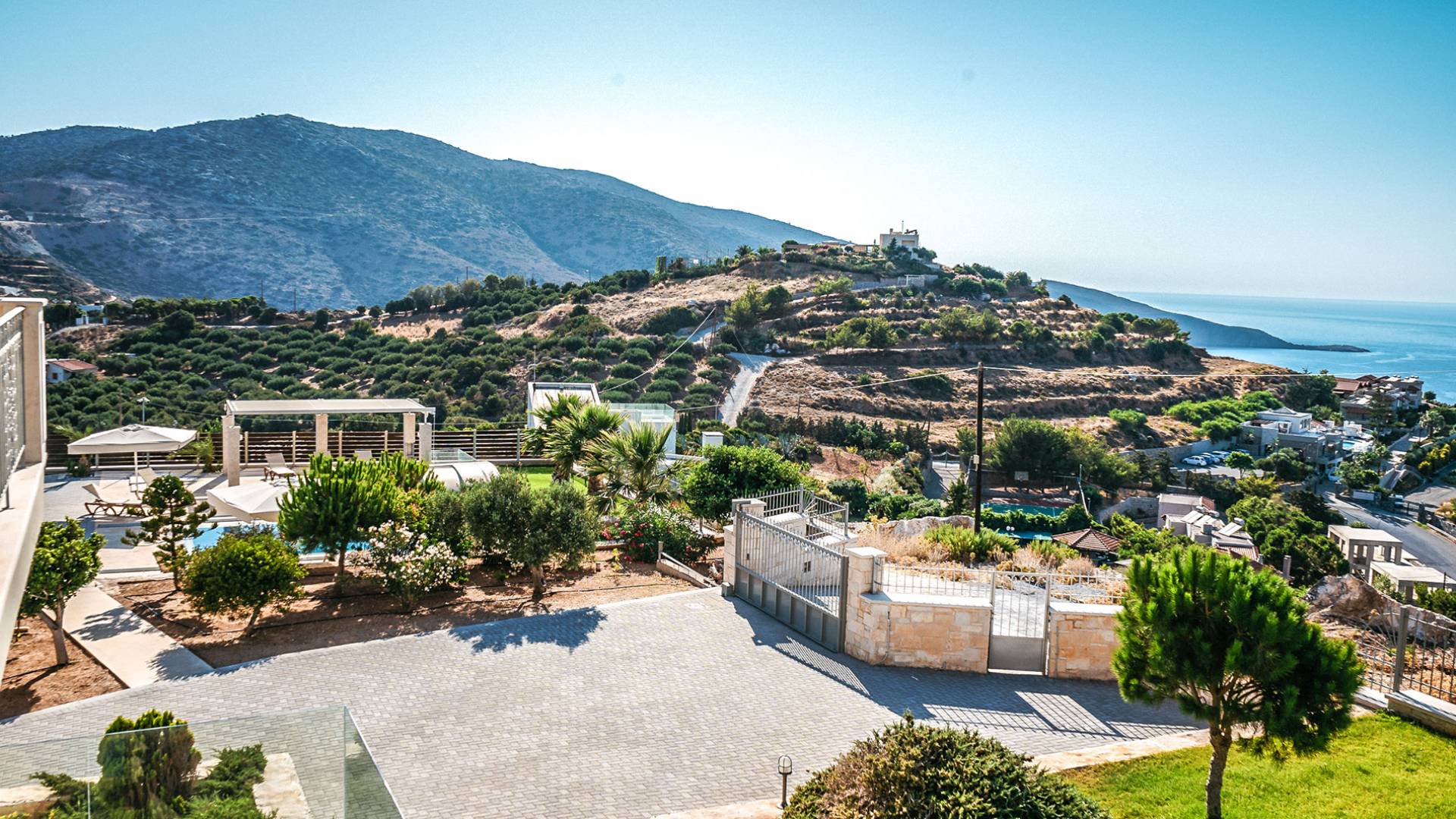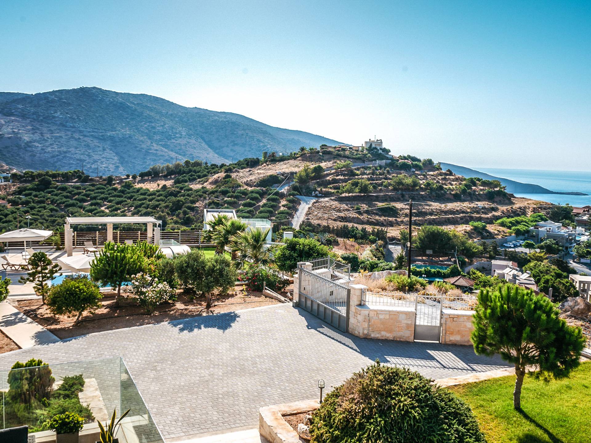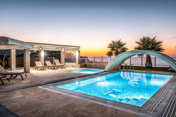 Aria Villa Crete se encuentra en la cima de una hermosa colina en Agia Pelagia, Heraklion, Creta. La residencia se extiende sobre tres niveles con una superficie total de 246m2. Está situado en una propiedad de 2500 m2 sobre la bahía de Agia Pelagia y ofrece total privacidad con espectaculares vistas a la montaña y al mar.