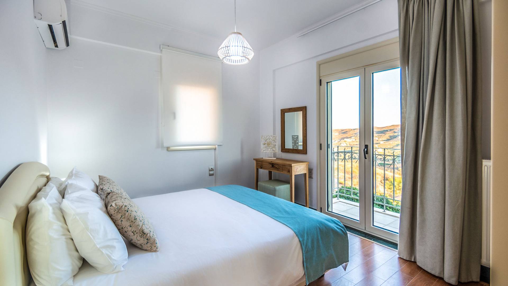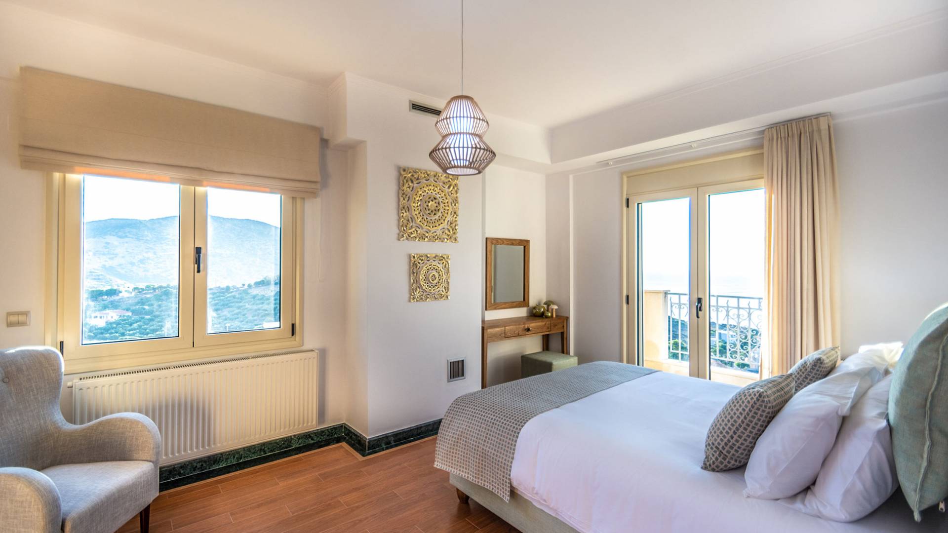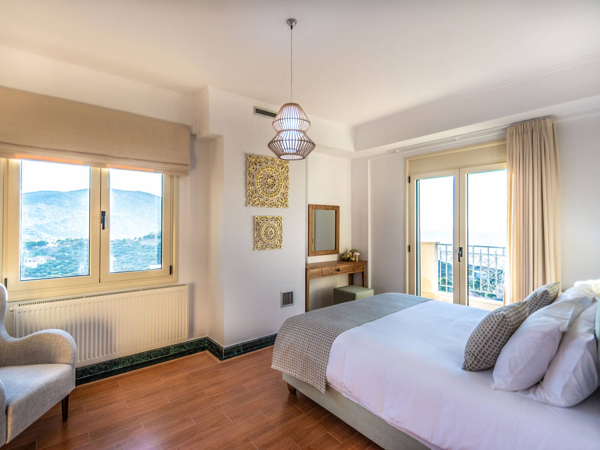 Cada habitación cuenta con grandes ventanas y balcones privados con vistas panorámicas del entorno natural. Todas las habitaciones tienen una decoración contemporánea y tradicional que incluye muebles y ropa de cama cómodos. Villa Aria está construida con una combinación de materiales naturales como mármol, granito, madera, piedra y acero, lo que hace que esta propiedad sea funcional, lujosa y ecológica.
