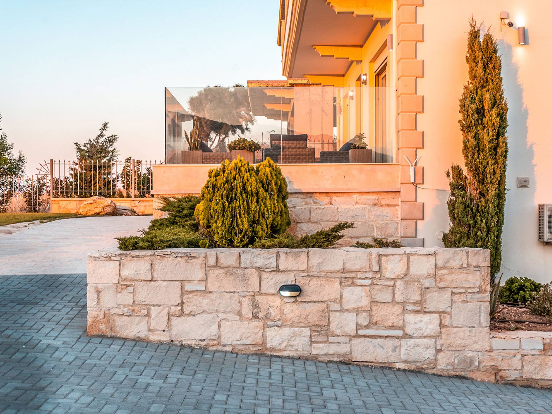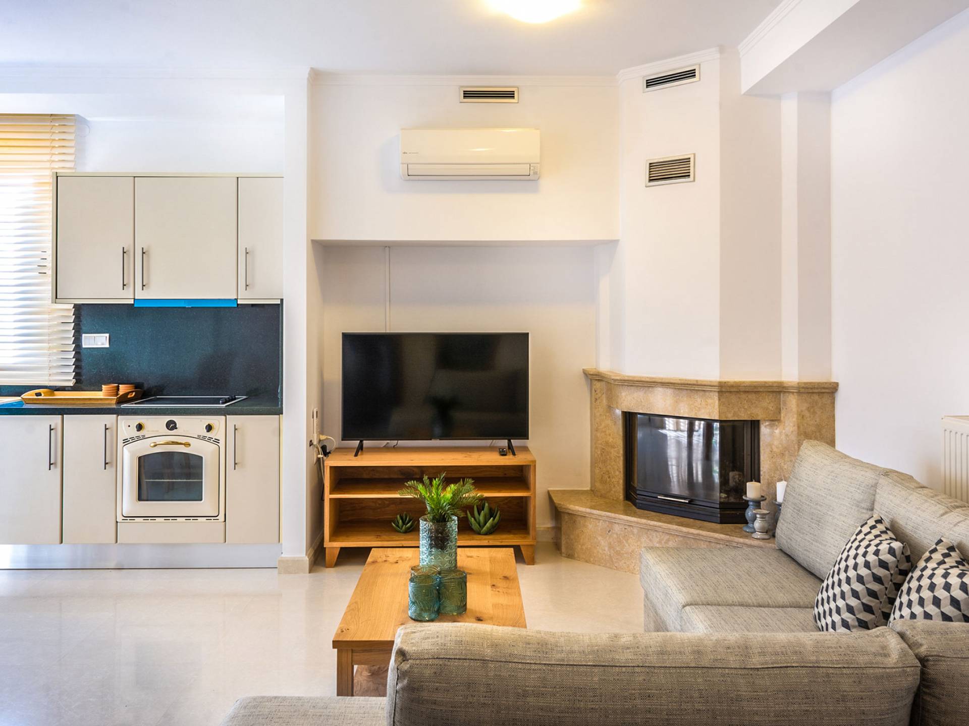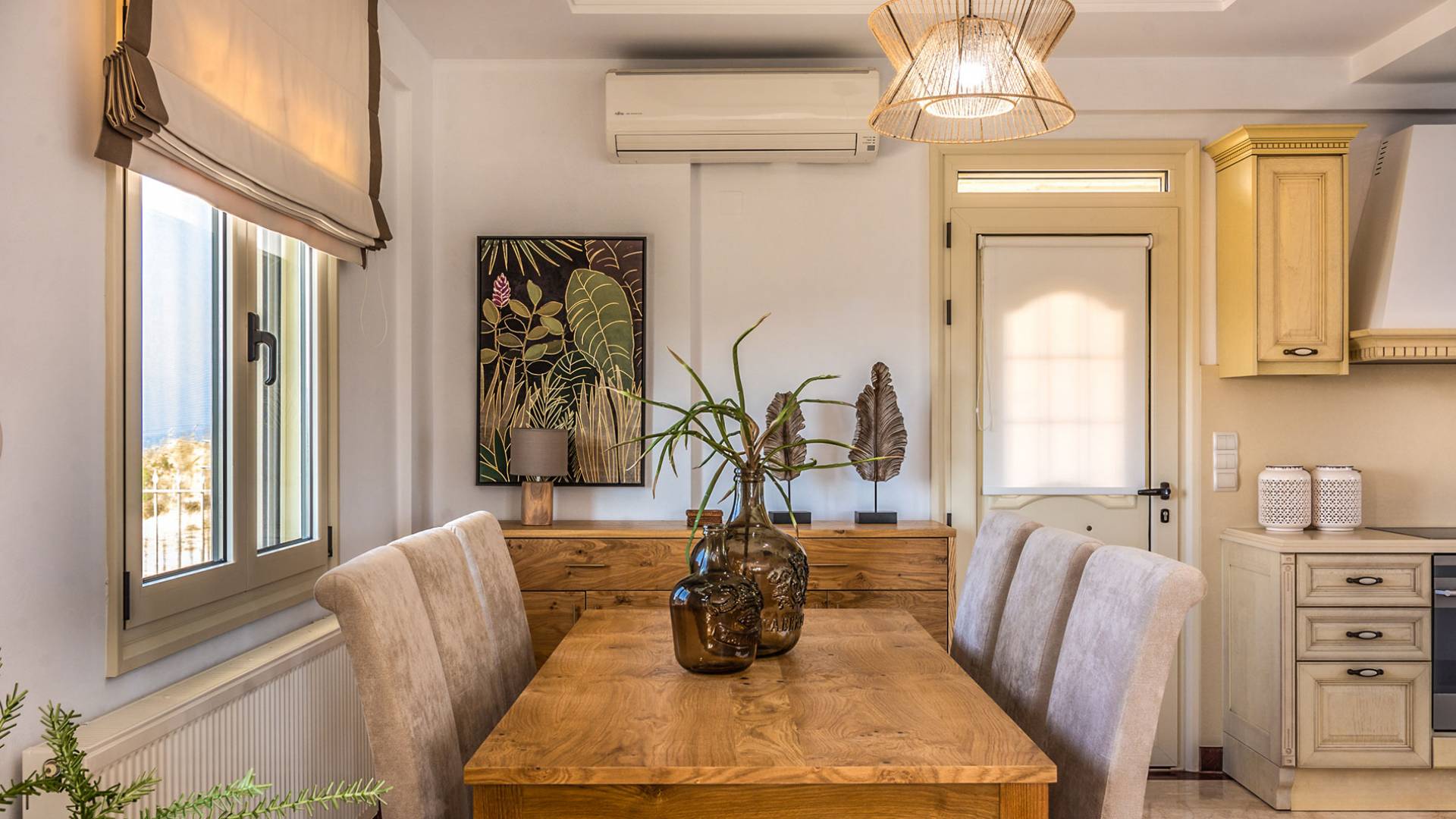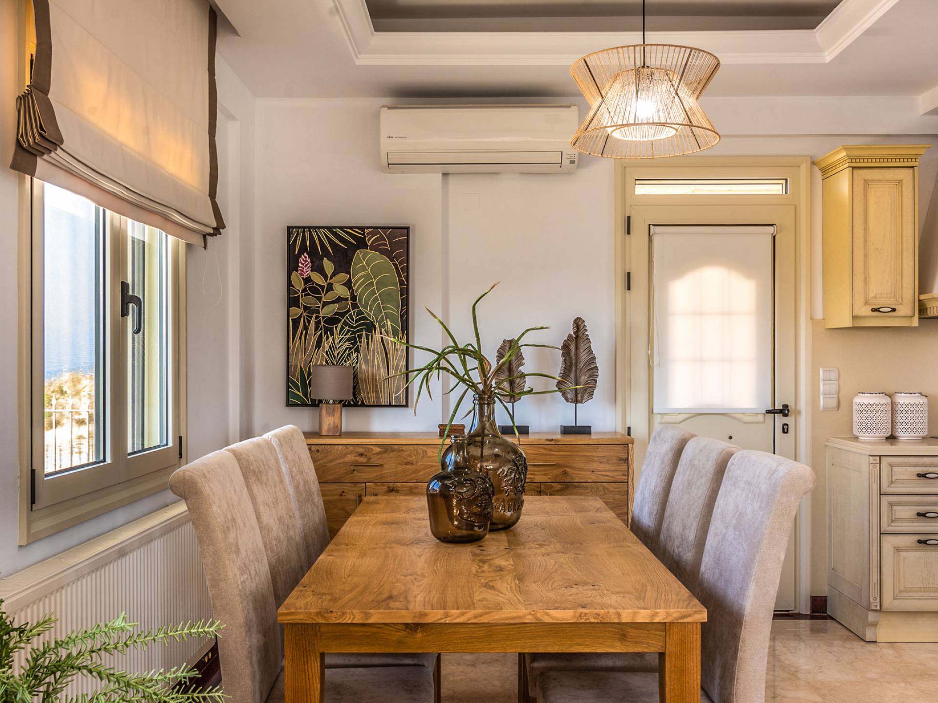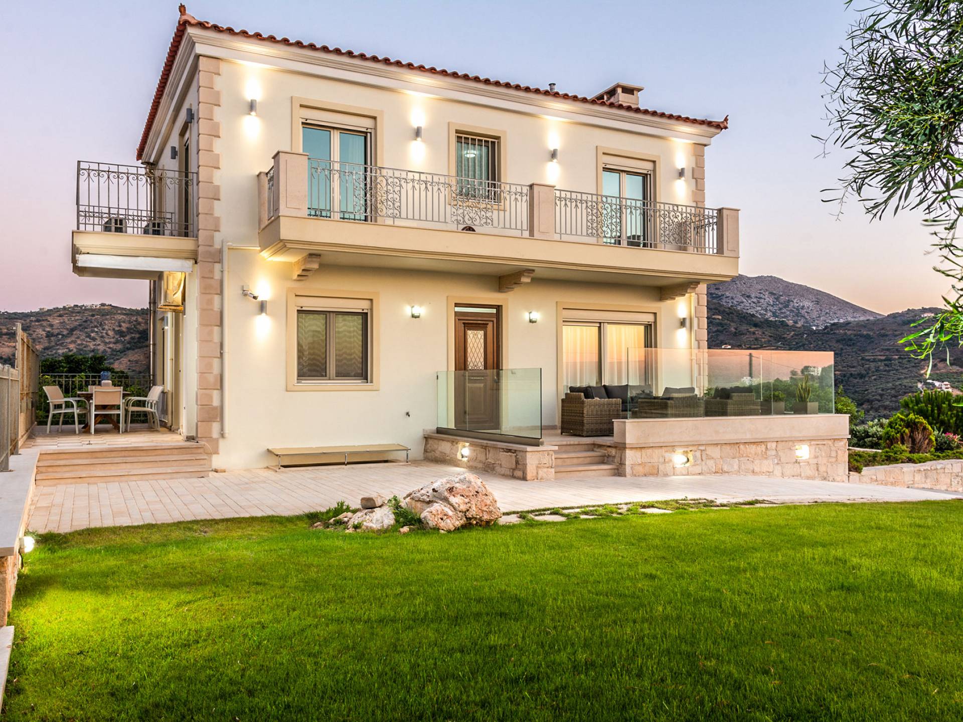 Aria Villa Crete ofrece una residencia de dos niveles con cuatro dormitorios, cuatro baños (tres completos y medio), dos acogedoras salas de estar con chimenea y dos cocinas bien equipadas. Está reservado como una residencia y es perfecto para un grupo o familias que deseen un alojamiento espacioso y una hospitalidad hogareña. La villa puede acomodar fácilmente a 10 personas.