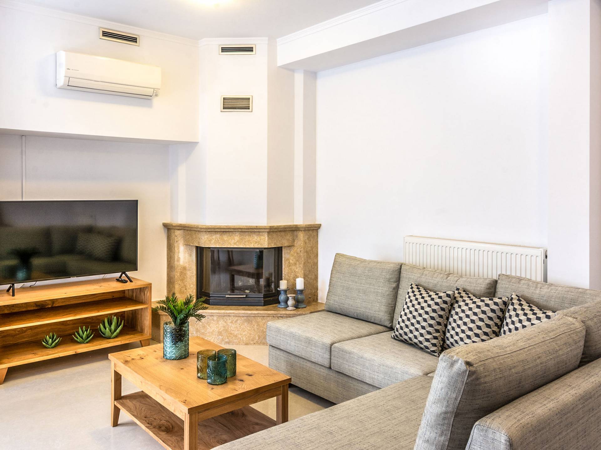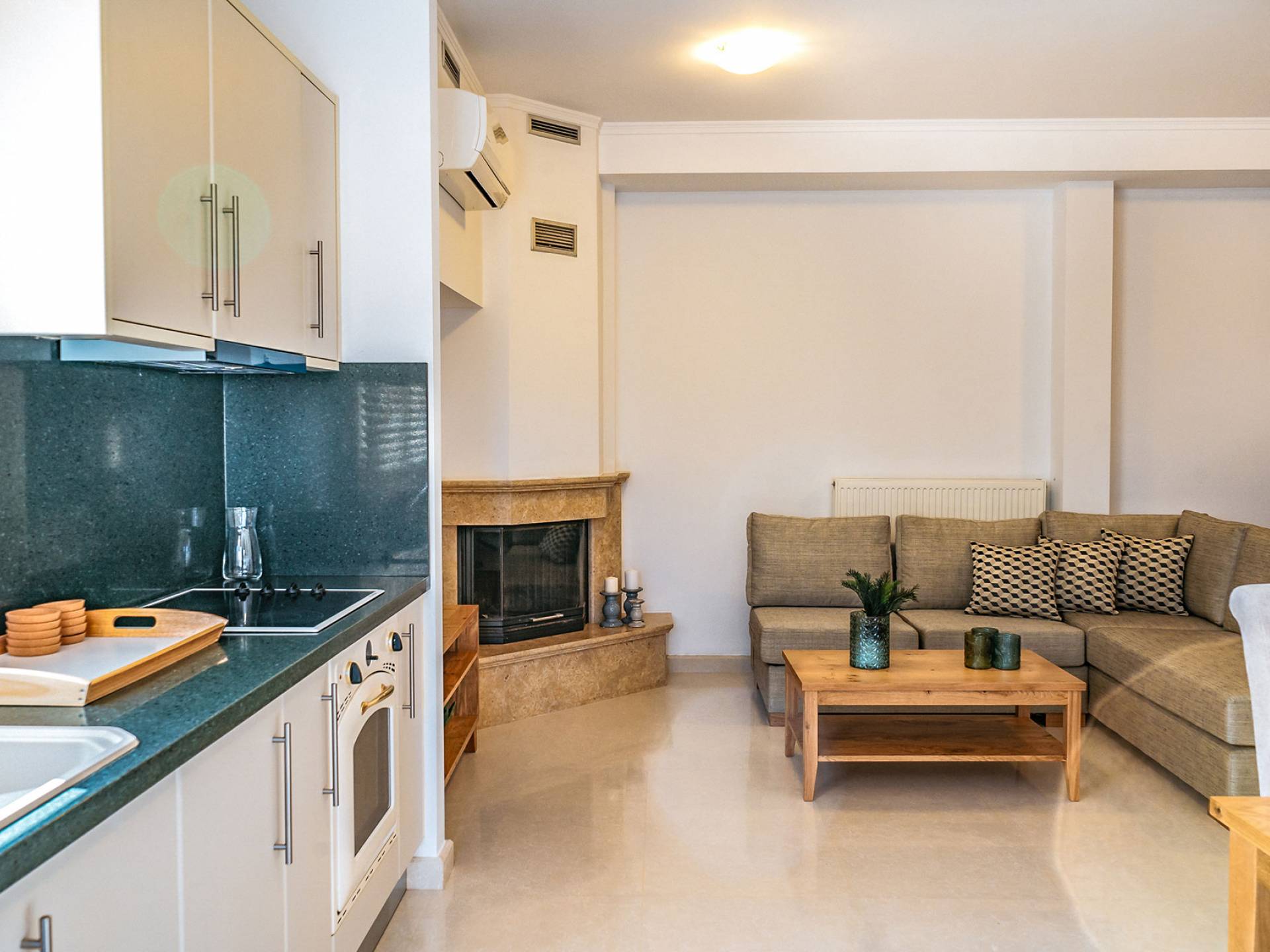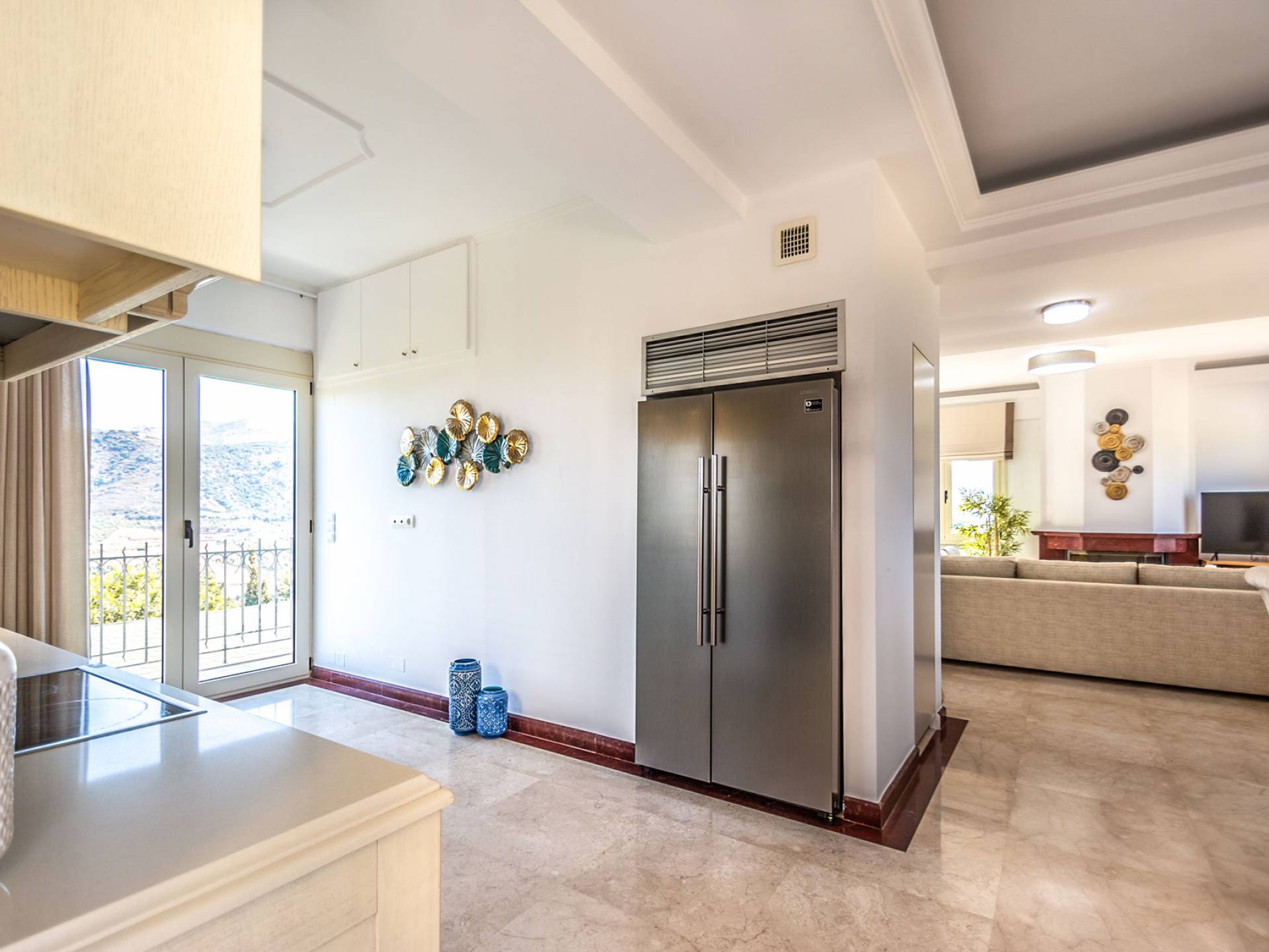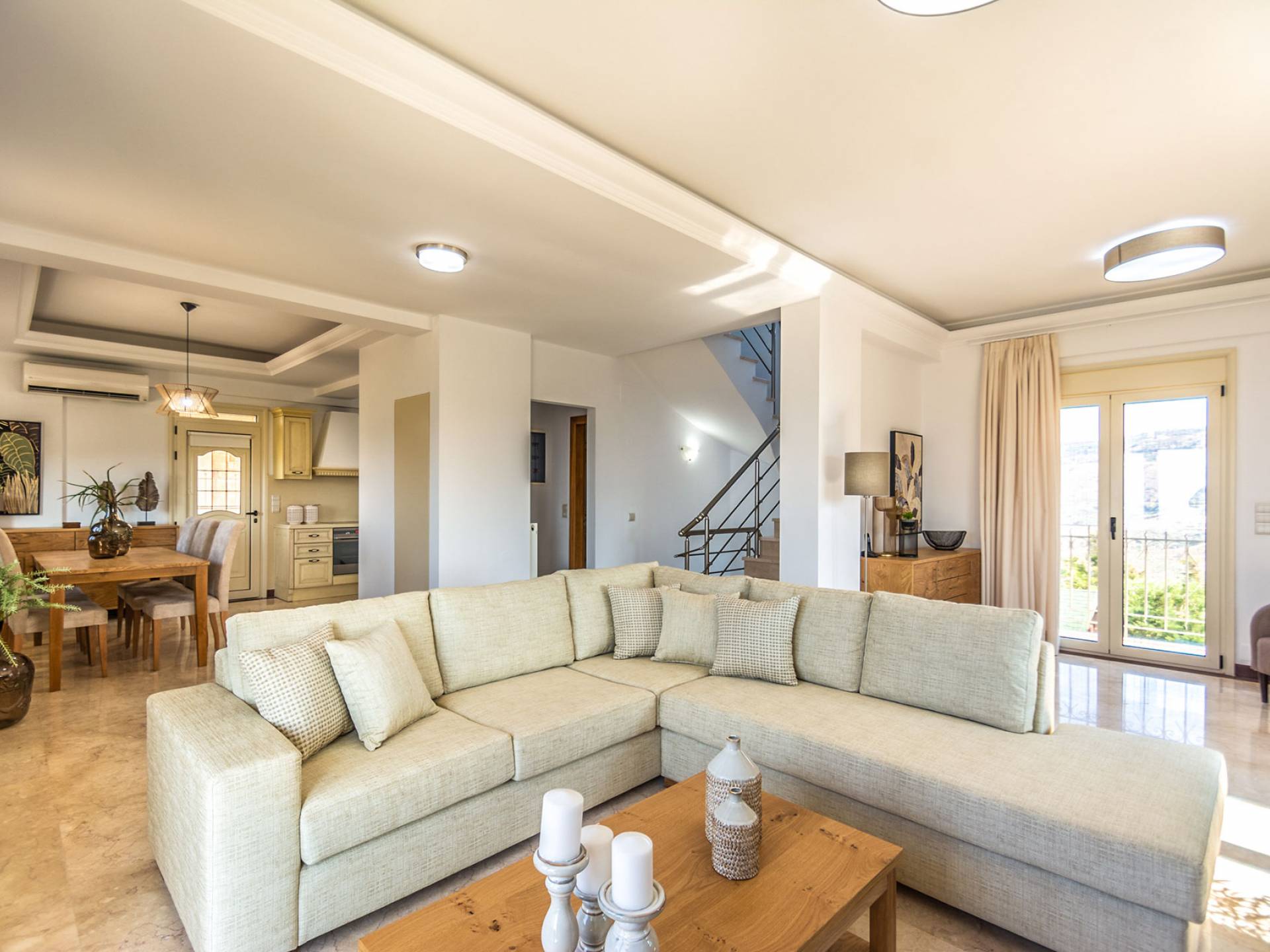 Aria Villa Crete ofrece una residencia de dos niveles con cuatro dormitorios, cuatro baños (tres completos y medio), dos acogedoras salas de estar con chimenea y dos cocinas bien equipadas. Está reservado como una residencia y es perfecto para un grupo o familias que deseen un alojamiento espacioso y una hospitalidad hogareña. La villa puede acomodar fácilmente a 10 personas.