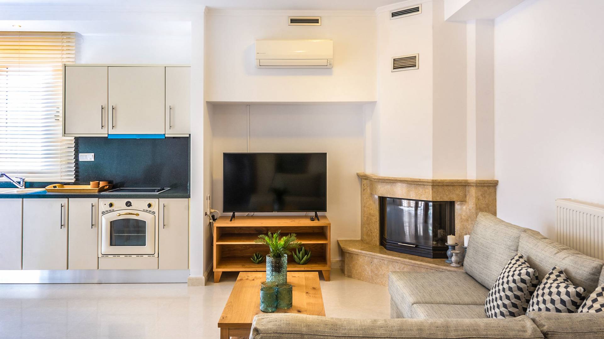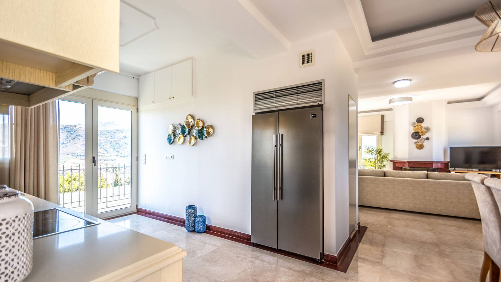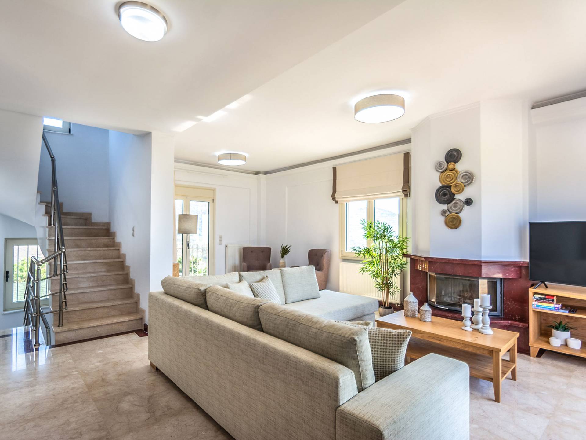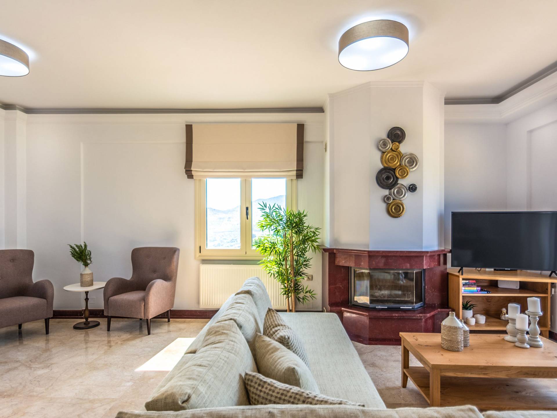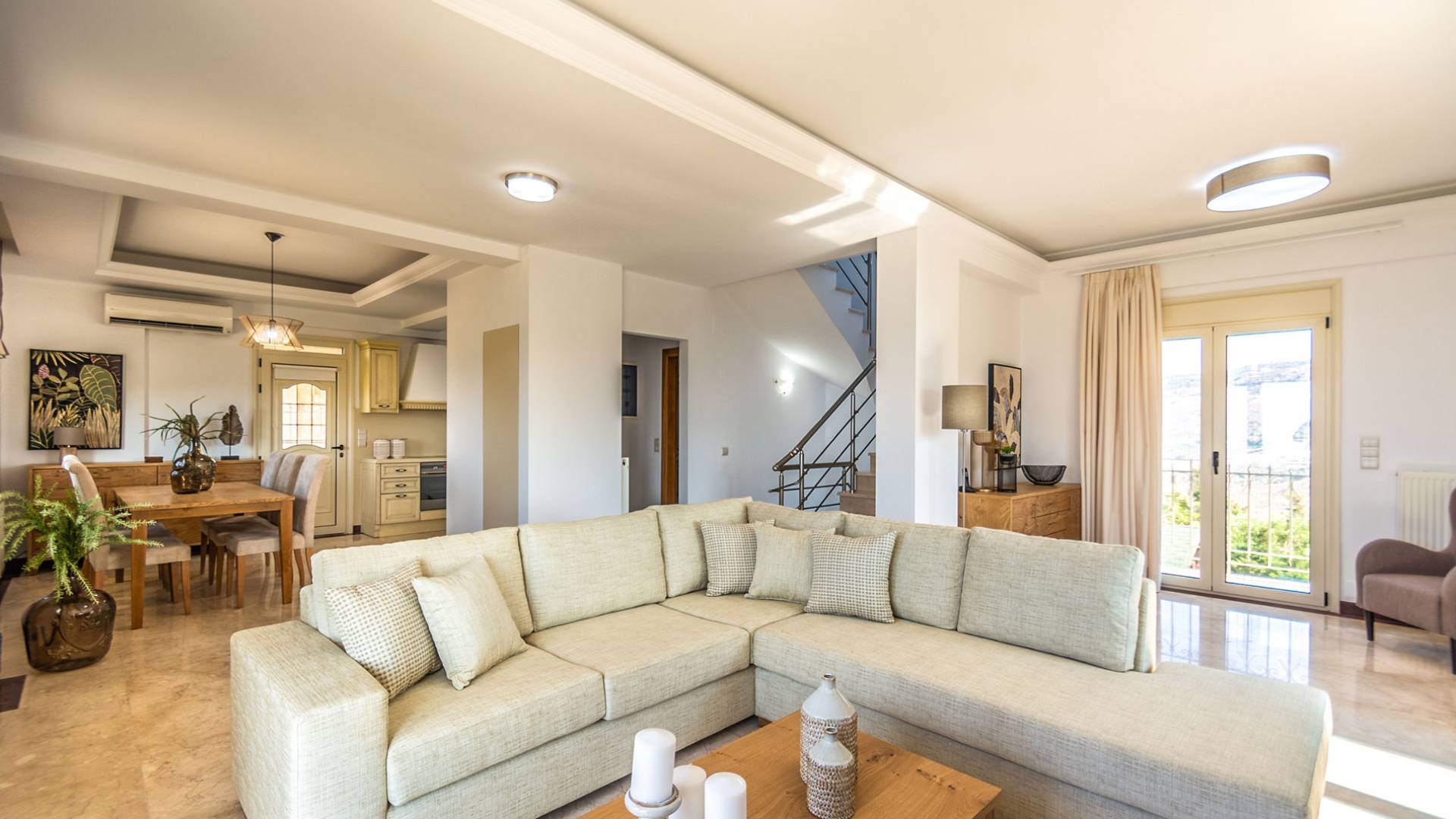 Aria Villa Crete ofrece una residencia de dos niveles con cuatro dormitorios, cuatro baños (tres completos y medio), dos acogedoras salas de estar con chimenea y dos cocinas bien equipadas. Está reservado como una residencia y es perfecto para un grupo o familias que deseen un alojamiento espacioso y una hospitalidad hogareña. La villa puede acomodar fácilmente a 10 personas.