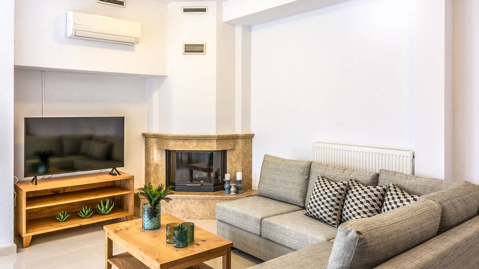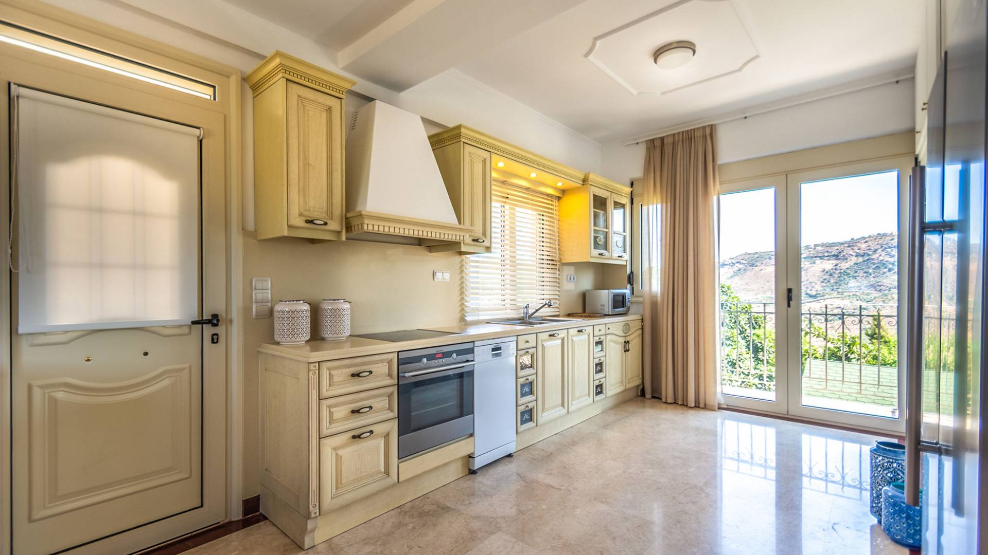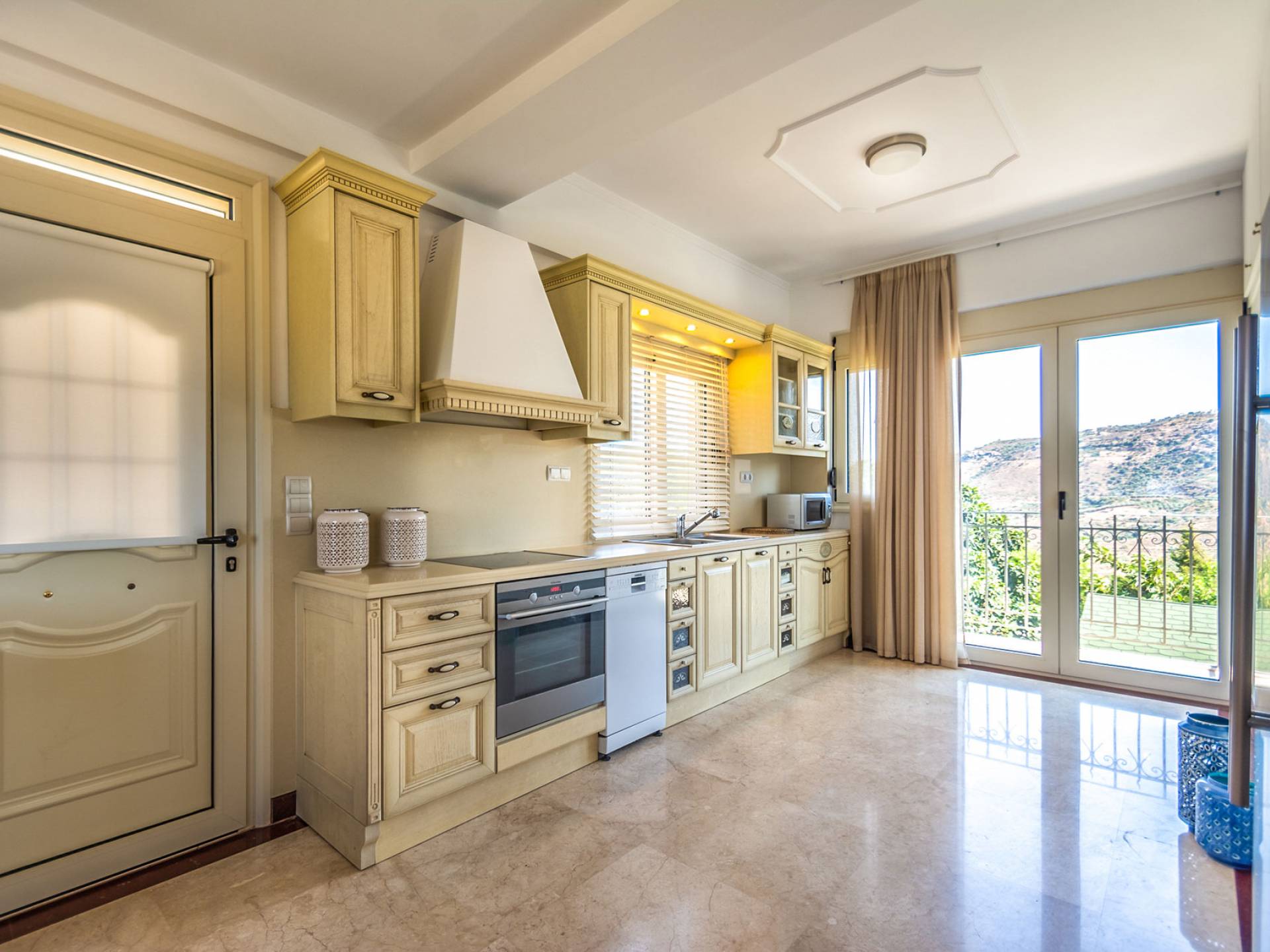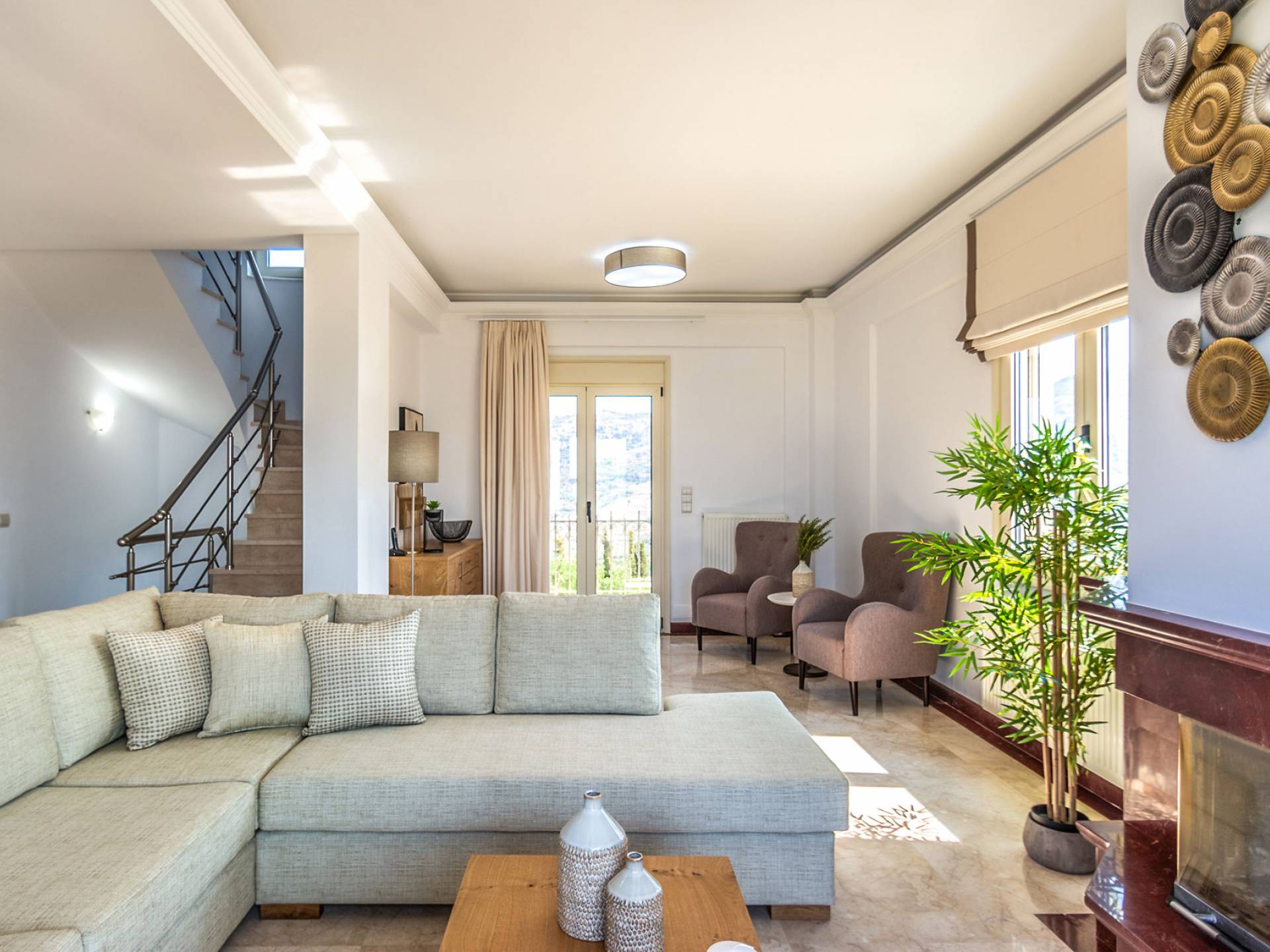Aria Villa Crete ofrece una residencia de dos niveles con cuatro dormitorios, cuatro baños (tres completos y medio), dos acogedoras salas de estar con chimenea y dos cocinas bien equipadas. Está reservado como una residencia y es perfecto para un grupo o familias que deseen un alojamiento espacioso y una hospitalidad hogareña. La villa puede acomodar fácilmente a 10 personas.