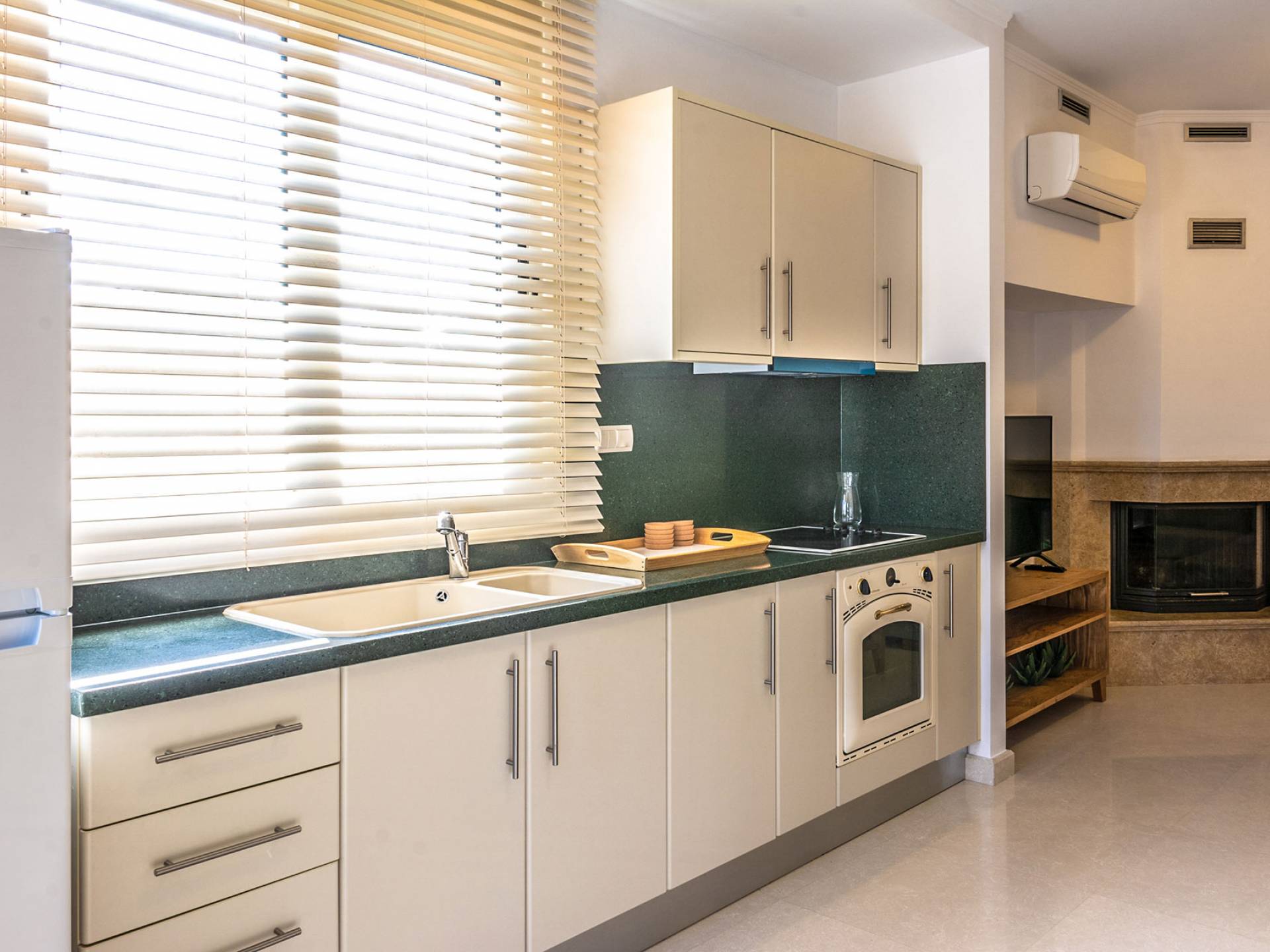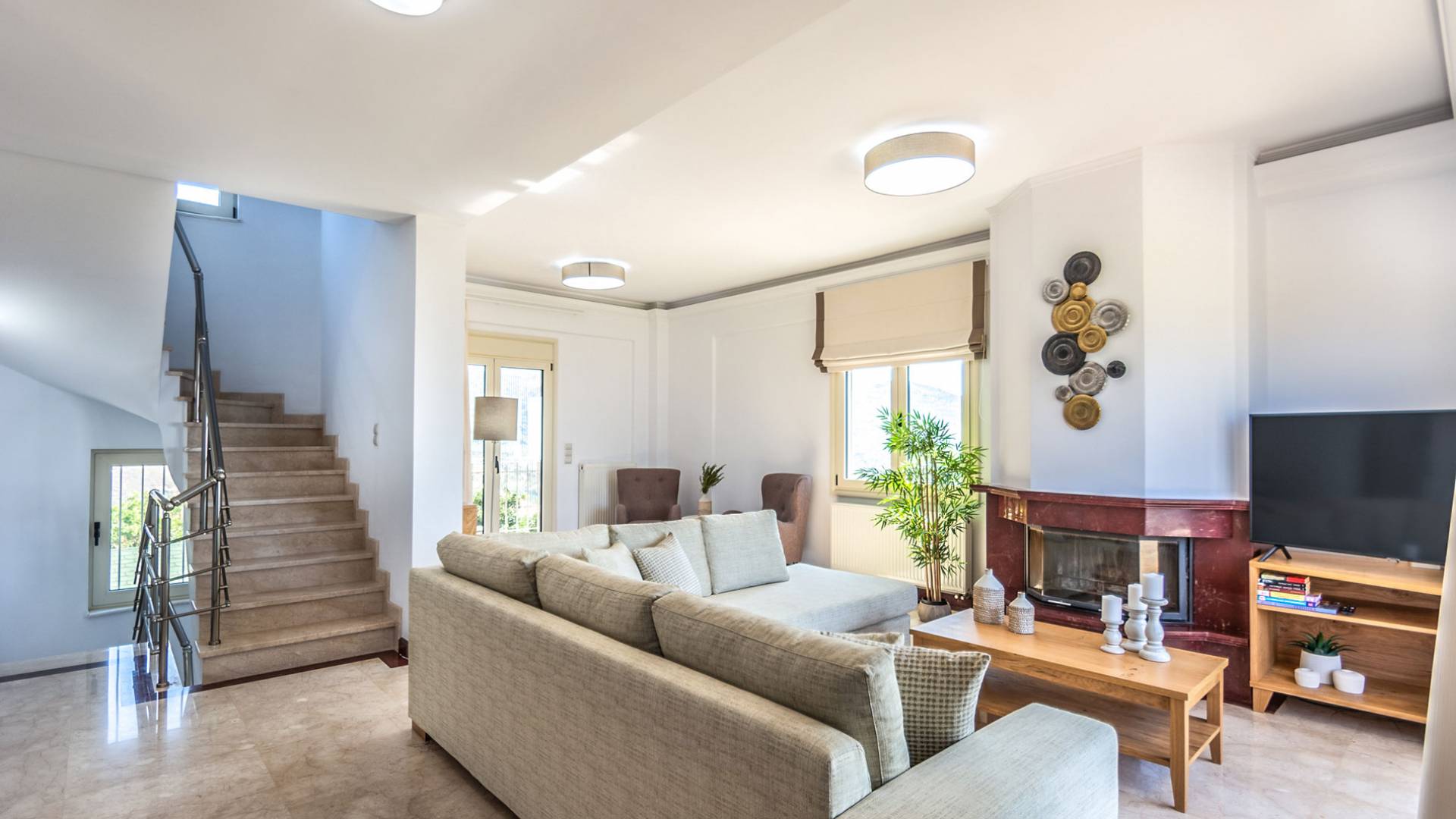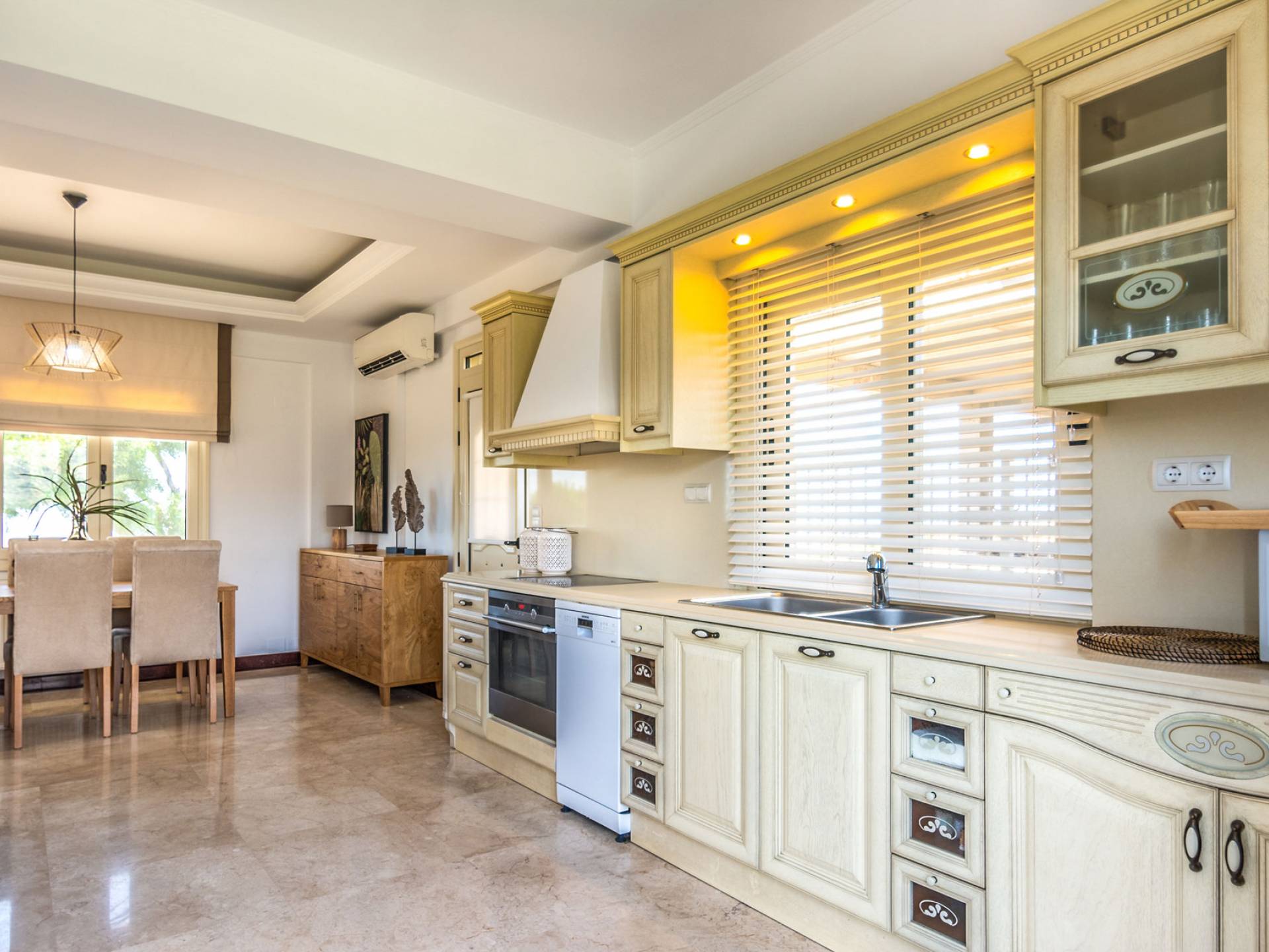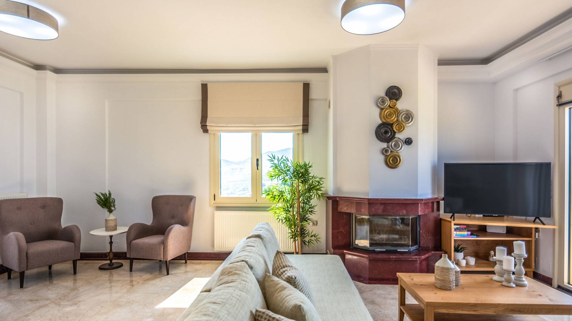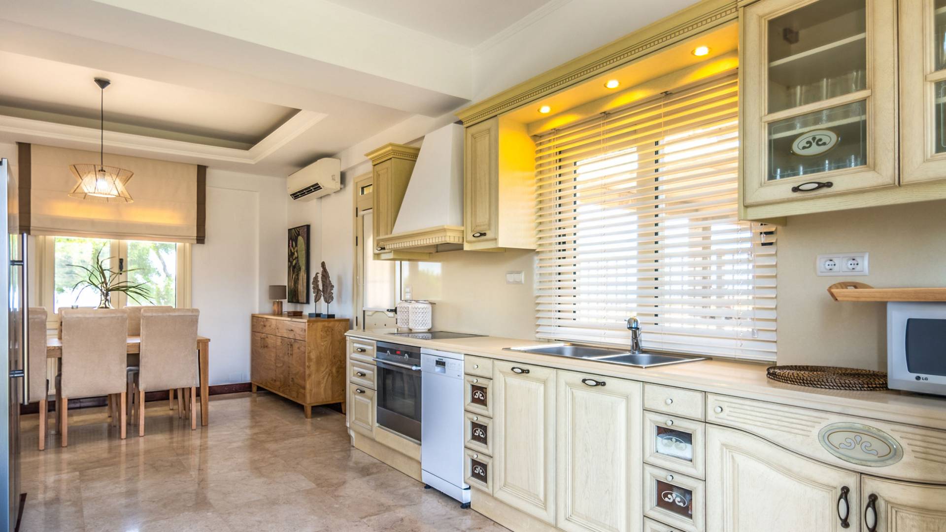 Aria Villa Crete ofrece una residencia de dos niveles con cuatro dormitorios, cuatro baños (tres completos y medio), dos acogedoras salas de estar con chimenea y dos cocinas bien equipadas. Está reservado como una residencia y es perfecto para un grupo o familias que deseen un alojamiento espacioso y una hospitalidad hogareña. La villa puede acomodar fácilmente a 10 personas.