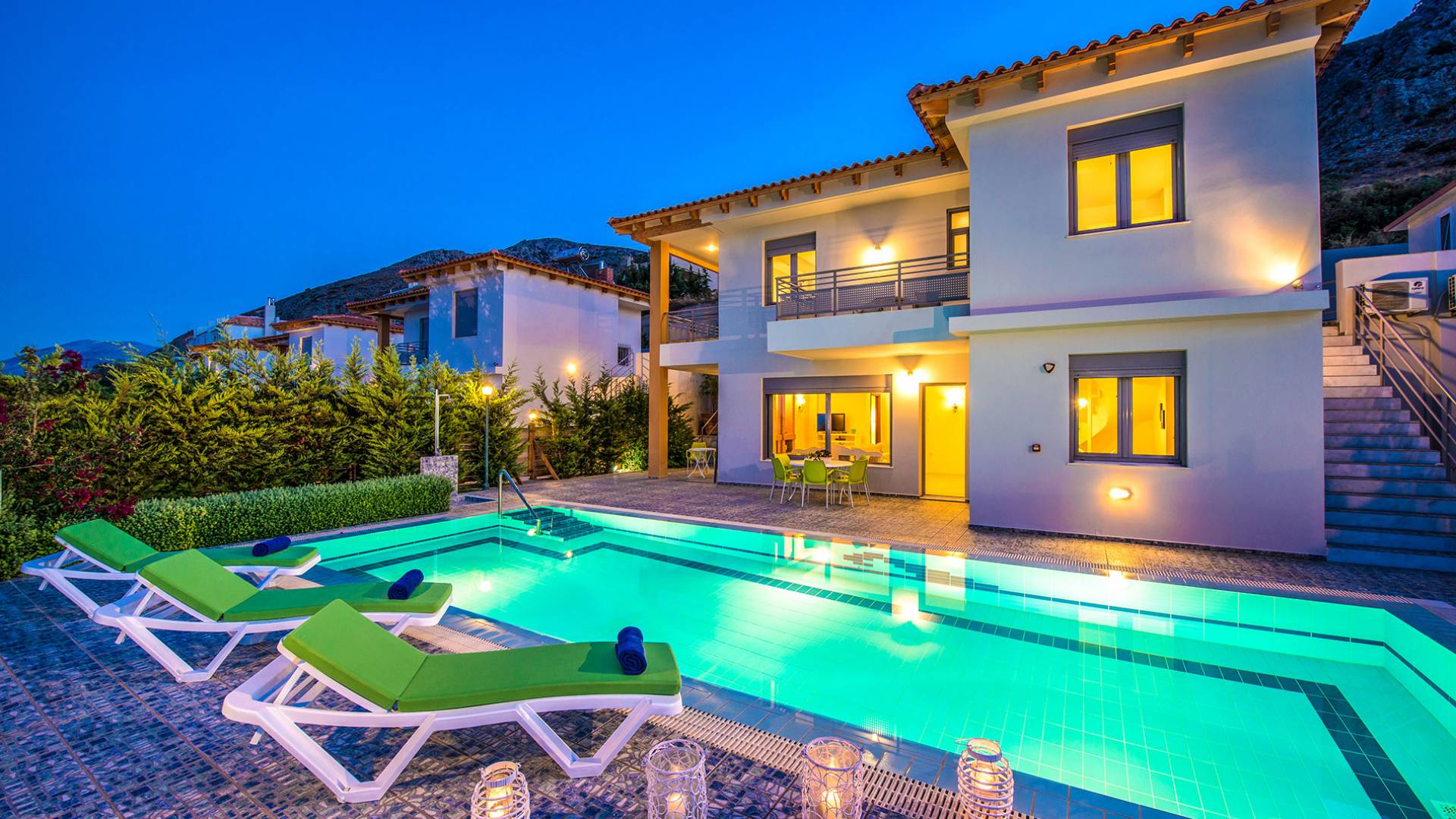 La elegante decoración proporciona momentos de relax y renovación. Además, los visitantes pueden relajarse en la piscina privada de cada villa junto a los extraordinarios jardines y disfrutar de la vista panorámica. Las cuatro villas del complejo han sido diseñadas con el mismo diseño arquitectónico y comparten las mismas instalaciones.
