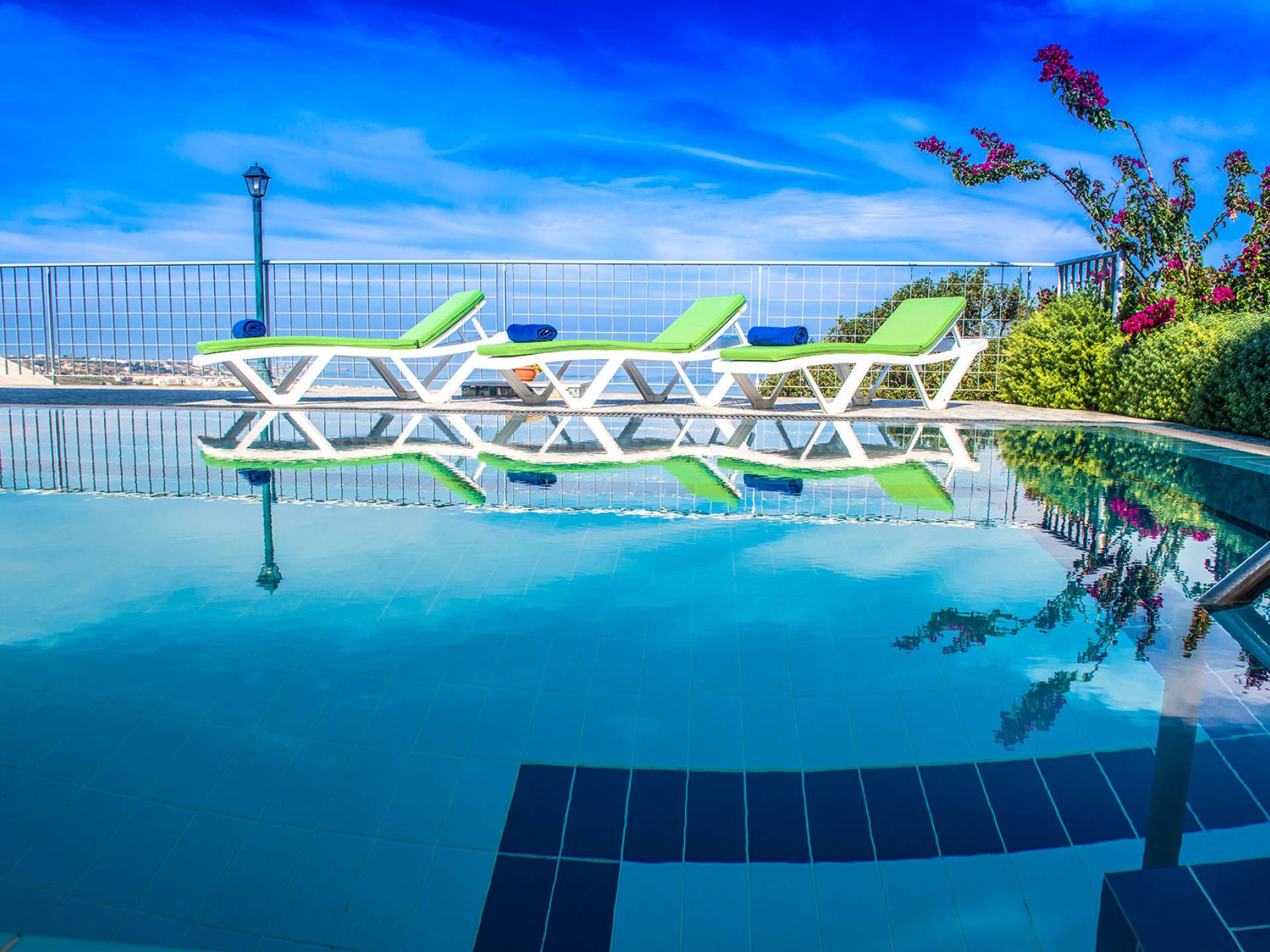 El interior del área de la piscina contiene una amplia sala de estar, un comedor, una cocina totalmente equipada, un dormitorio doble y un baño con bañera. En el exterior de la zona de la piscina, se encuentra la piscina y la zona de la piscina, además de jardines y parterres. También se puede encontrar una zona de comedor exterior en la planta baja. El interior del nivel superior (nivel del área de estacionamiento) consta de un dormitorio con dos camas individuales, un dormitorio con una cama king-size y un baño con cabina de ducha, al que se puede acceder desde ambos dormitorios.