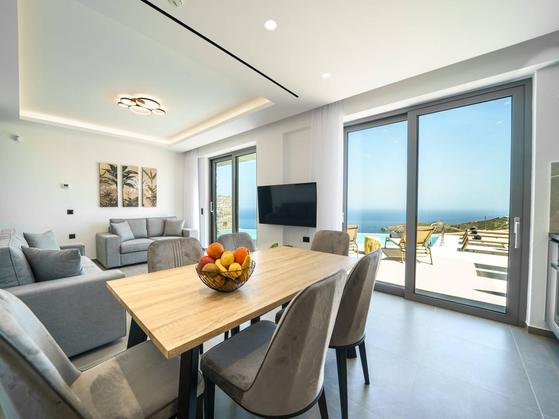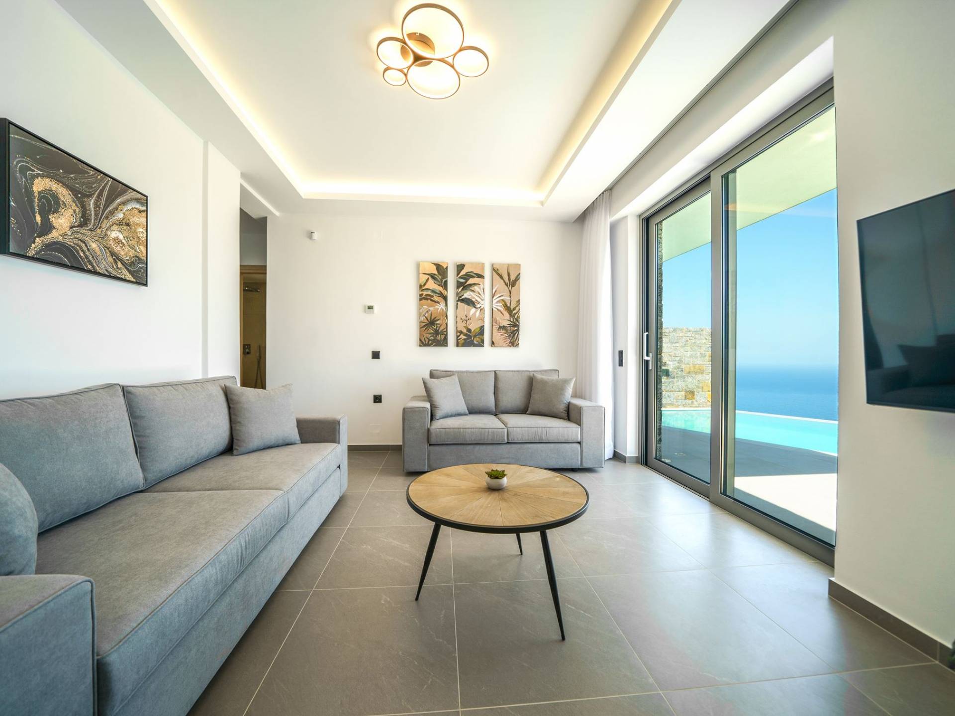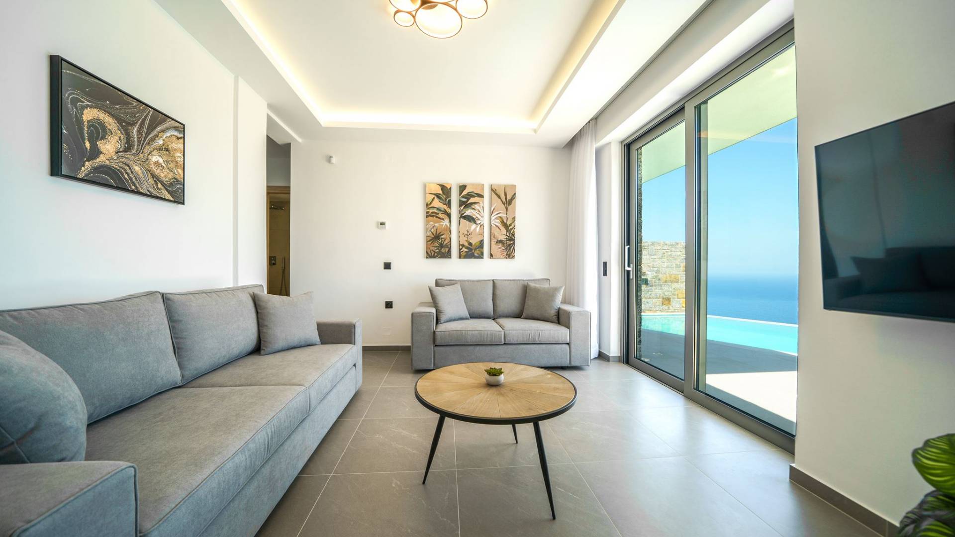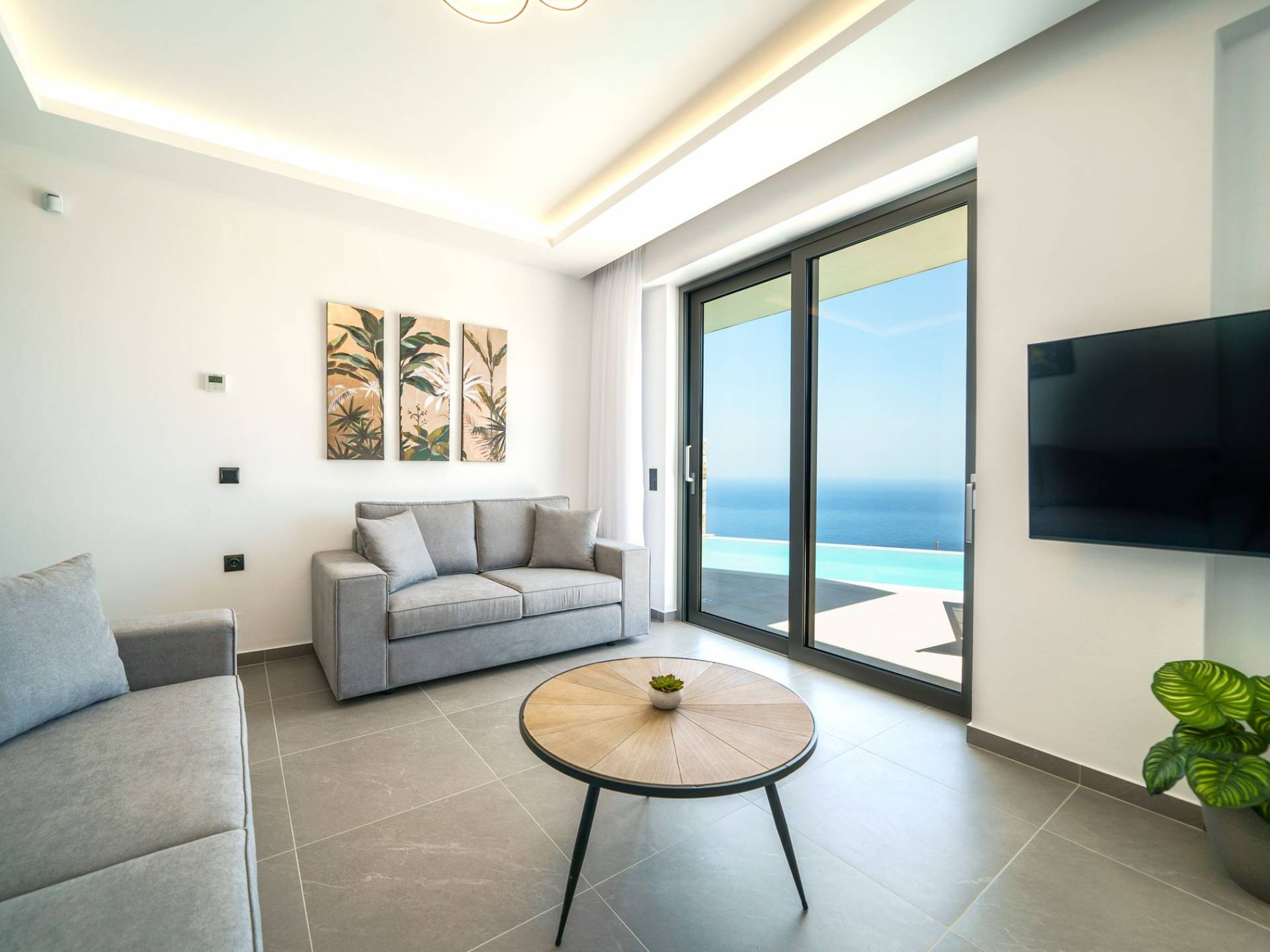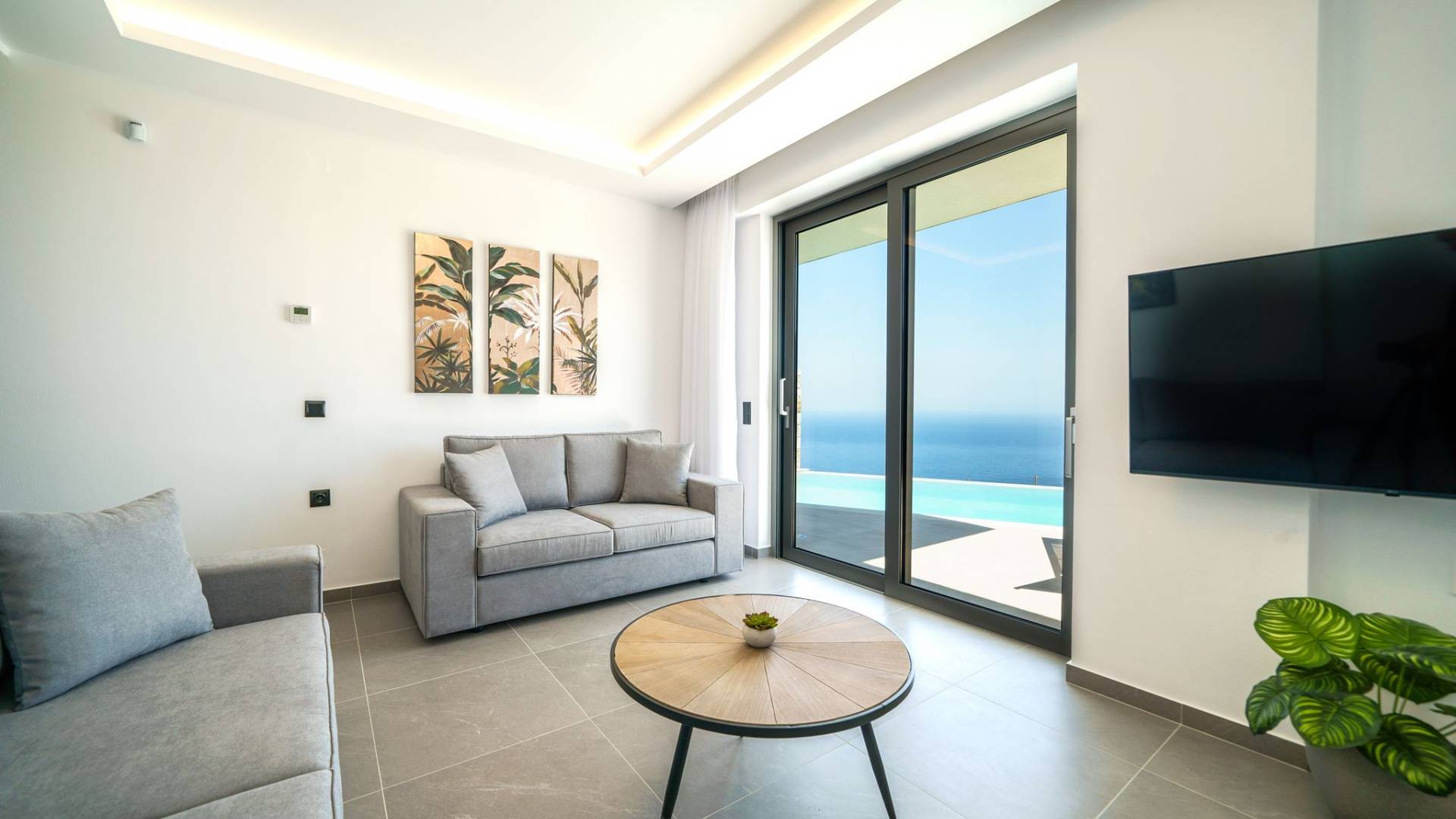 La sala de estar le da la bienvenida con una elegante zona de estar con un televisor inteligente de 50 pulgadas, perfecta para pasar tardes relajadas mientras explora más. Quedará encantado con el punto focal de la sala de estar: un espacioso terraza que ofrece impresionantes vistas al mar, invitándole a disfrutar de la belleza de la naturaleza.