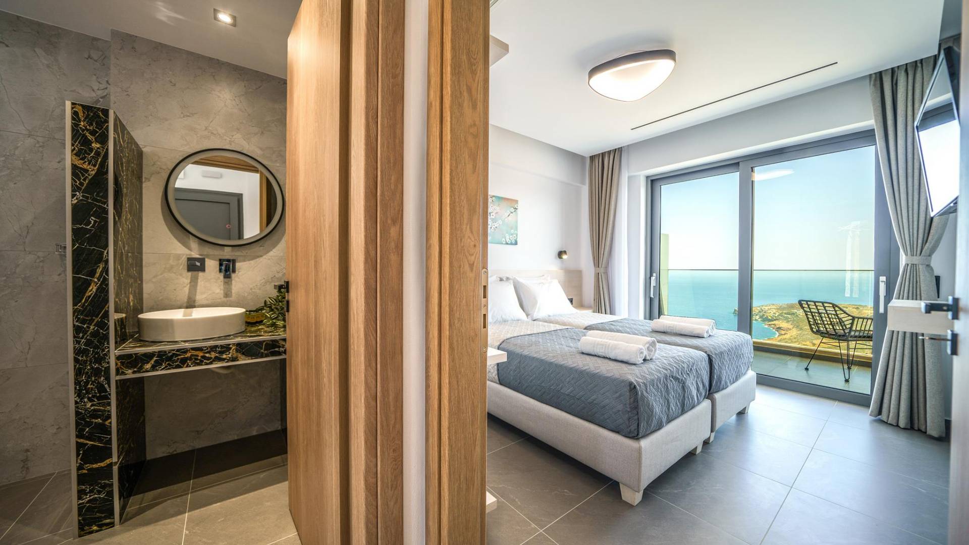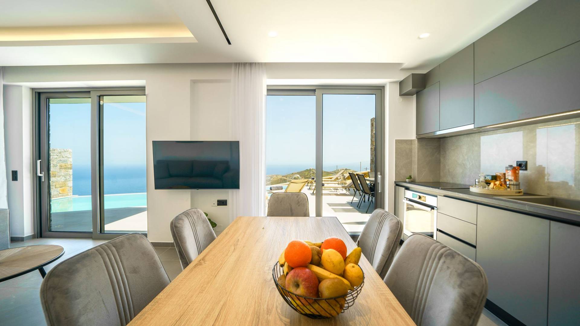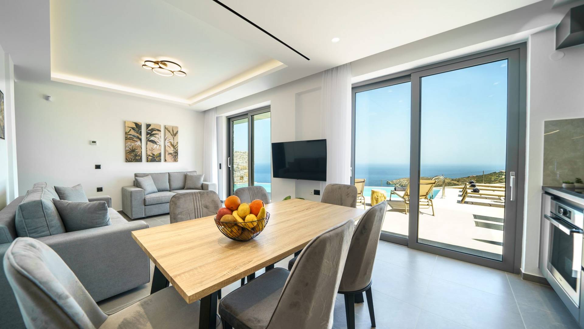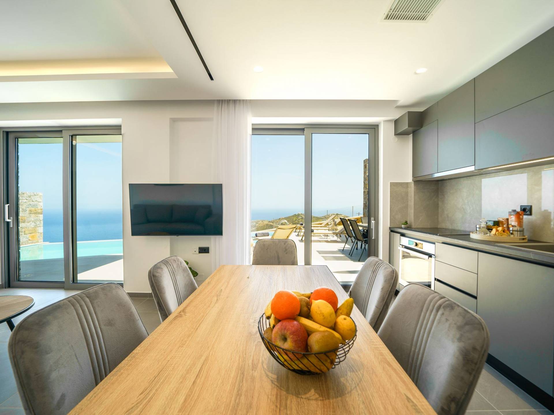 La sala de estar le da la bienvenida con una elegante zona de estar con un televisor inteligente de 50 pulgadas, perfecta para pasar tardes relajadas mientras explora más. Quedará encantado con el punto focal de la sala de estar: un espacioso terraza que ofrece impresionantes vistas al mar, invitándole a disfrutar de la belleza de la naturaleza.