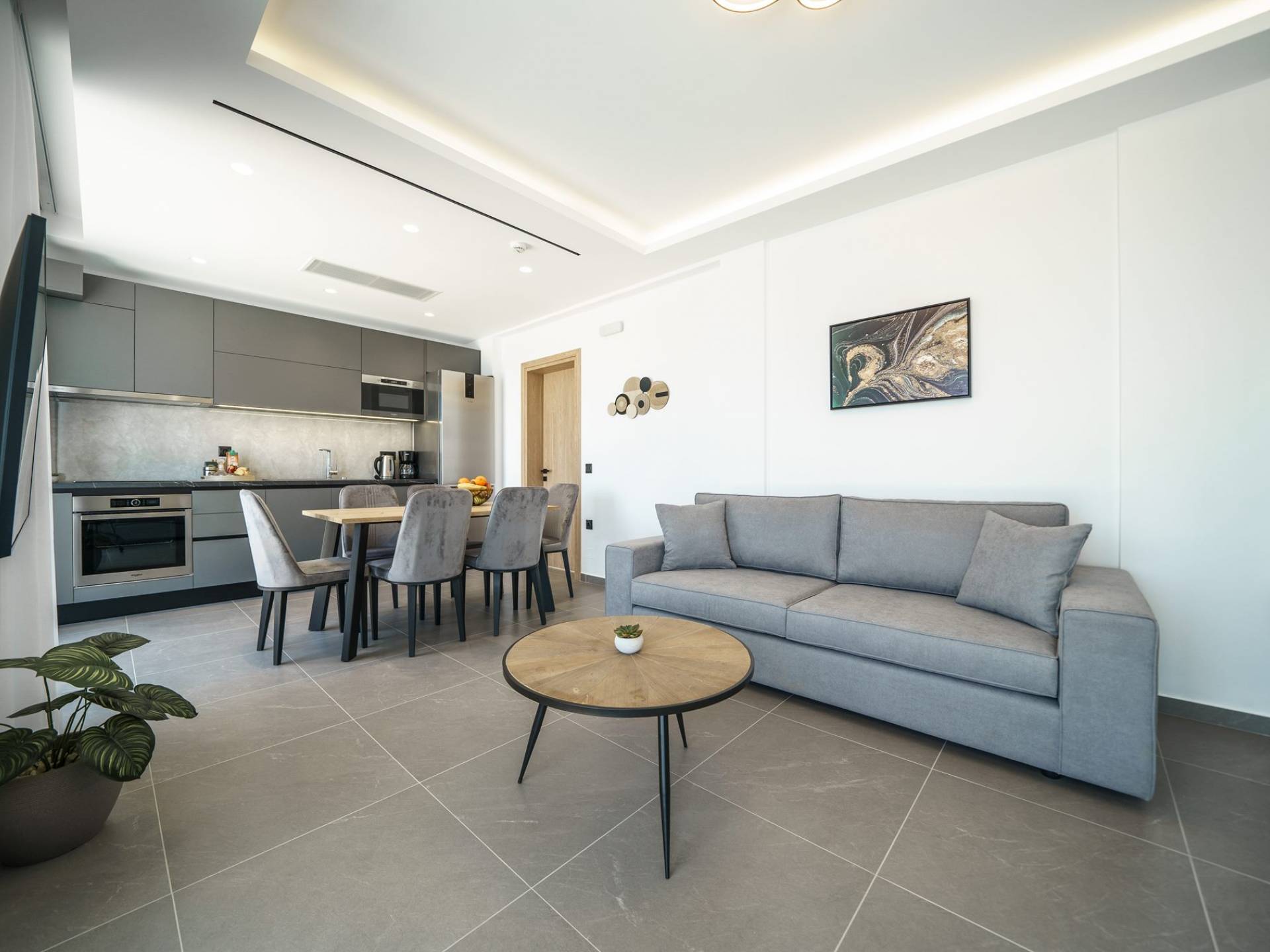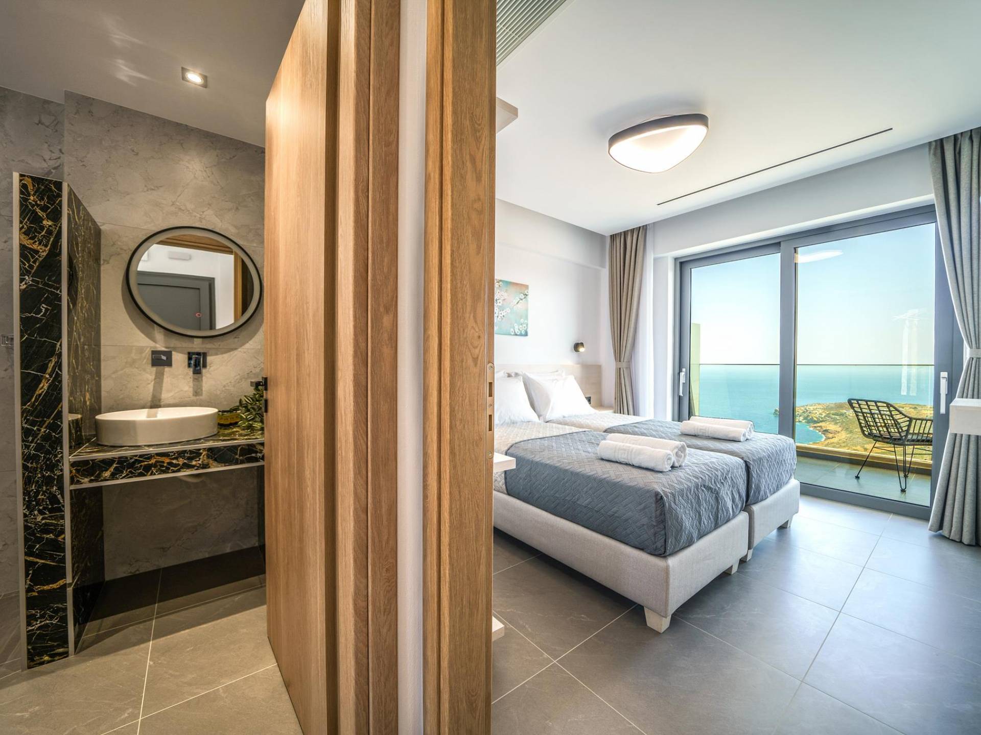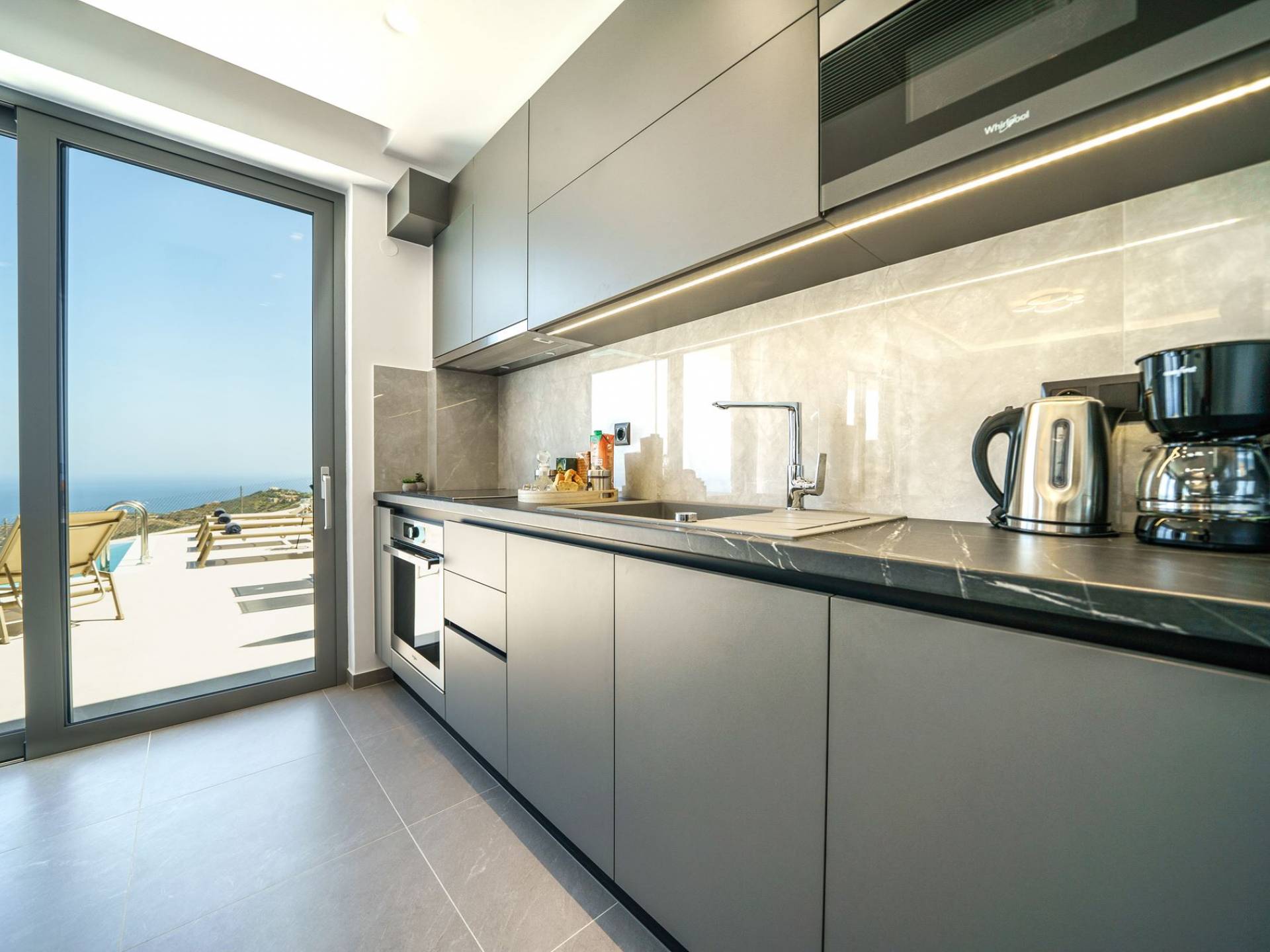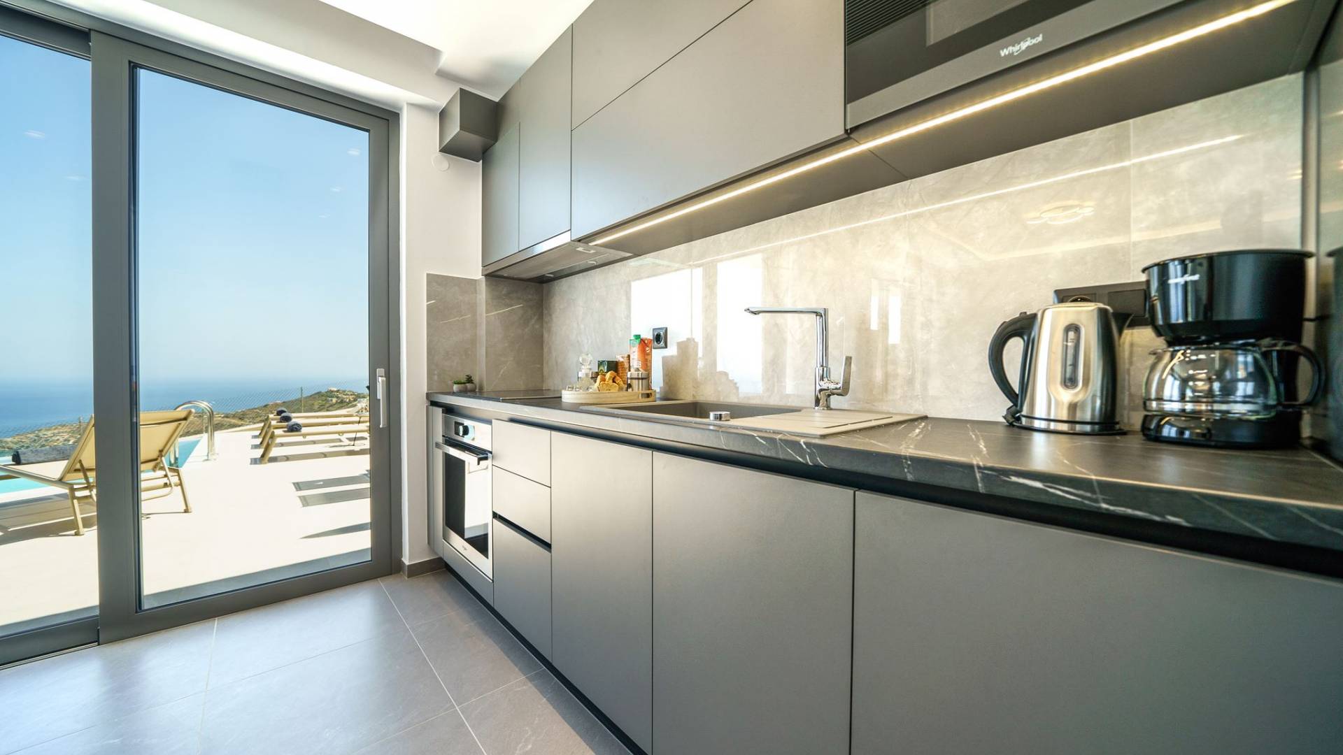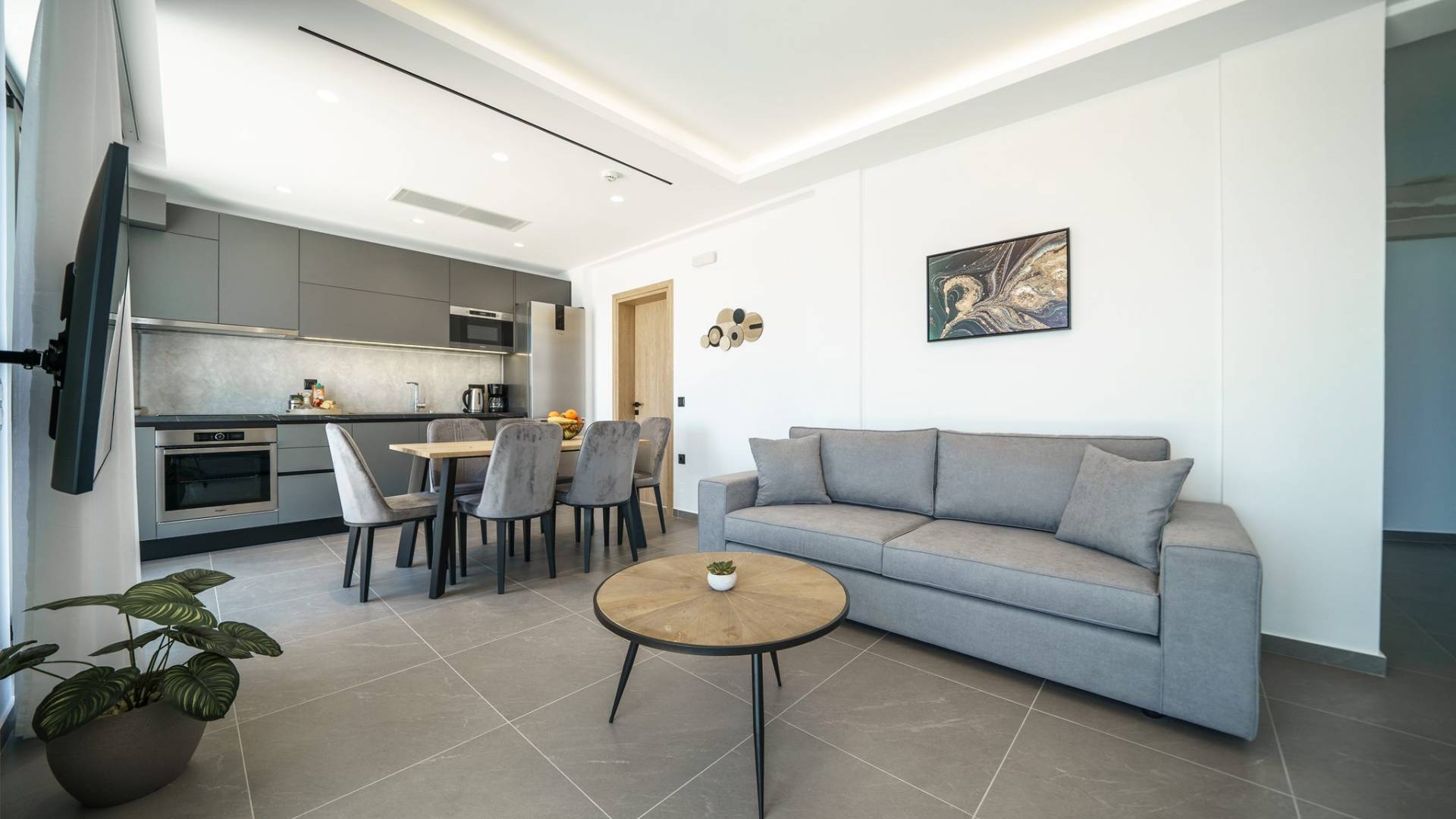 La sala de estar le da la bienvenida con una elegante zona de estar con un televisor inteligente de 50 pulgadas, perfecta para pasar tardes relajadas mientras explora más. Quedará encantado con el punto focal de la sala de estar: un espacioso terraza que ofrece impresionantes vistas al mar, invitándole a disfrutar de la belleza de la naturaleza.