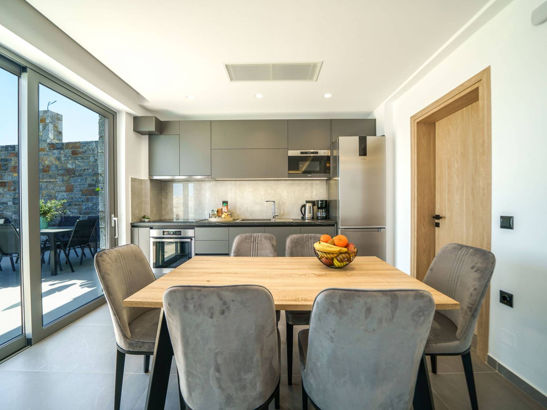 Junto a la sala de estar, descubrirá una cocina totalmente equipada que puede satisfacer todos sus deseos culinarios, así como una mesa de comedor adyacente para 6 personas con el telón de fondo de impresionantes vistas a través de grandes ventanales.