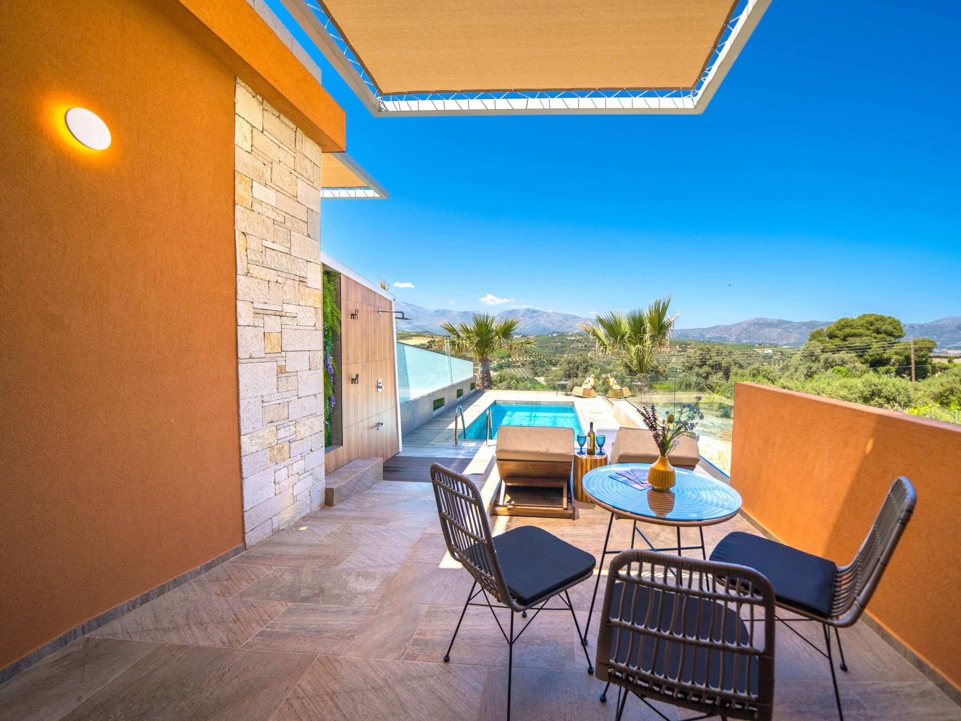 En Olania Villa 4 Creta, el alojamiento de lujo se transforma en la experiencia vacacional más elegante y refrescante. Disfrute del ambiente especial que ofrece el cuidado diseño (construcción, iluminación, etc.) del interior y exterior, disfrute de la vista infinita durante el día y del cielo estrellado por la noche lejos de la contaminación lumínica de la ciudad.