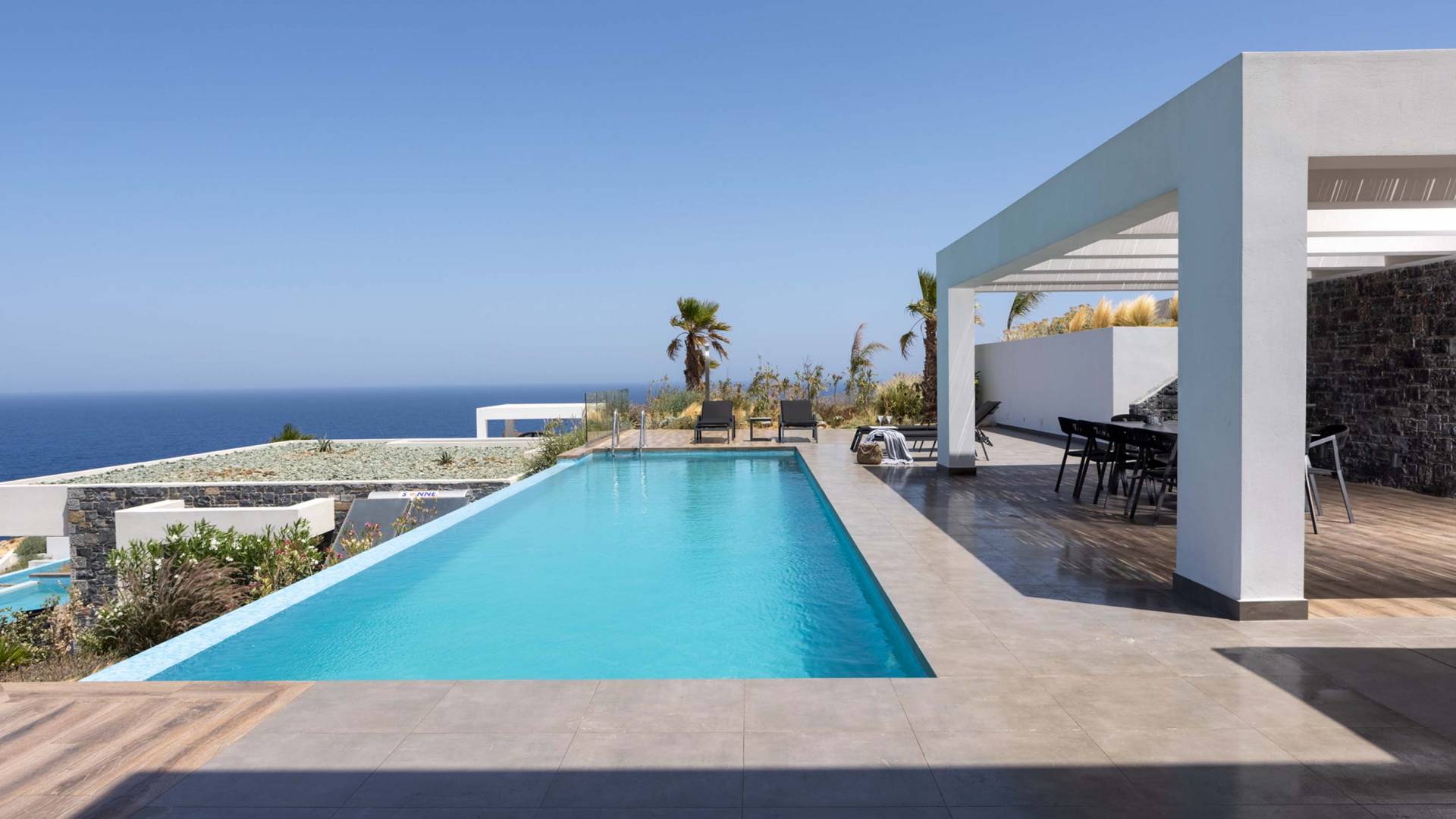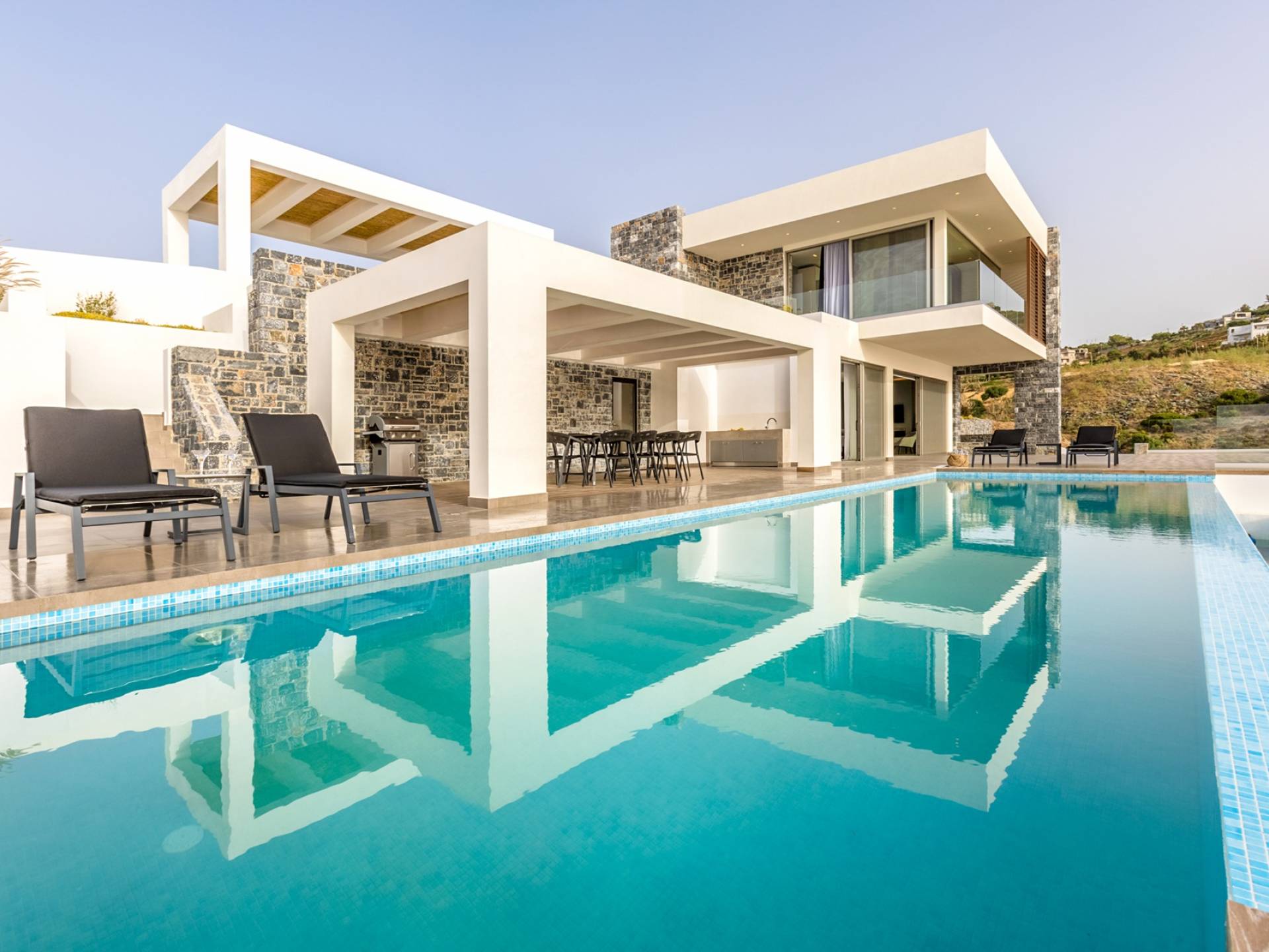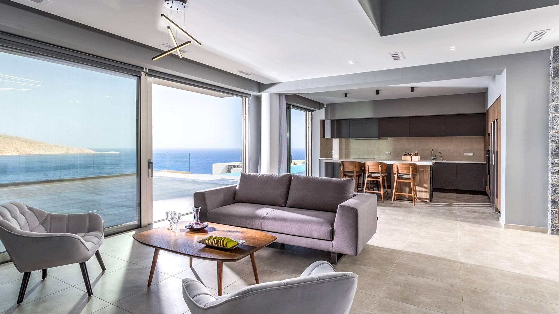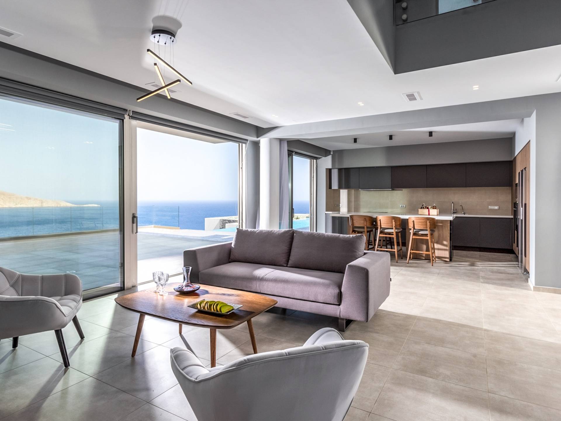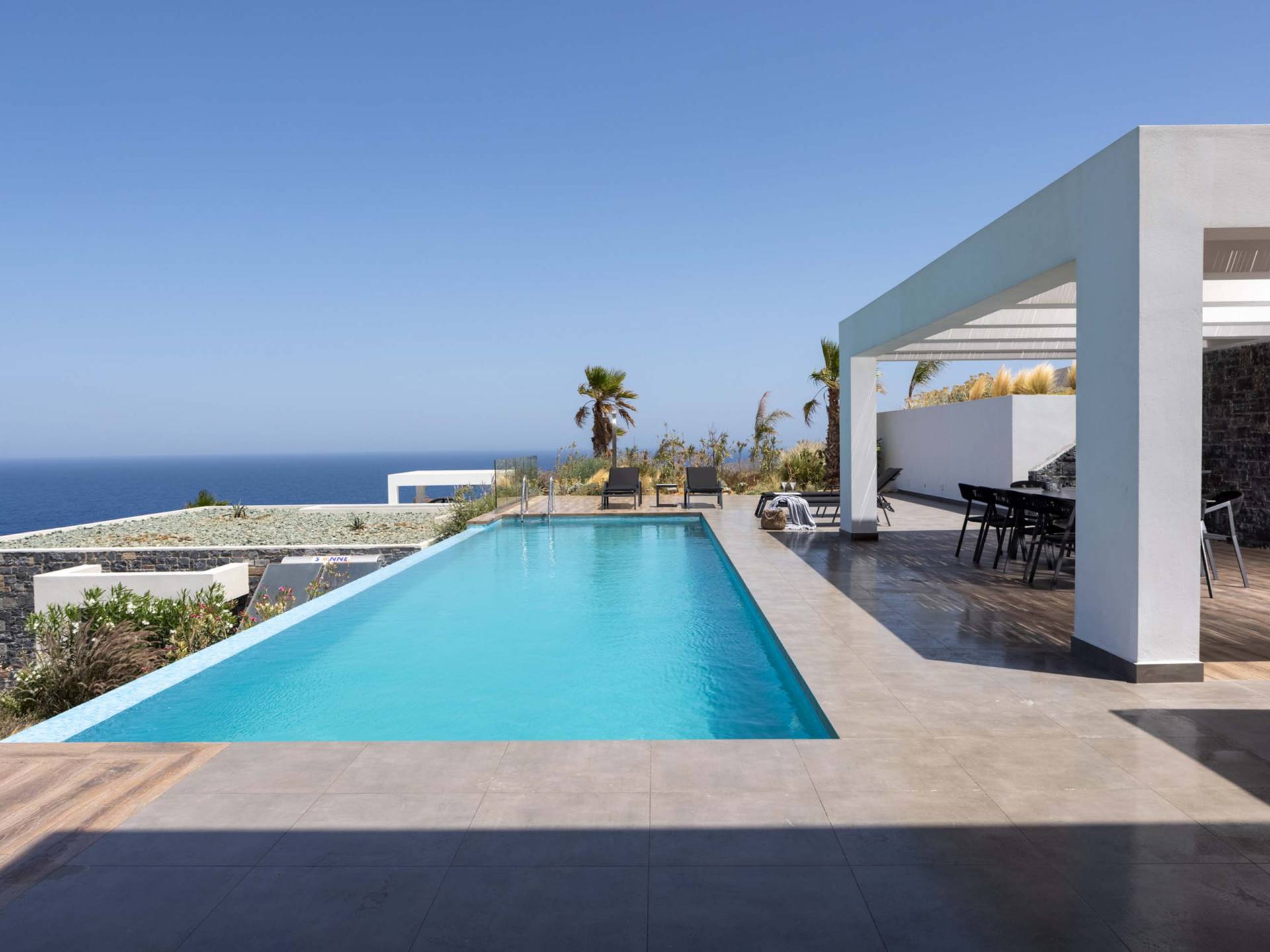 Villa Eros Crete es la villa más grande y exclusiva de Rock Bay Villas, rodeada de un jardín mediterráneo con vistas panorámicas al mar y una piscina privada de agua dulce