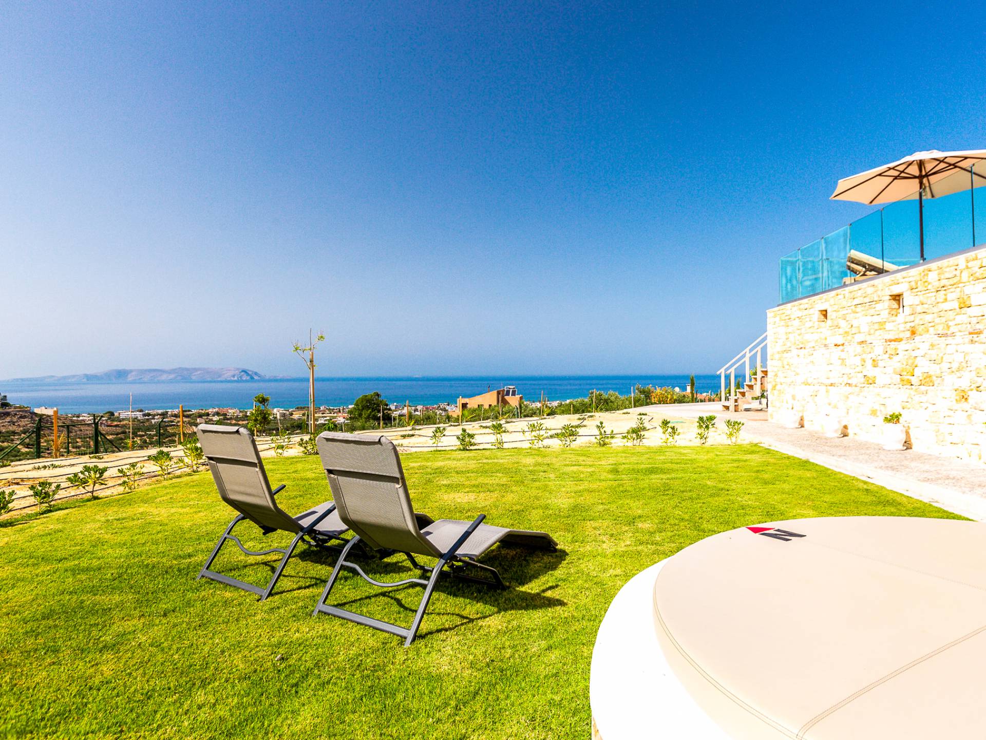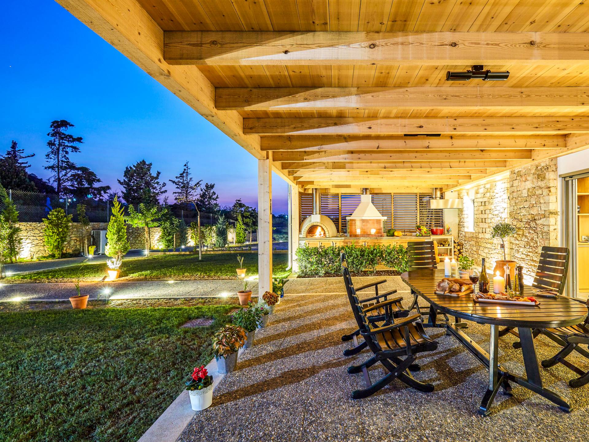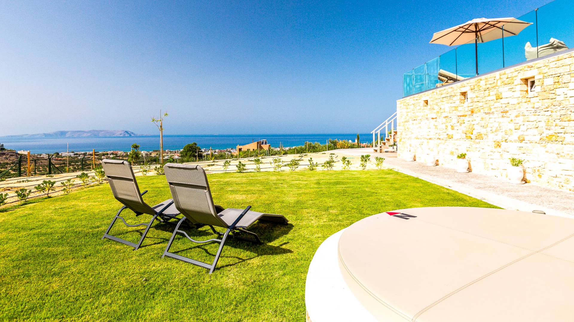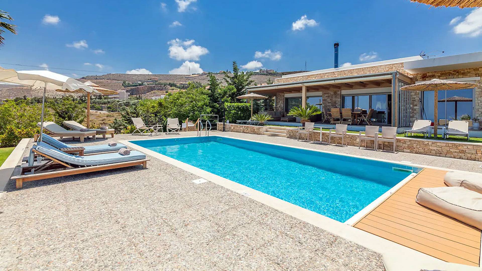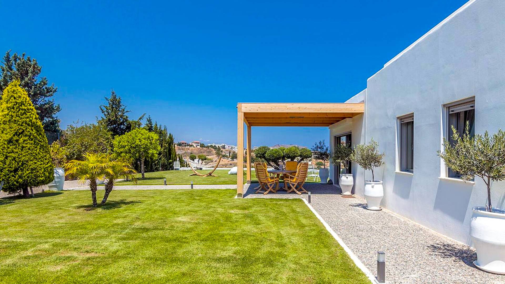 Dos espléndidos jardines te esperan para momentos de despreocupación sin importar el clima, ya que uno está ubicado en el lado norte de la piscina y el otro en el sur tiene un tradicional horno de piedra. La barbacoa tamaño king está rodeada de hermosos árboles cretenses.