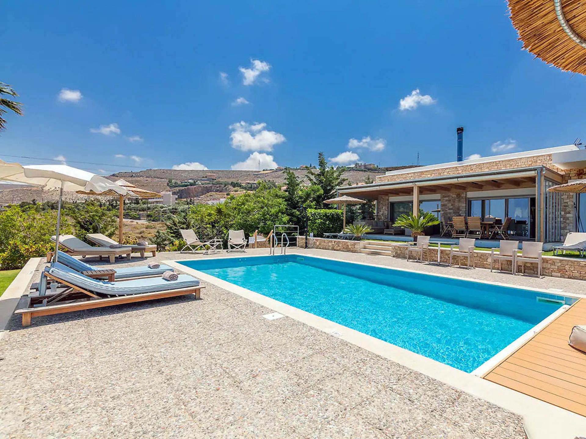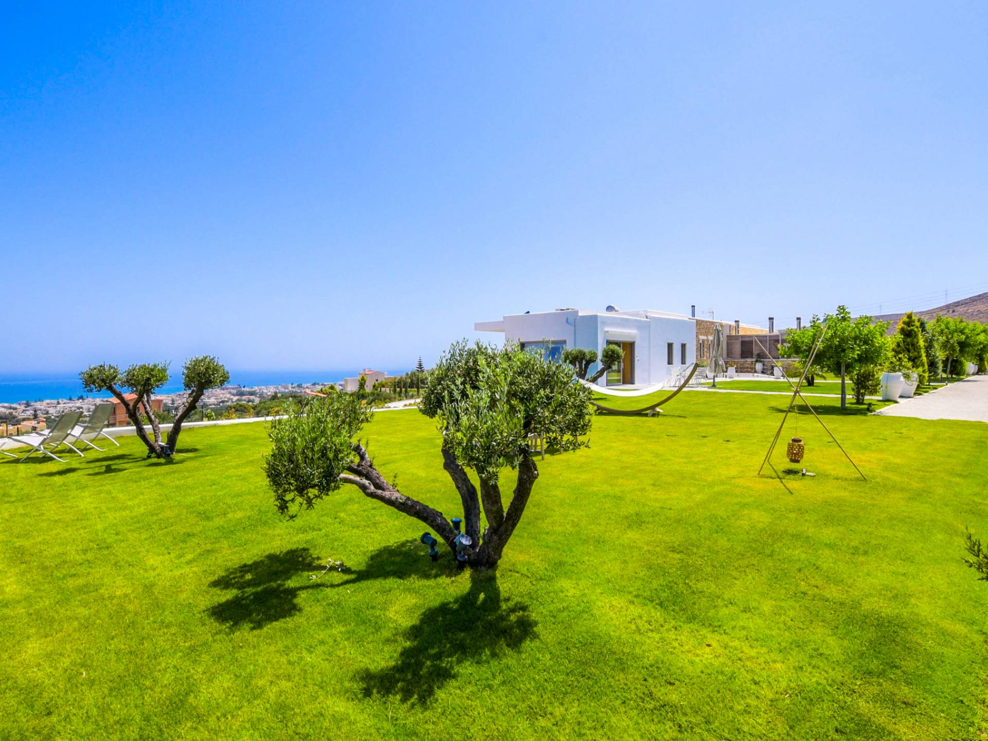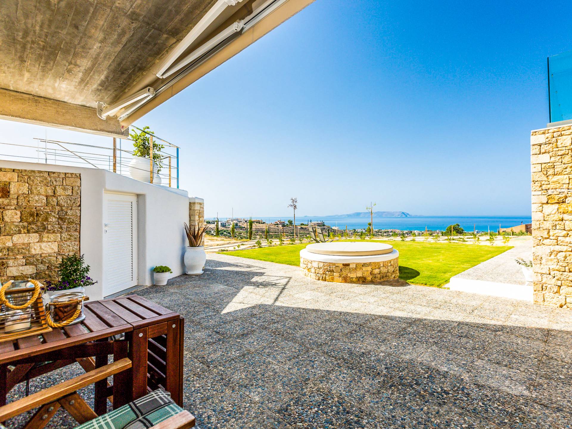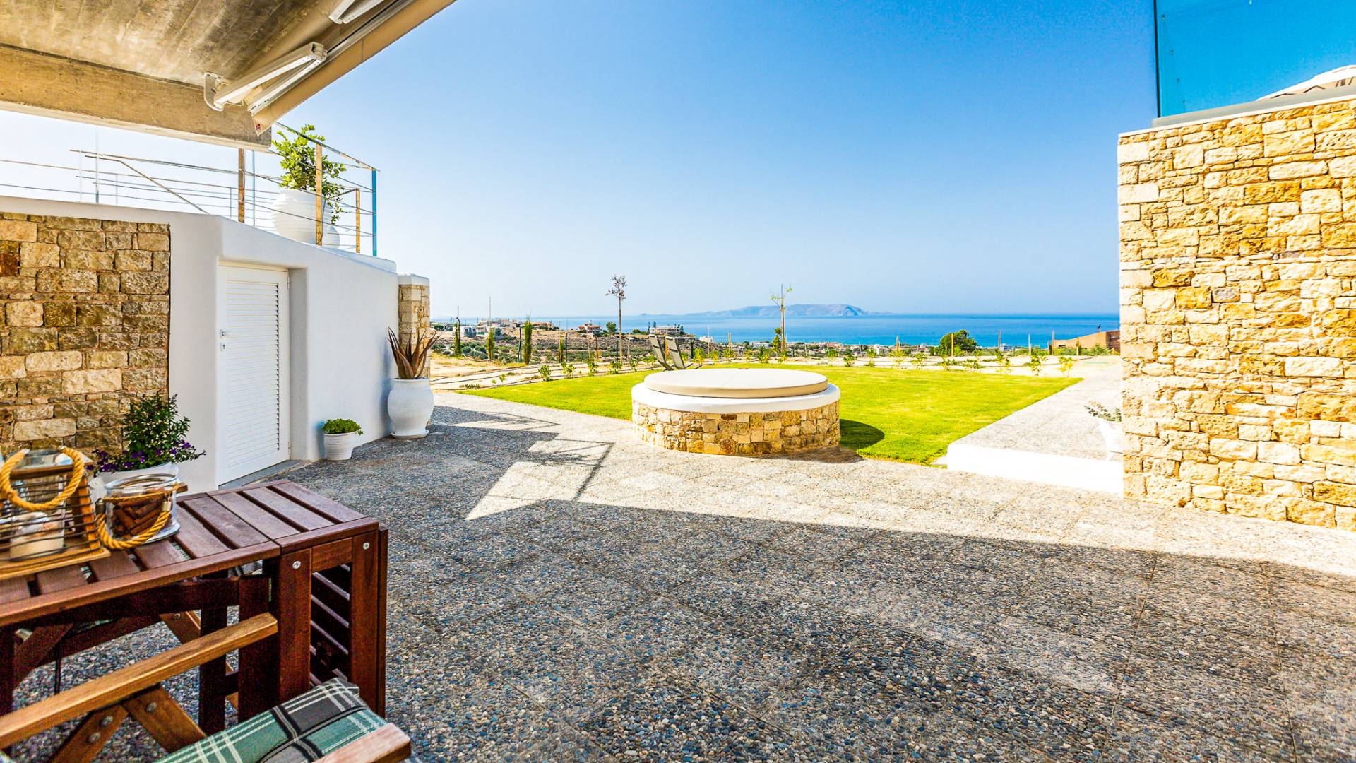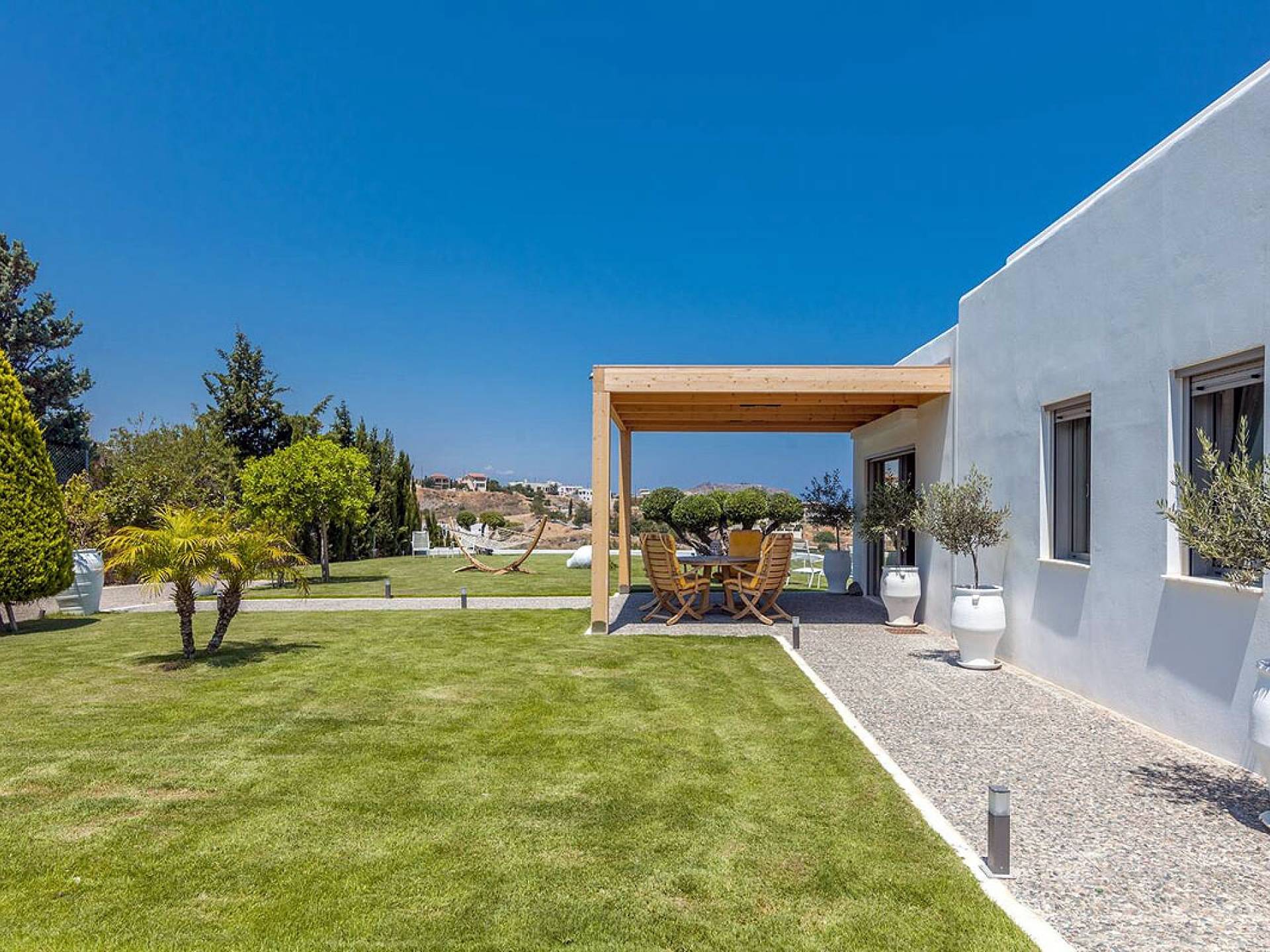 Dos espléndidos jardines te esperan para momentos de despreocupación sin importar el clima, ya que uno está ubicado en el lado norte de la piscina y el otro en el sur tiene un tradicional horno de piedra. La barbacoa tamaño king está rodeada de hermosos árboles cretenses.