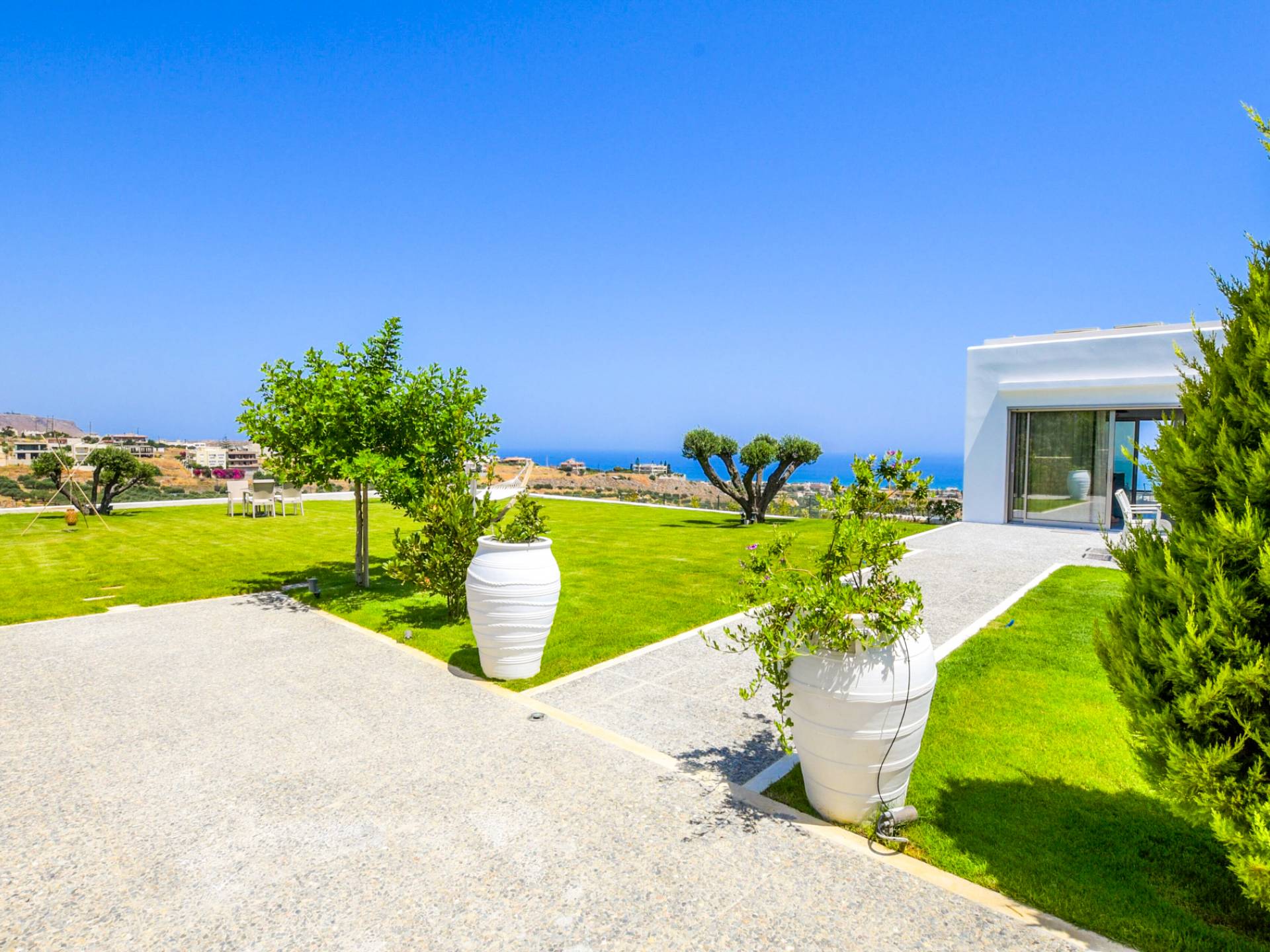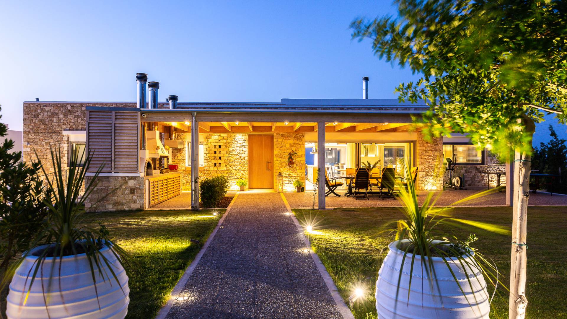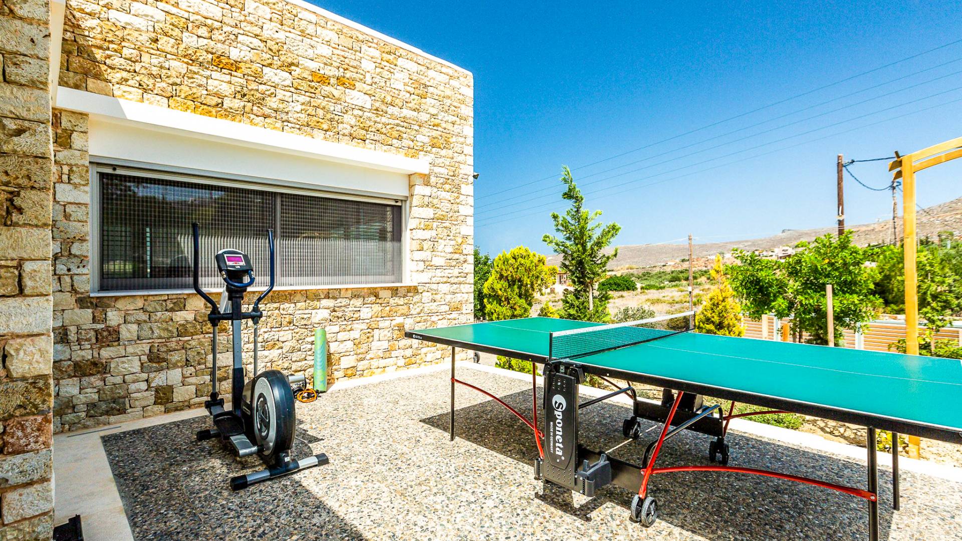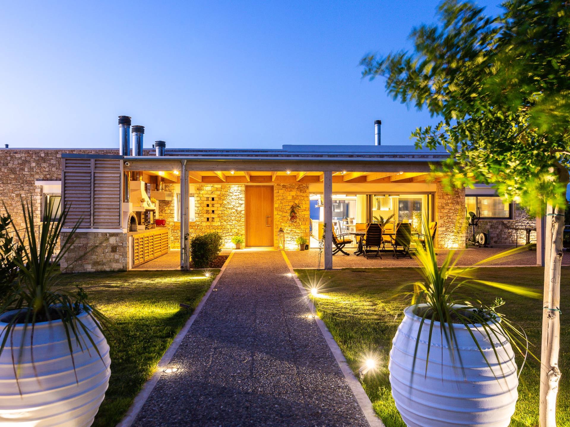Dos espléndidos jardines te esperan para momentos de despreocupación sin importar el clima, ya que uno está ubicado en el lado norte de la piscina y el otro en el sur tiene un tradicional horno de piedra. La barbacoa tamaño king está rodeada de hermosos árboles cretenses.