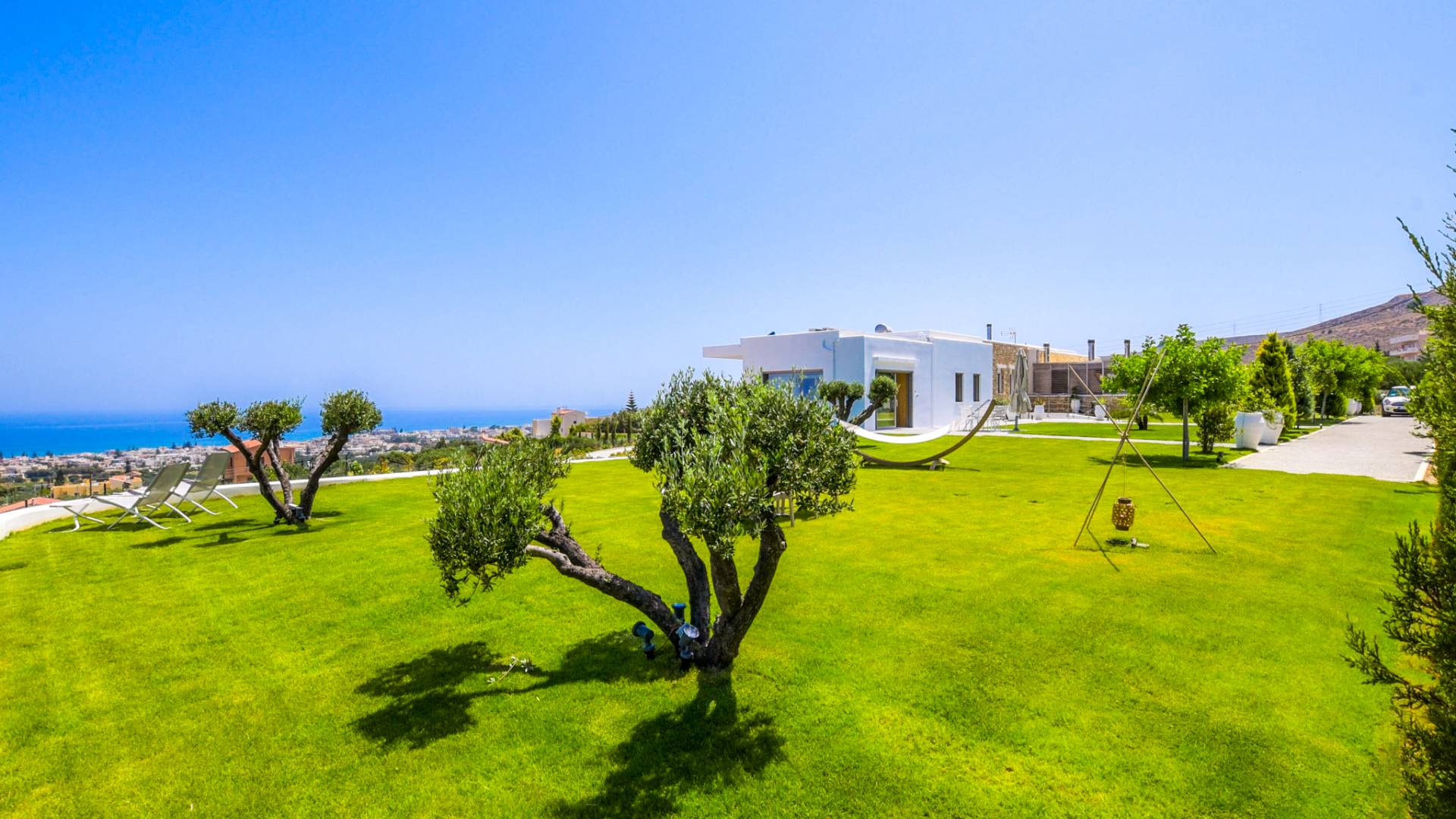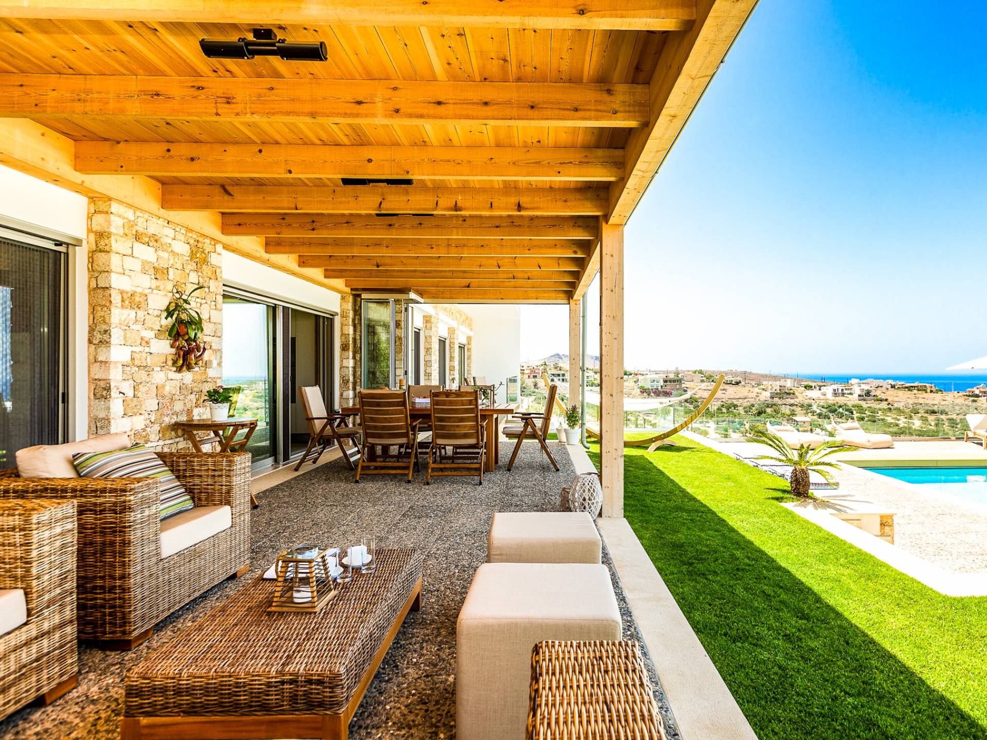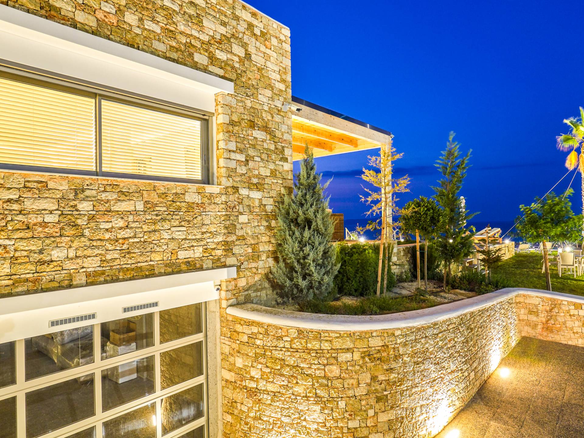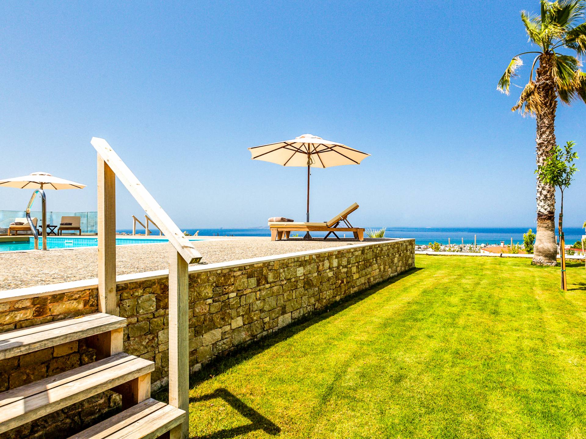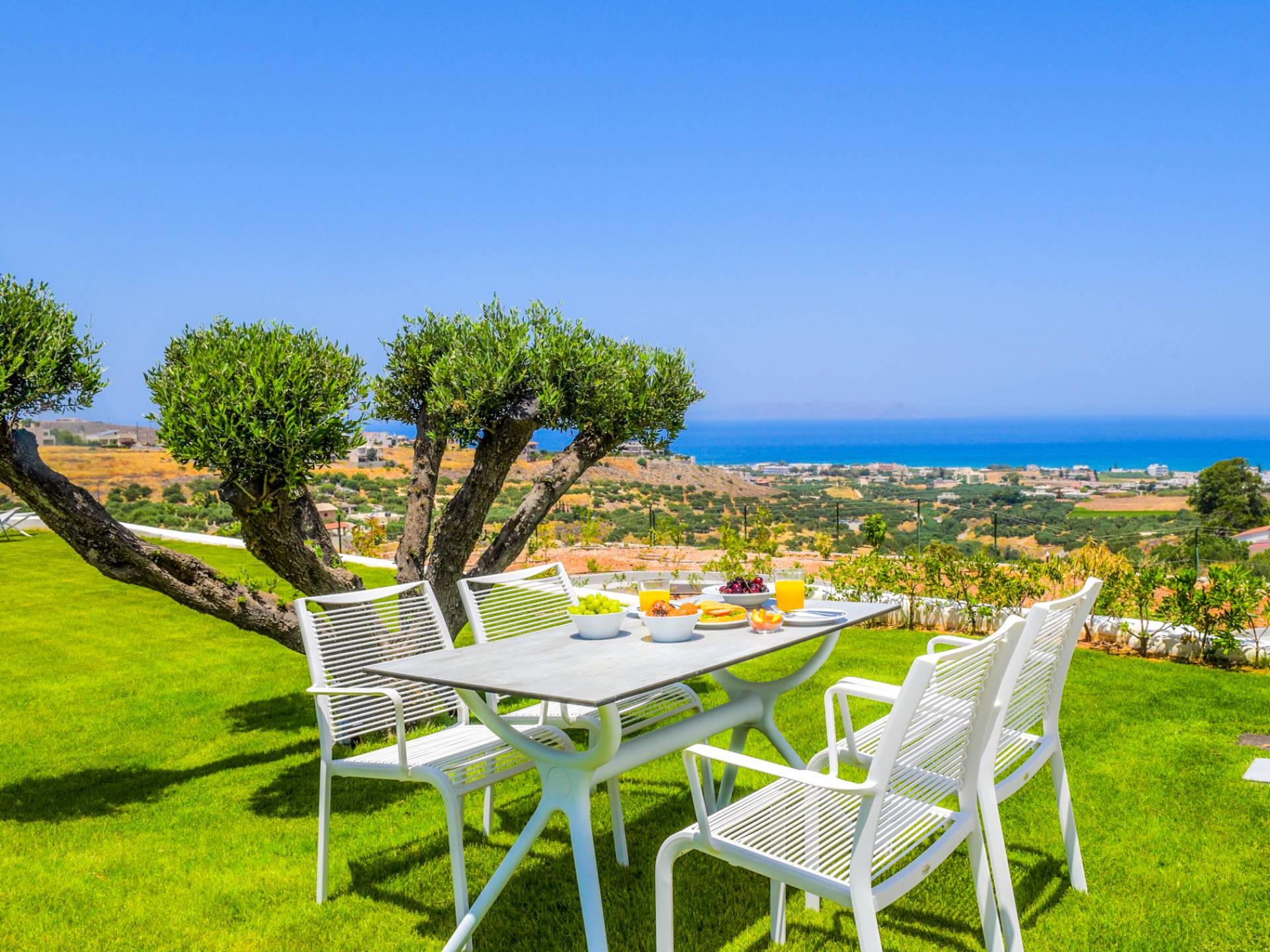 Dos espléndidos jardines te esperan para momentos de despreocupación sin importar el clima, ya que uno está ubicado en el lado norte de la piscina y el otro en el sur tiene un tradicional horno de piedra. La barbacoa tamaño king está rodeada de hermosos árboles cretenses.