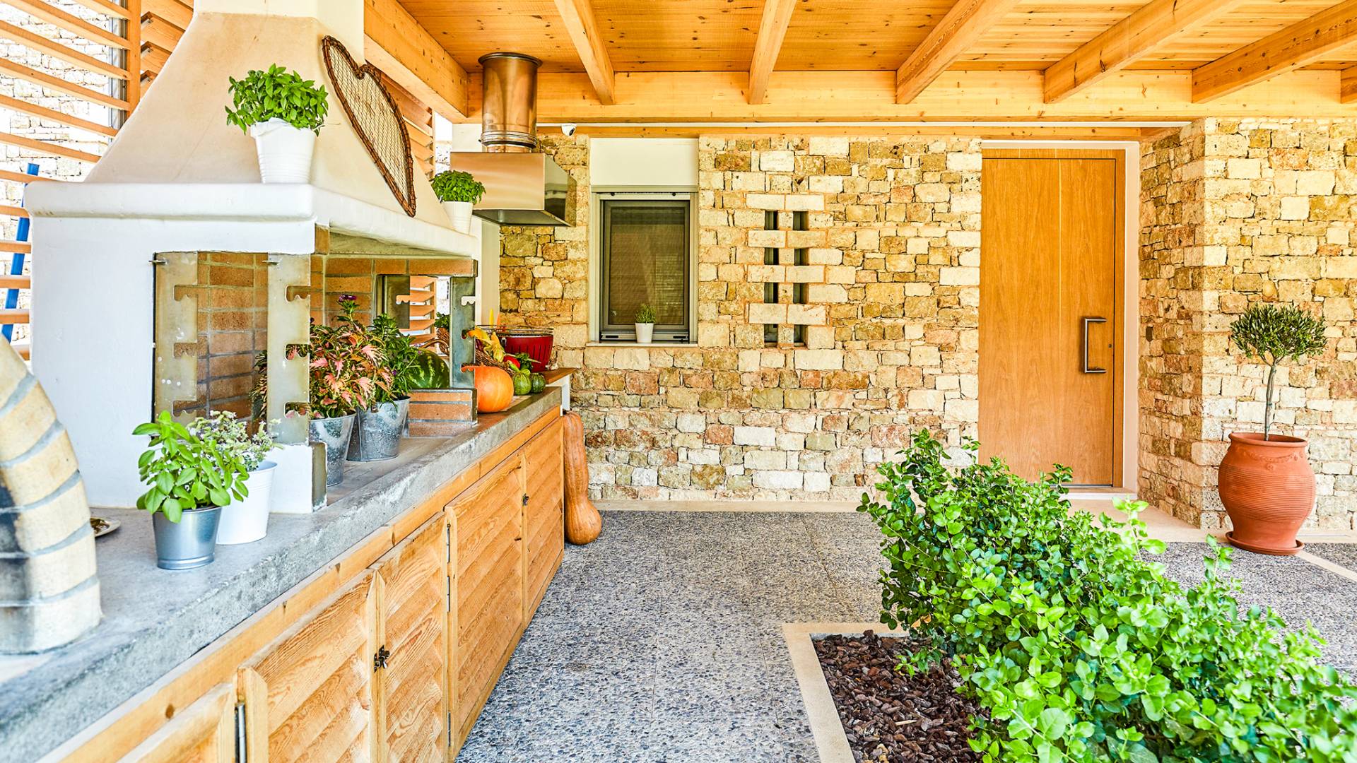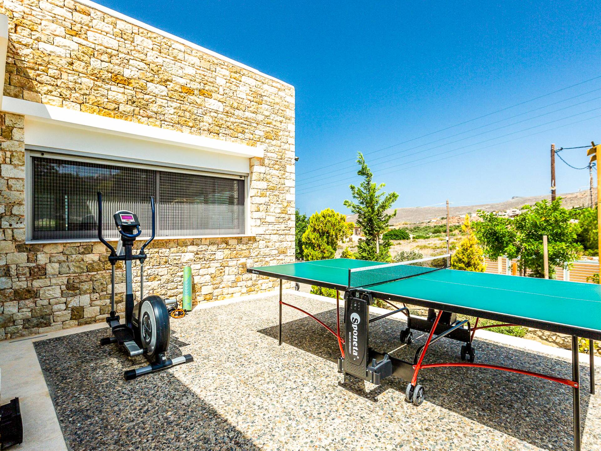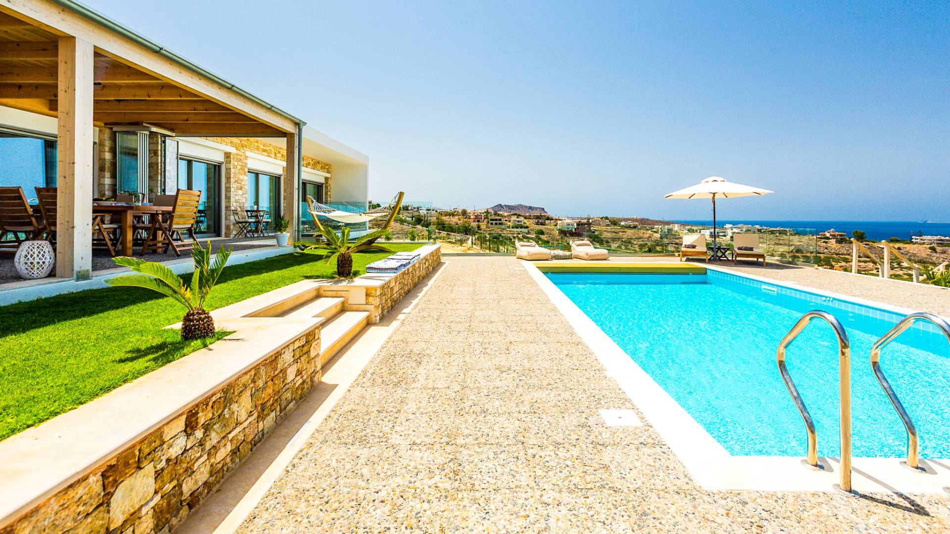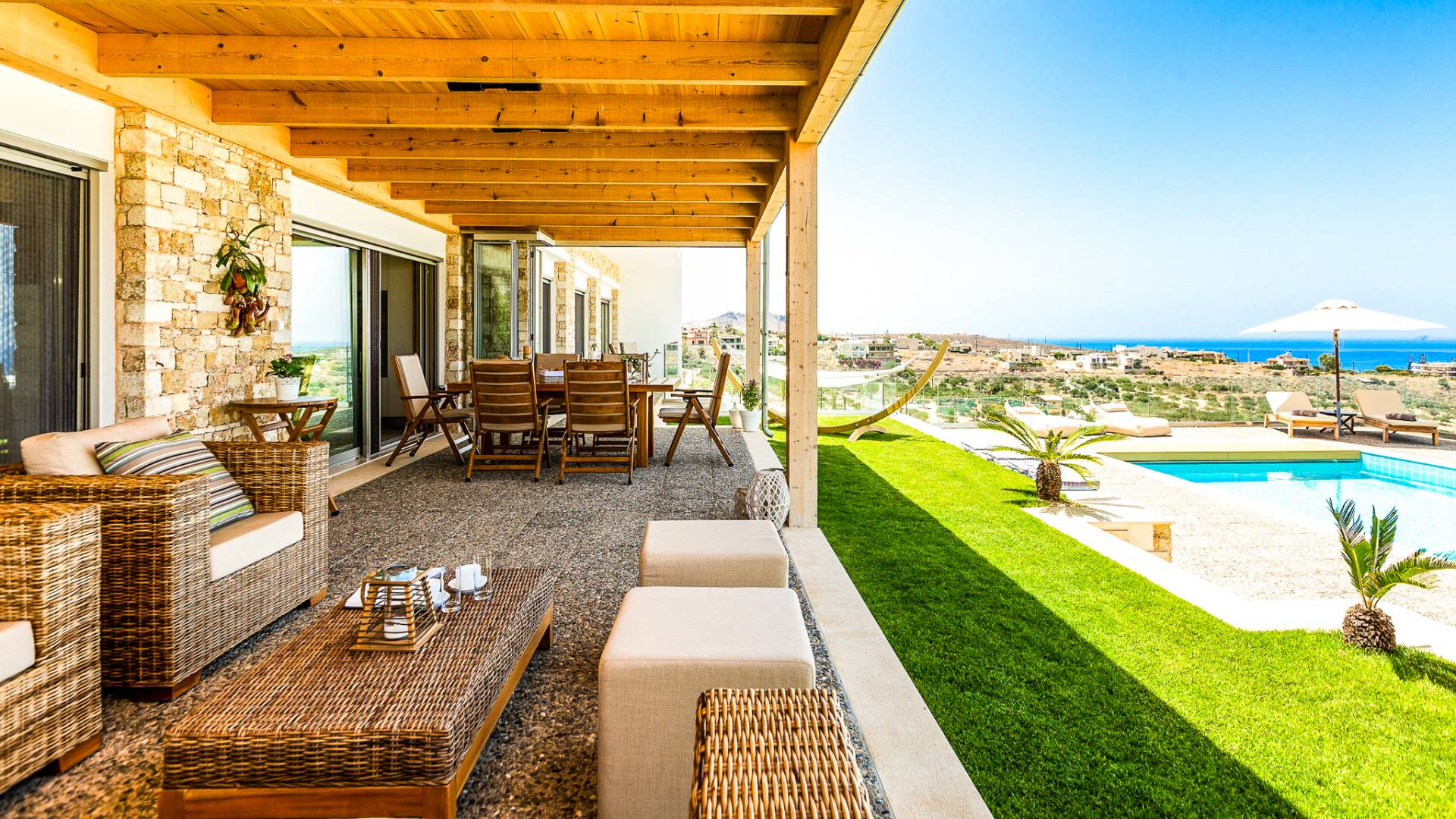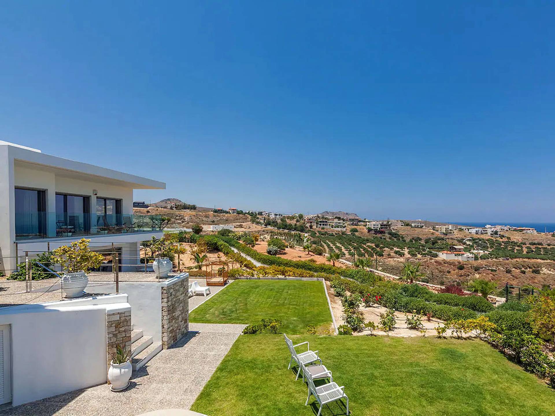 Dos espléndidos jardines te esperan para momentos de despreocupación sin importar el clima, ya que uno está ubicado en el lado norte de la piscina y el otro en el sur tiene un tradicional horno de piedra. La barbacoa tamaño king está rodeada de hermosos árboles cretenses.