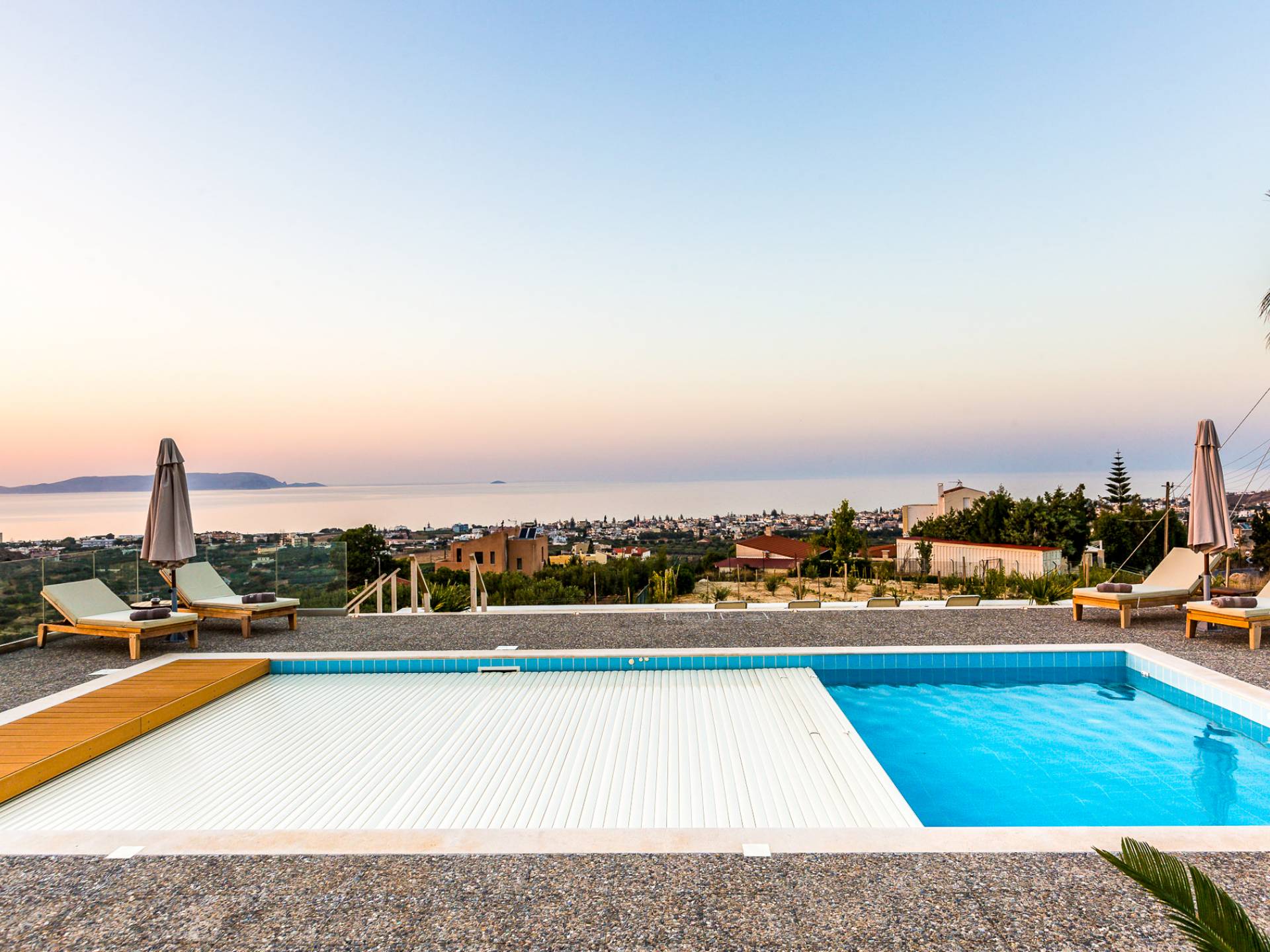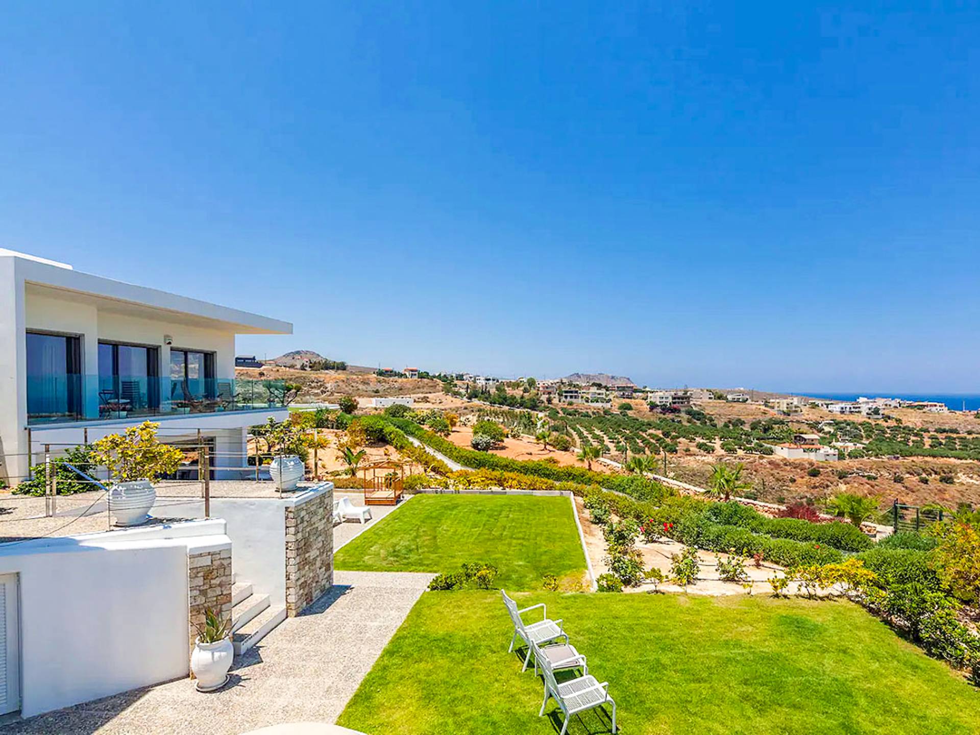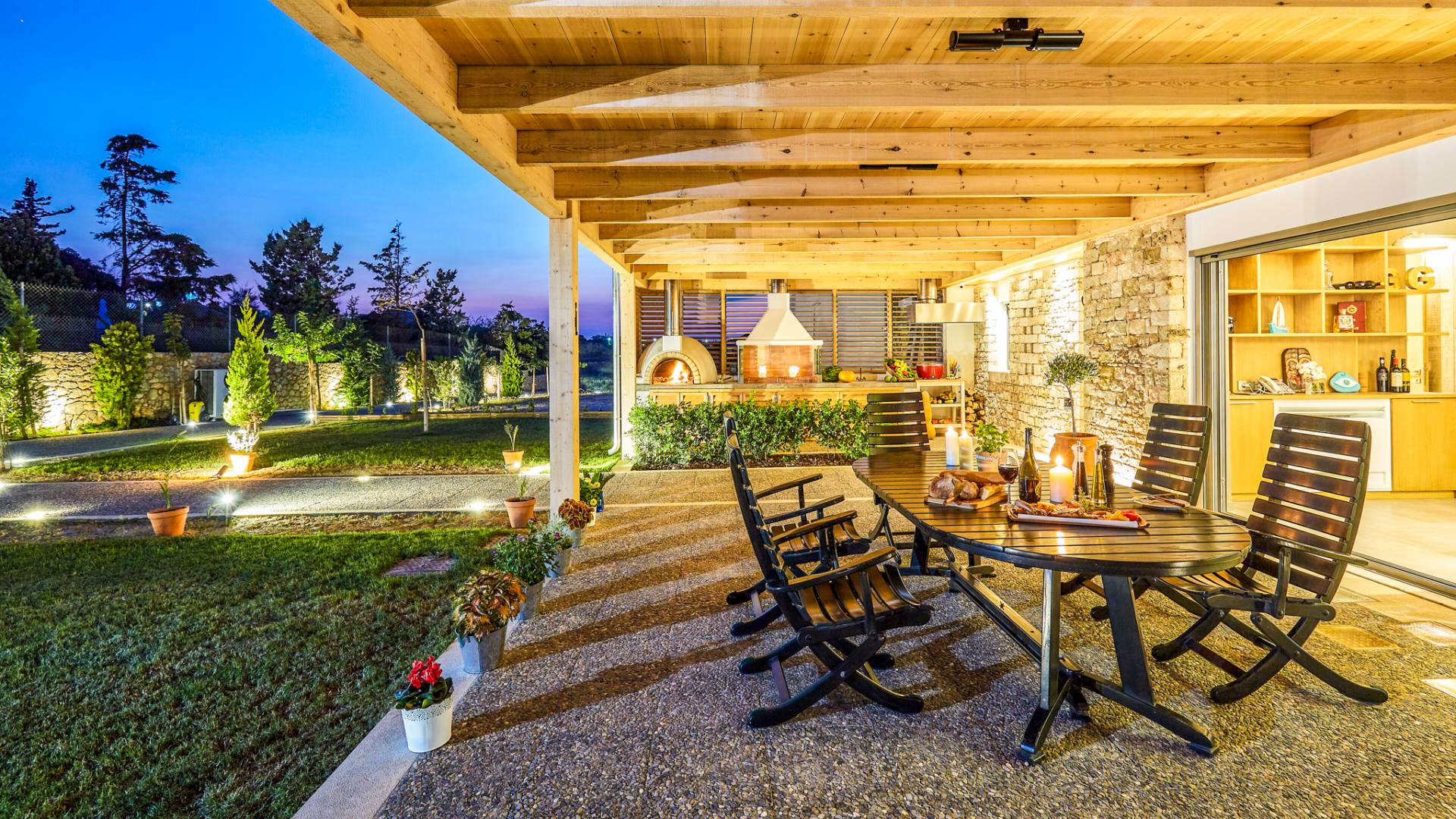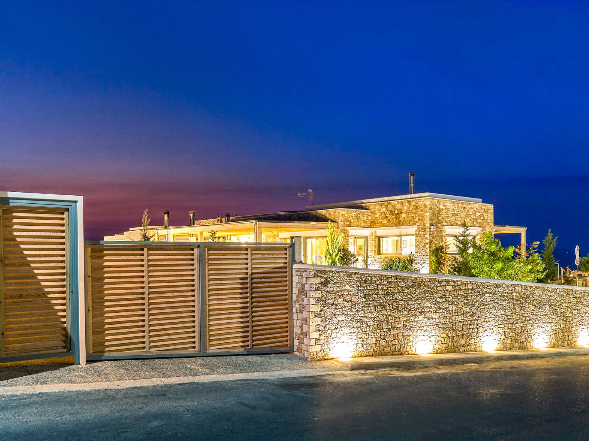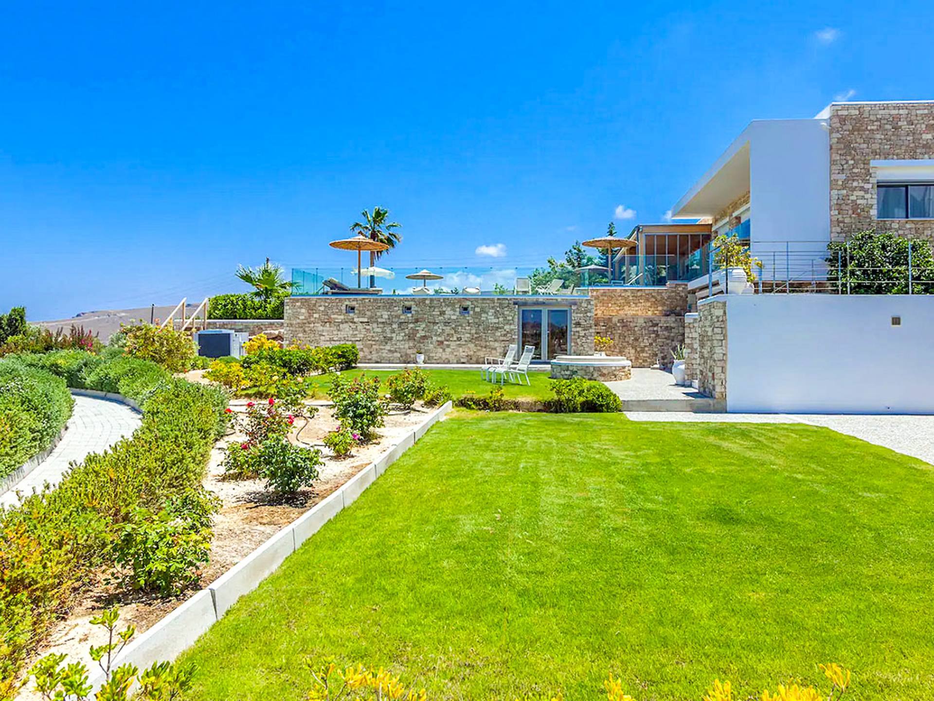 Dos espléndidos jardines te esperan para momentos de despreocupación sin importar el clima, ya que uno está ubicado en el lado norte de la piscina y el otro en el sur tiene un tradicional horno de piedra. La barbacoa tamaño king está rodeada de hermosos árboles cretenses.