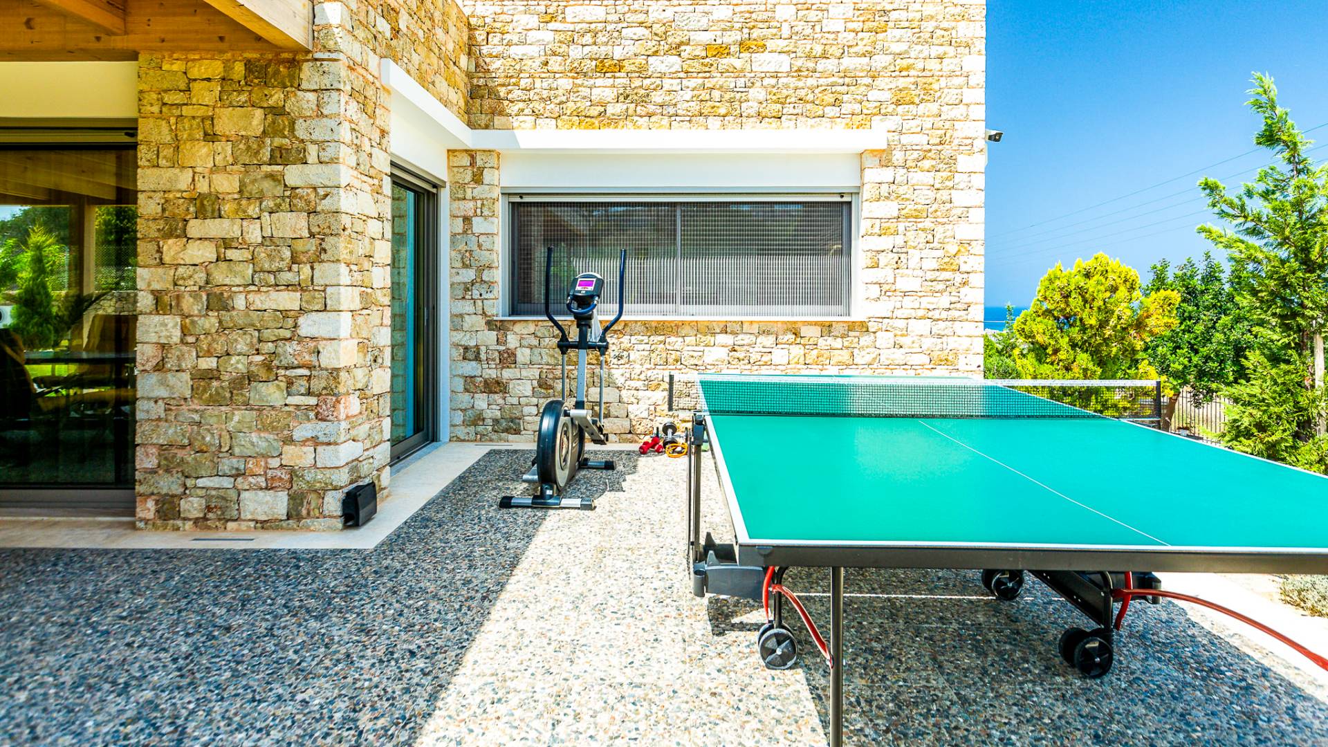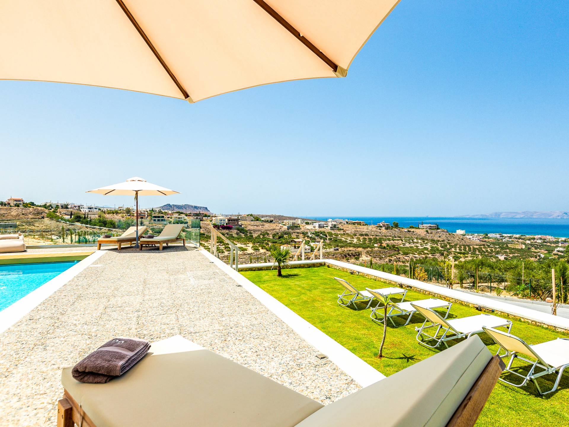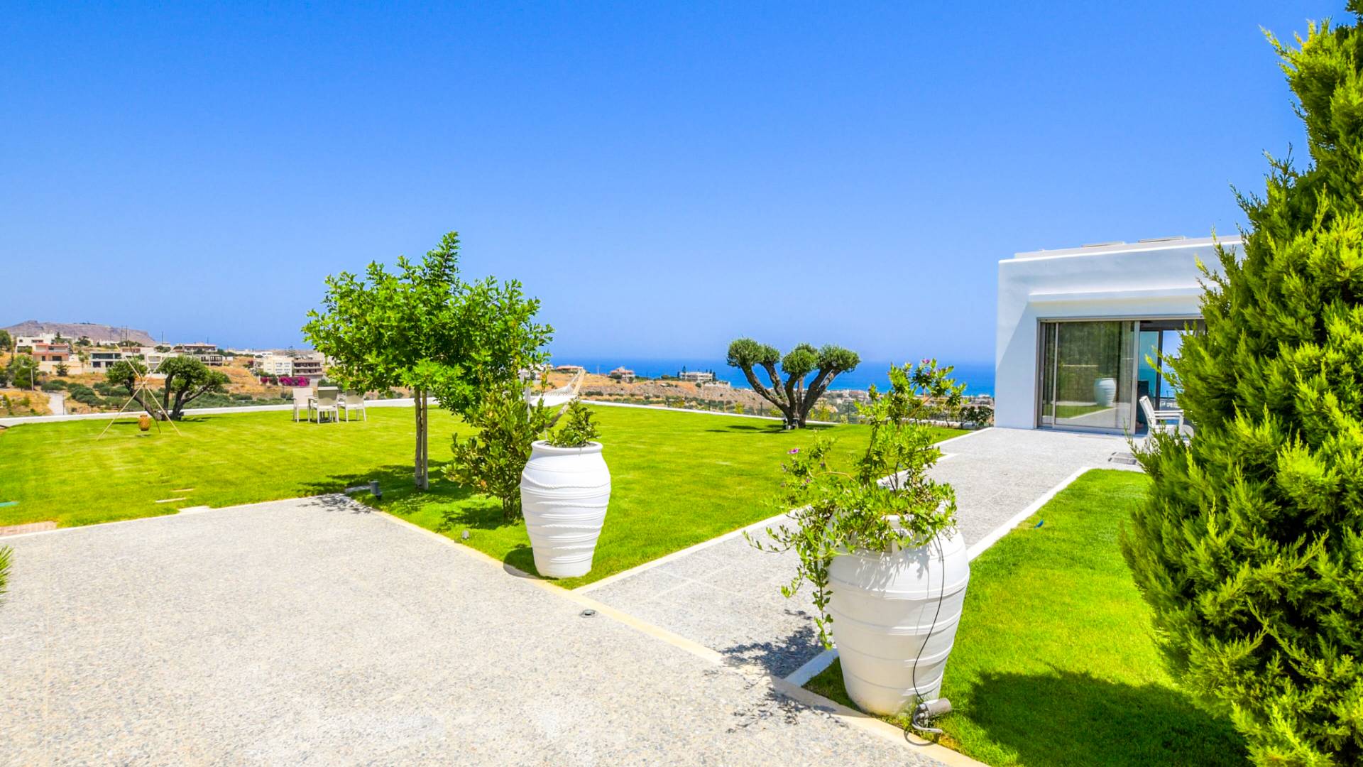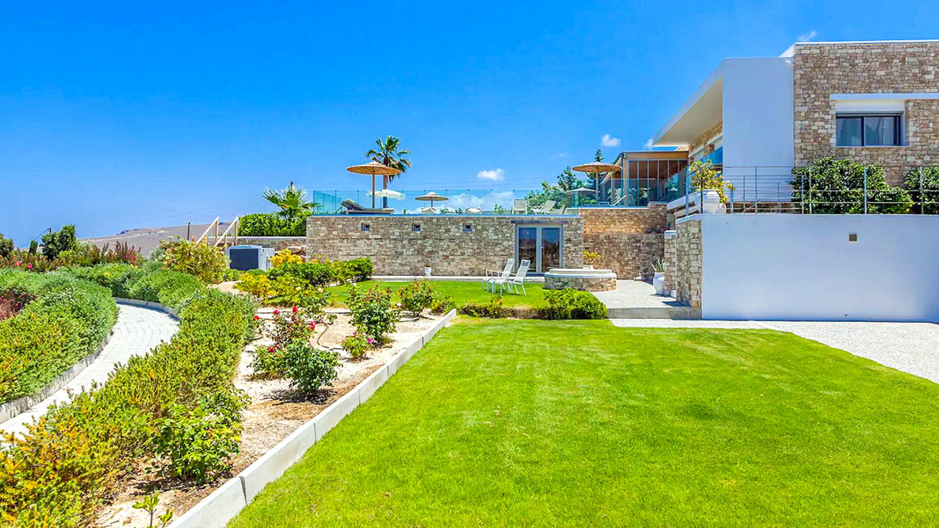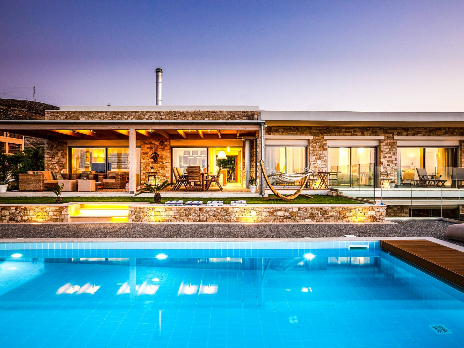 Dos espléndidos jardines te esperan para momentos de despreocupación sin importar el clima, ya que uno está ubicado en el lado norte de la piscina y el otro en el sur tiene un tradicional horno de piedra. La barbacoa tamaño king está rodeada de hermosos árboles cretenses.