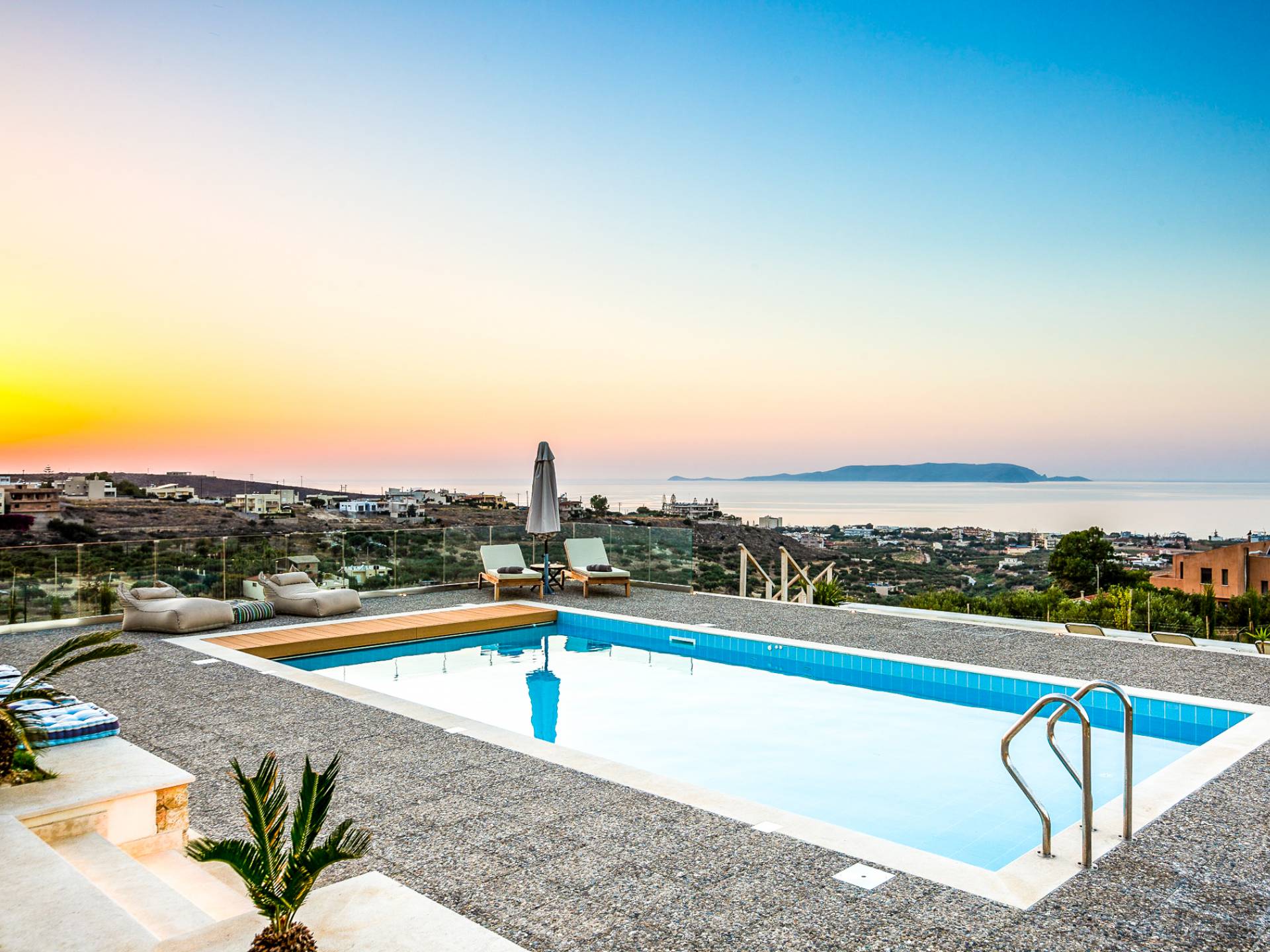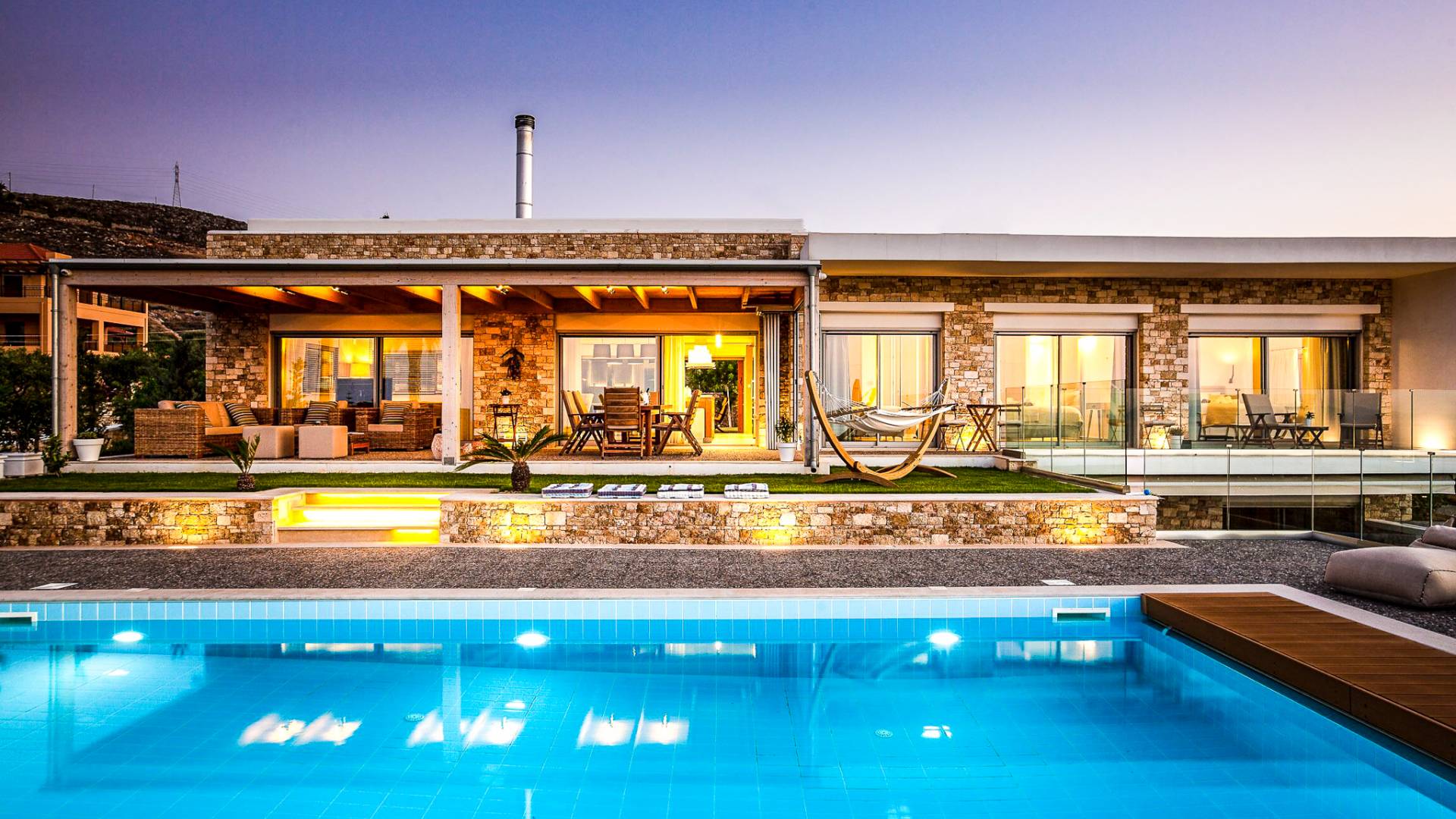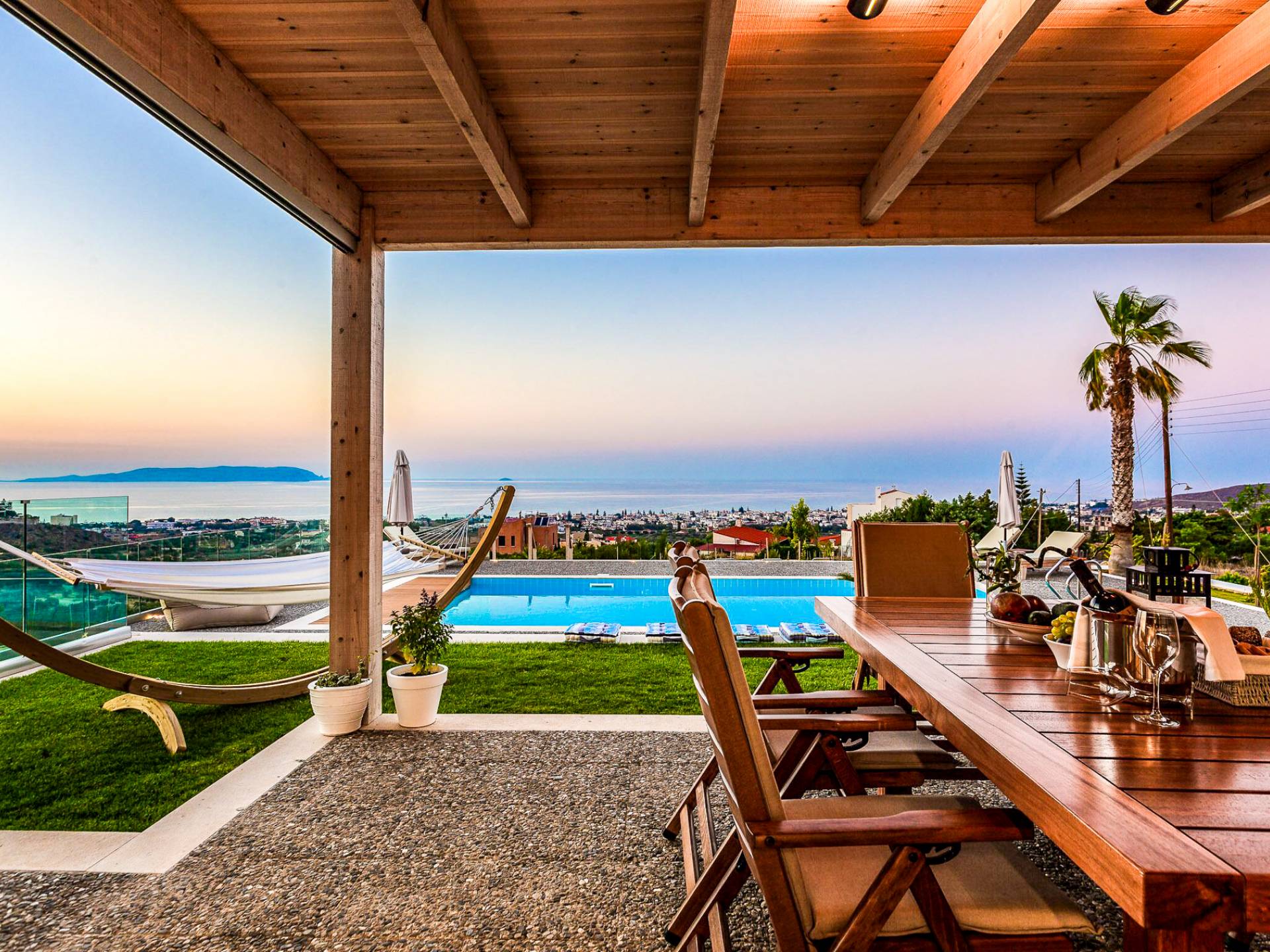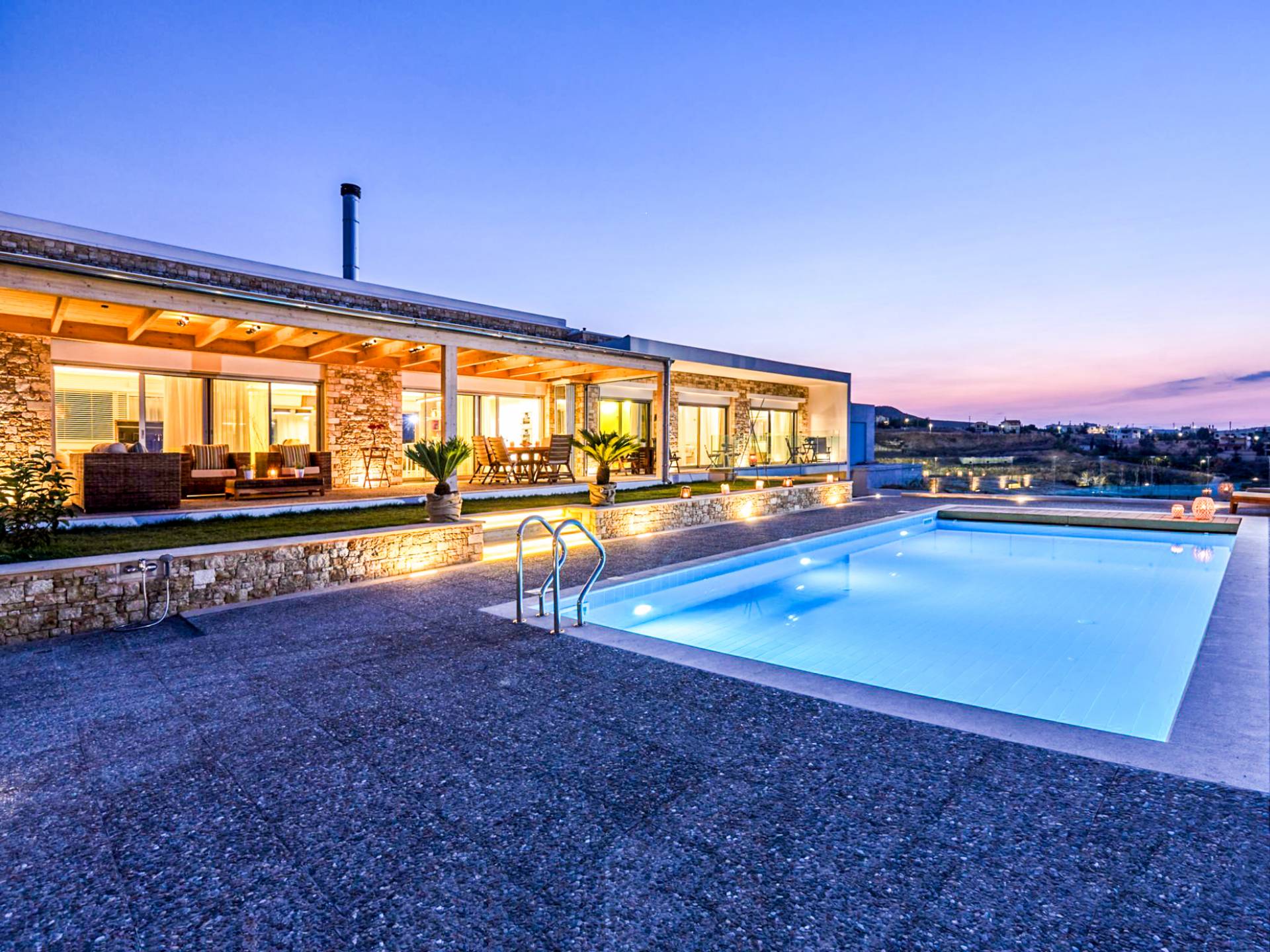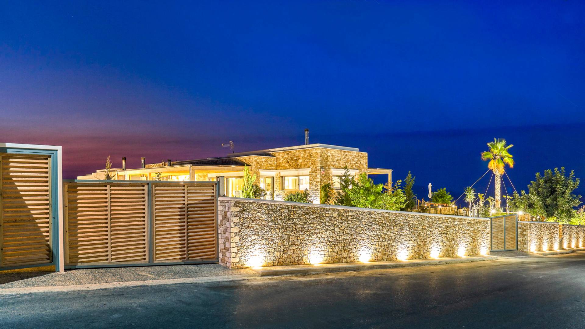 Dos espléndidos jardines te esperan para momentos de despreocupación sin importar el clima, ya que uno está ubicado en el lado norte de la piscina y el otro en el sur tiene un tradicional horno de piedra. La barbacoa tamaño king está rodeada de hermosos árboles cretenses.