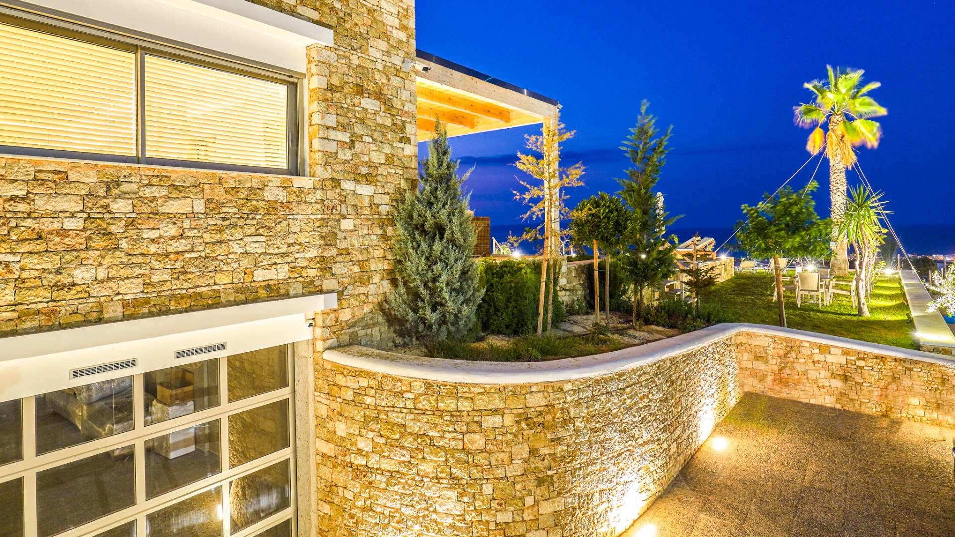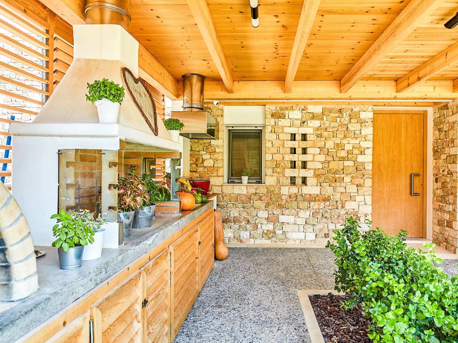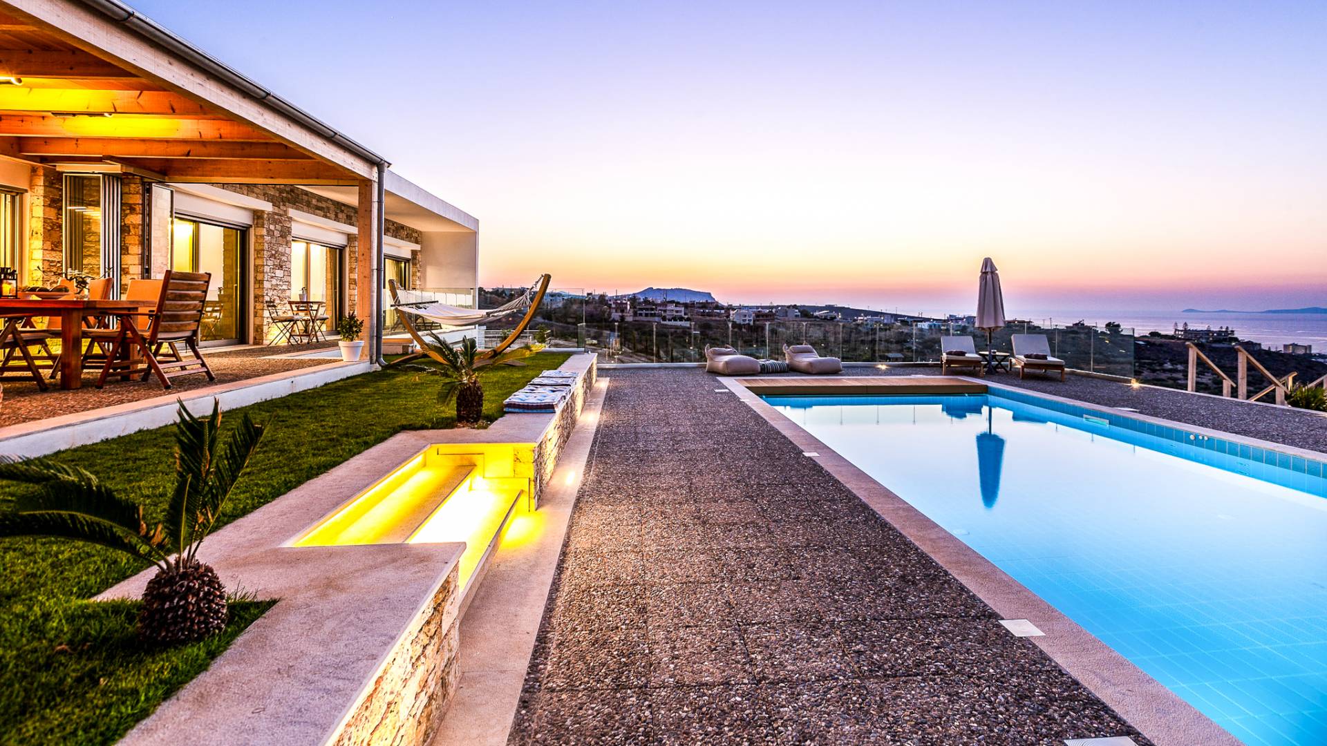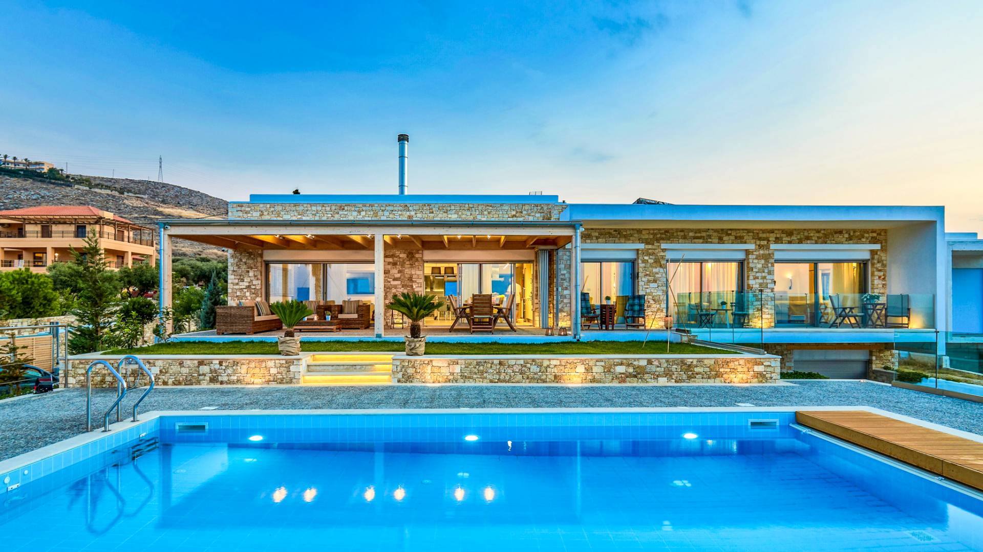 Dos espléndidos jardines te esperan para momentos de despreocupación sin importar el clima, ya que uno está ubicado en el lado norte de la piscina y el otro en el sur tiene un tradicional horno de piedra. La barbacoa tamaño king está rodeada de hermosos árboles cretenses.
