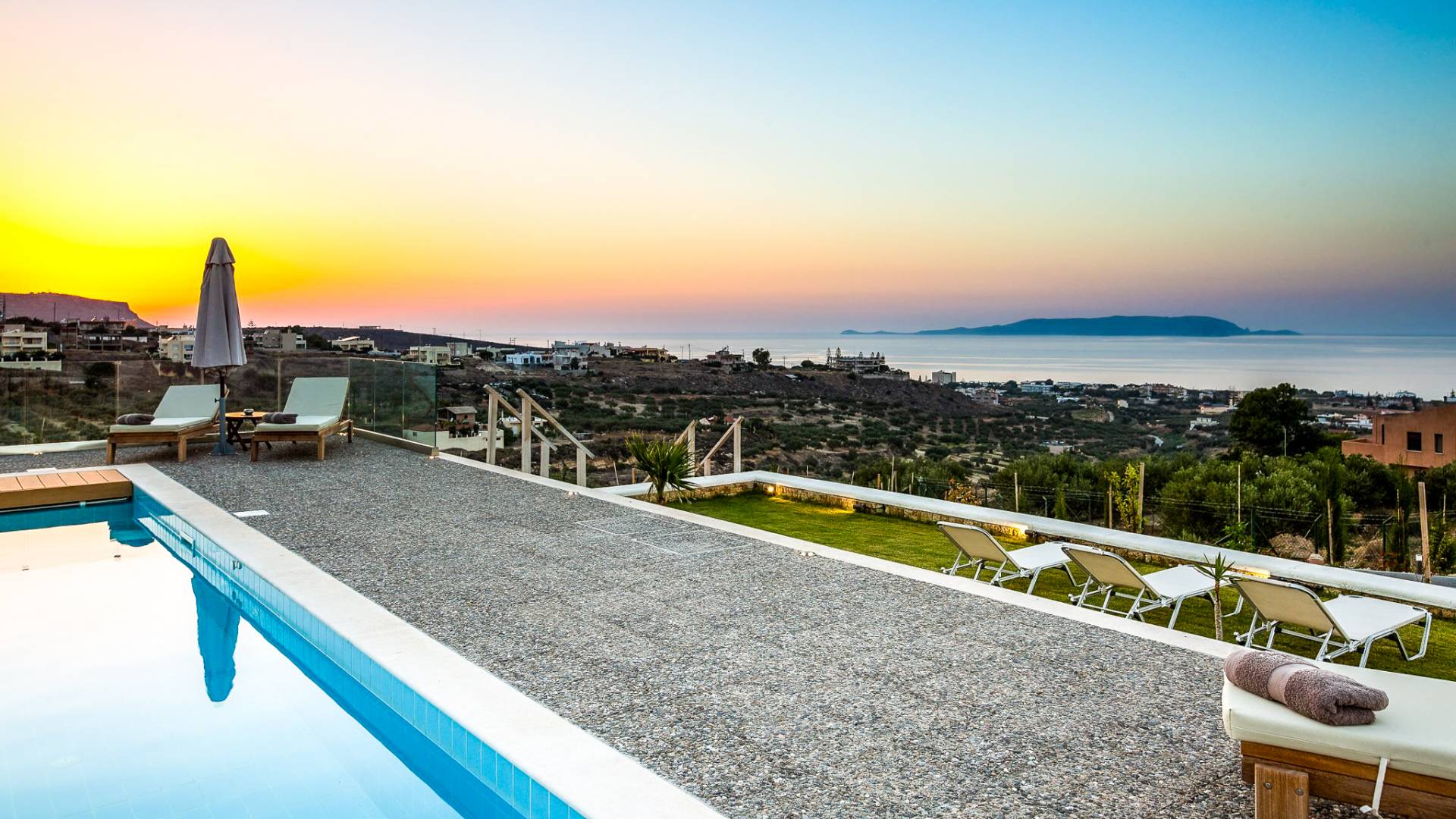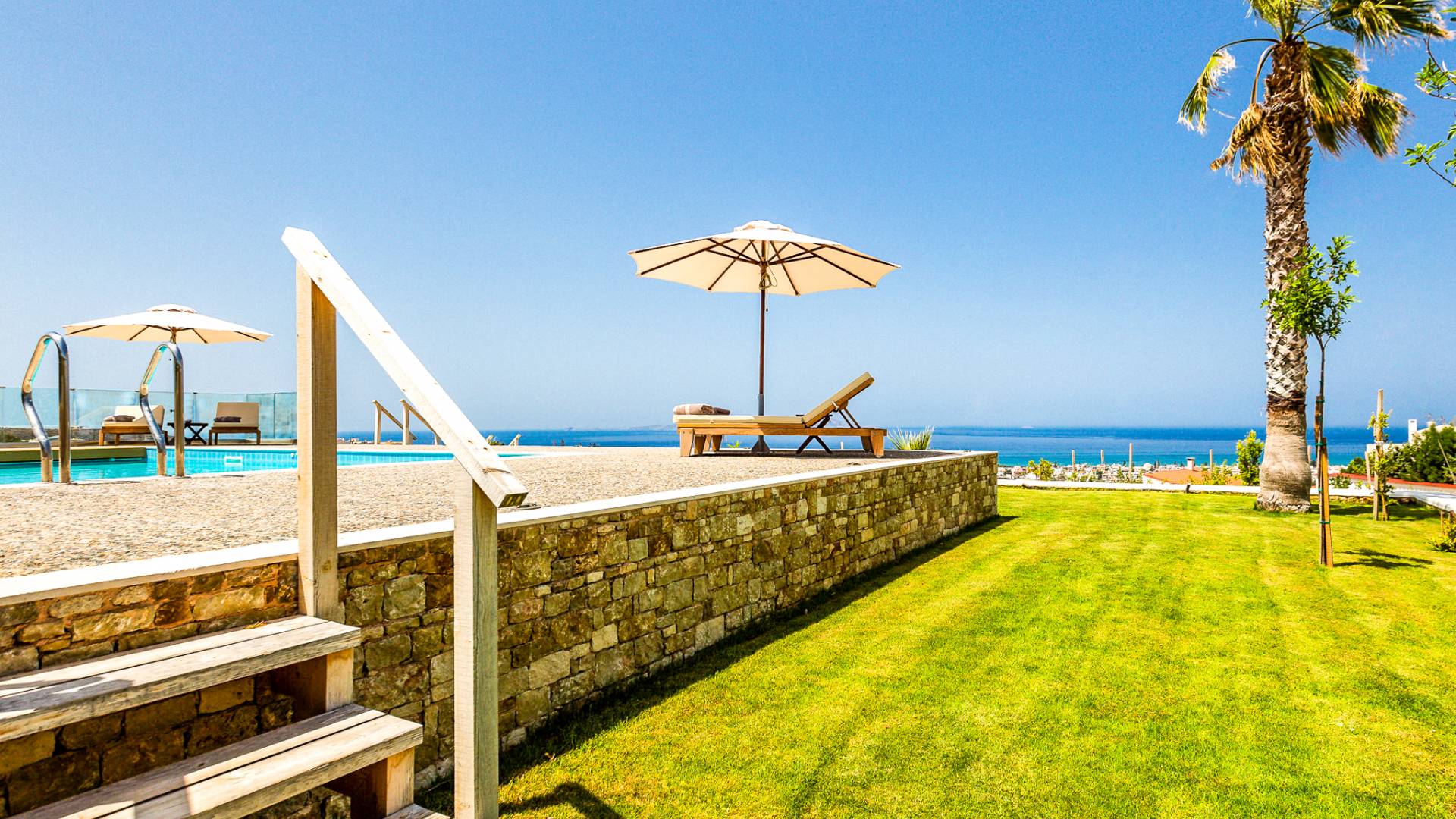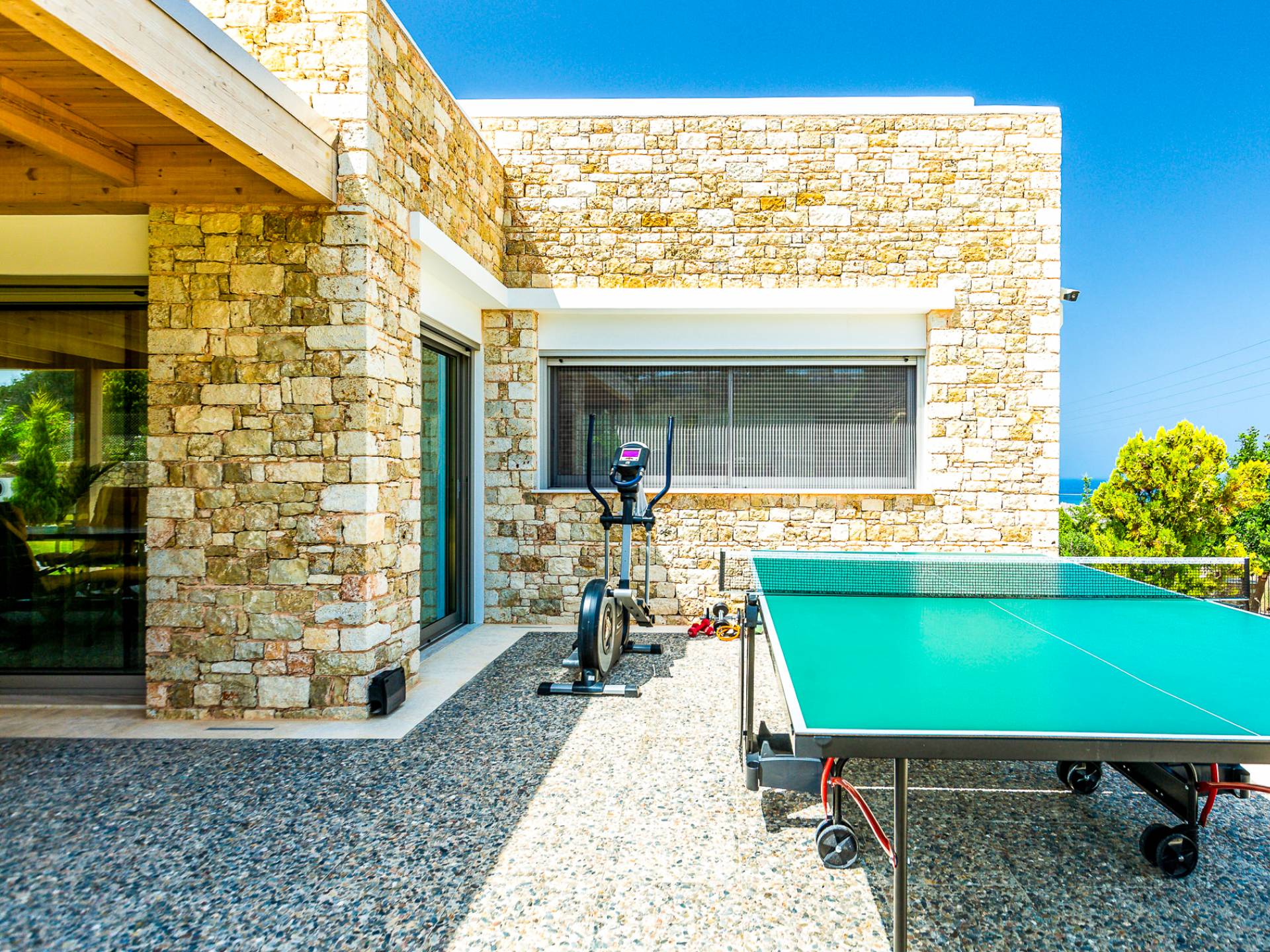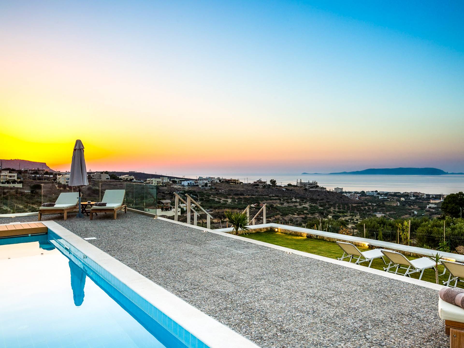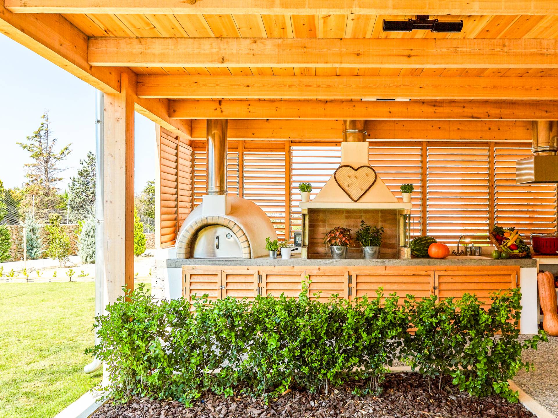 Dos espléndidos jardines te esperan para momentos de despreocupación sin importar el clima, ya que uno está ubicado en el lado norte de la piscina y el otro en el sur tiene un tradicional horno de piedra. La barbacoa tamaño king está rodeada de hermosos árboles cretenses.