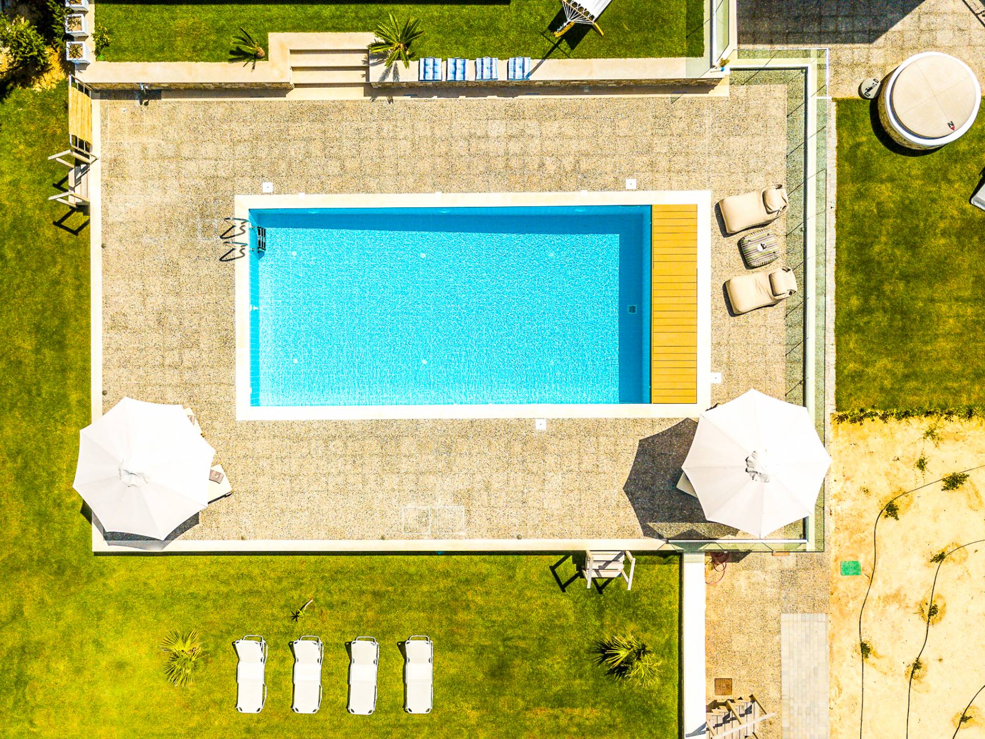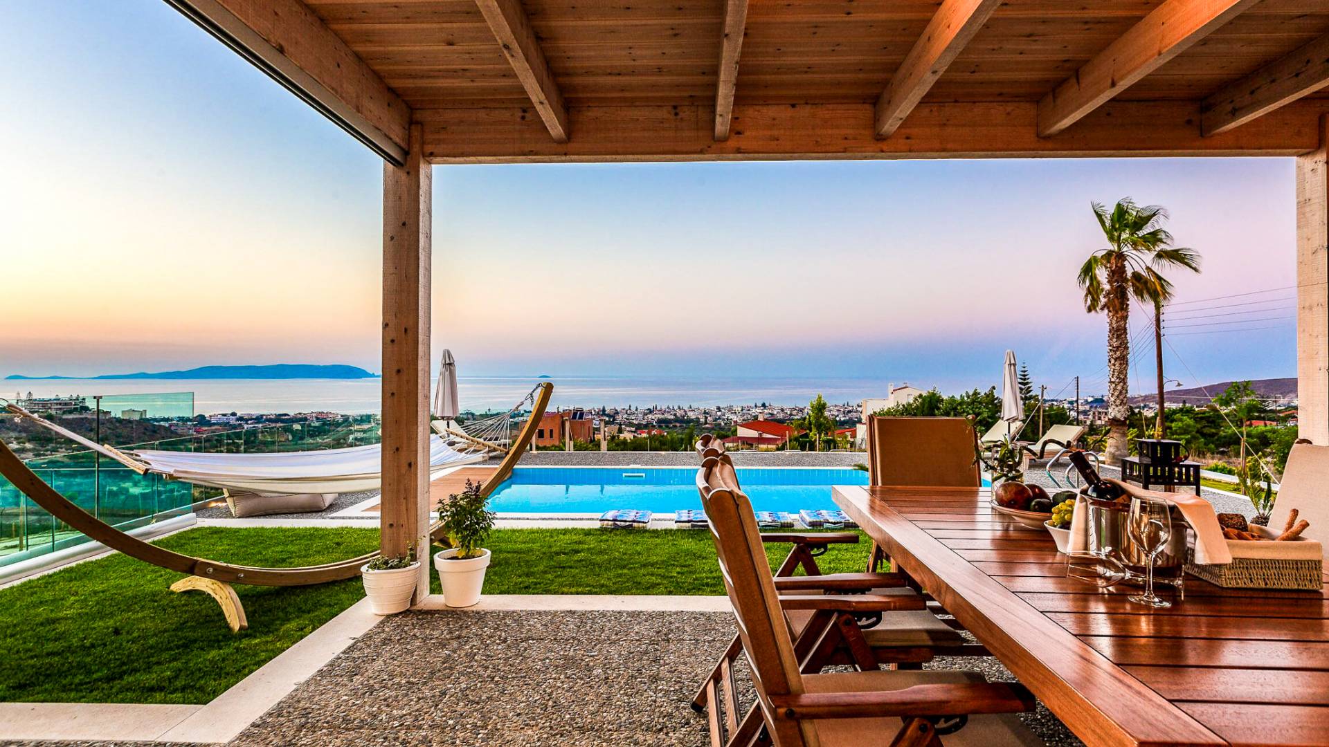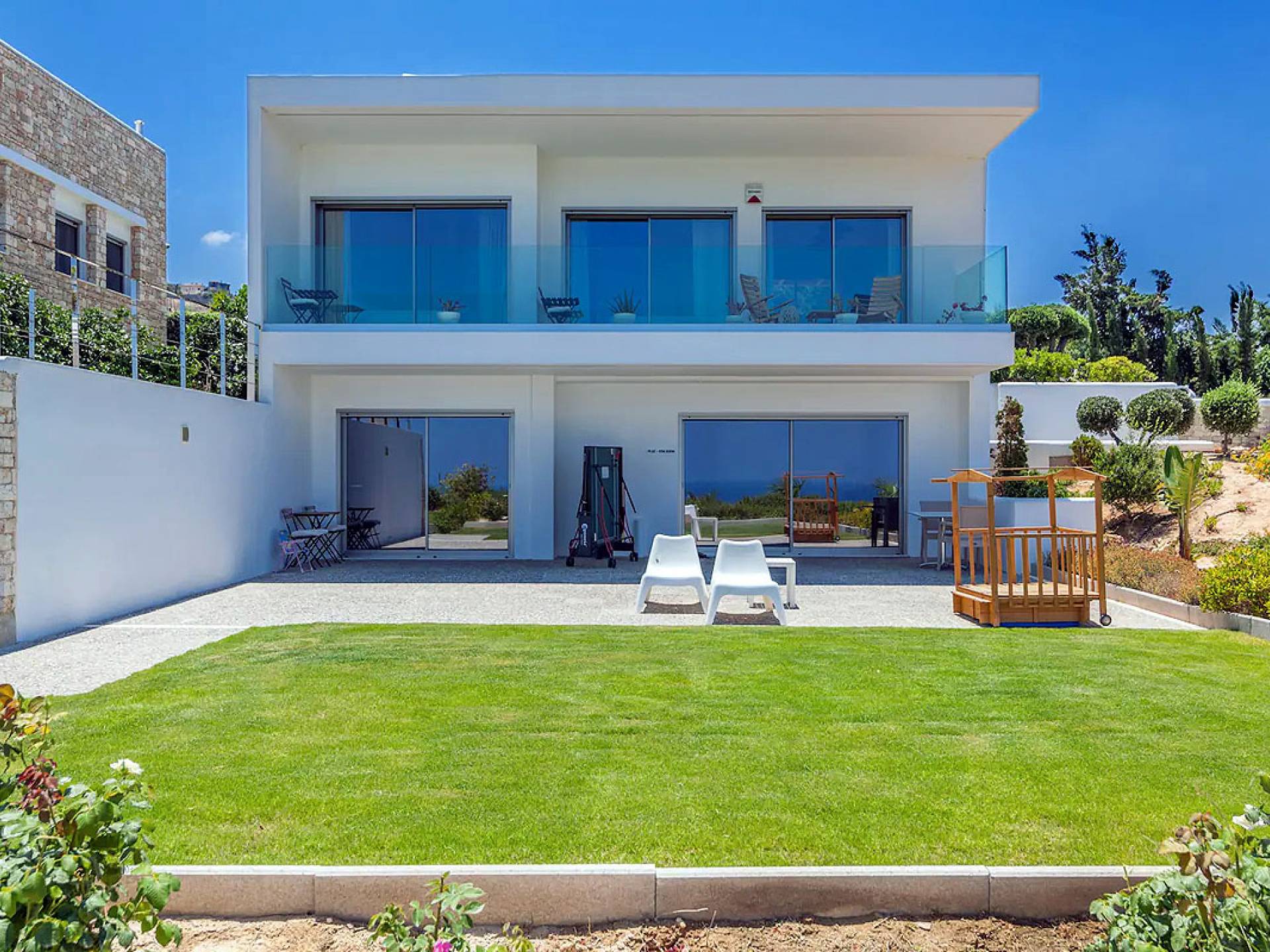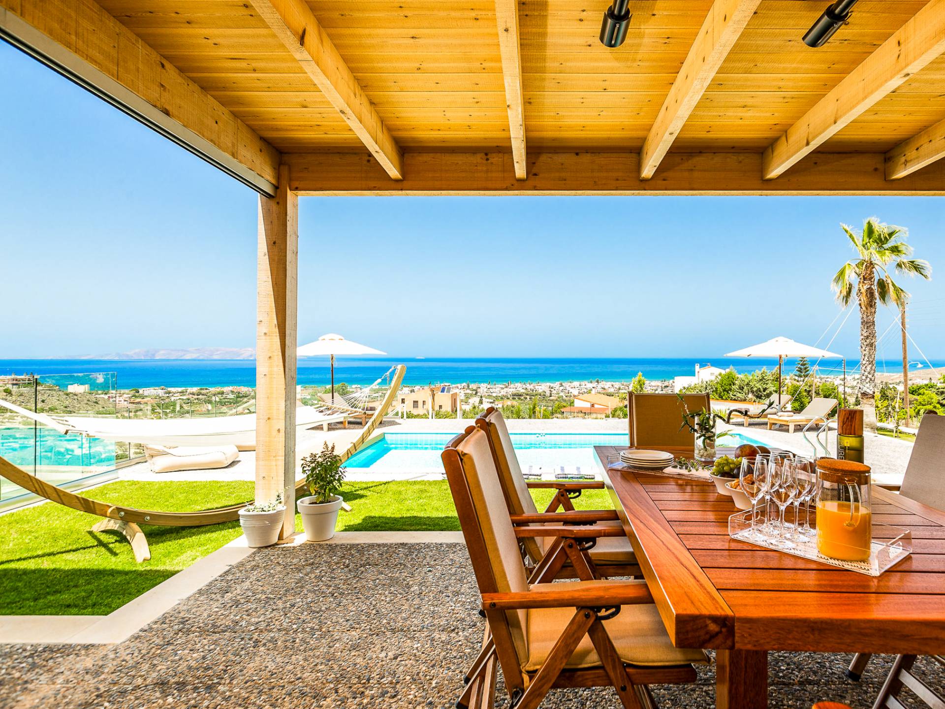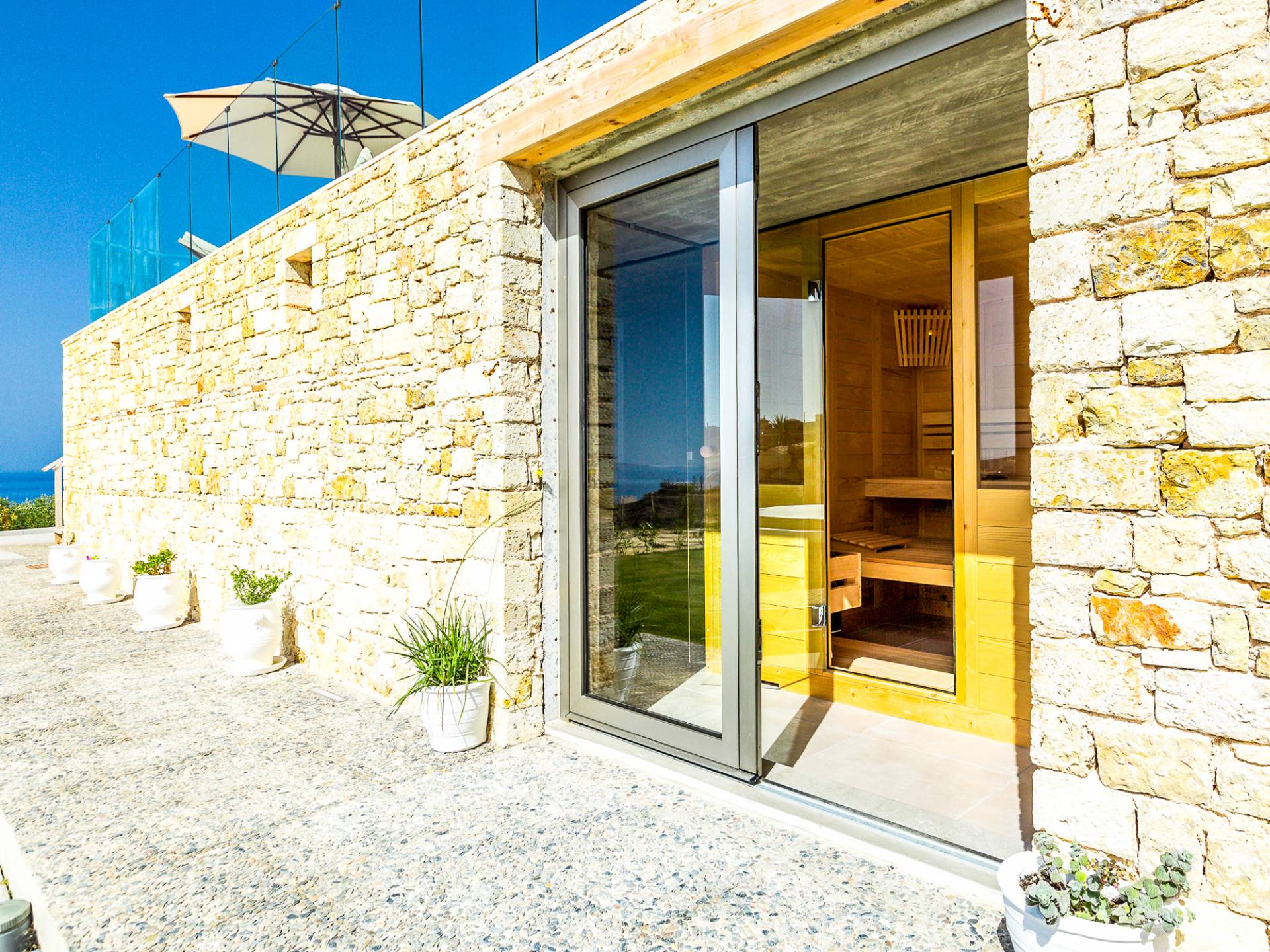 Dos espléndidos jardines te esperan para momentos de despreocupación sin importar el clima, ya que uno está ubicado en el lado norte de la piscina y el otro en el sur tiene un tradicional horno de piedra. La barbacoa tamaño king está rodeada de hermosos árboles cretenses.
