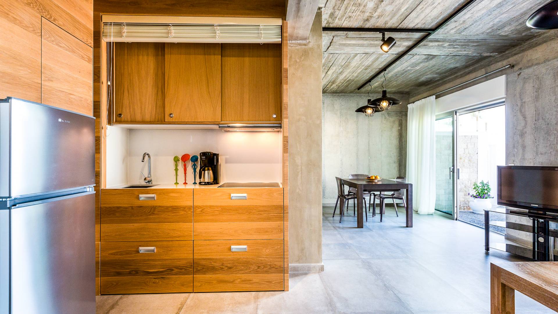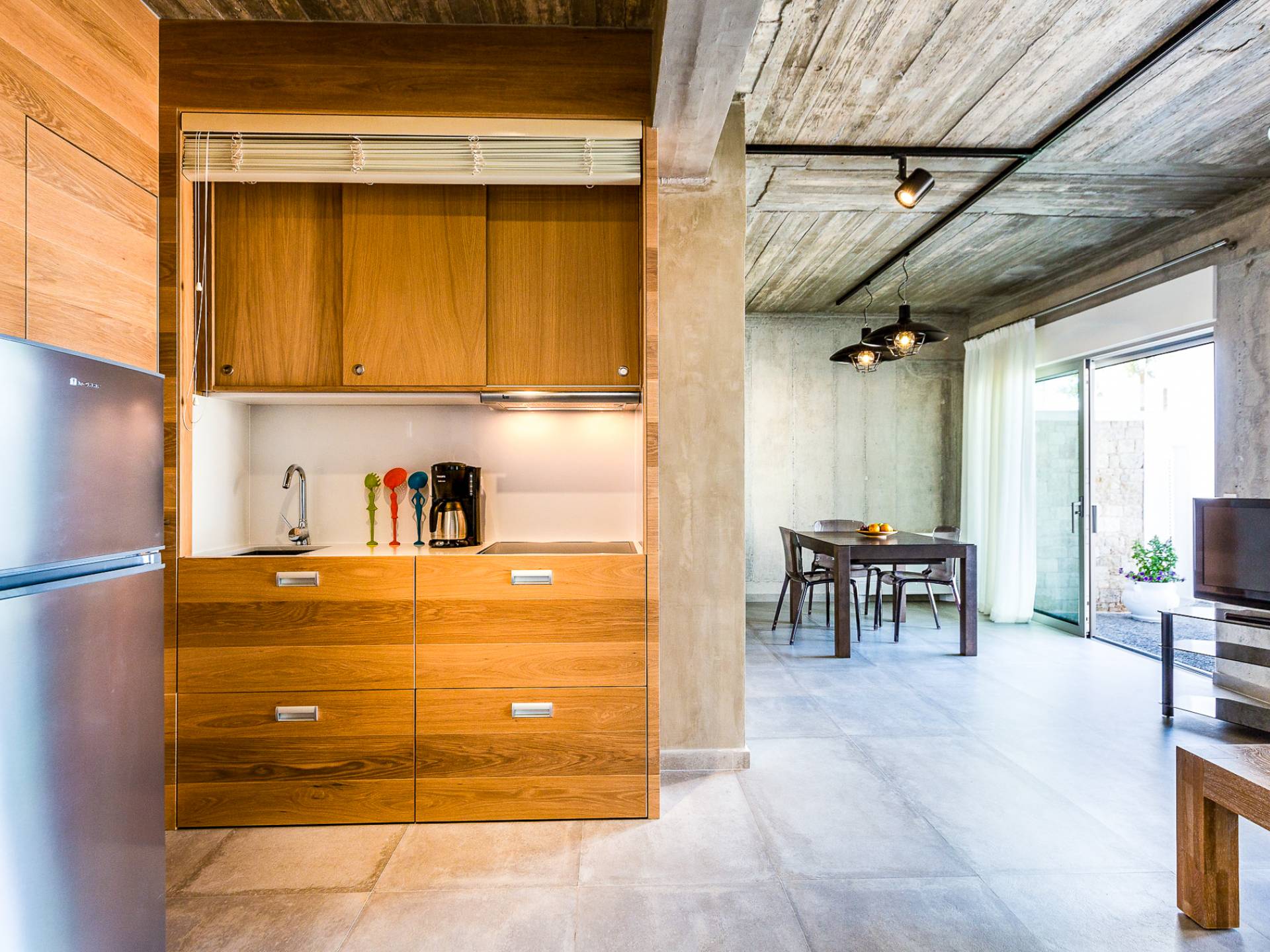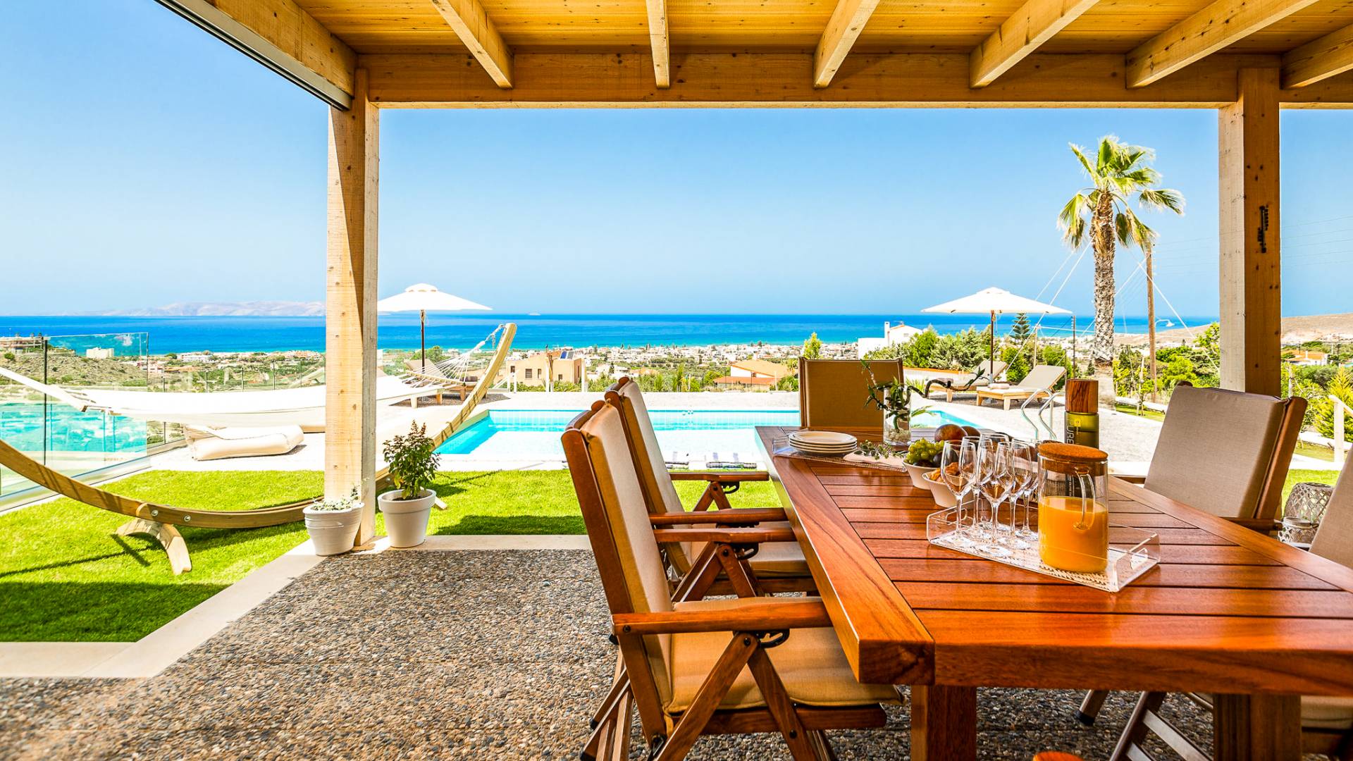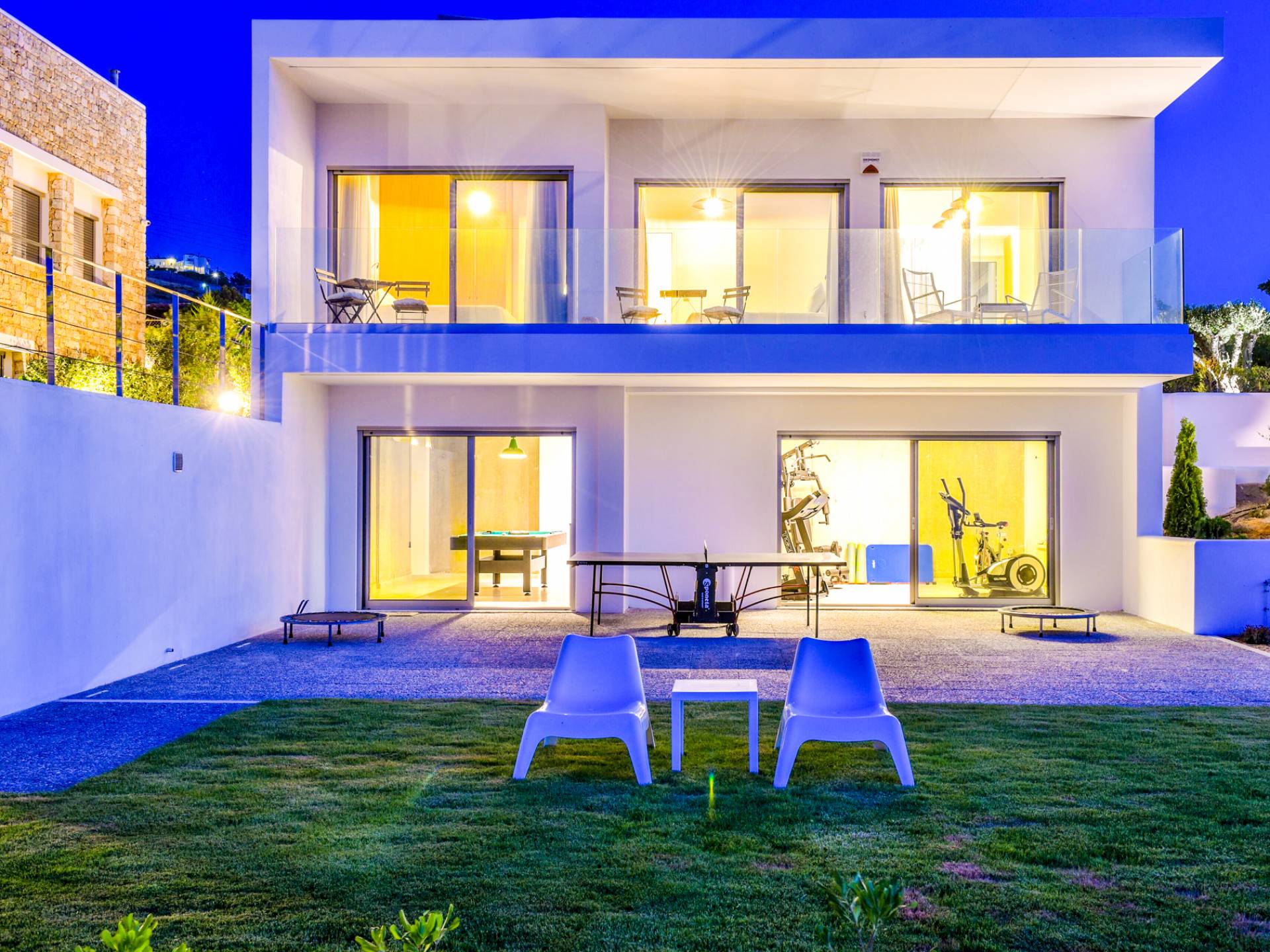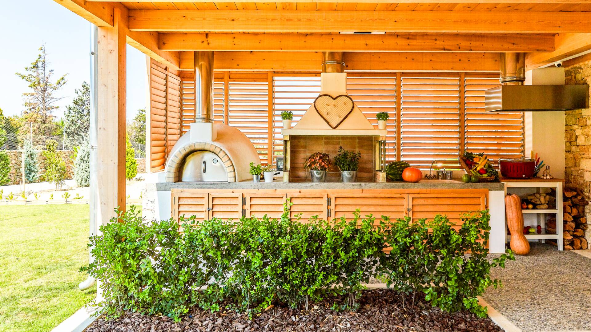Dos espléndidos jardines te esperan para momentos de despreocupación sin importar el clima, ya que uno está ubicado en el lado norte de la piscina y el otro en el sur tiene un tradicional horno de piedra. La barbacoa tamaño king está rodeada de hermosos árboles cretenses.
