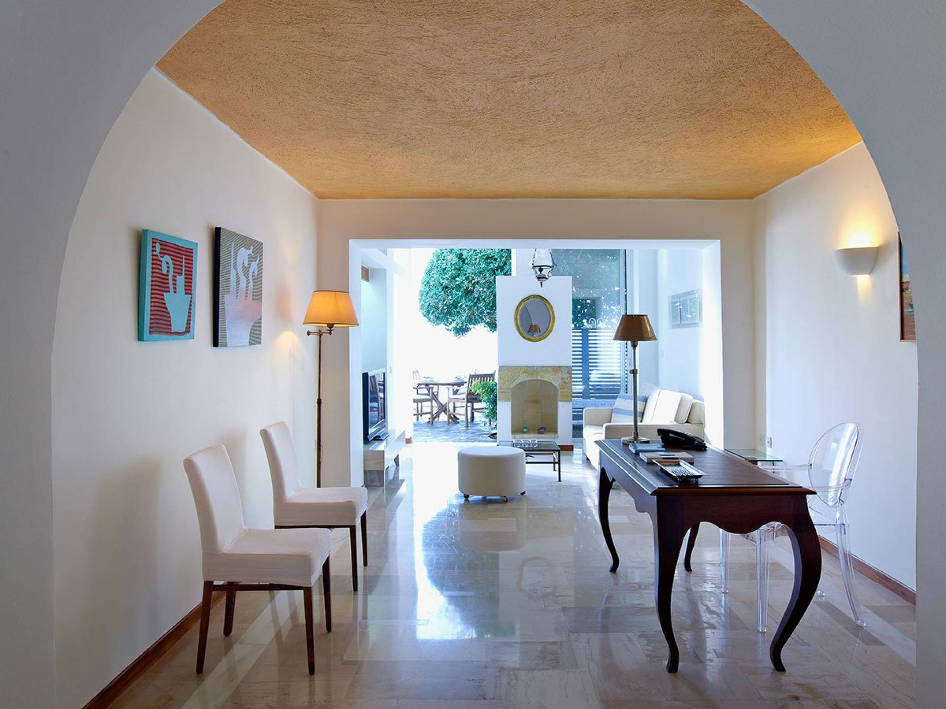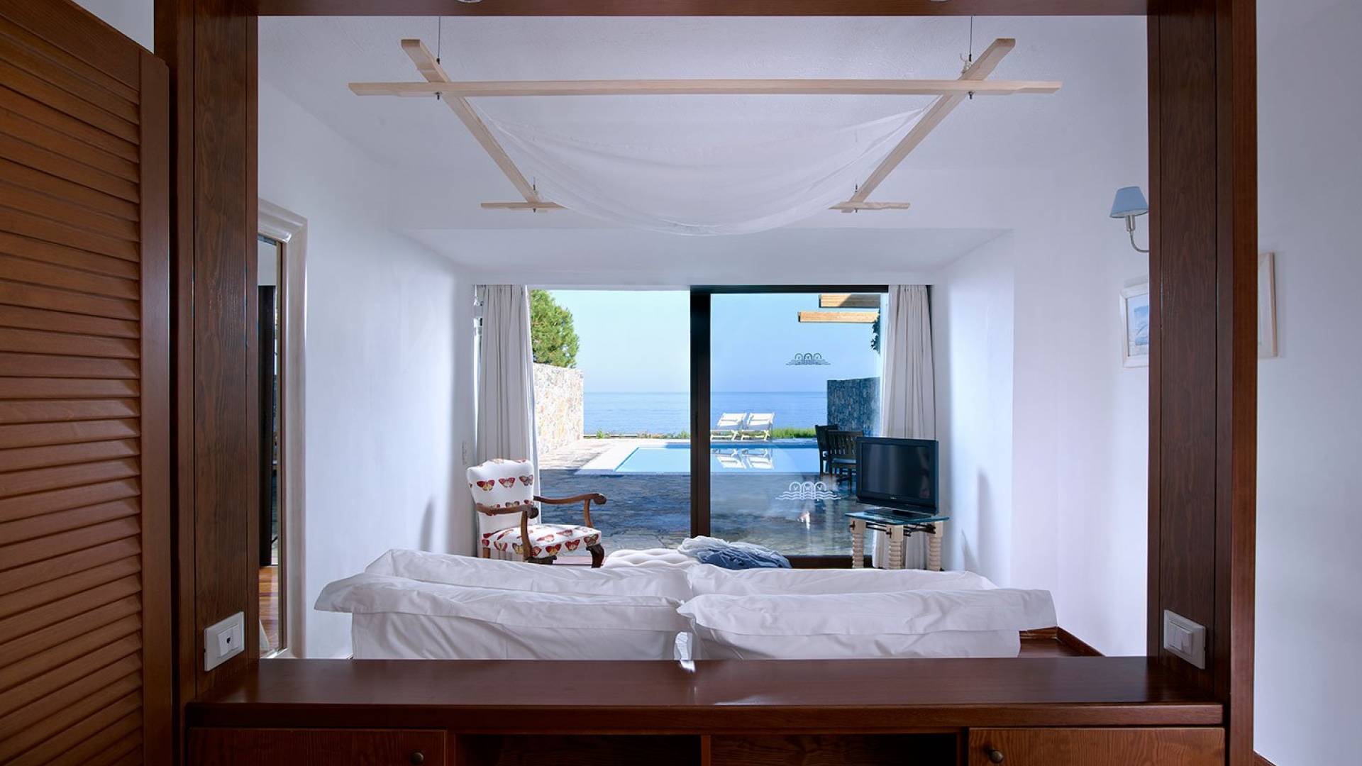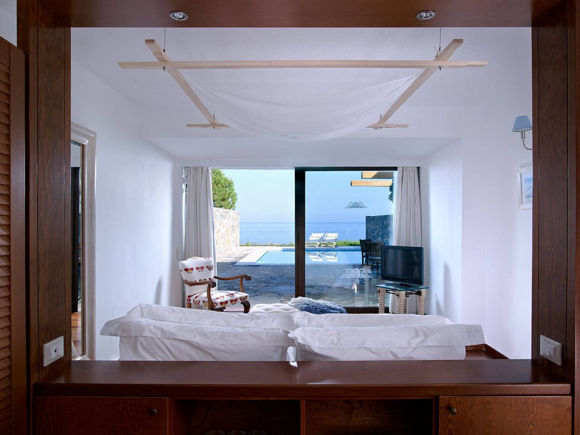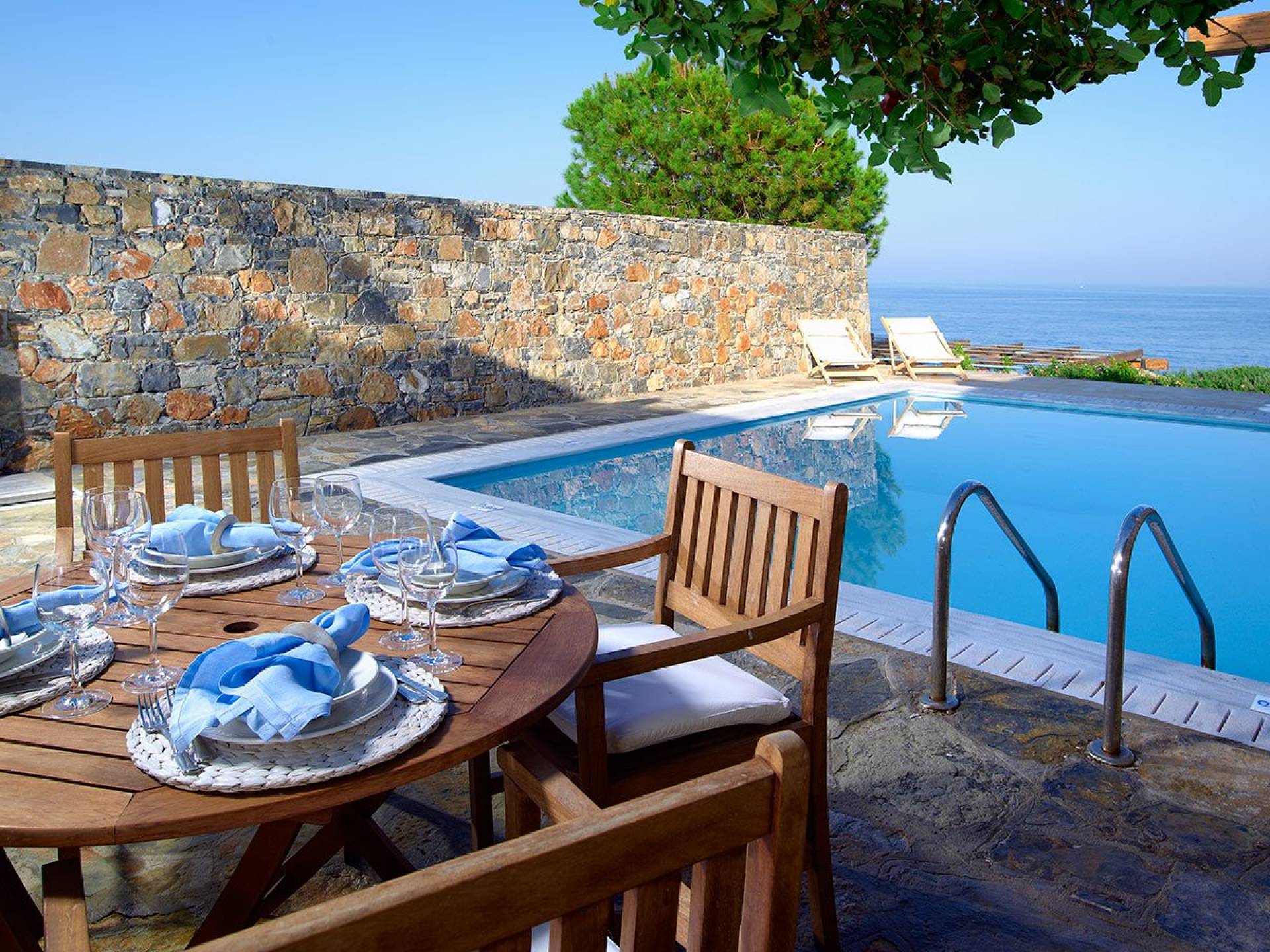 Esta encantadora villa combina la vida interior y exterior con sus amplias habitaciones, terraza jardín con una piscina privada climatizada de tamaño extra. También tiene una vista espectacular a la bahía de Mirabello, un dormitorio con cama King, una ducha en suite y un inodoro separado en el piso superior. El segundo dormitorio en la planta baja tiene una cama King o dos camas individuales con un baño en suite revestido de mármol con jacuzzi, una cabina de ducha y WC separado con tocador, sala de estar separada, cocina y al aire libre. mesa de comedor a la sombra junto a la piscina privada.
