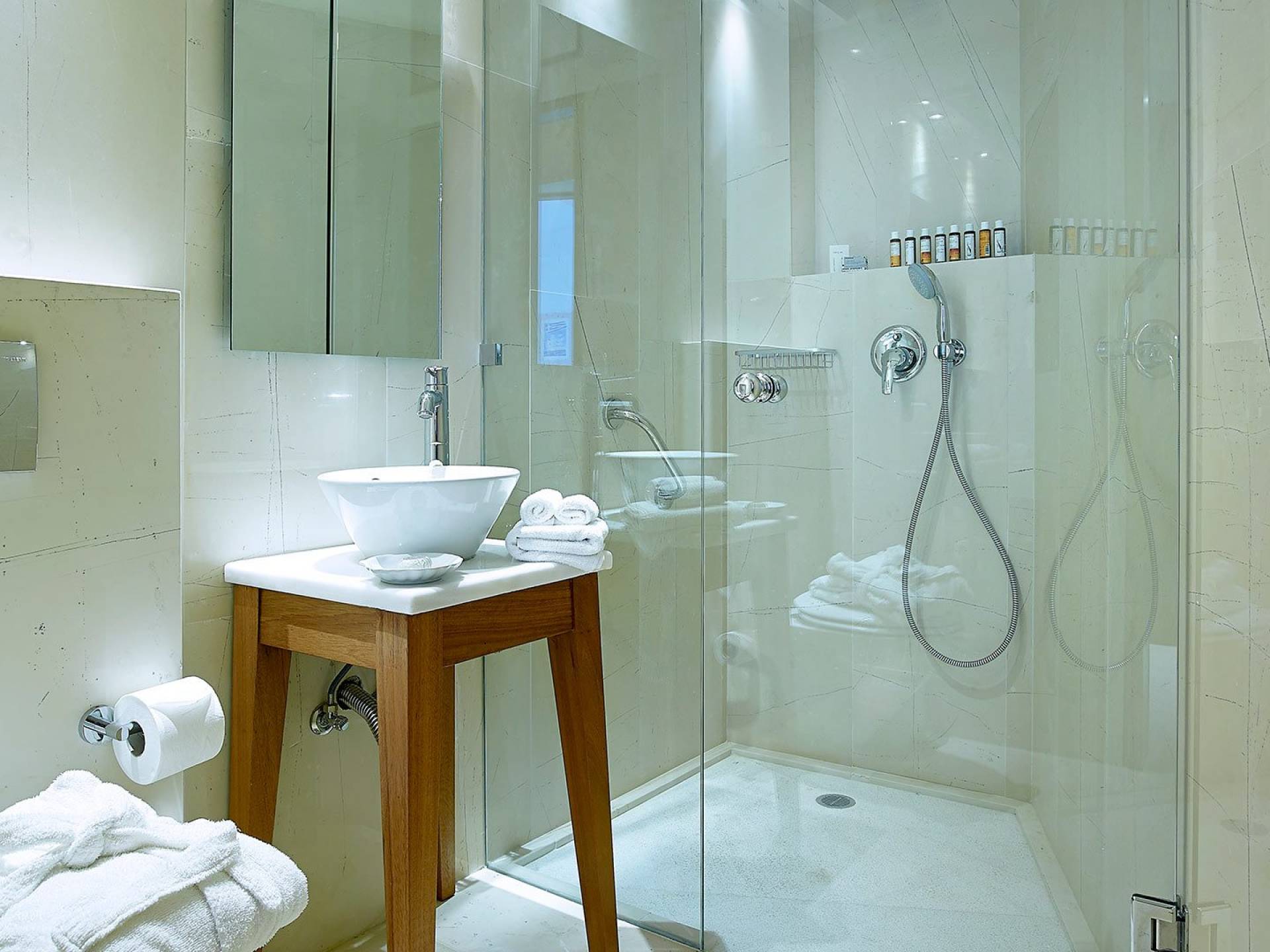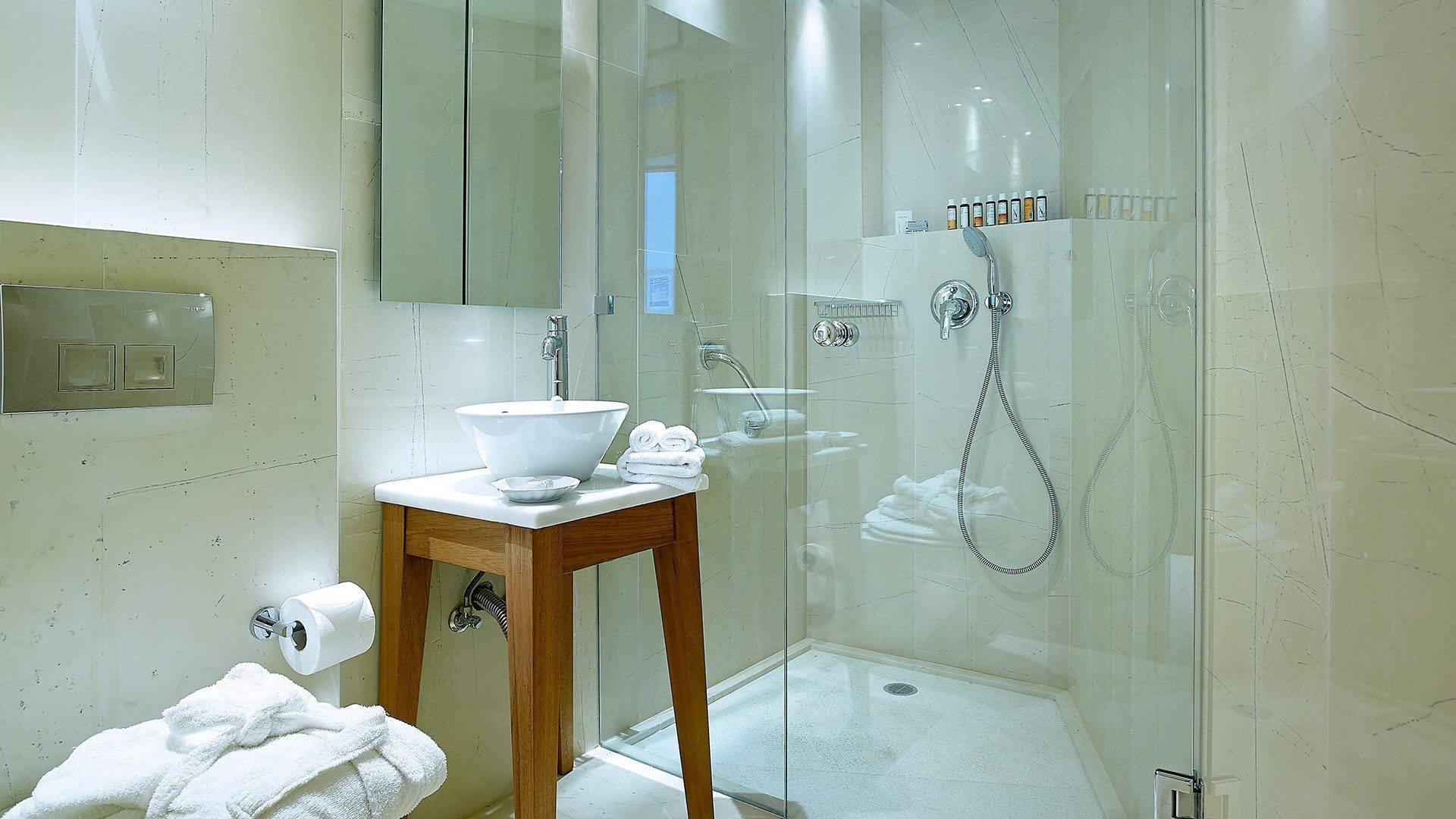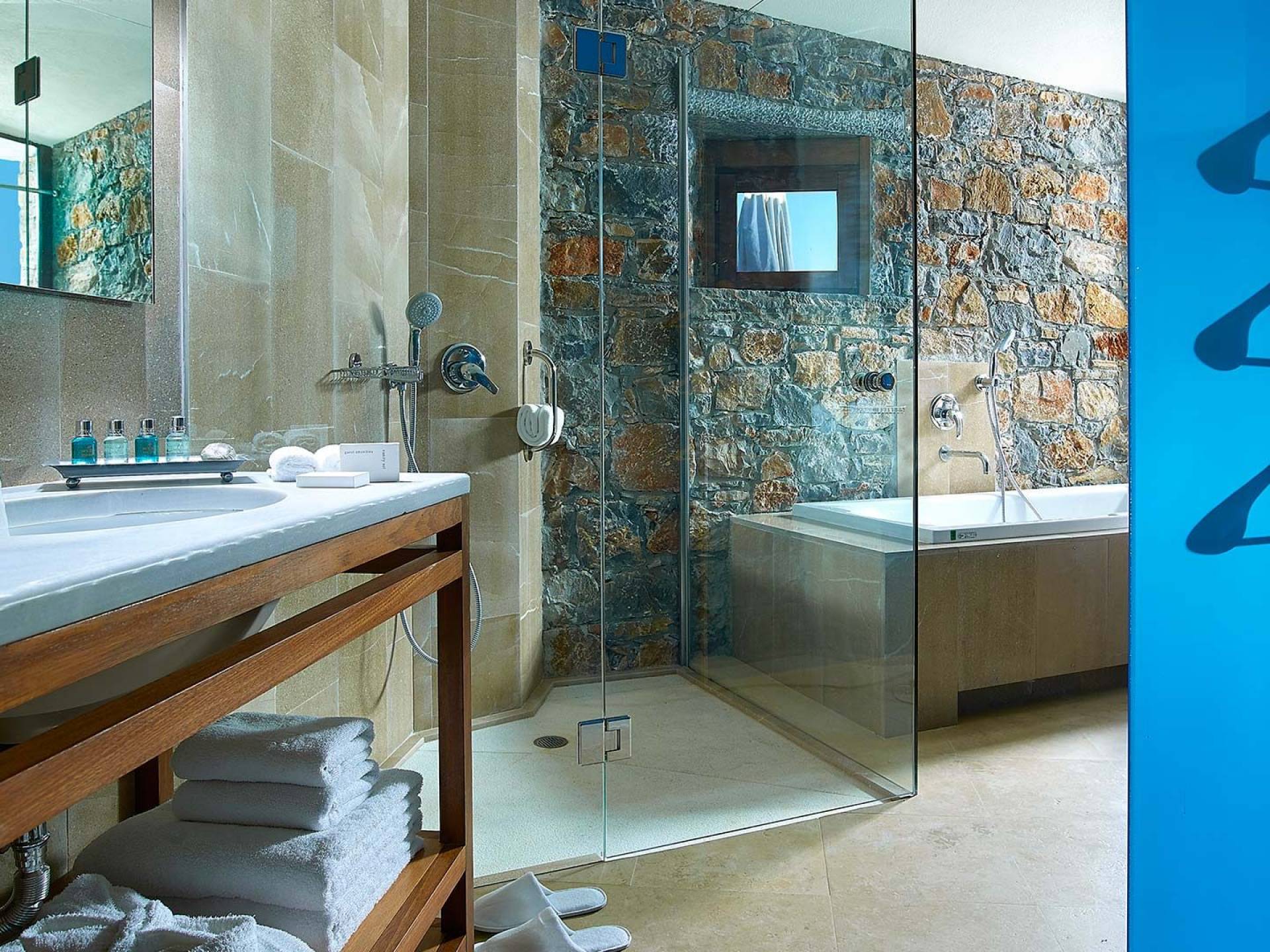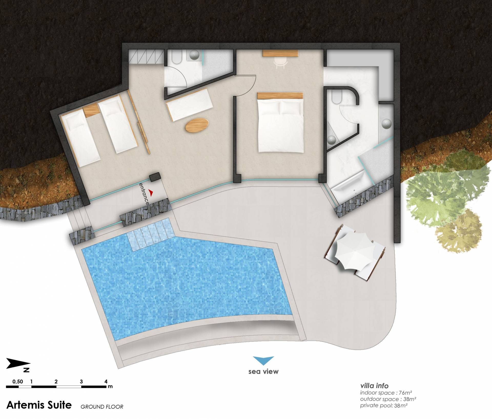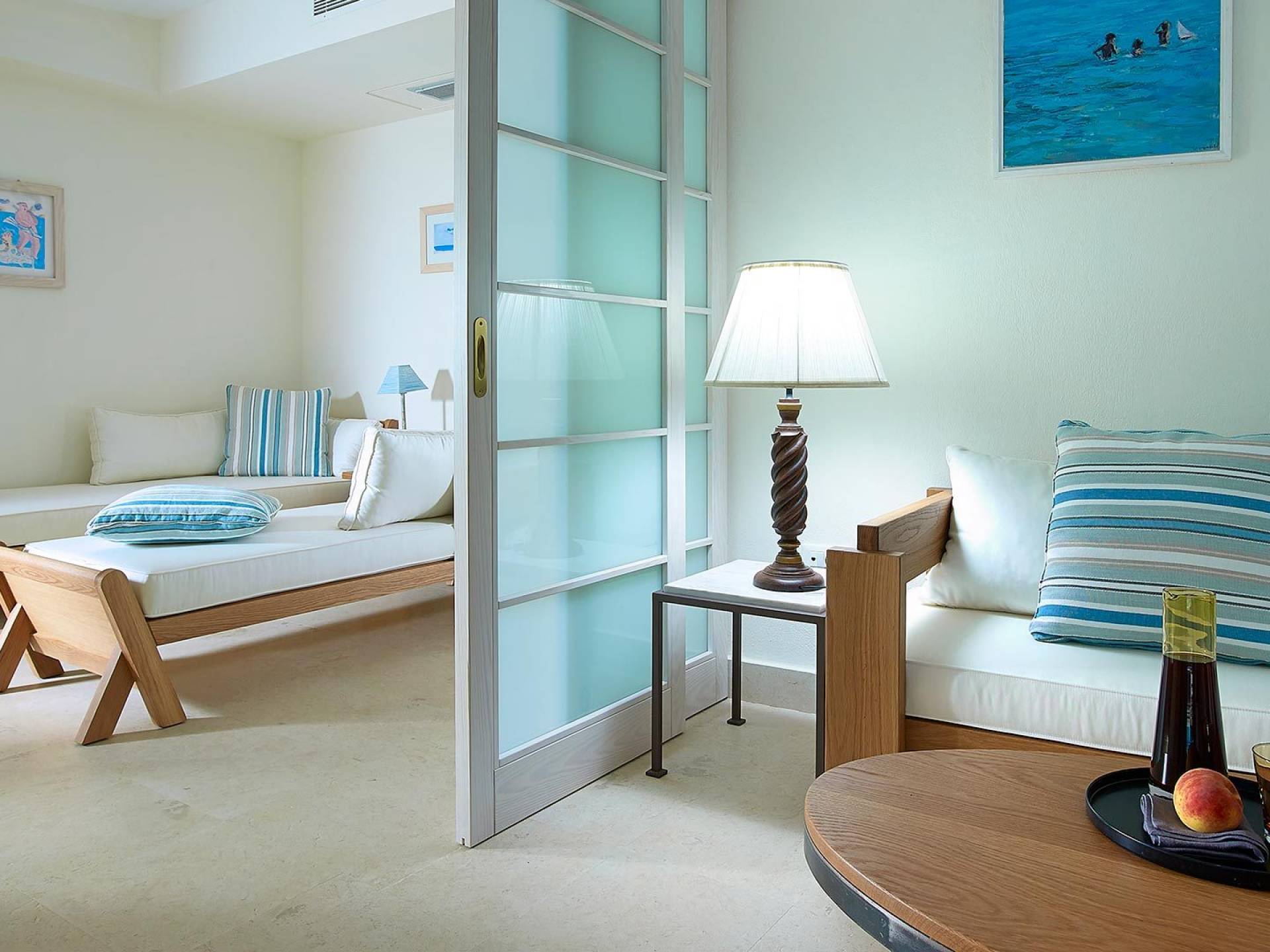 Contiene un dormitorio con vista al mar desde la cama Kingsize y un baño en suite revestido de mármol con bañera de hidromasaje, inodoro, espejo de aumento y cabina de ducha separada. Refrescos en la habitación Minibar completamente surtido con marcas premium. TV vía satélite de pantalla plana de 22 pulgadas, DVD, canal de música, unidad de aire acondicionado con control individual, caja de seguridad en la habitación, teléfono de marcación directa. Artículos de tocador de lujo, toallas de playa y secador de pelo. Terraza Balcón con vistas al mar de abajo con su sombrilla y tumbonas personales. Ideal si quieres privacidad absoluta e impresionantes vistas al mar.