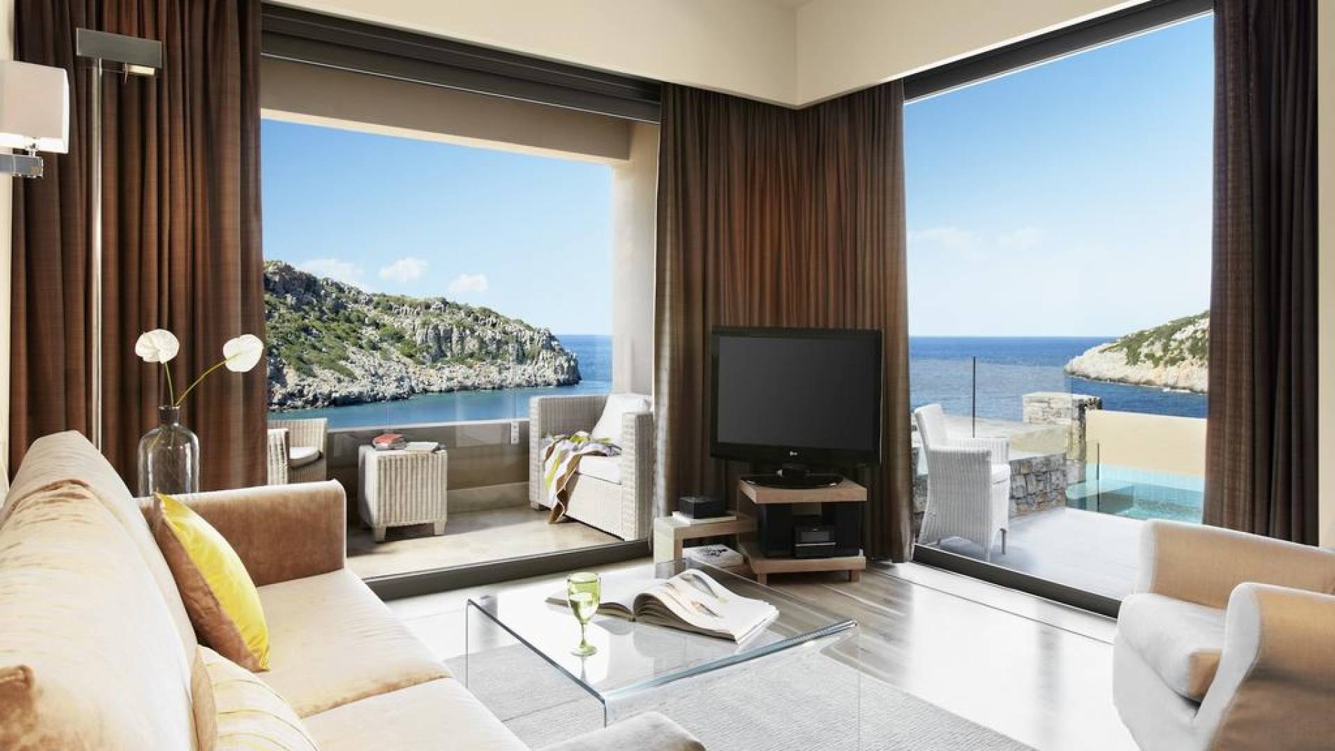 Waterfront Villa at Daios Cove es una villa de lujo en alquiler con 1 dormitorio y piscina privada. Relájese en esta magnífica villa y disfrute de la piscina privada de agua de mar climatizada, ubicada en la amplia terraza, o disfrute de esa impresionante vista del Mediterráneo mientras se relaja en su hermosa terraza.