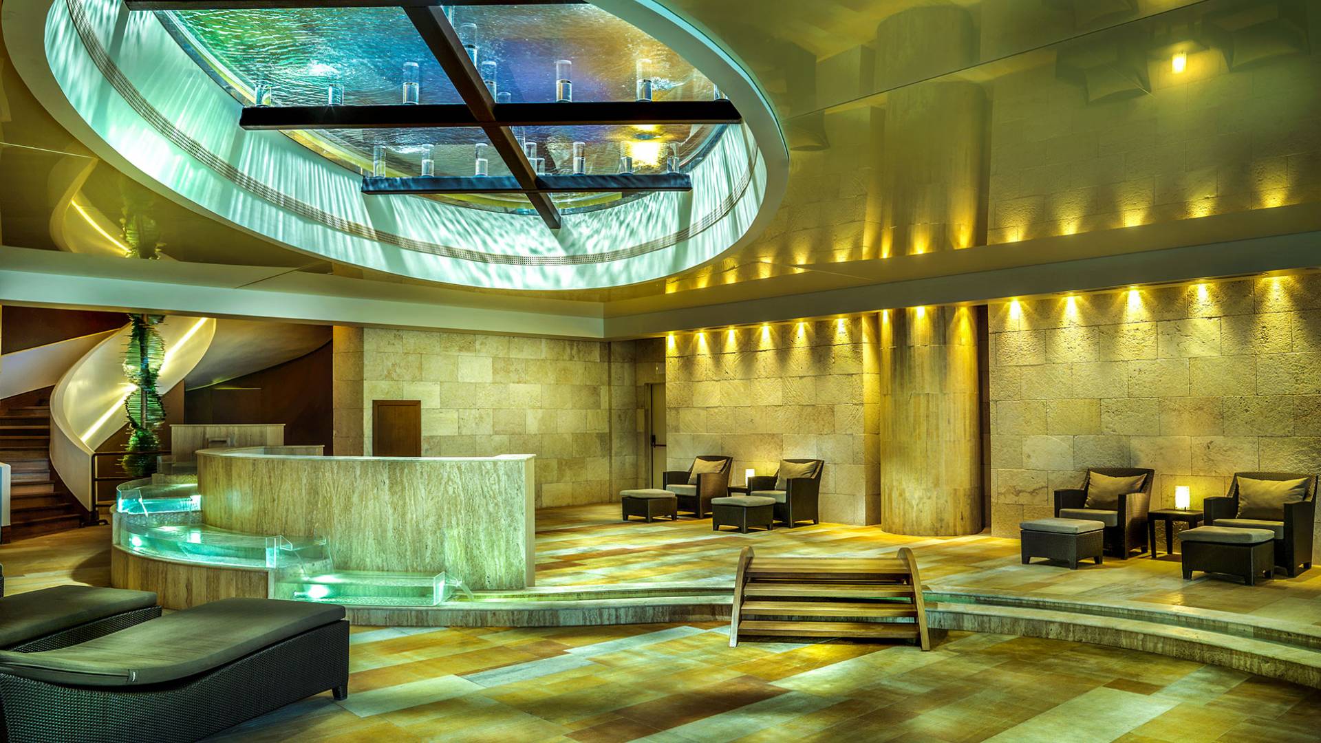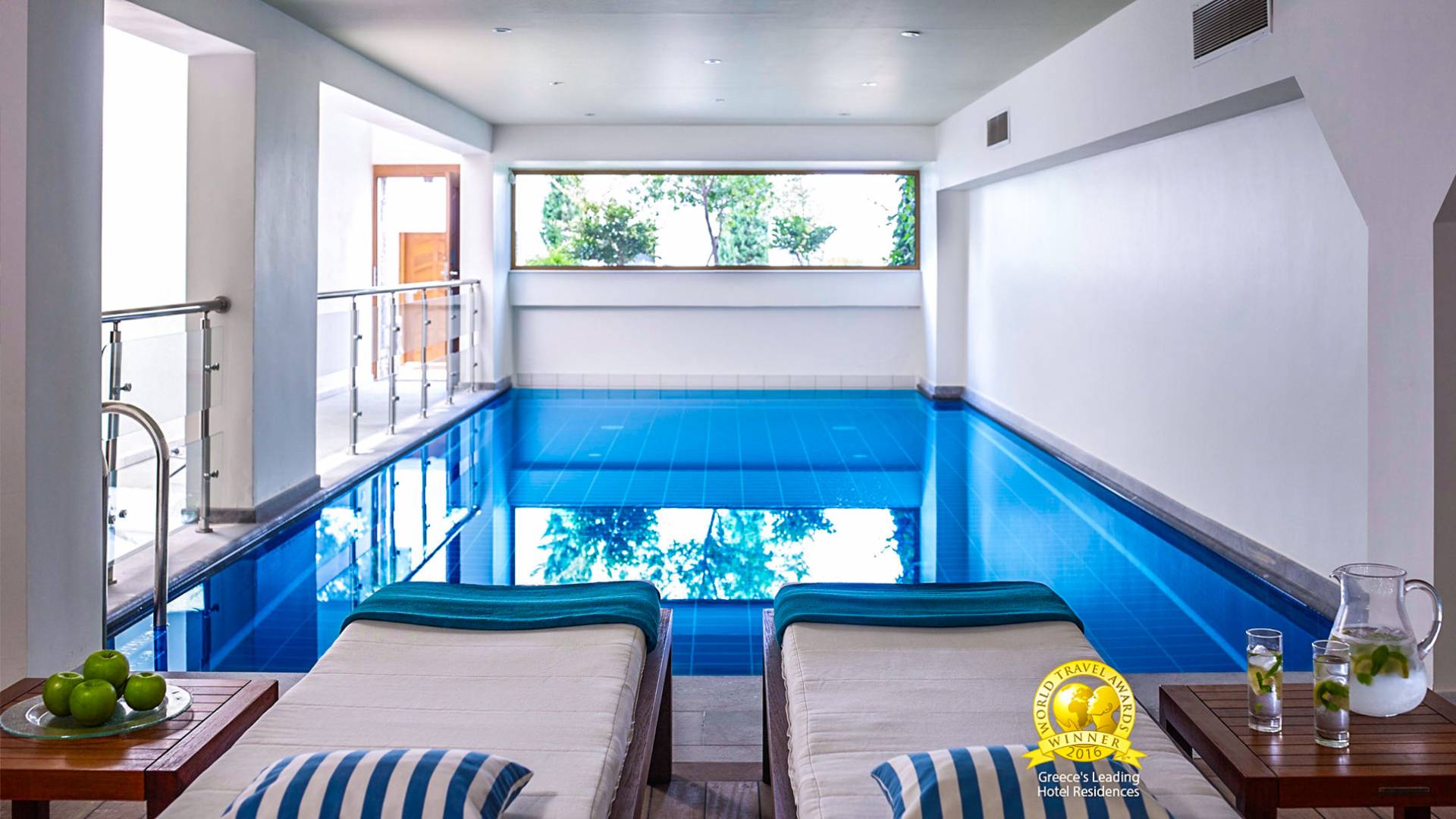 Una hermosa piscina cubierta y un área de spa también están reservadas solo para los huéspedes del Elounda Peninsula All Suite Hotel, que incluye un gimnasio con equipos Cybex, una sauna final y un auténtico hammam otomano.