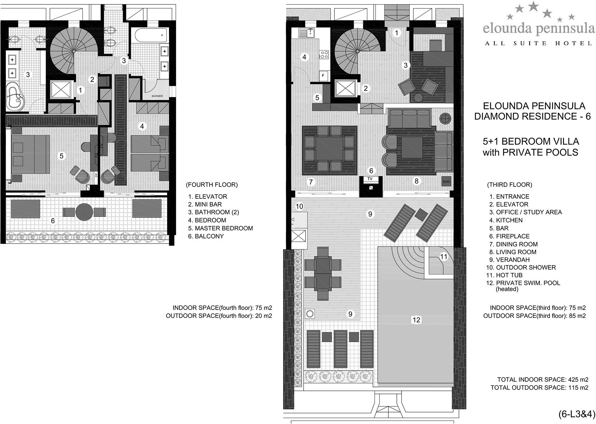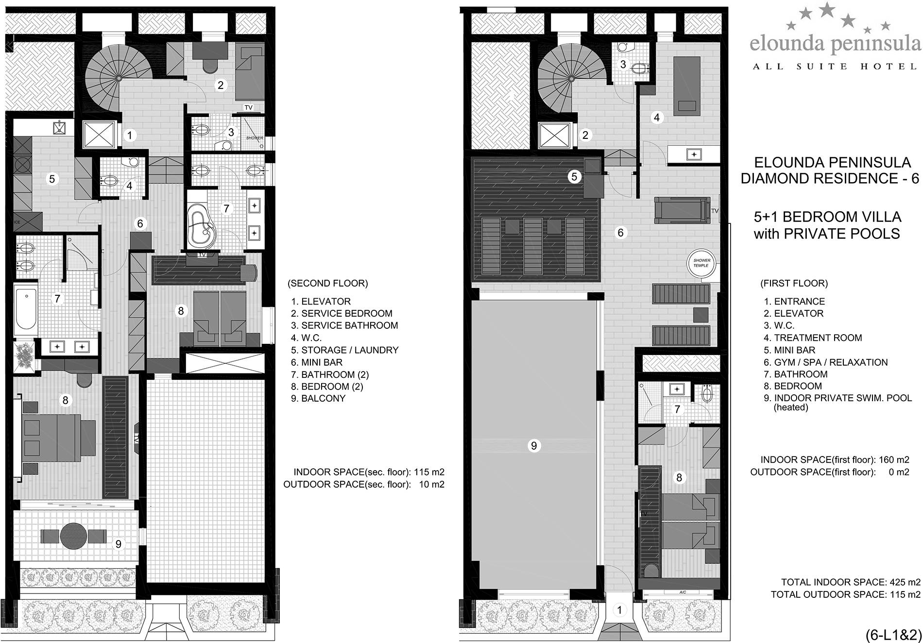 Diamond Residence en Elounda Peninsula Hotel consta de seis habitaciones de aproximadamente 440 m² de espacio habitable (11 huéspedes), lujosas residencias junto al mar, cada una con su propio espacio exterior privado, una piscina privada climatizada de agua de mar* y una vista sin obstáculos del mar Egeo. un sentido de exclusividad. Un retiro de vacaciones privado con acceso a su exclusiva playa de arena, una sala de estar con dispositivos electrónicos de alta fidelidad que incluyen TV LCD y cables de sonido envolvente se abre a la terraza privada donde se encuentra la piscina de agua de mar climatizada al aire libre, dormitorios con lujosos baños de mármol en suite, bañera de hidromasaje, acabados elegantes y lujosos, ducha de vapor, sauna, equipo de gimnasia y sala de masajes, piscina cubierta privada, WC para huéspedes, Wi-Fi y portales de comunicación en todo el lugar, cocina, espacio de almacenamiento, lavandería y alojamiento para el personal completo.