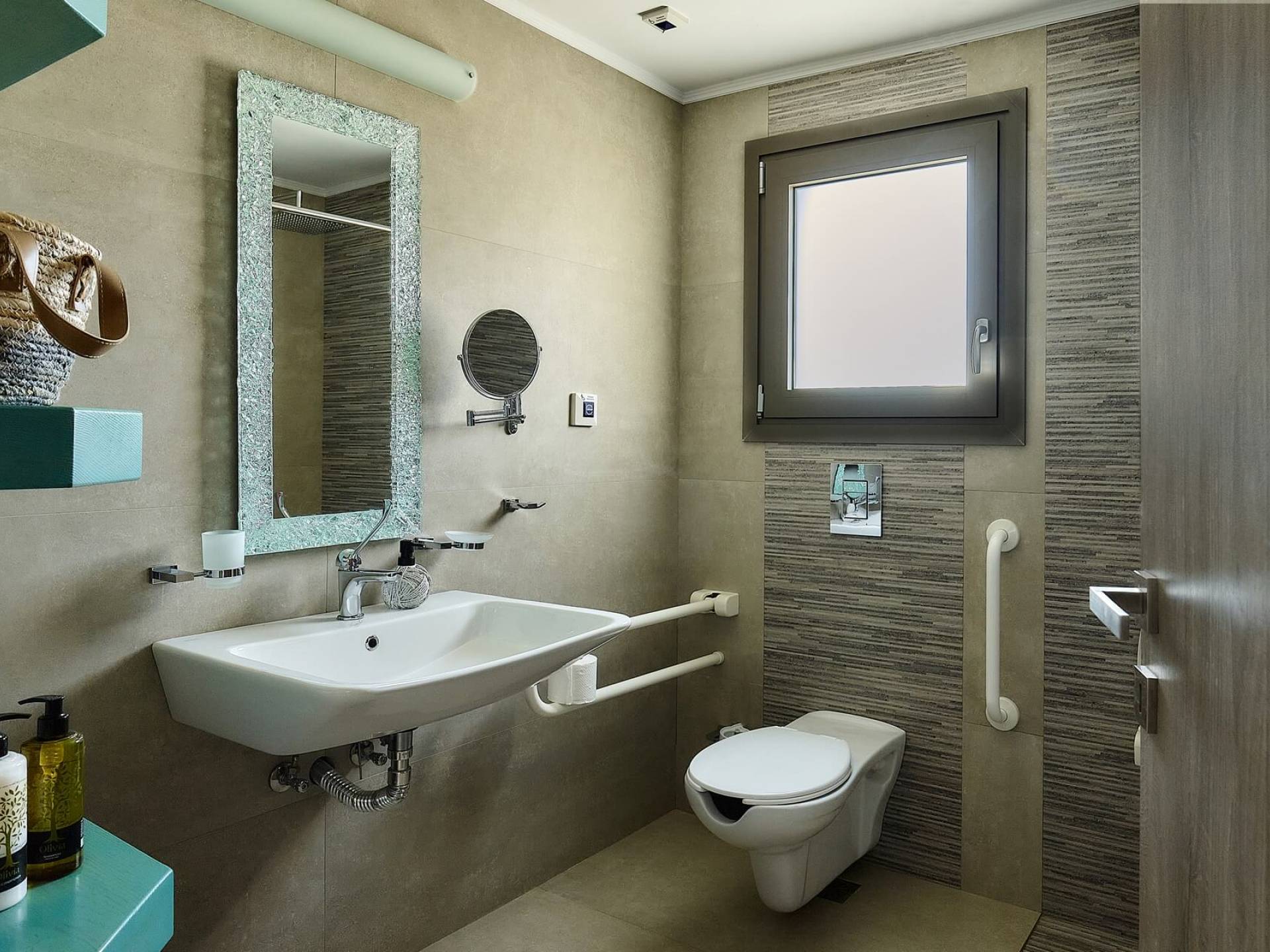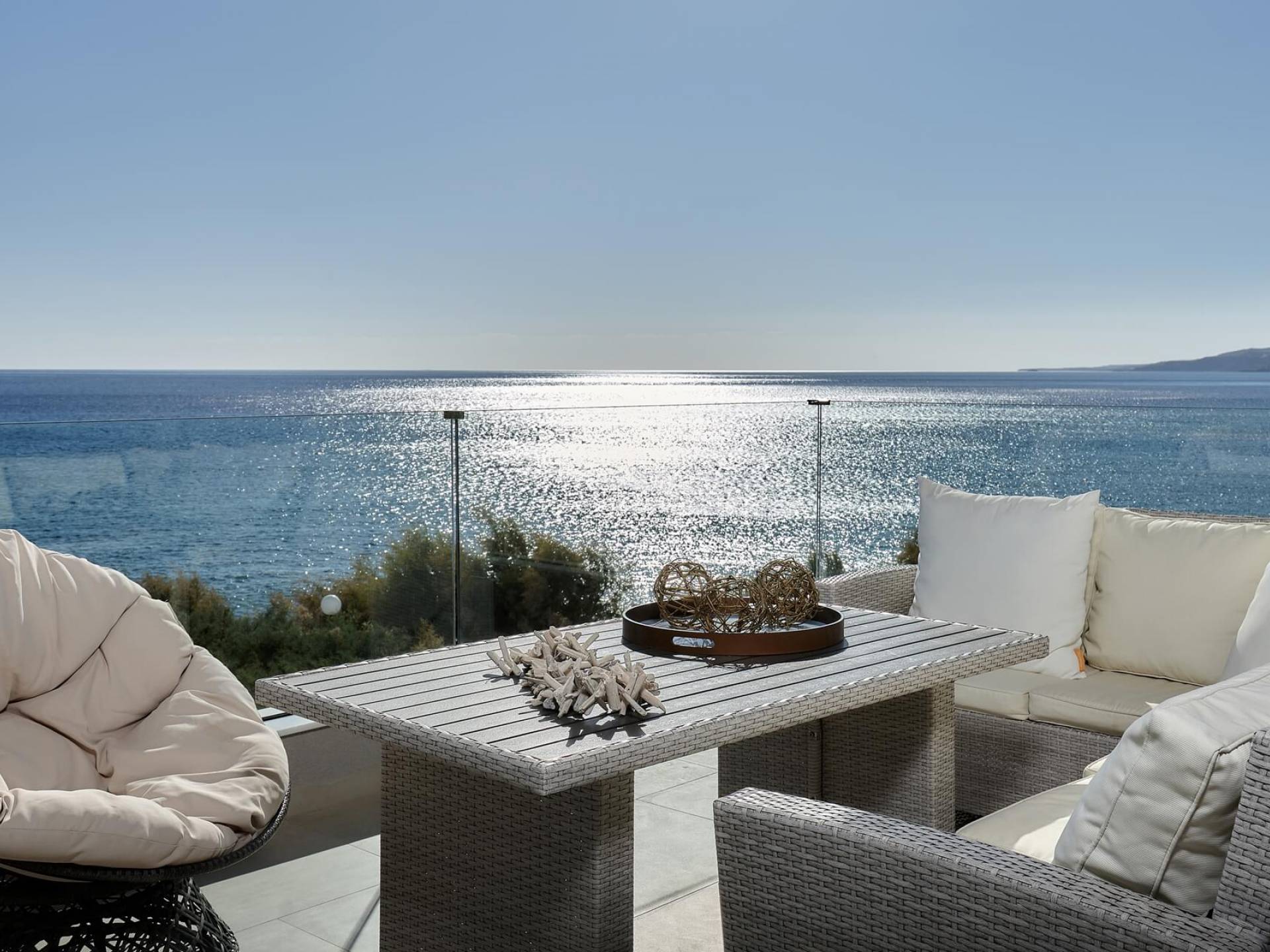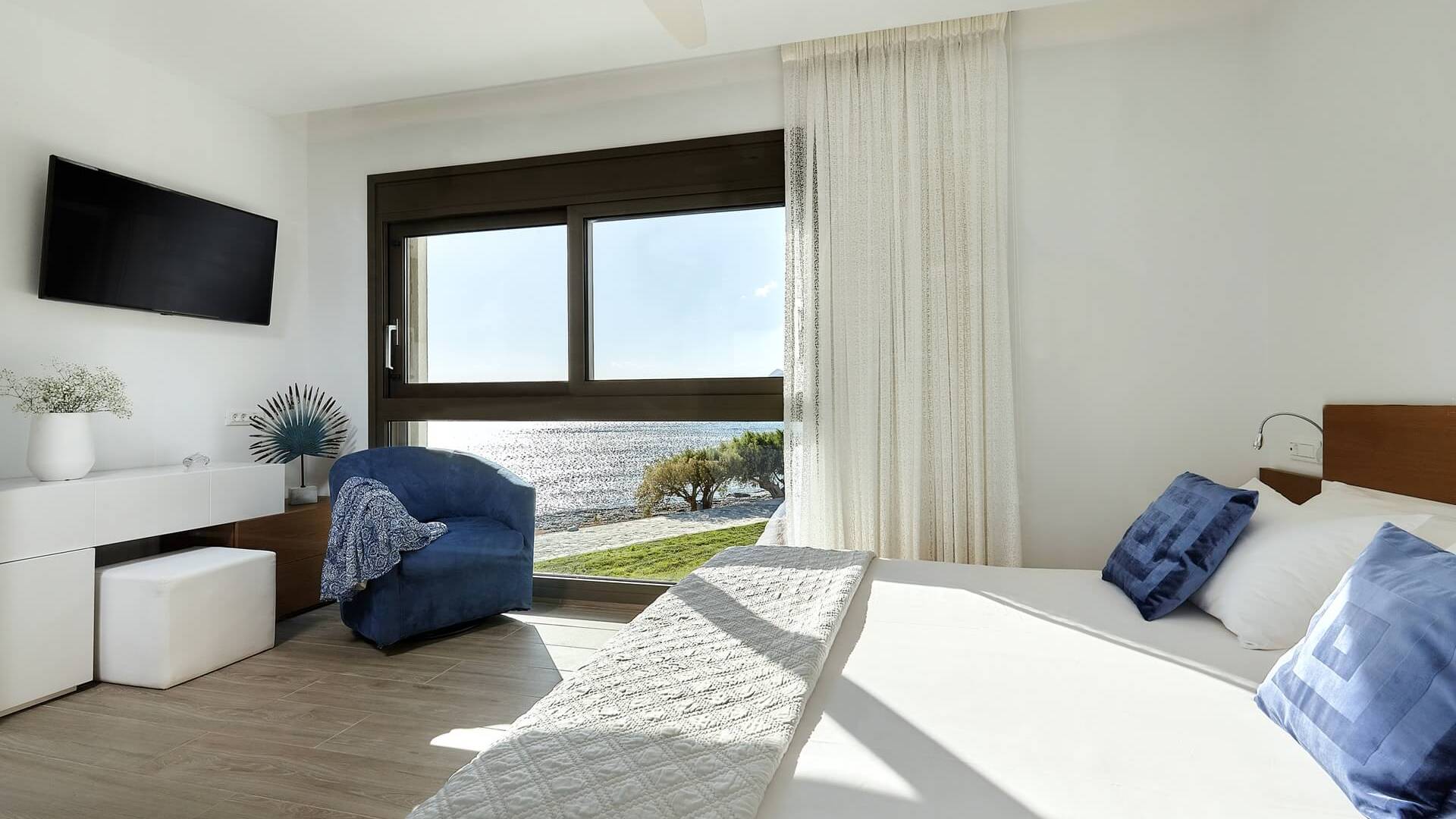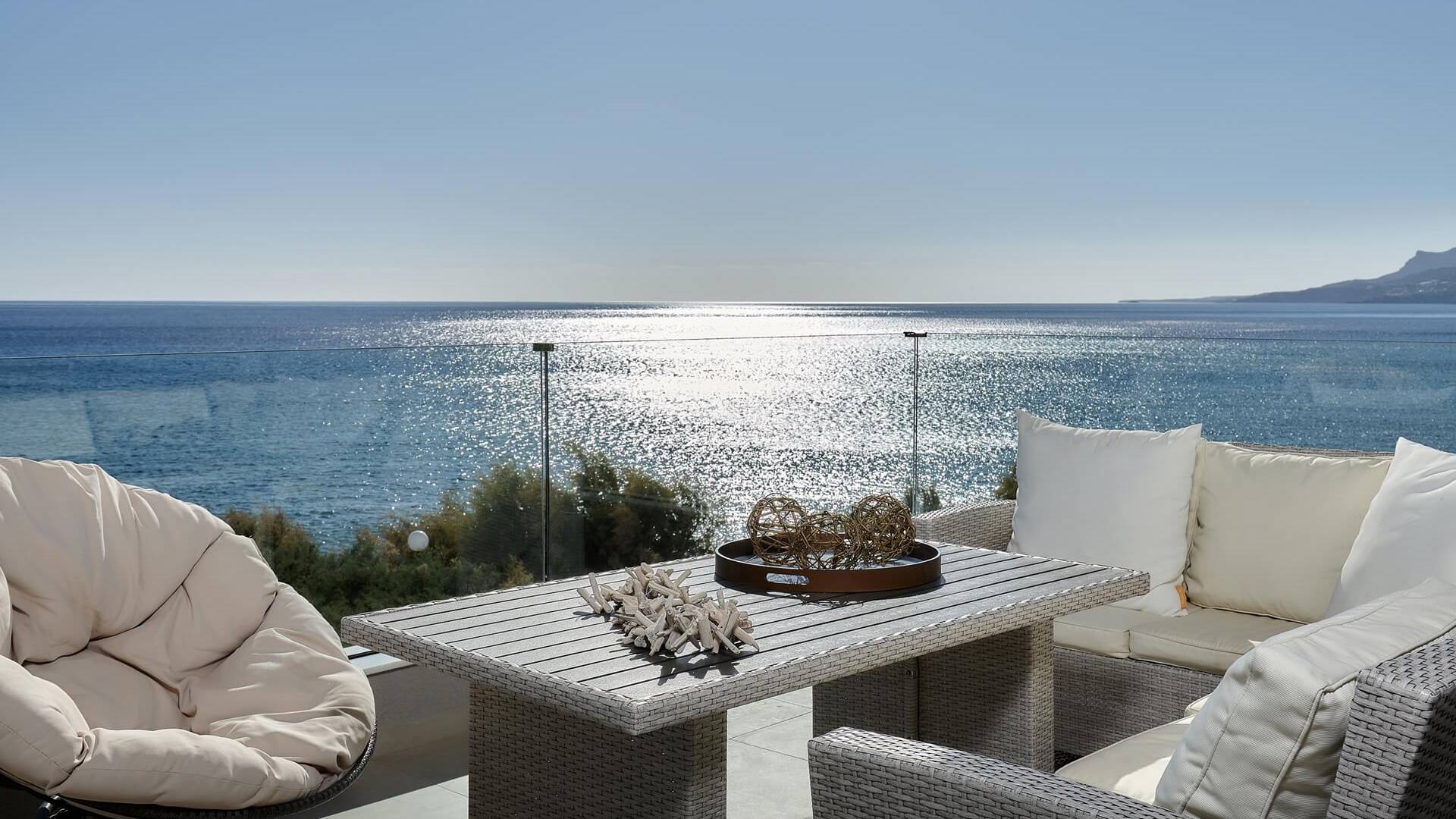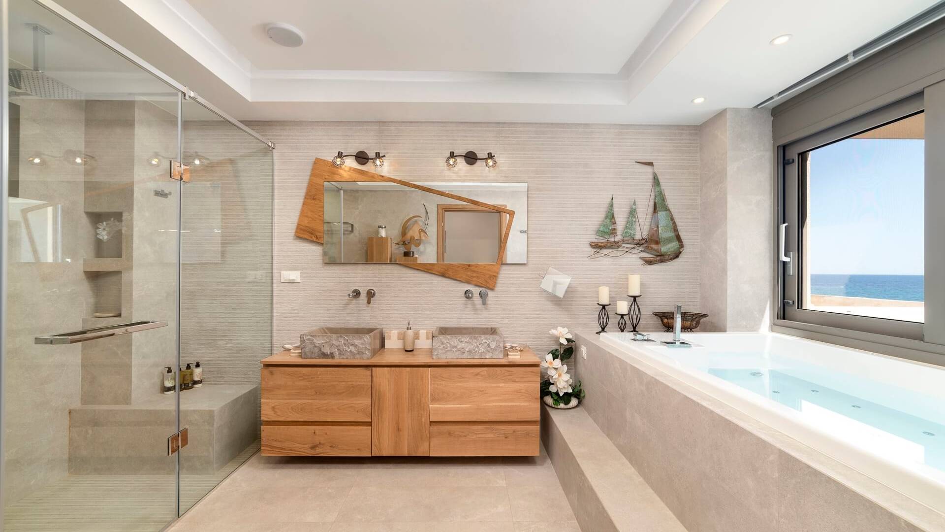 El complejo Moonlight Villas Crete consta de 9 dormitorios, 3 salas de estar, 4 cocinas de planta abierta totalmente equipadas y 7 baños completos. El baño principal de la villa más grande, Europa, tiene duchas con hidromasaje y un jacuzzi interior con cromoterapia y vista al mar. Los 8 dormitorios bellamente decorados y los 3 sofás cama de la sala de estar están equipados con ropa de cama, colchones y ropa de cama de primera calidad. Todas las camas dobles y extragrandes ofrecen colchones y colchones superiores de la empresa griega ecológica Cocomat. Dos baños (uno en el piso superior, el otro en el piso de la piscina) son accesibles para discapacitados y hay un ascensor que conduce al piso superior.