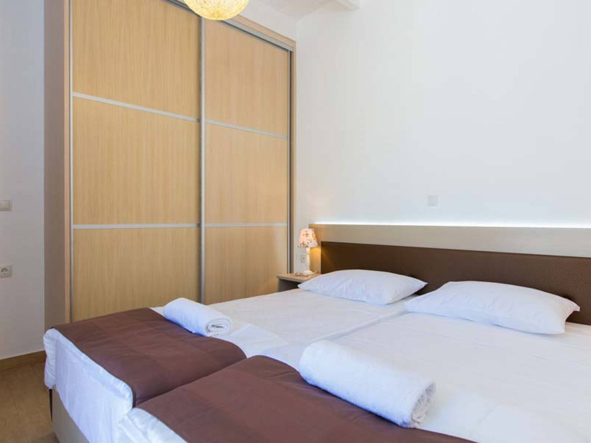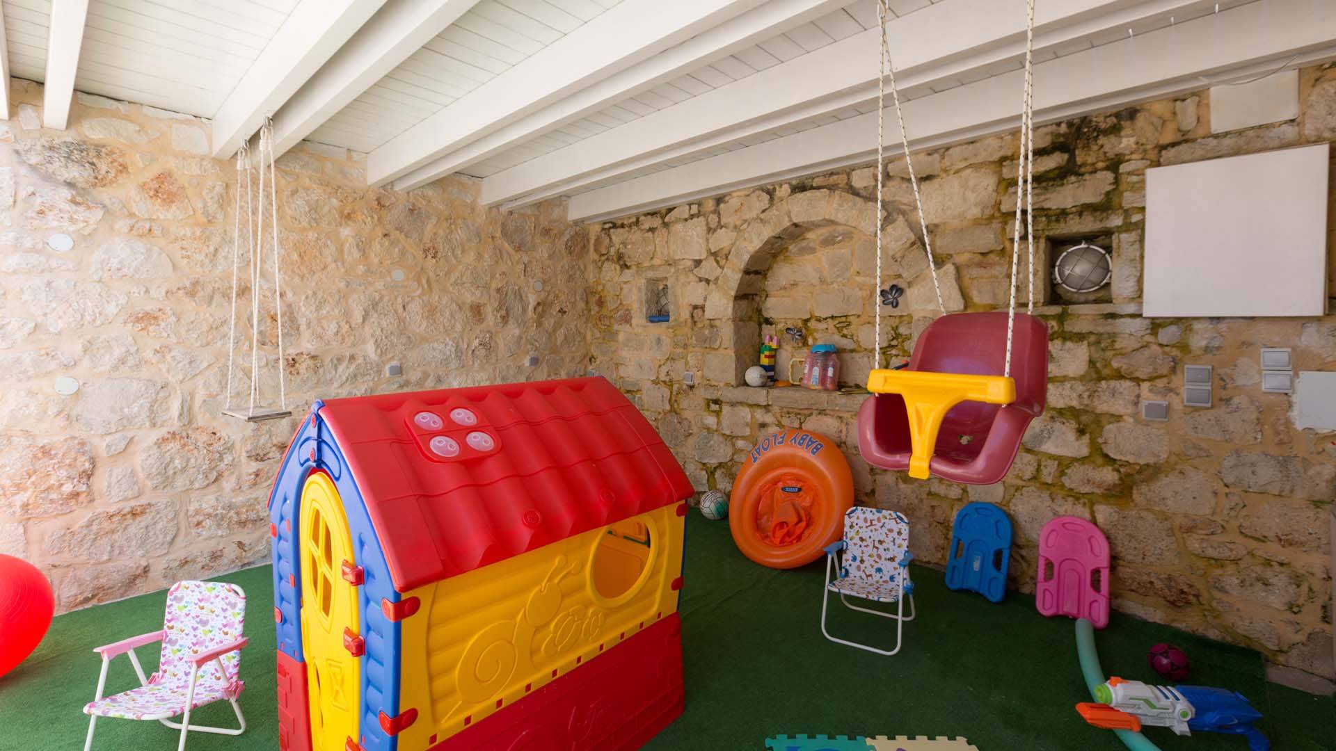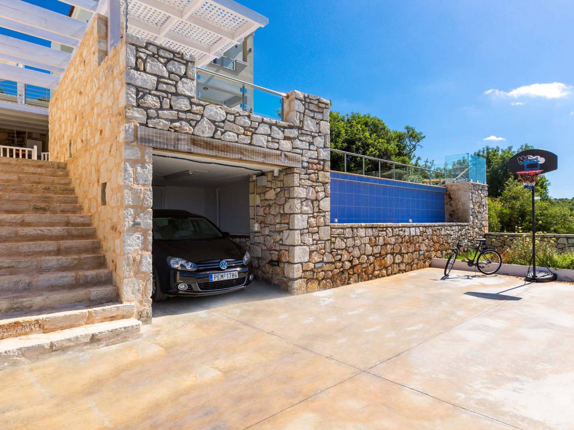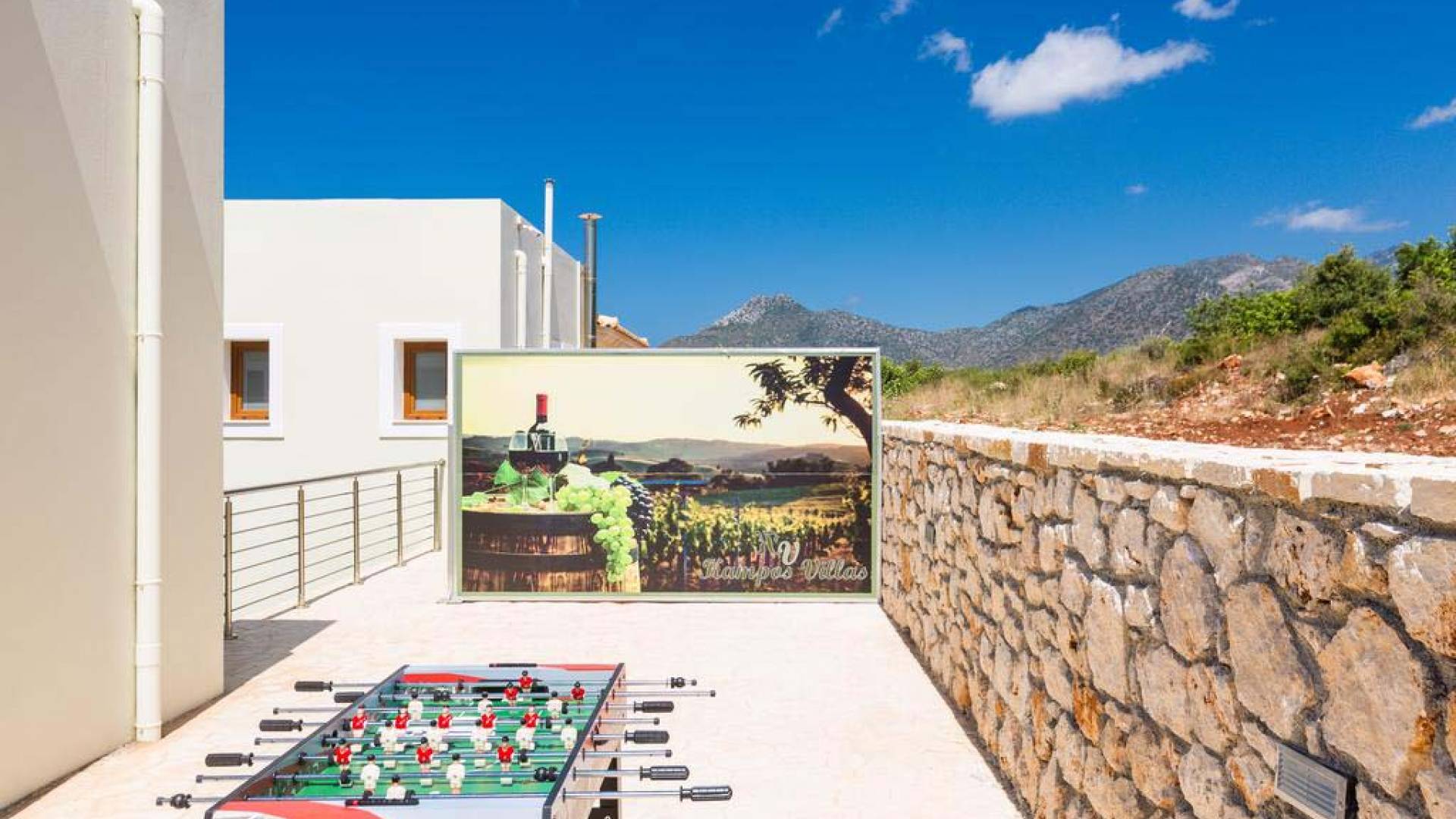 Después de entrar en el camino empedrado que conduce al garaje seguro y dejar su coche, sube las escaleras y se encuentra en el área al aire libre de Kampos Villa, que solo podría describirse como una fantasía de verano. Para empezar, hay una gran terraza para tomar el sol, con una superficie de 22 m2. piscina privada y un área cubierta de césped, equipada con hamacas, sombrillas y una ducha al aire libre, donde podrá relajarse y disfrutar del sol y del aire fresco del campo durante todo el día. También cuenta con una sala de estar al aire libre y una zona de barbacoa de piedra con un fregadero adicional, para hacer la limpieza, después de disfrutar de una comida casera y una cena al aire libre. Además, hay una zona de relajación adicional con hamacas y sombrillas que comparten las dos Villas. Para mejorar aún más las cosas, hay un área de juegos con sombra, con juguetes para niños y cubierta con una almohadilla suave, ¡donde a nuestros huéspedes más pequeños les encantará pasar su tiempo!
