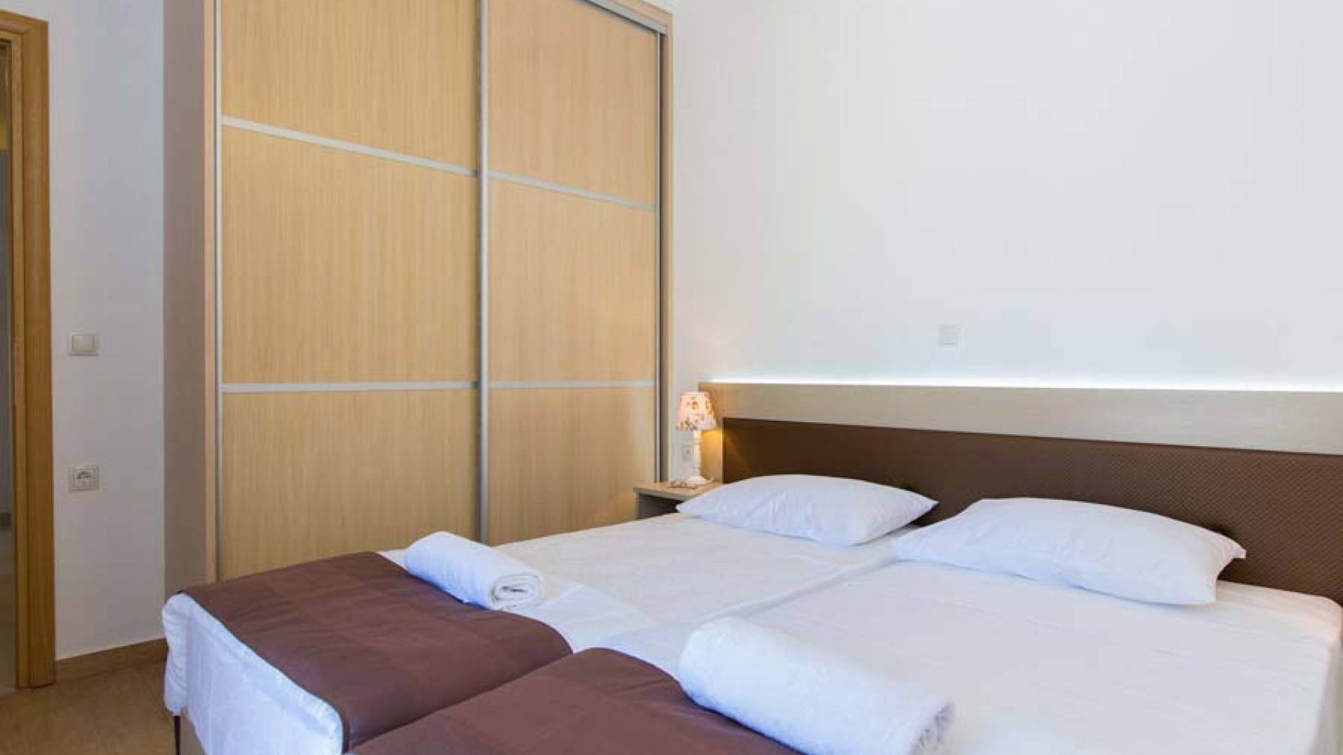 Primer piso: en este nivel se encuentran los dos dormitorios restantes, uno de ellos cuenta con una cama doble tamaño king (que se puede convertir en dos camas individuales, si lo desea) y el otro una cama doble grande. Además, en esta planta hay una zona de cocina adicional con una nevera pequeña y un baño con cabina de ducha. Todos los dormitorios tienen un pequeño tocador, mesitas de noche y armario. Todas tienen aire acondicionado y están equipadas con televisores de pantalla plana con recepción vía satélite y ofrecen acceso directo a las terrazas.