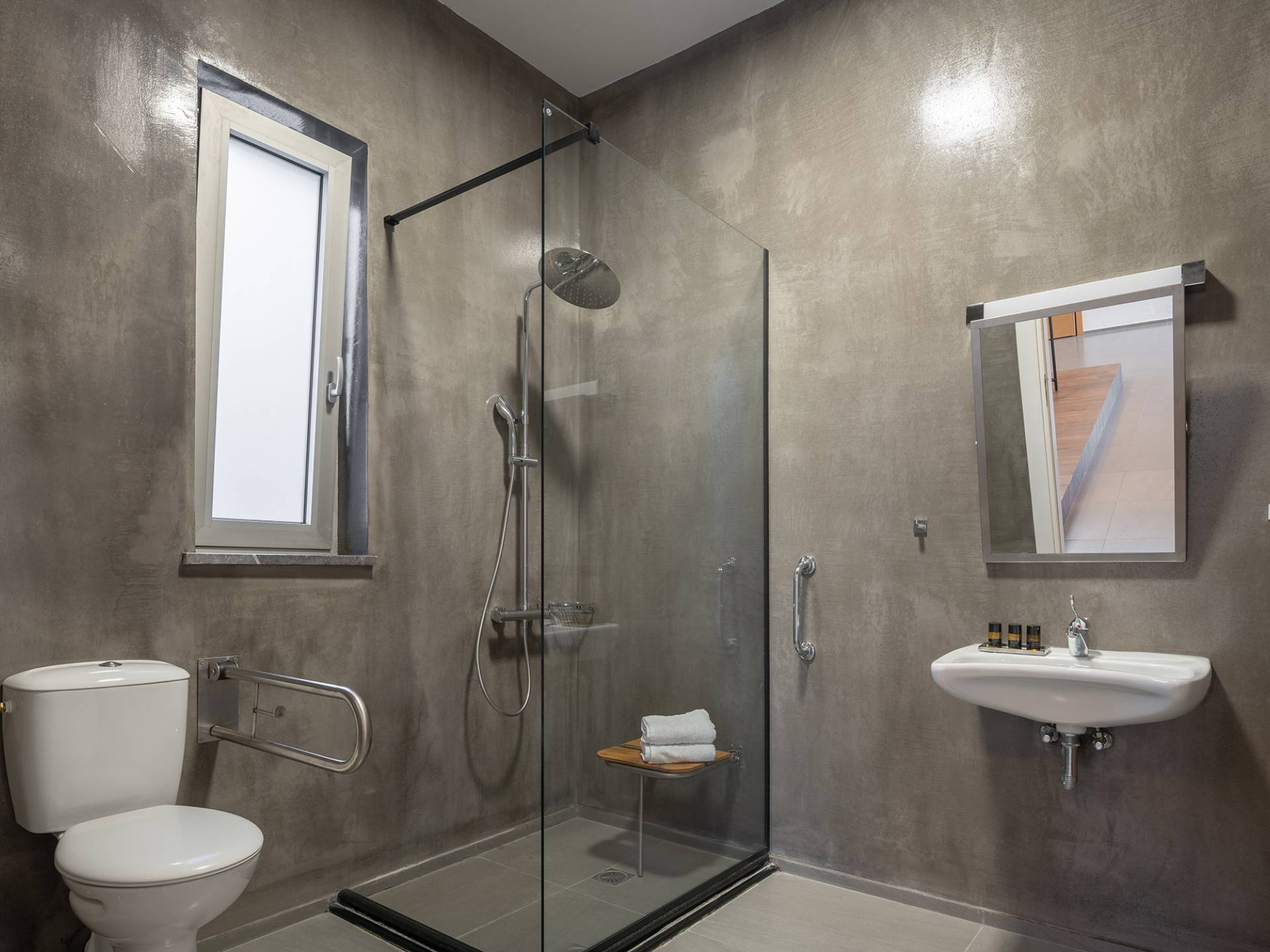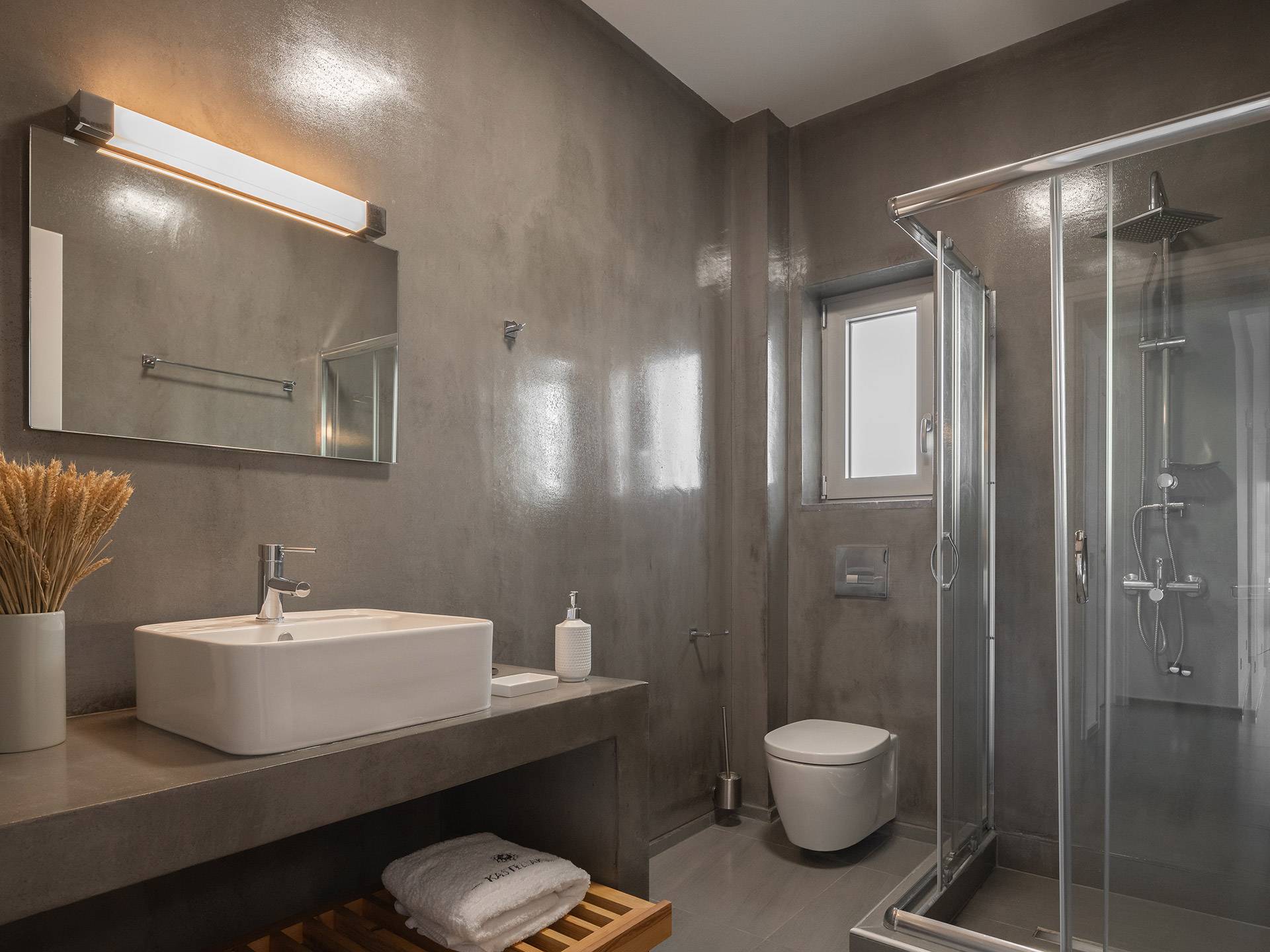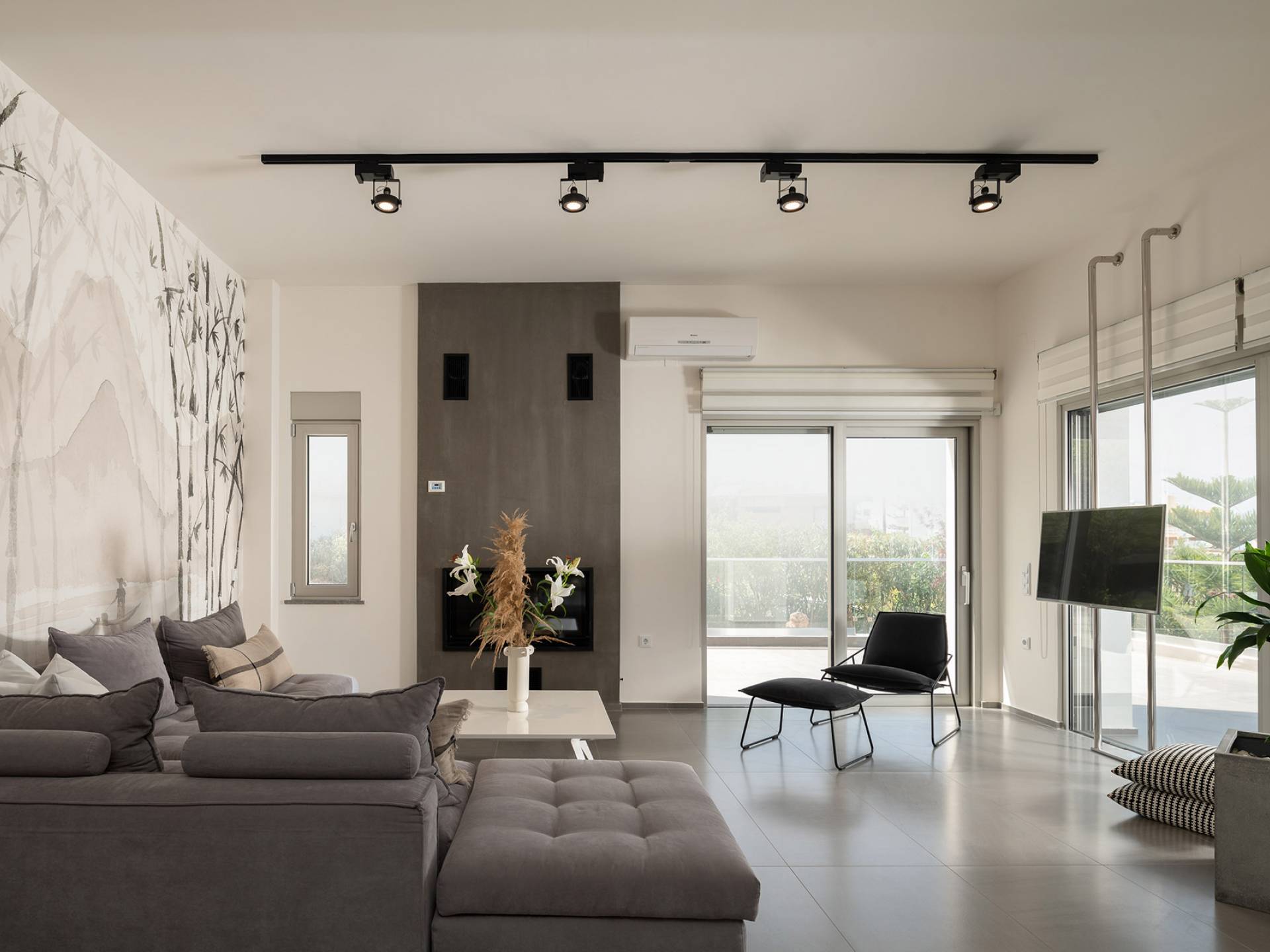 Diseñada y amueblada con estilos minimalistas, la villa de dos pisos tiene capacidad para 8 personas en camas y hasta 10 personas si es necesario. Al ingresar a Kastellakia Villa Rethymno en la planta baja, hay una amplia área de planta abierta que consta de una sala de estar con chimenea y un televisor de alta definición de 42 pulgadas, además de un reproductor de DVD y Nintendo Wii, un espacio de oficina con un escritorio, un comedor interior y una sala modular. Cocina totalmente equipada con accesorios y electrodomésticos de primera calidad más una mesada de granito. Desde la sala de estar, hay acceso directo a la terraza principal, la zona de la piscina y el jardín. En la misma planta, hay un baño completo con ducha y un dormitorio doble que también están diseñados con todas las especificaciones para ser accesibles en silla de ruedas.