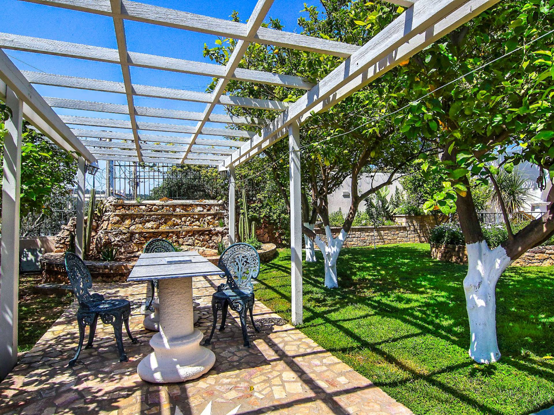 La piscina está ubicada en medio de un jardín flanqueado por palmeras y helechos, cuya semejanza a un oasis moderno solo se rompe por el elemento humano de un jacuzzi, múltiples hamacas, mesas y sillas que salpican su extensión. Esto, junto con una cocina, dos inodoros y dos duchas, proporciona un elemento excelente para cualquiera que busque escapar.