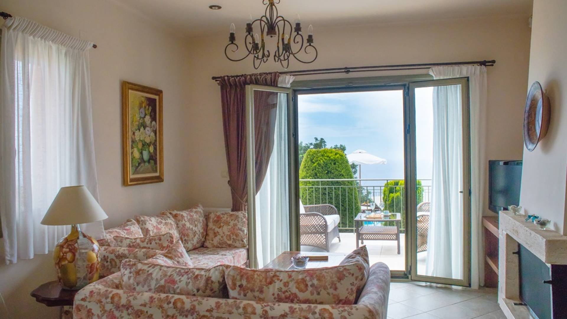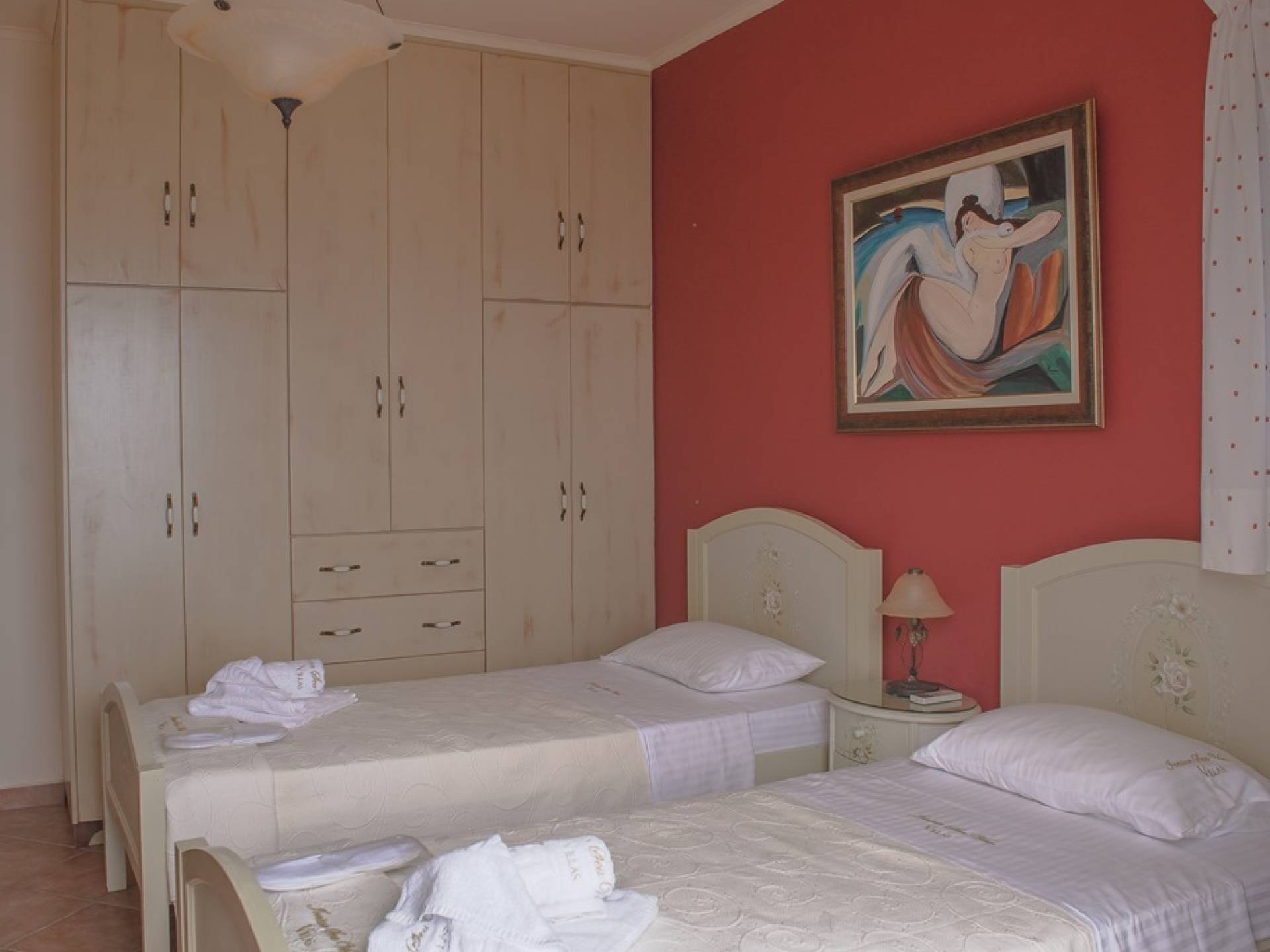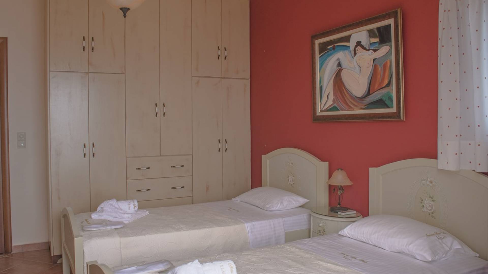 En el primer piso, hay dos dormitorios con balcones separados, cada uno equipado con mesas y sillas. El dormitorio con cama doble de acero y mosquitera tiene un baño interno que incluye ducha e hidromasaje. El otro dormitorio, con las camas individuales, dispone de baño con bañera e hidromasaje. La vista hacia el mar Jónico, desde todos los aspectos de ambas villas, es impresionante tanto de día como de noche.