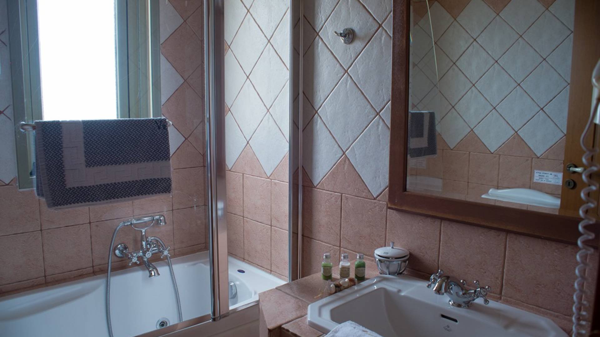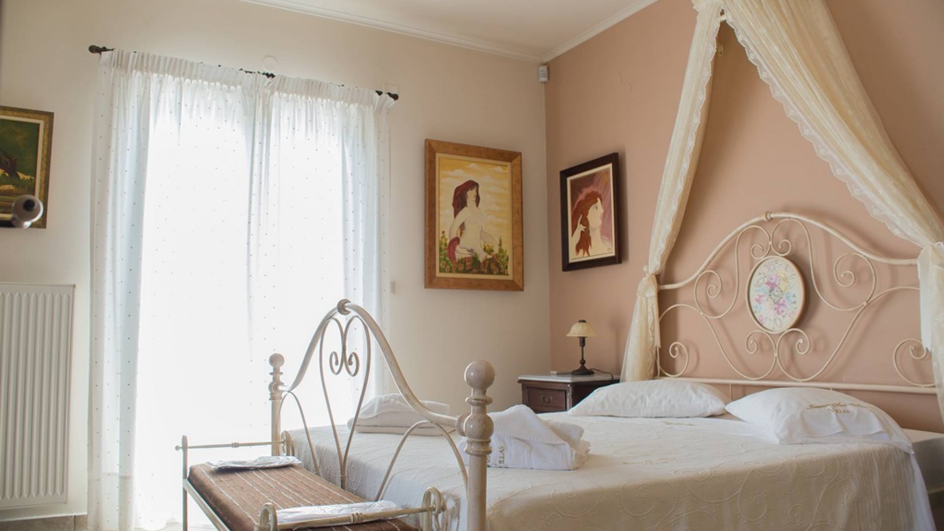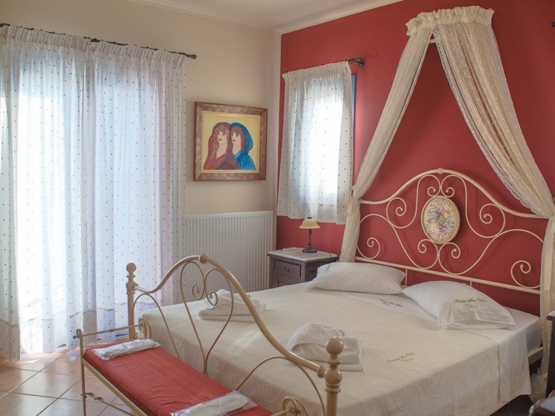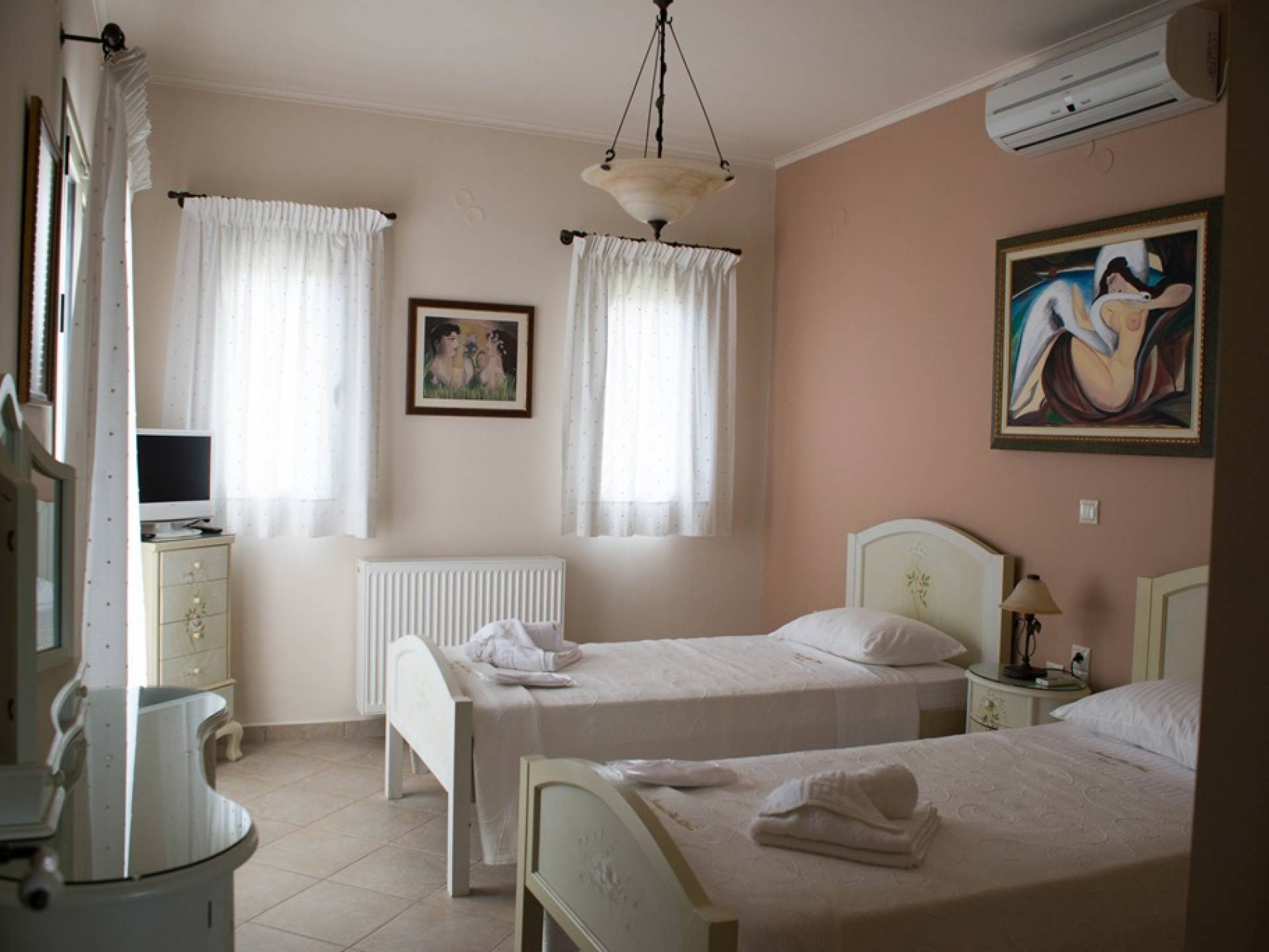 En el primer piso, hay dos dormitorios con balcones separados, cada uno equipado con mesas y sillas. El dormitorio con cama doble de acero y mosquitera tiene un baño interno que incluye ducha e hidromasaje. El otro dormitorio, con las camas individuales, dispone de baño con bañera e hidromasaje. La vista hacia el mar Jónico, desde todos los aspectos de ambas villas, es impresionante tanto de día como de noche.